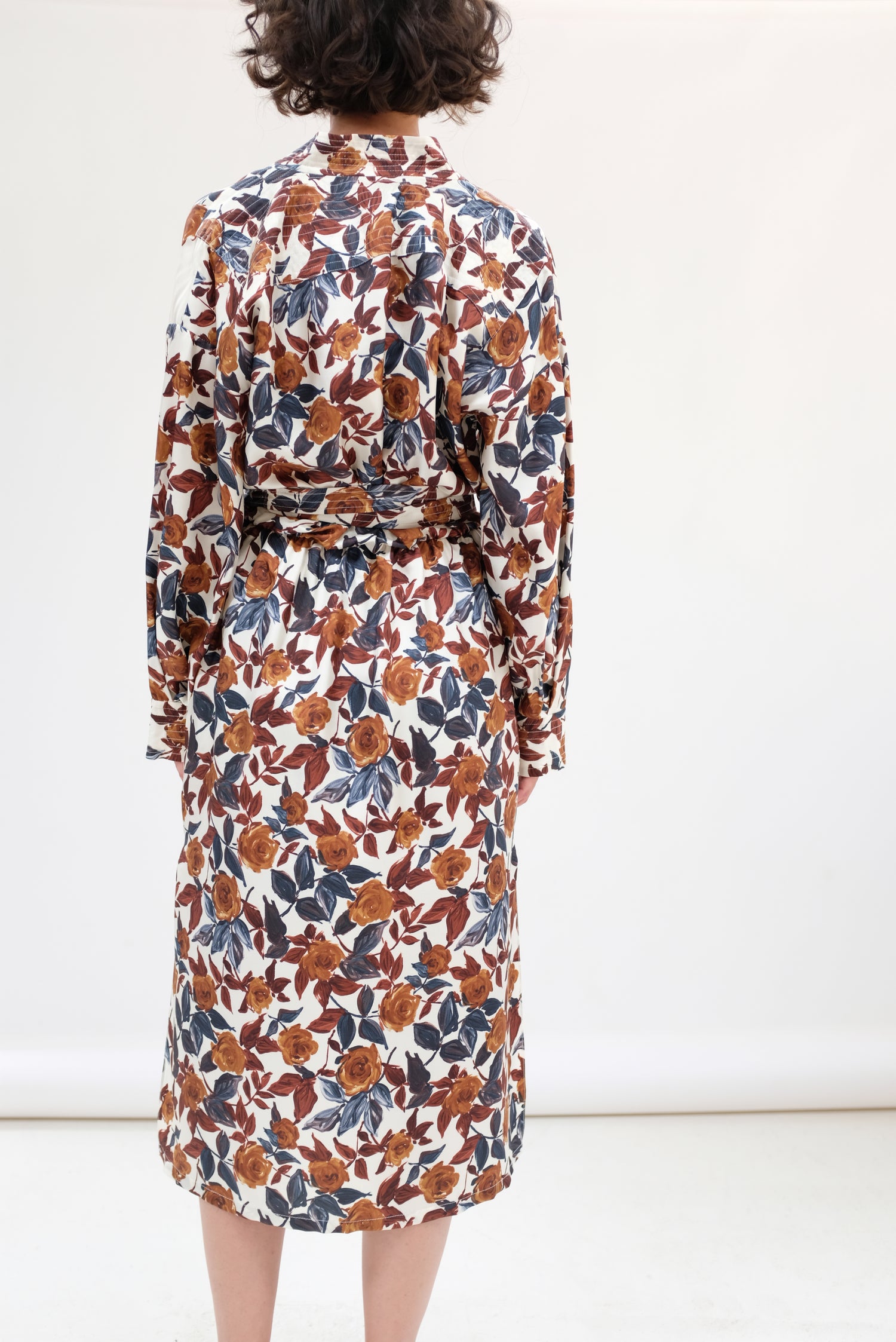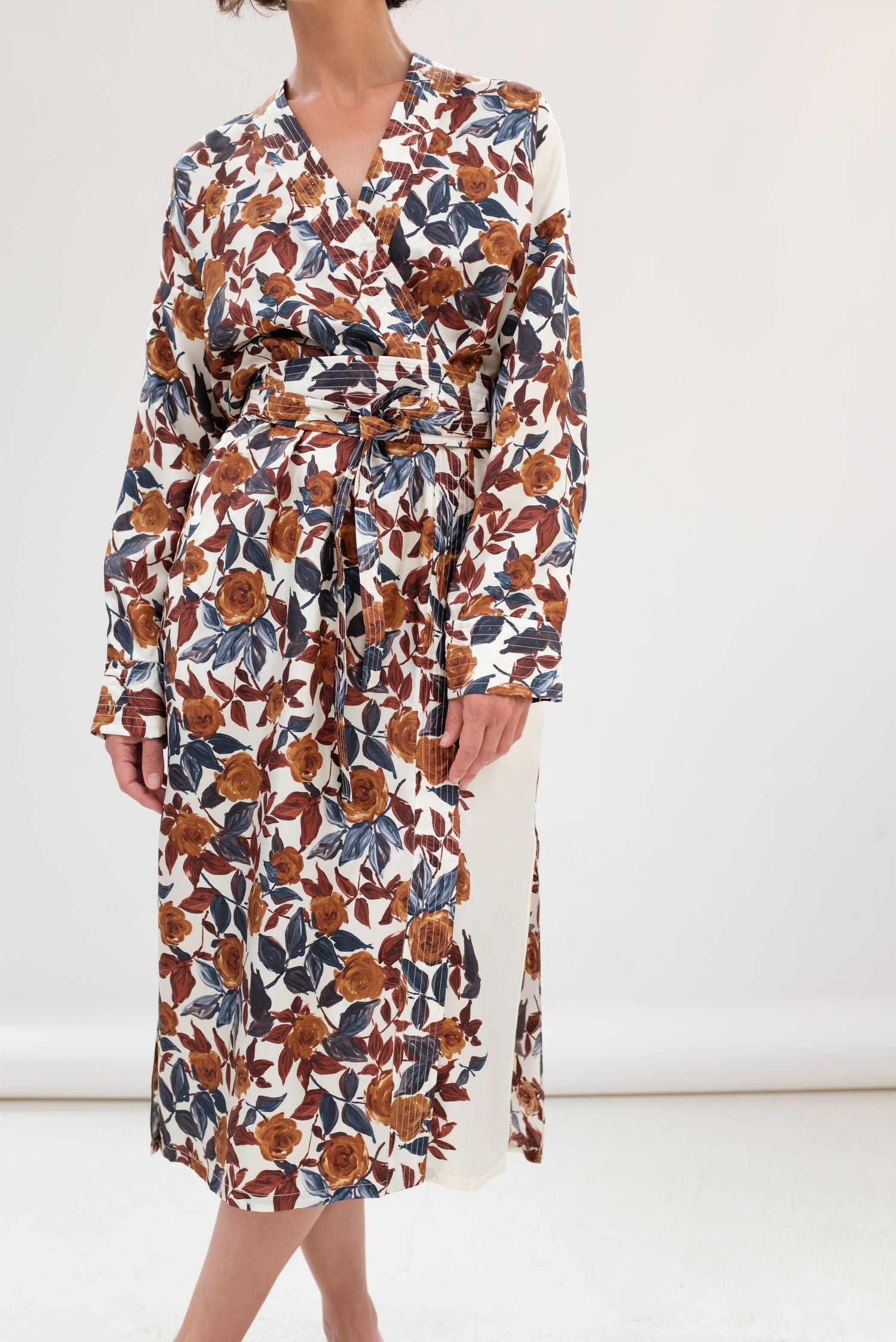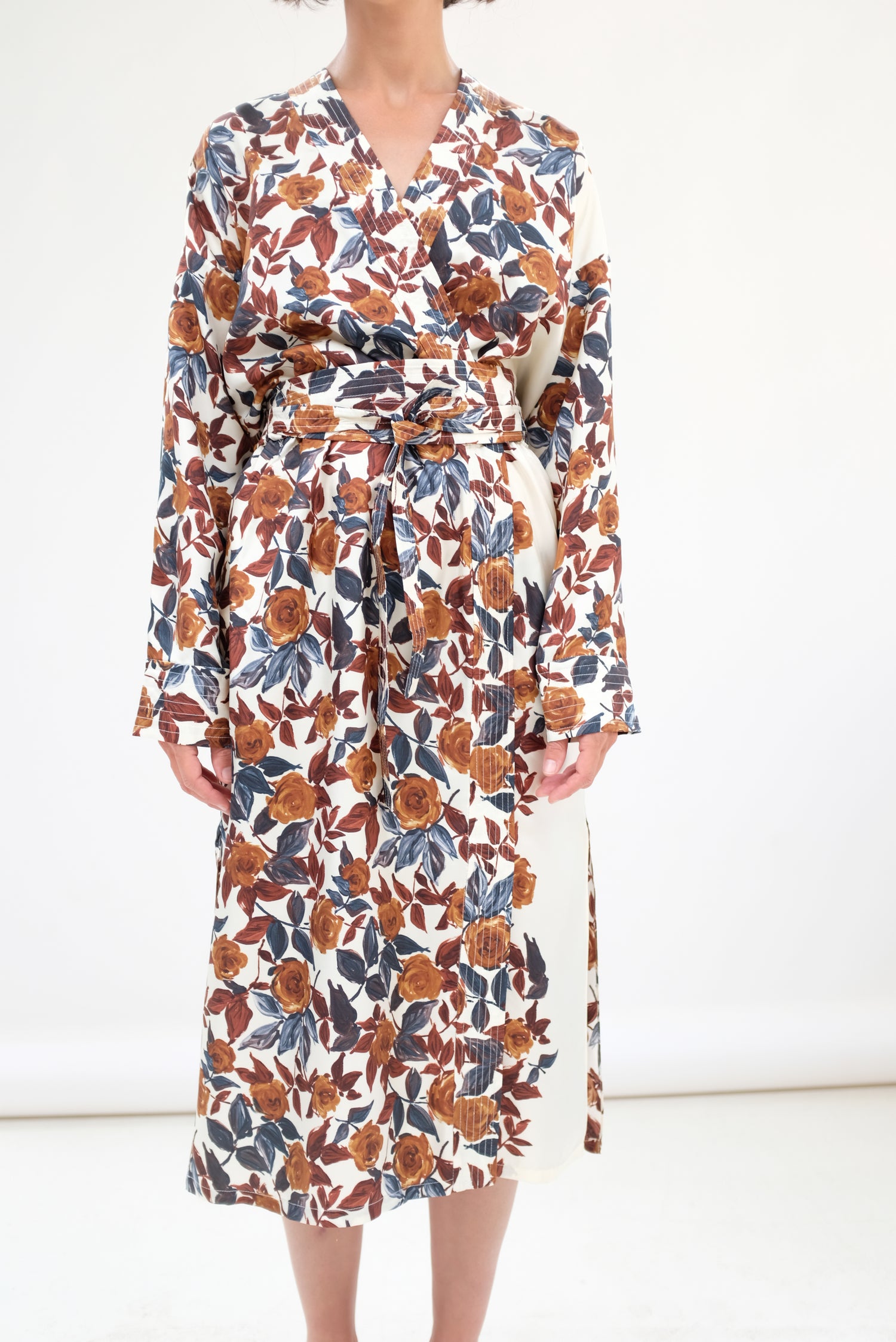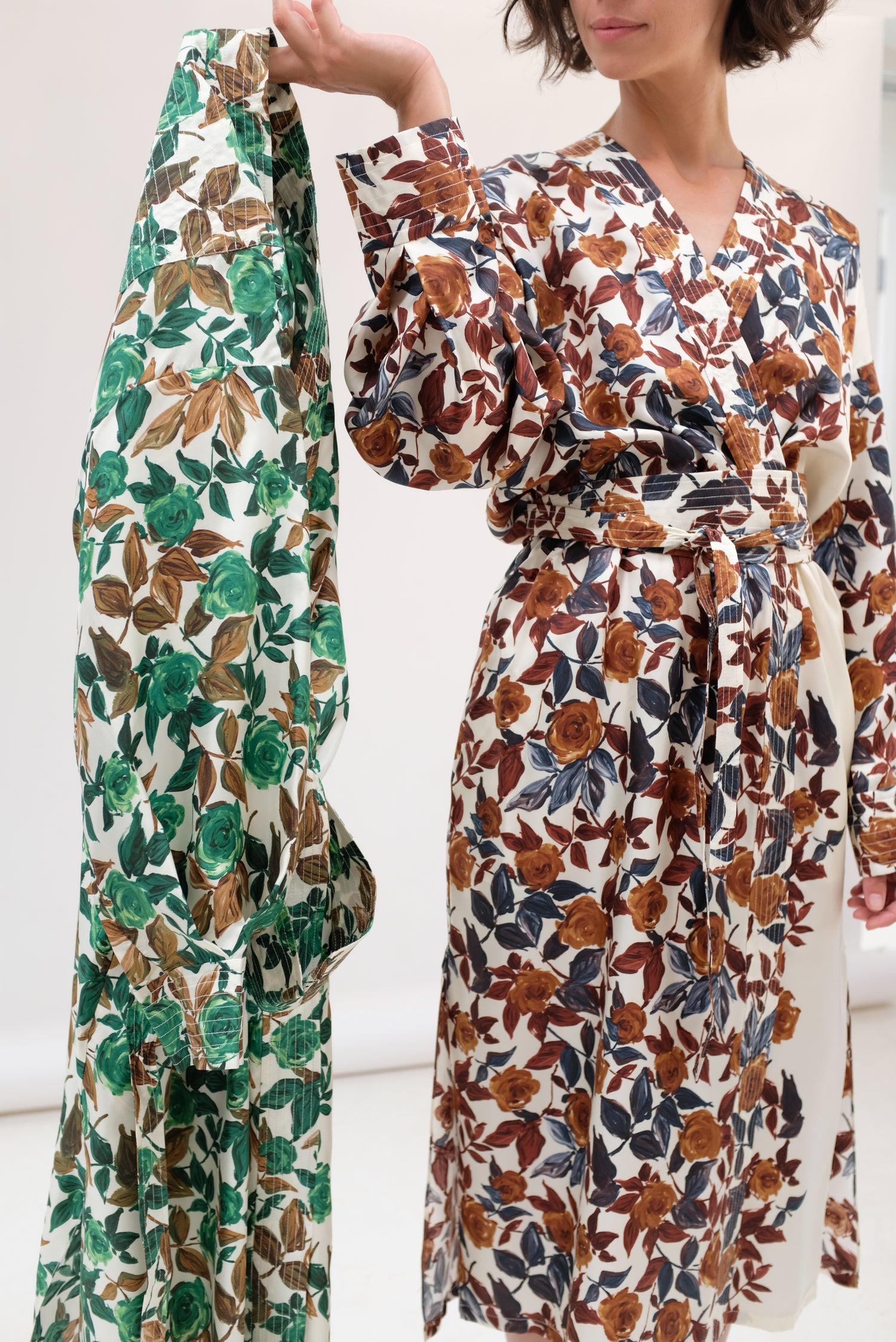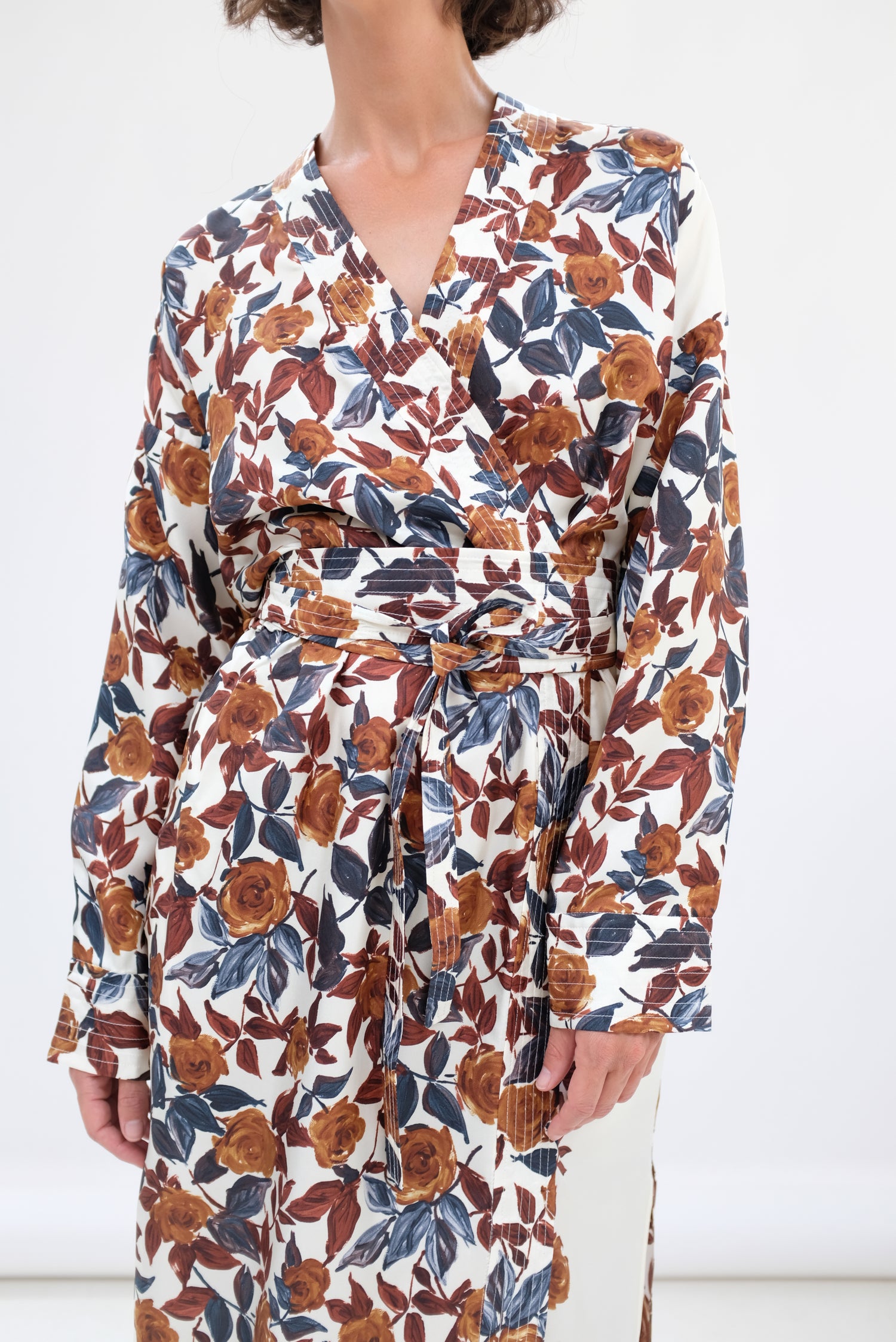 Floral silk wrap dress, long sleeve, tailored decorative cuff, and self belt. Side slit pockets. Side slit. Deep v-neck. All over print. Unlined. Easy adjustable fit.