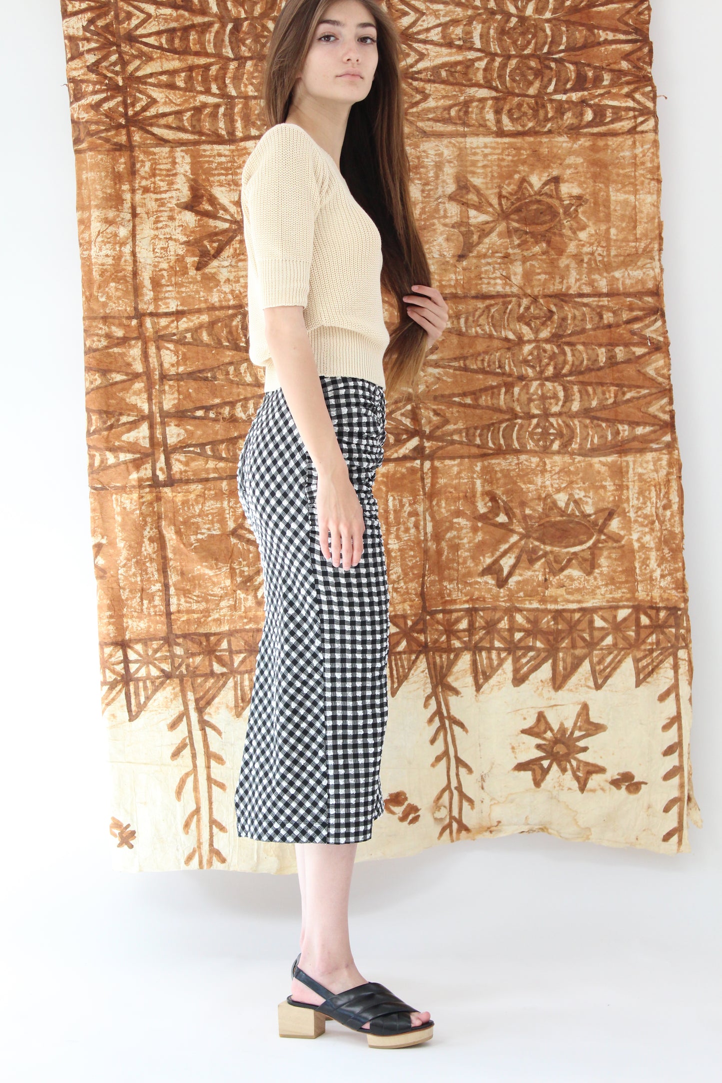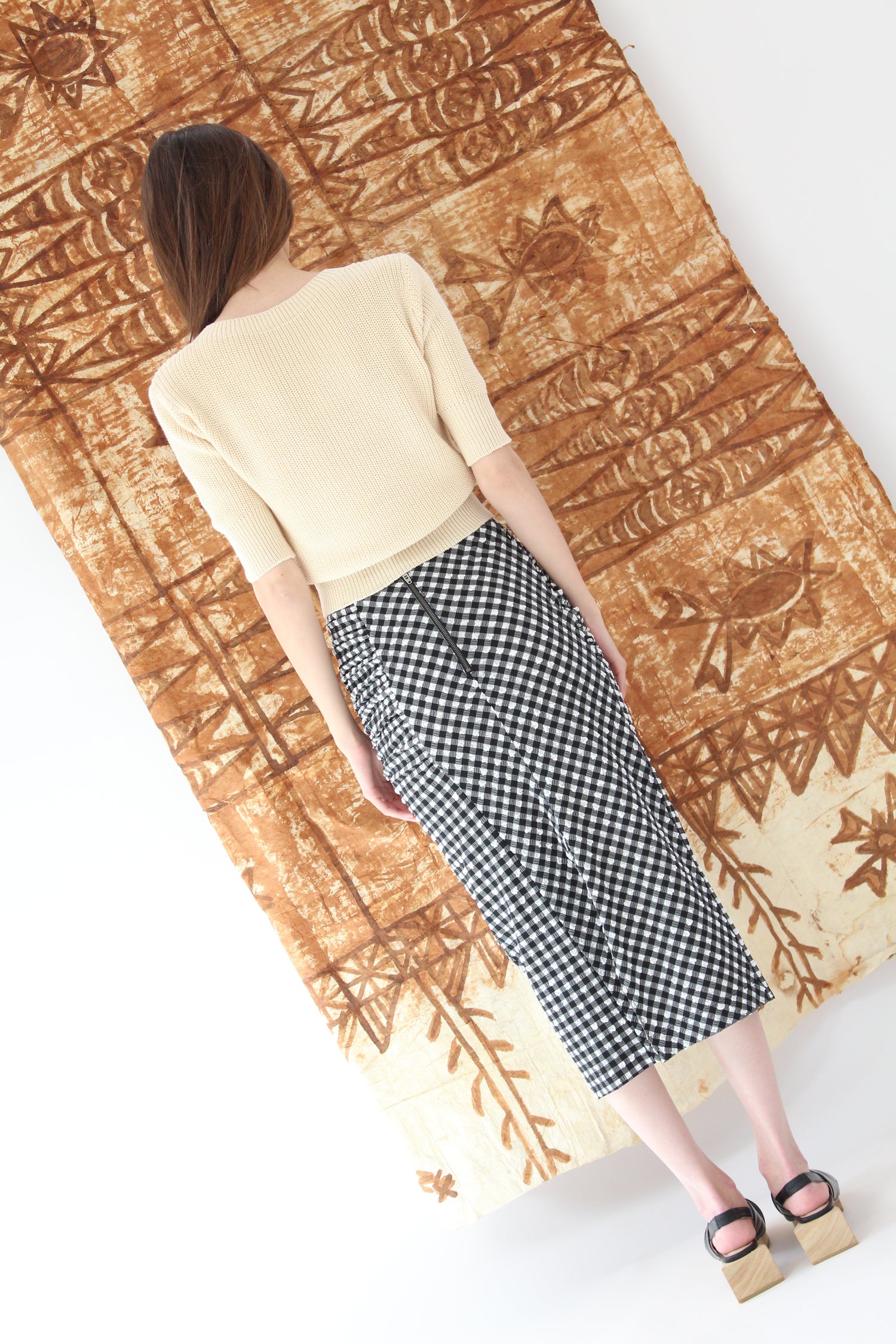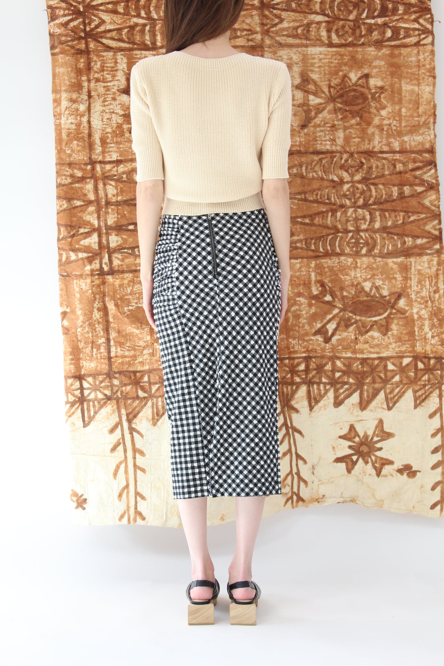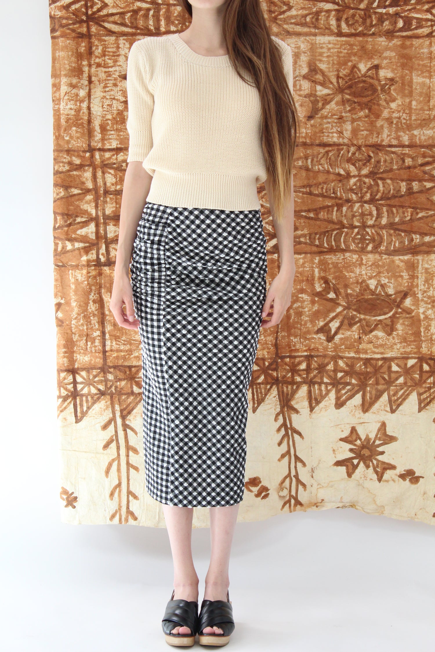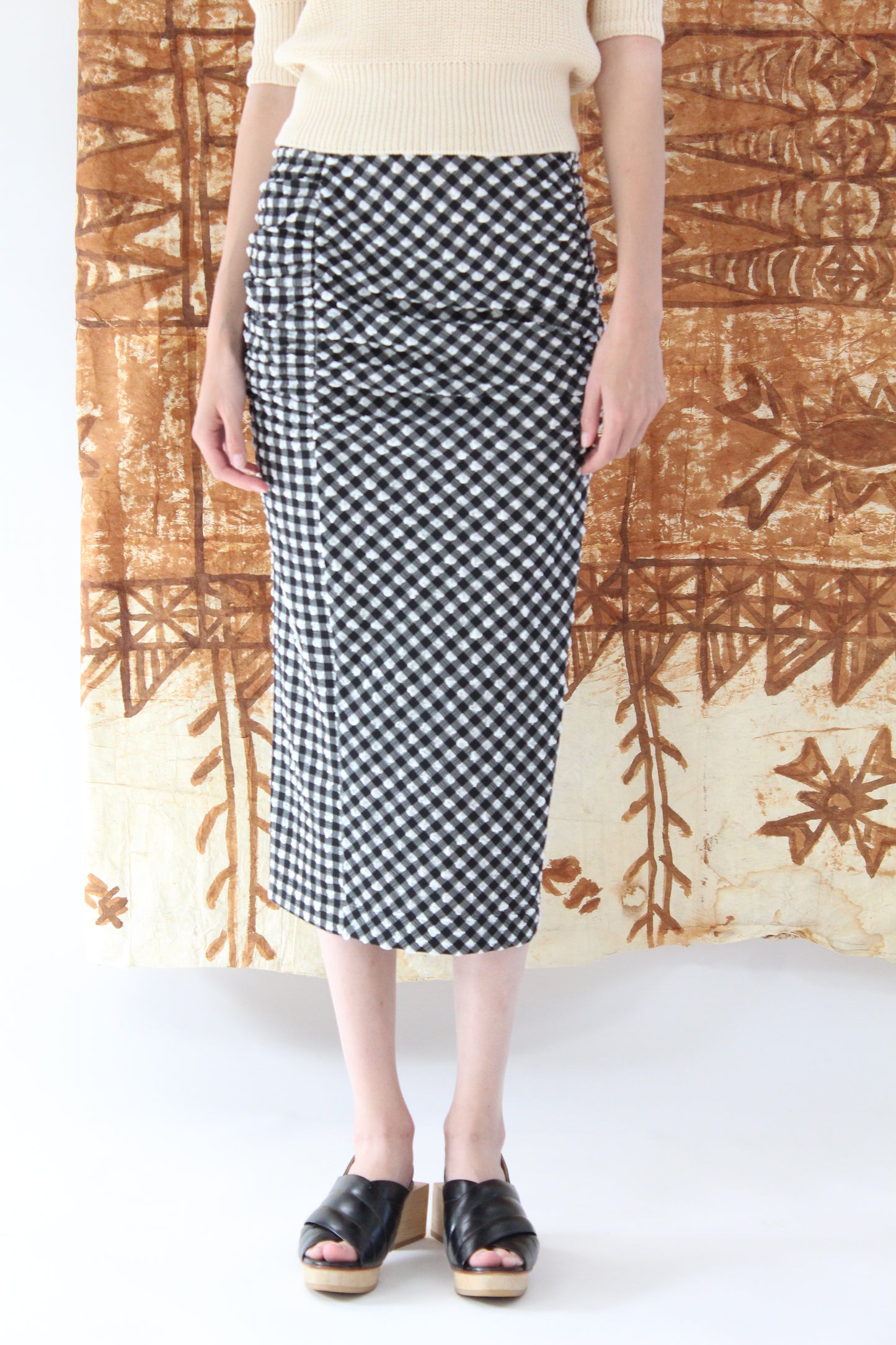 High-waisted skirt, ruched detail at the front and hips, straight fit, elastic waistband, zipper and hook and bar closure at back waistband. Hits just below the knee. 49% Polyester, 42% Nylon, 9% Elastane