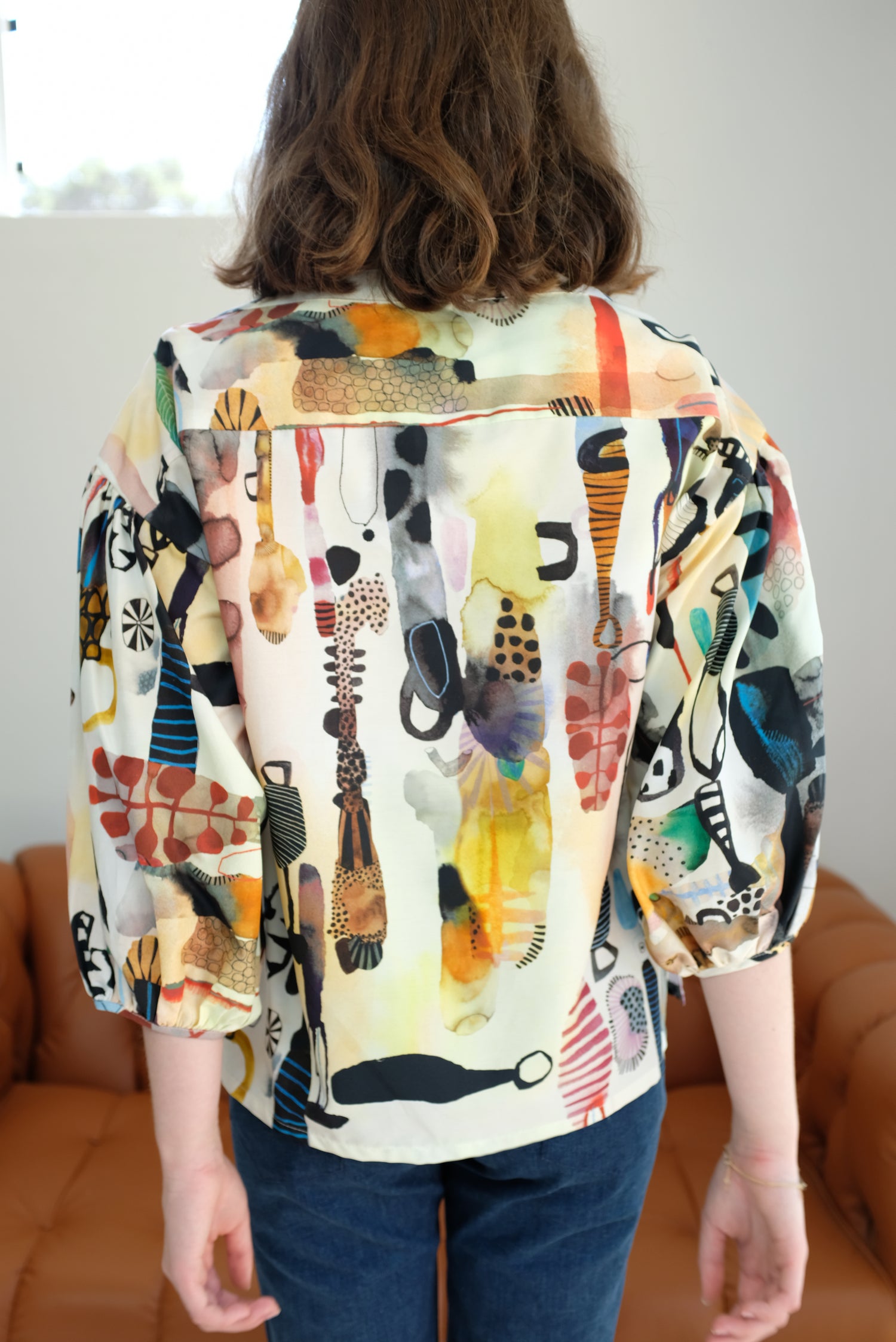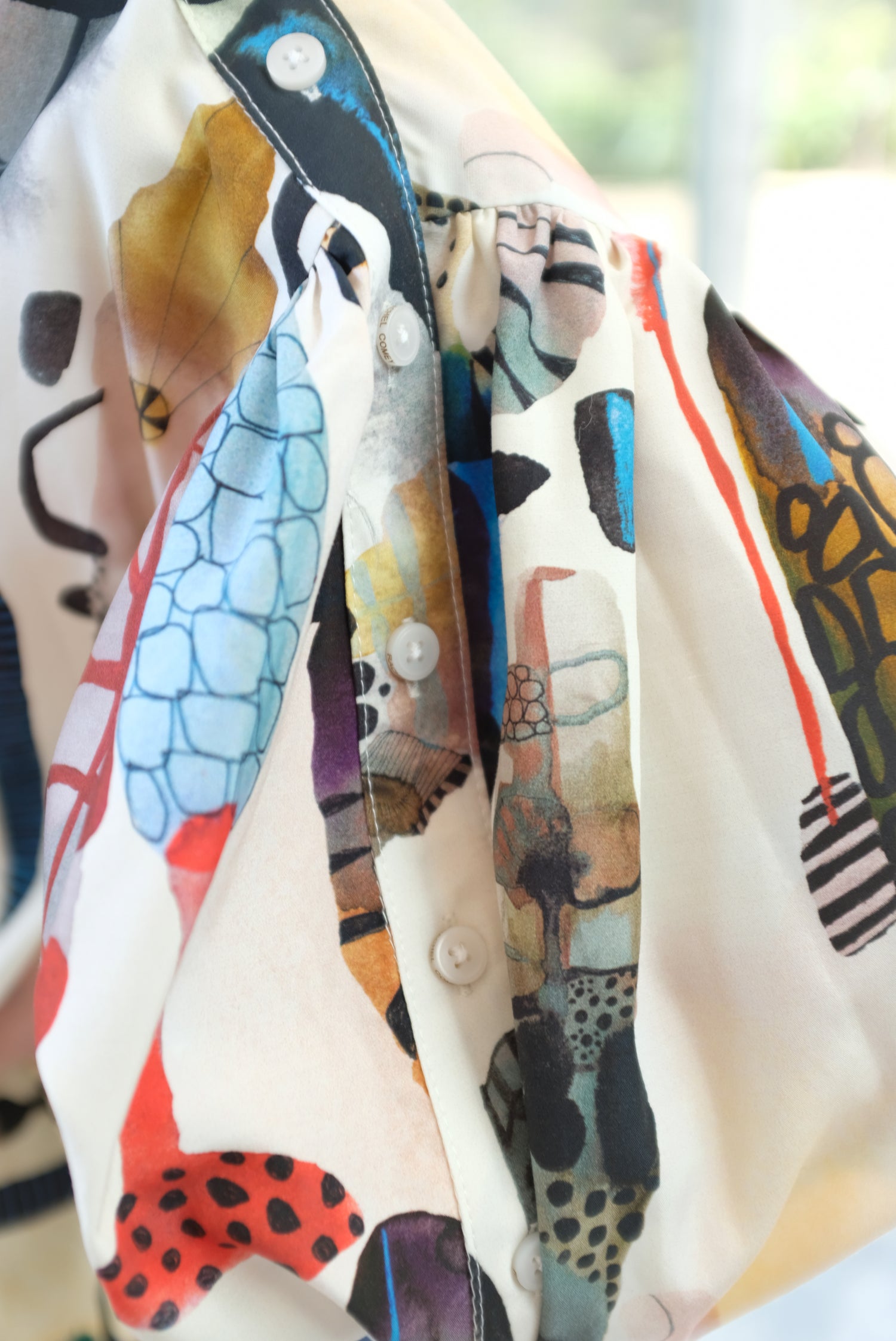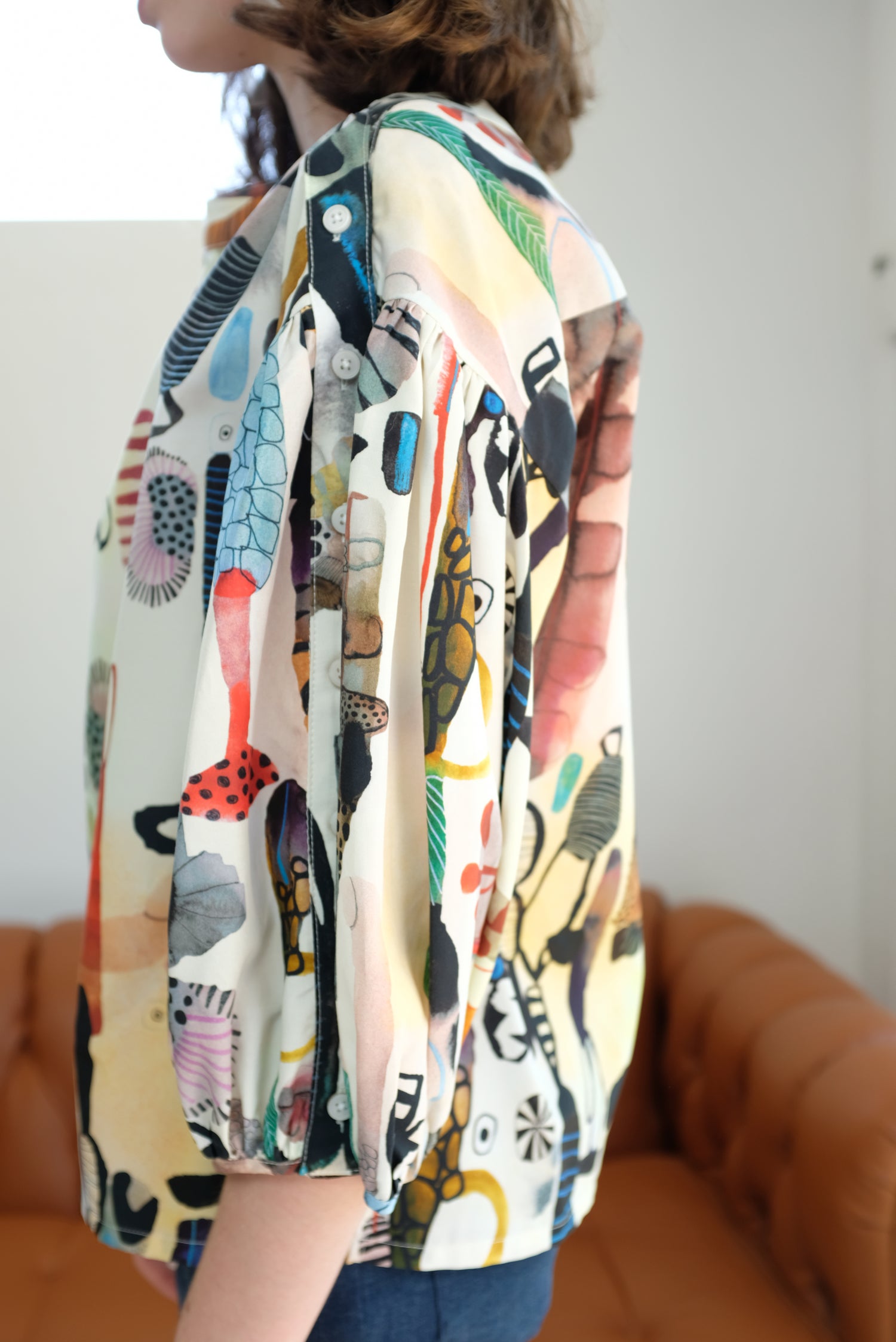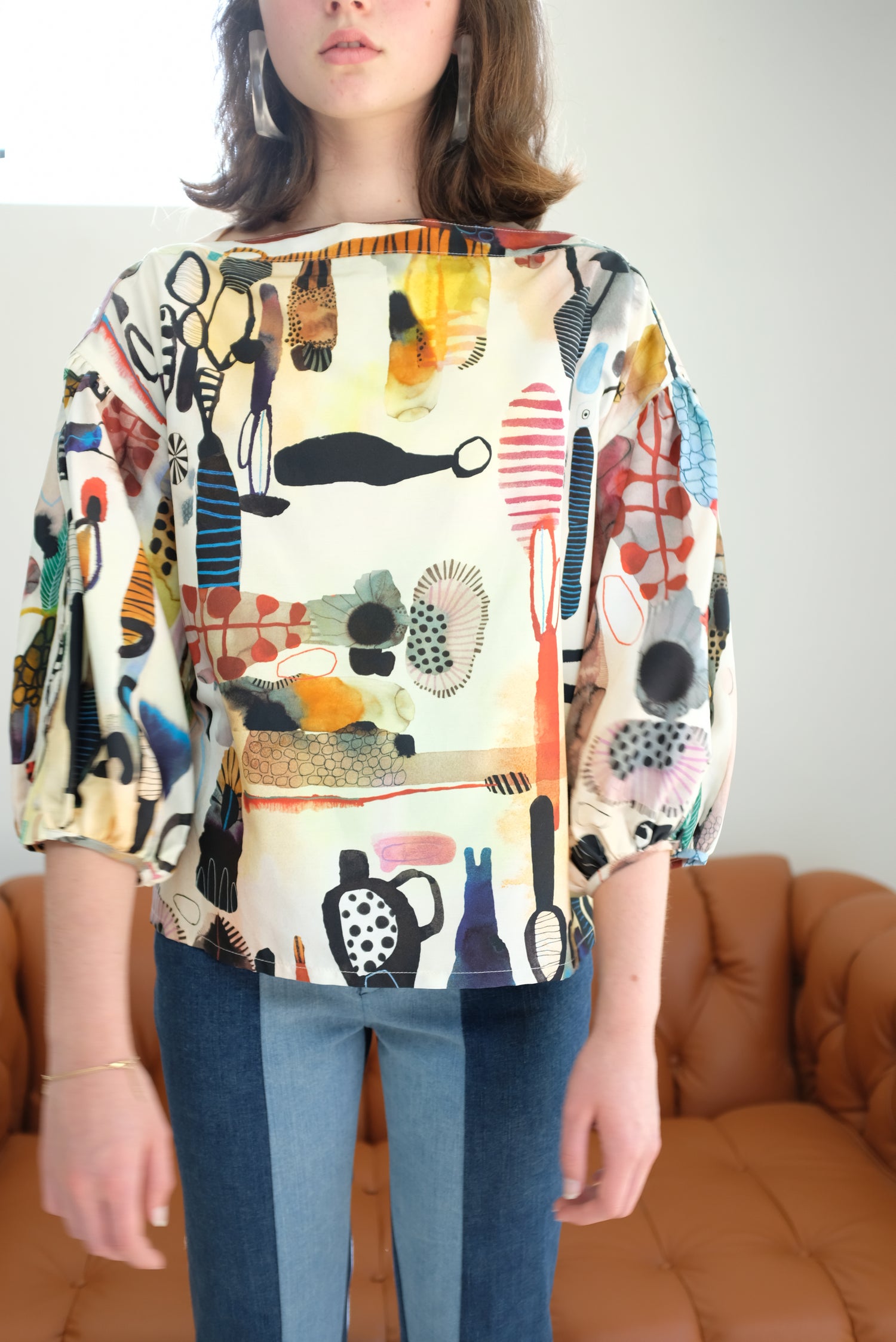 Collaboration with Swedish artist Emma Larsson, her work printed on a silk cotton fabric. Boatneck top, puffy gathered sleeves, buttons run down length of sleeves. Relaxed fit. 57% Cotton, 43% Silk.