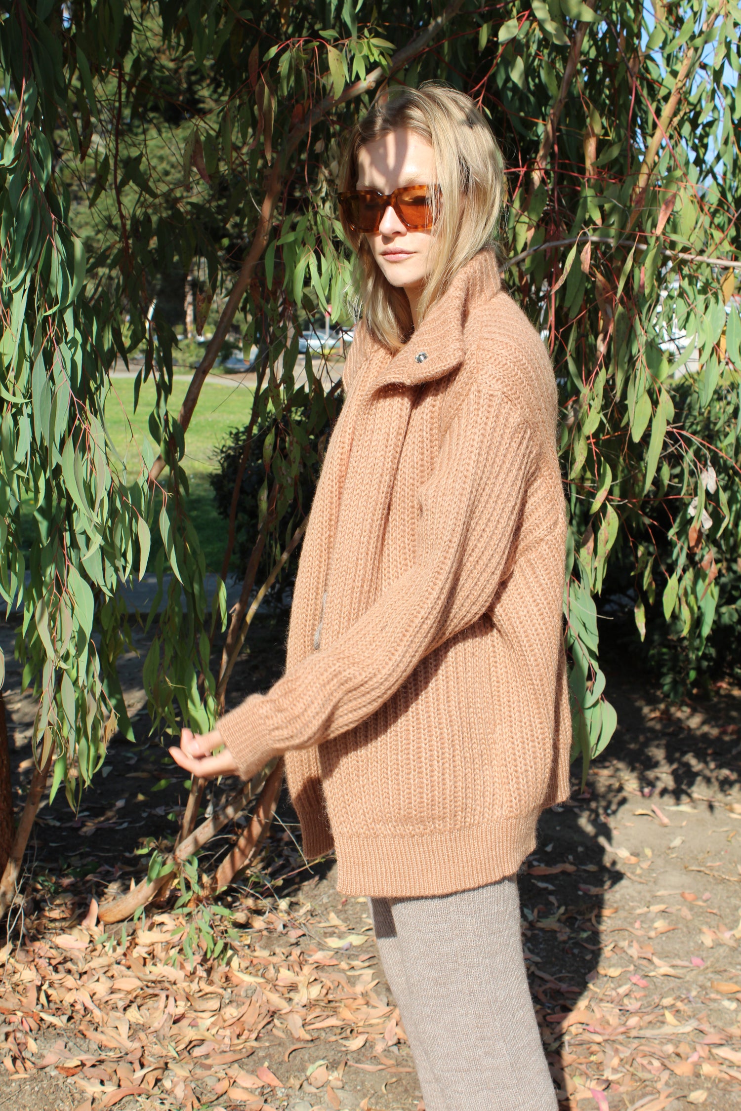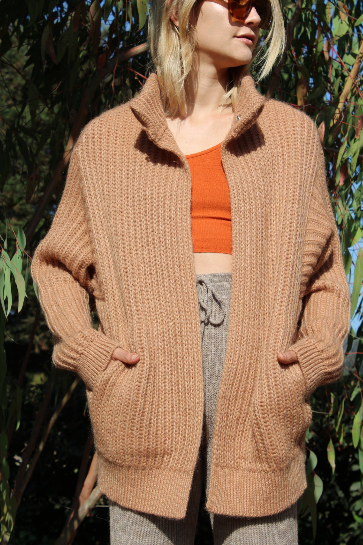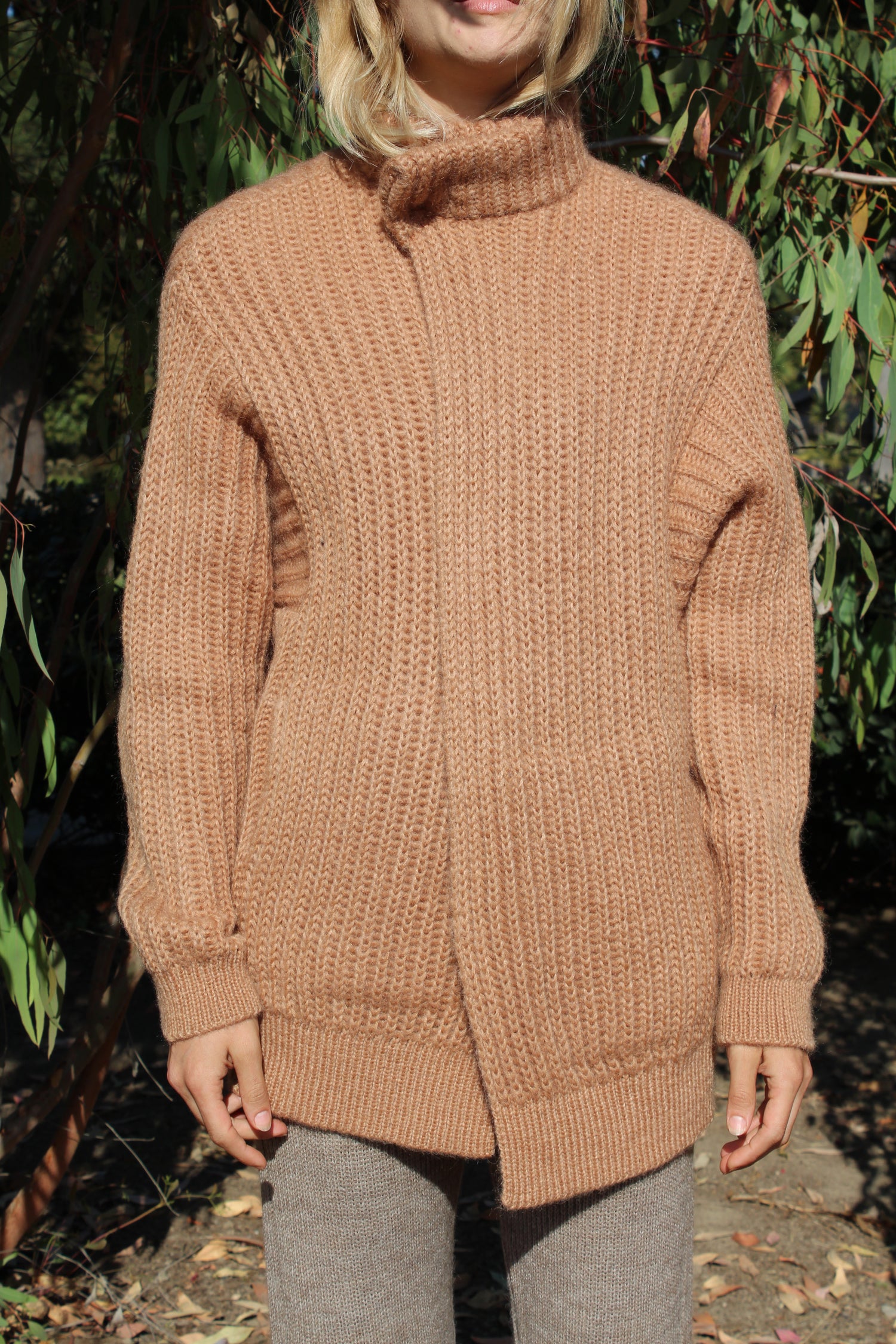 Unisex mohair blend cardigan sweater in camel. Stand collar with hidden snap and button closure. Front pockets, ribbing at cuffs and hem. Relaxed, roomy fit. Oversized cut allows sweater to fit range of sizes. Total length from shoulder to hem is 28"
