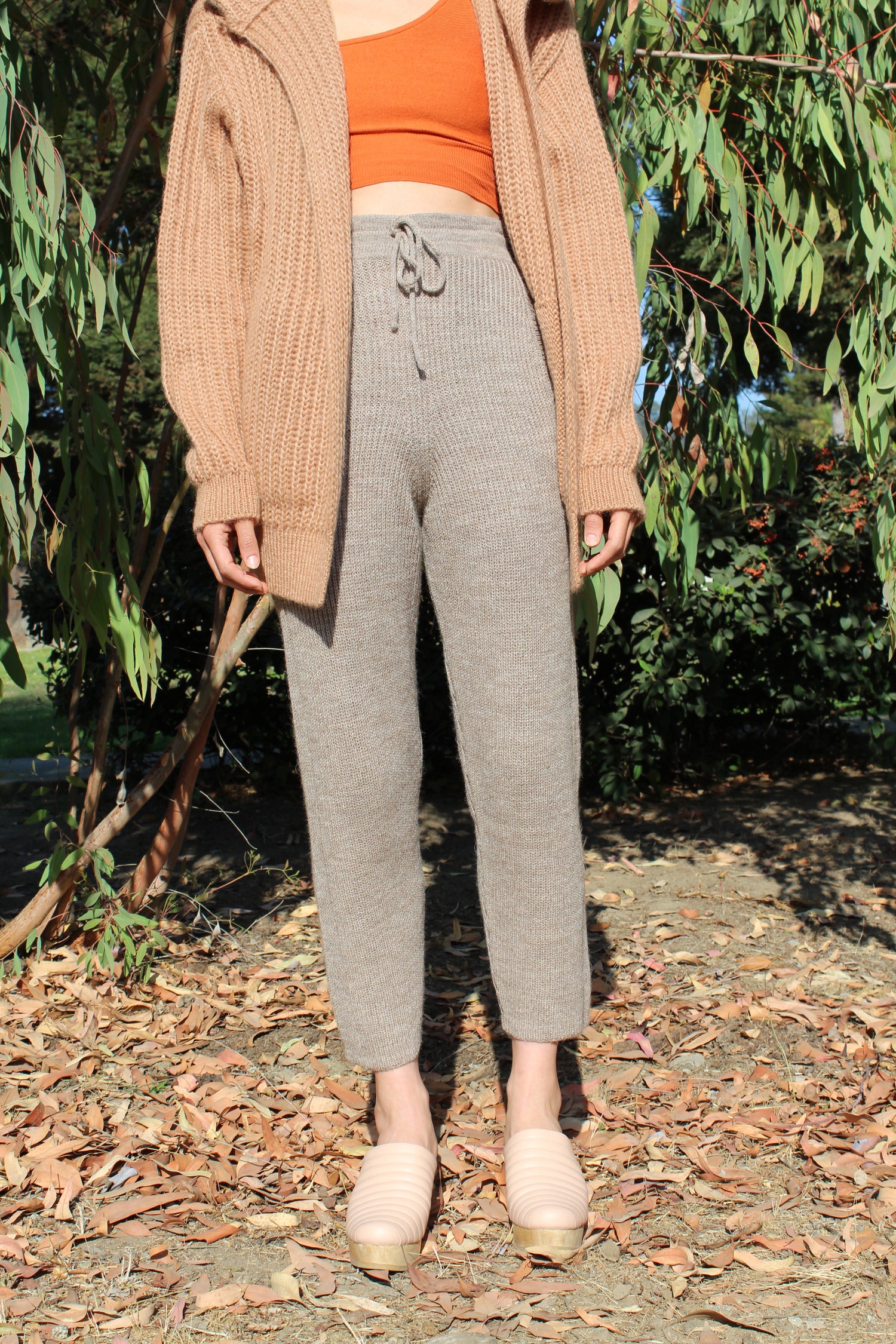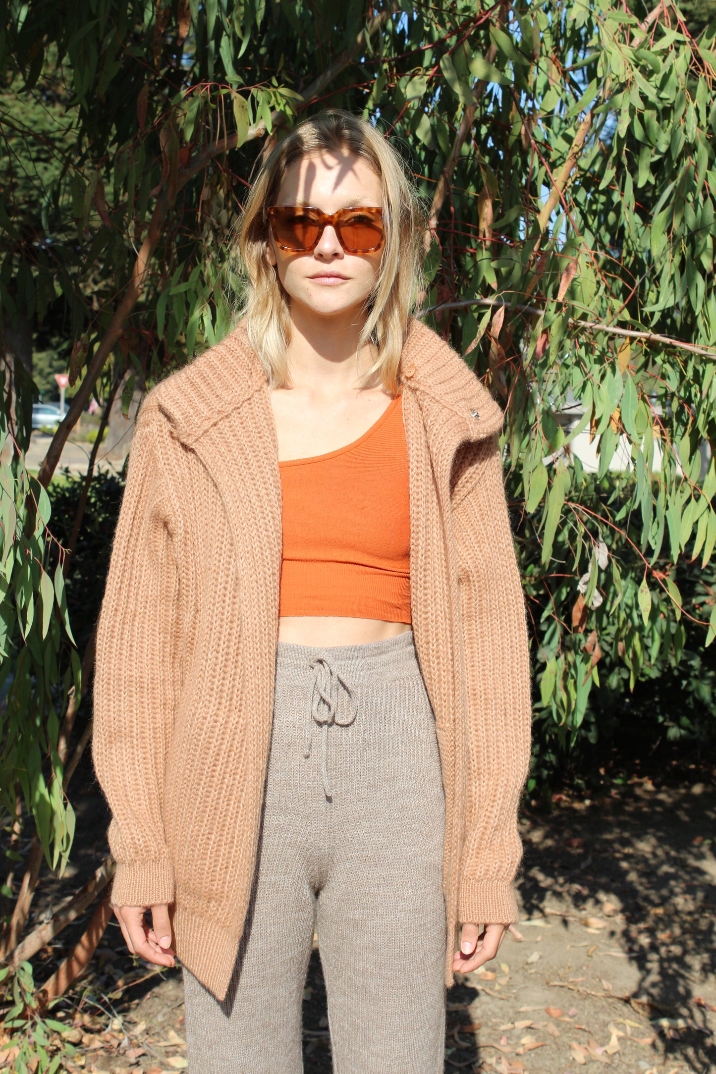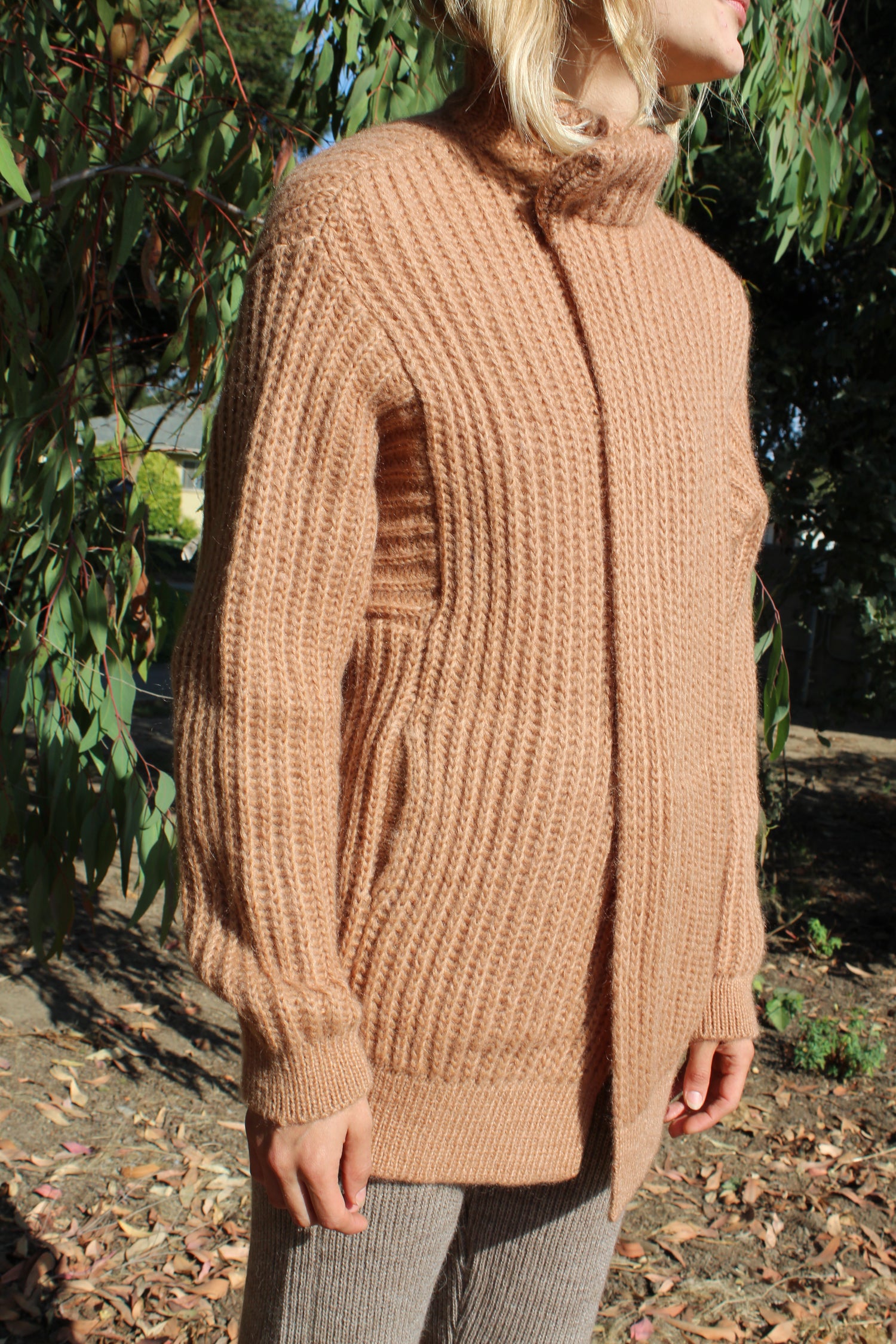 Unisex mohair blend cardigan sweater in camel. Stand collar with hidden snap and button closure. Front pockets, ribbing at cuffs and hem. Relaxed, roomy fit. Oversized cut allows sweater to fit range of sizes. Total length from shoulder to hem is 28"