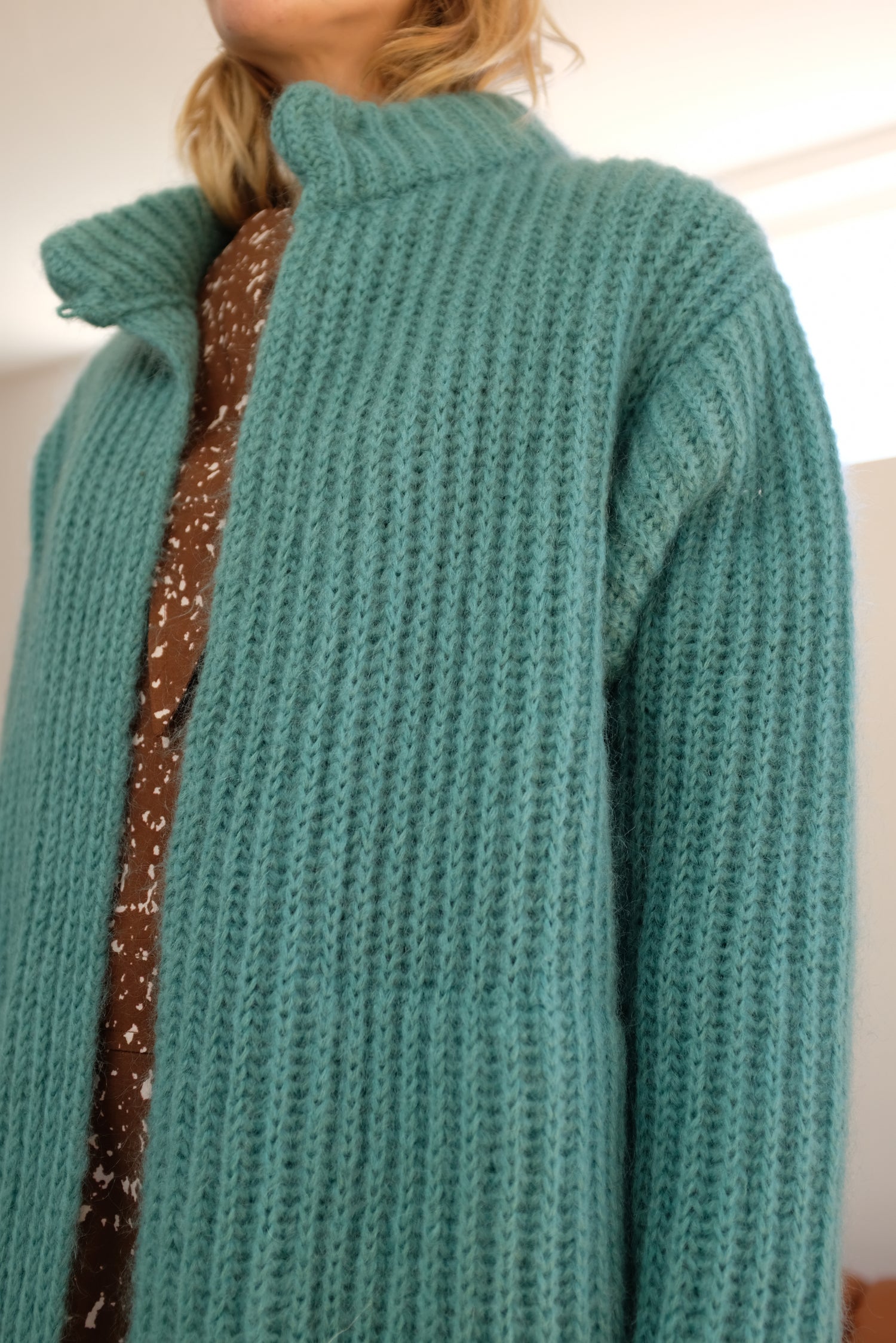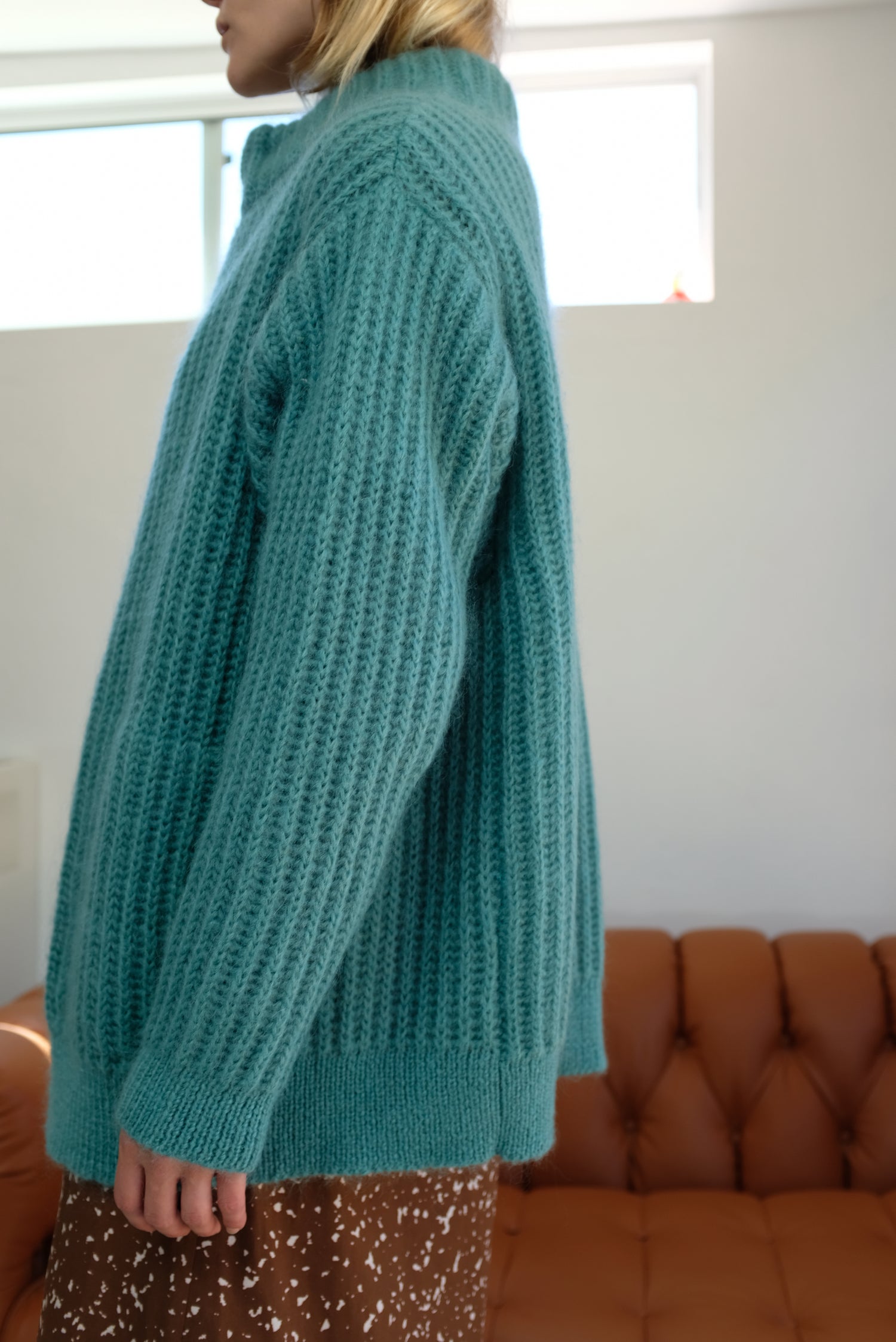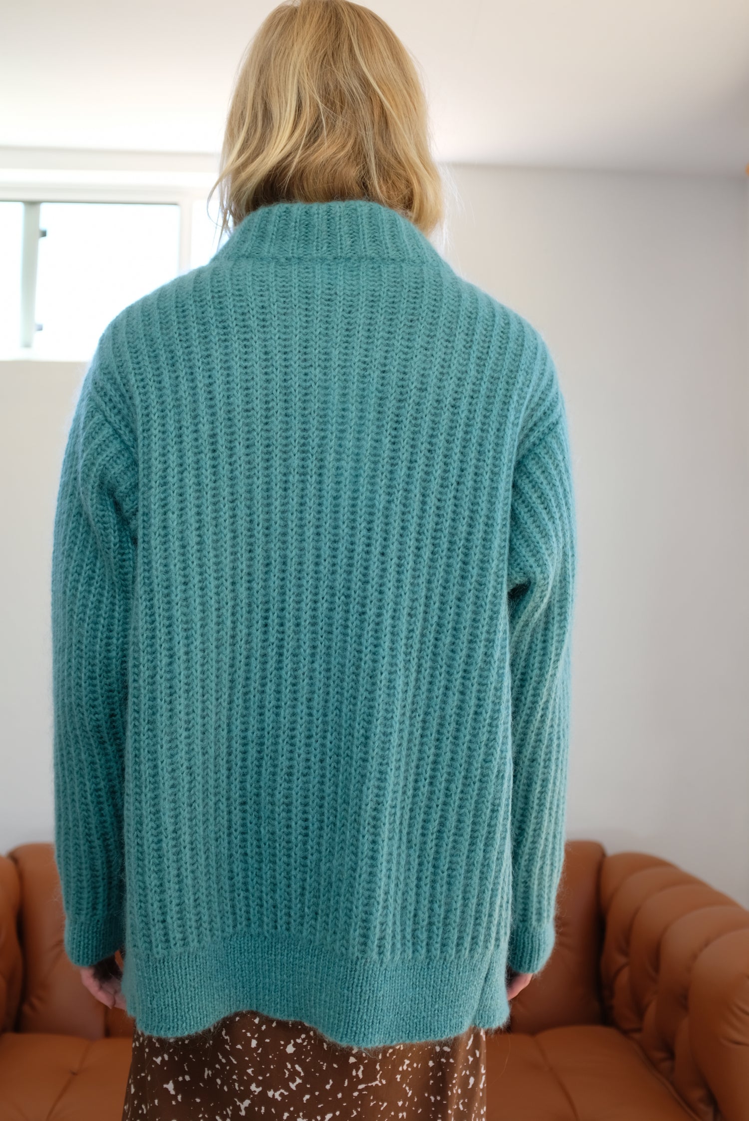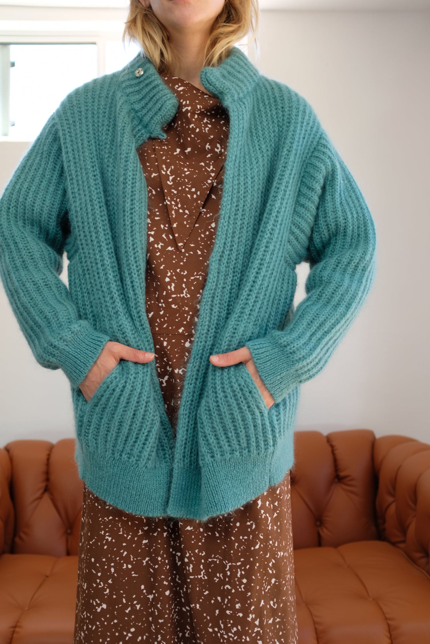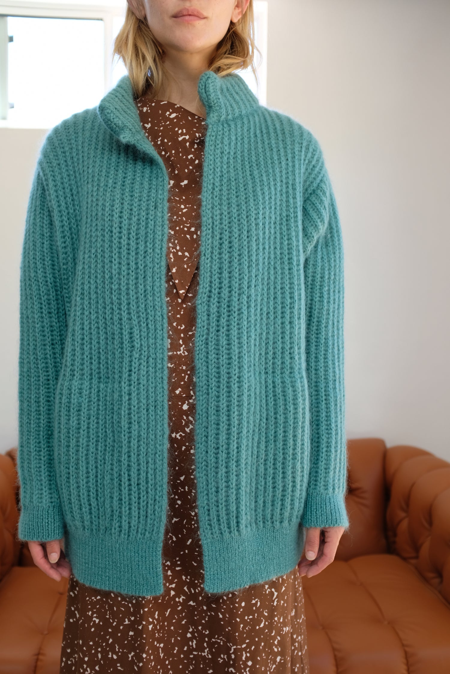 Unisex mohair blend cardigan sweater in black. Stand collar with hidden snap and button closure. Front pockets, ribbing at cuffs and hem. Relaxed, roomy fit. Oversized cut allows sweater to fit range of sizes. Total length from shoulder to hem is 28".