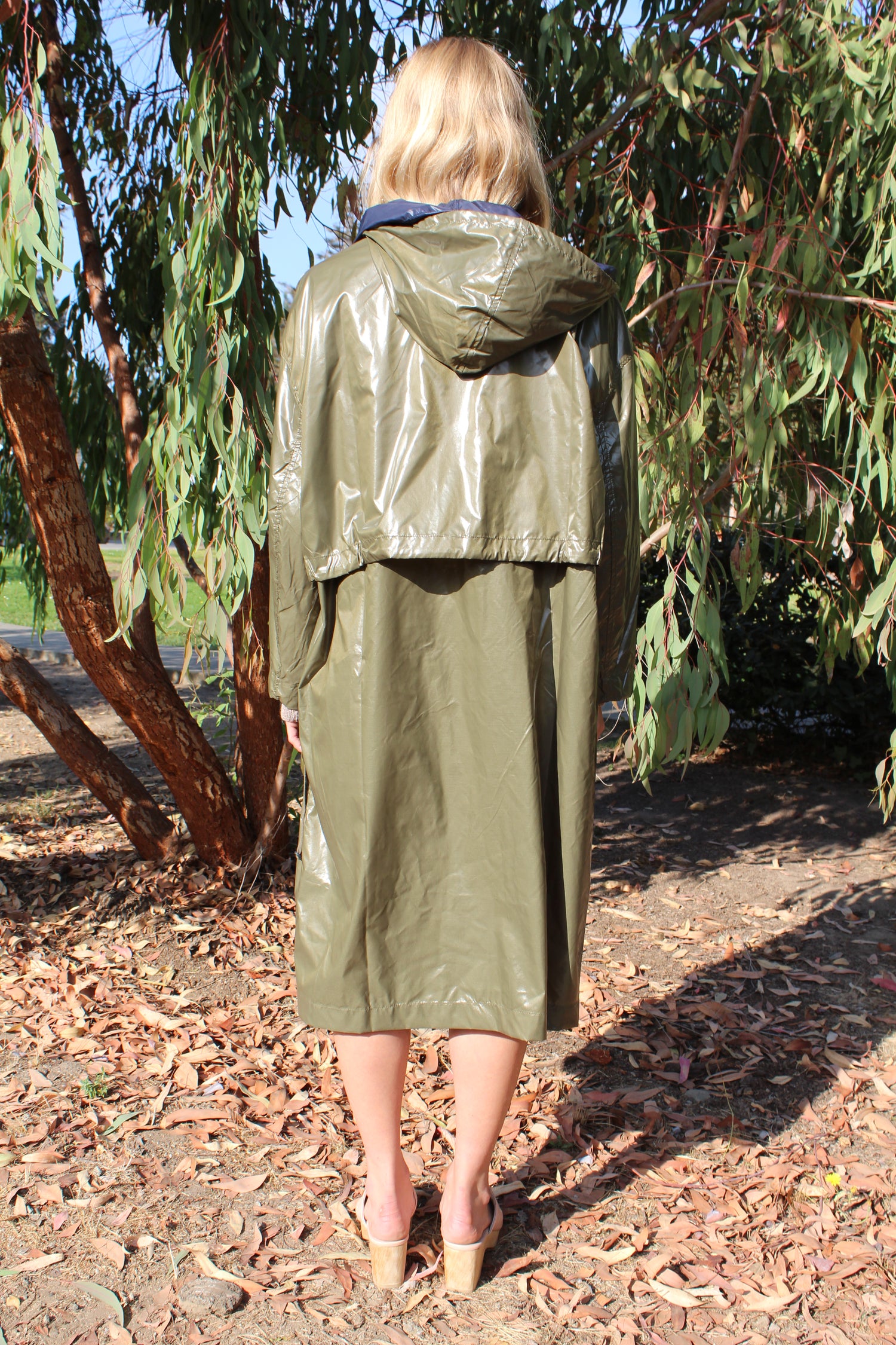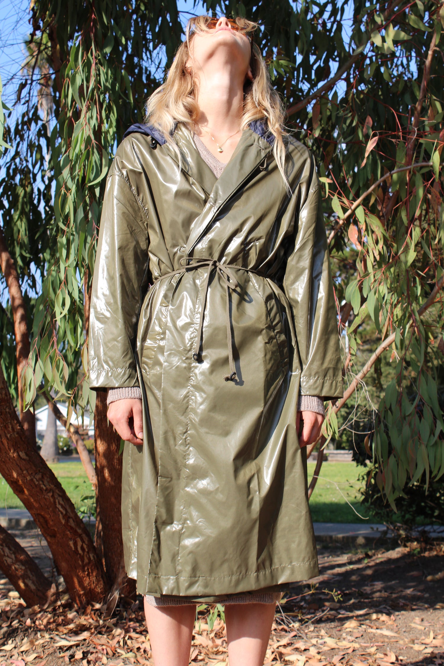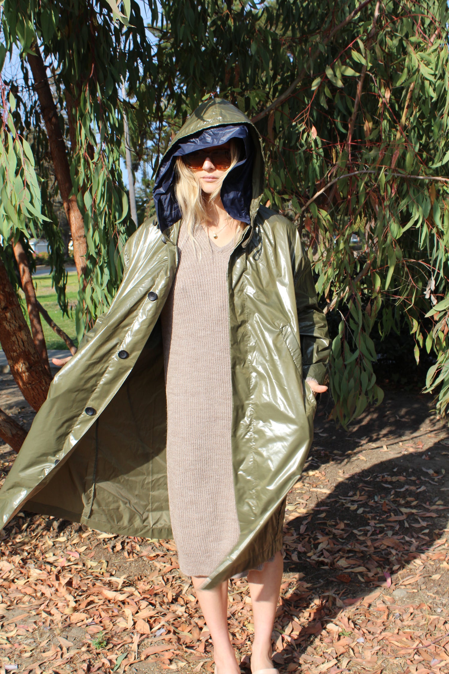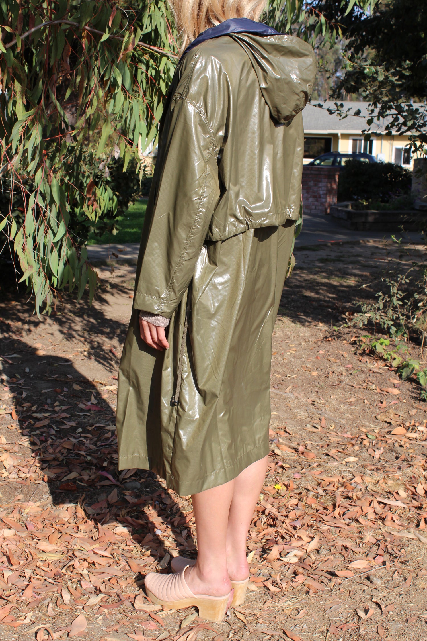 Light weight waterproof coat with doubled hood, hidden button closure & drawstrings, pockets. A unisex style. Total length from shoulder to hem is 45”. 83% polyamide, 17% polyurethane waterproof ripstop