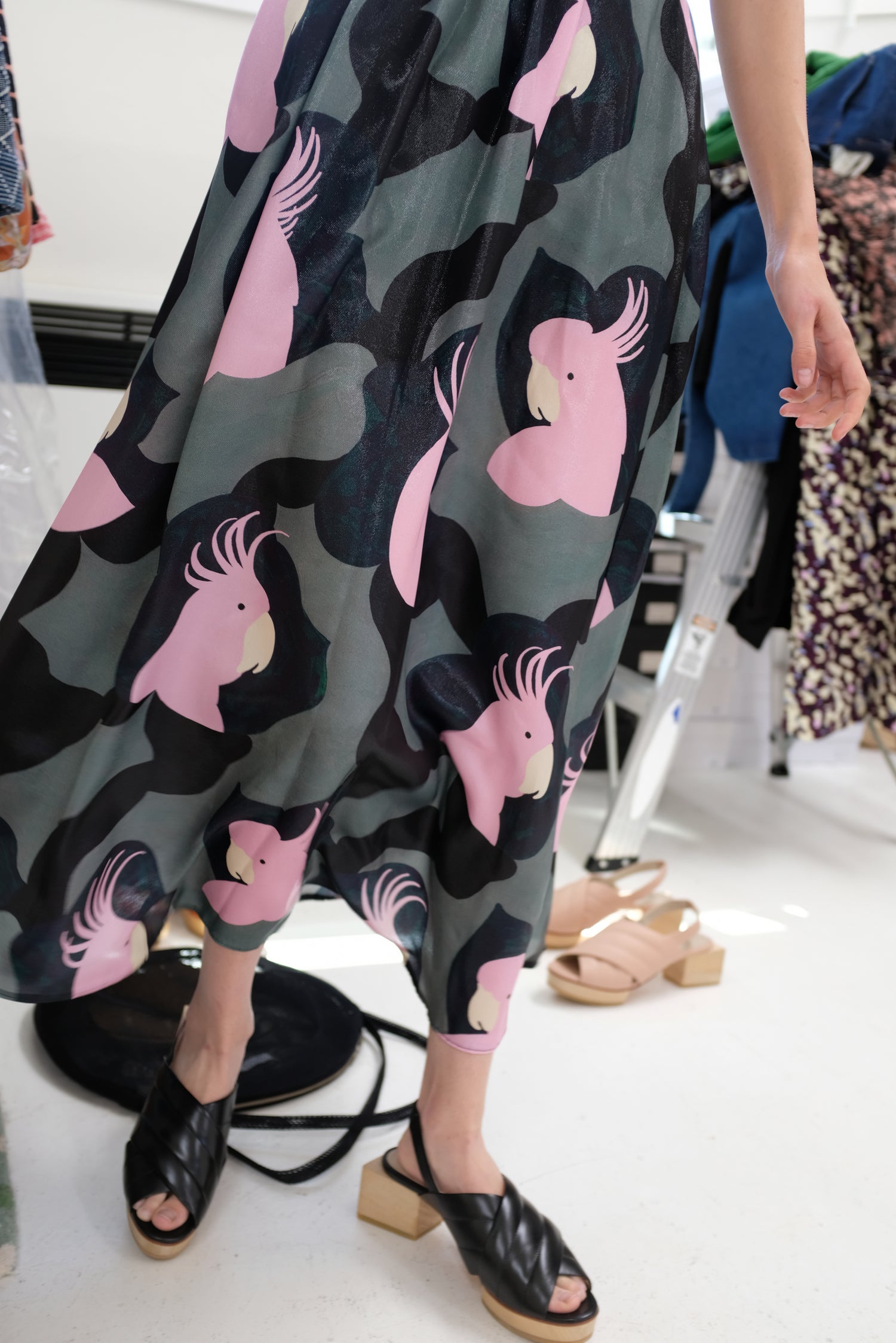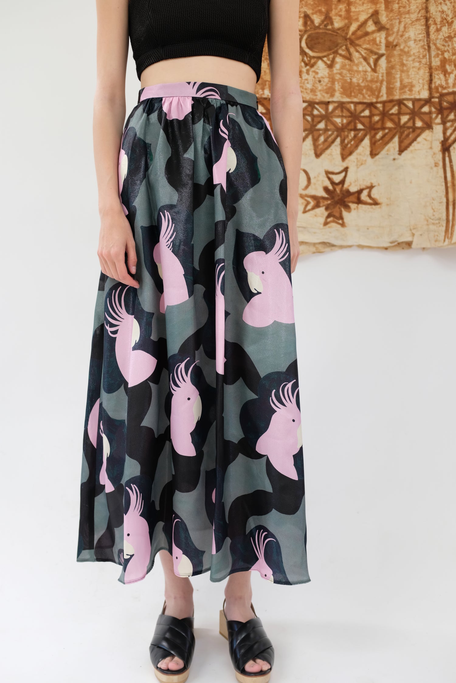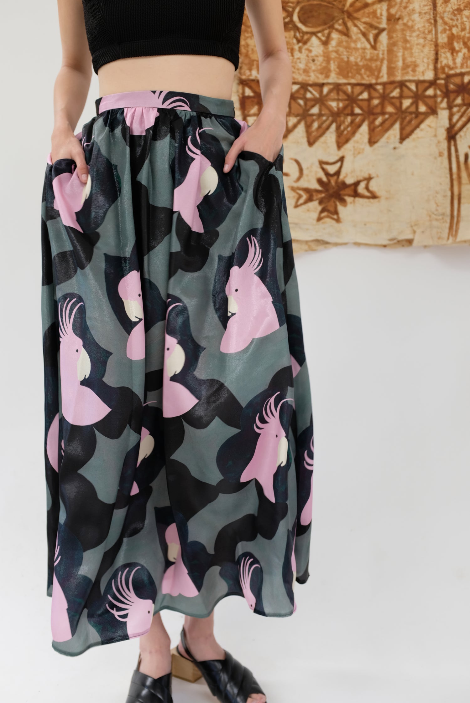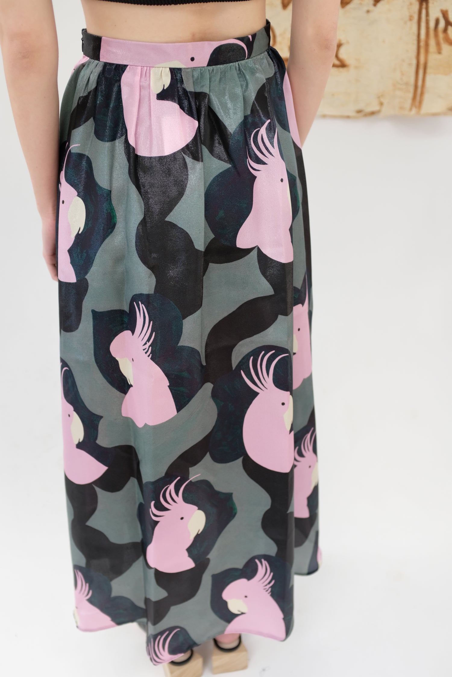 Printed silk blend skirt with a light magical metallic detail/sheen, below the knee length, blind zipper fastening at side, slit pockets at sides. Pleated from the waist, fully lined. Iso Kakadu print designed by Erja Hirvi, 85% Silk, 15% Polyamide.