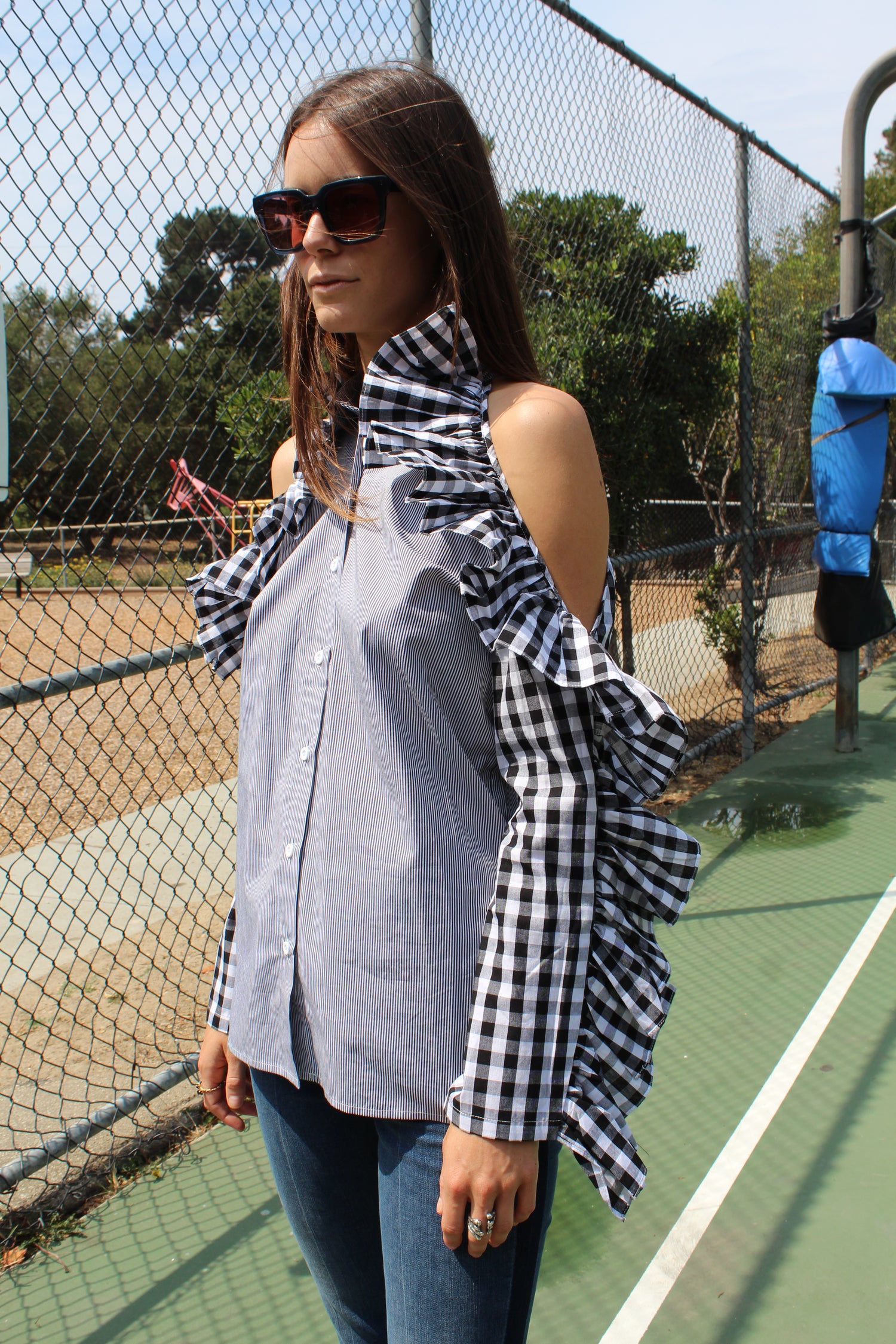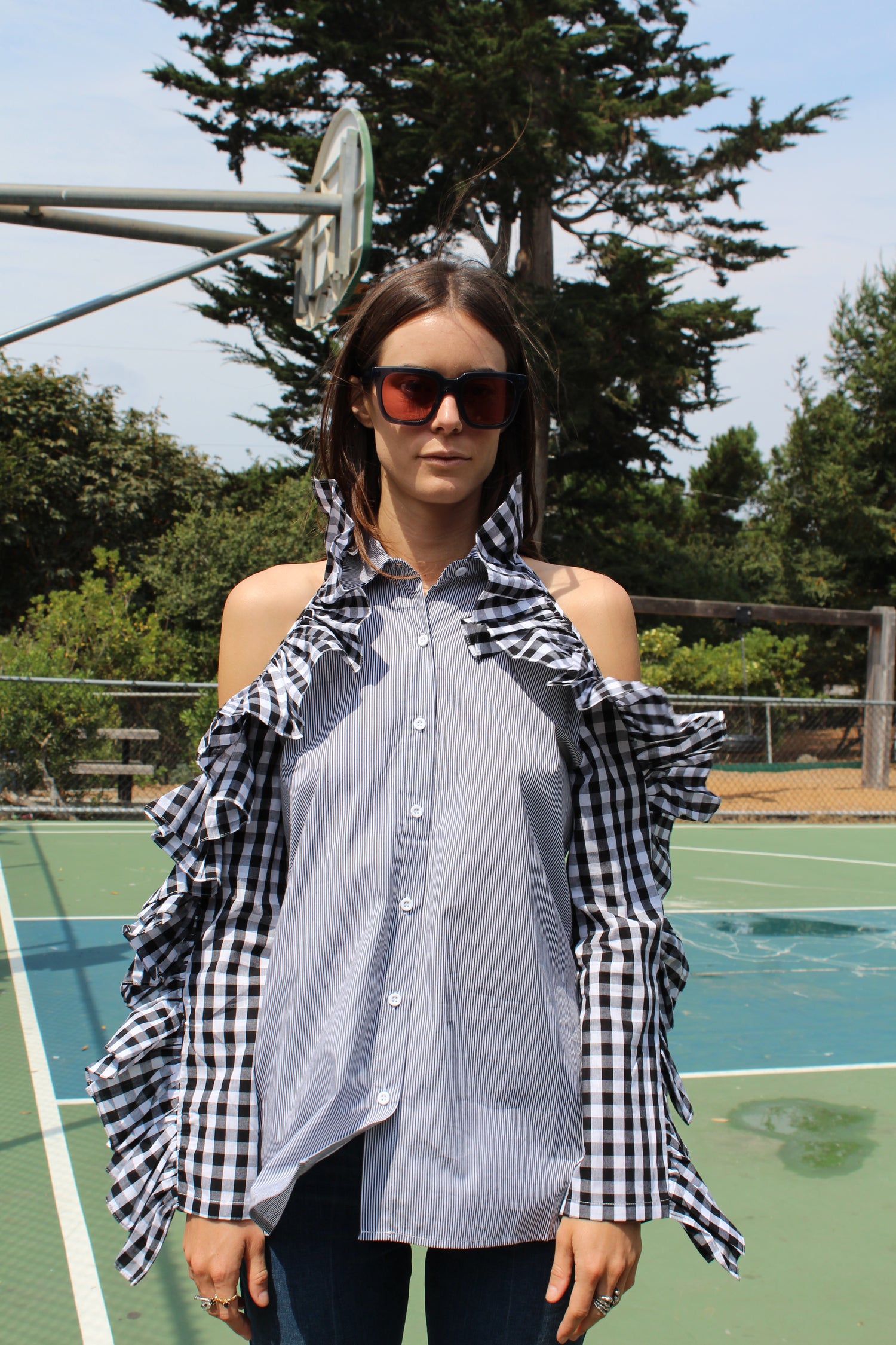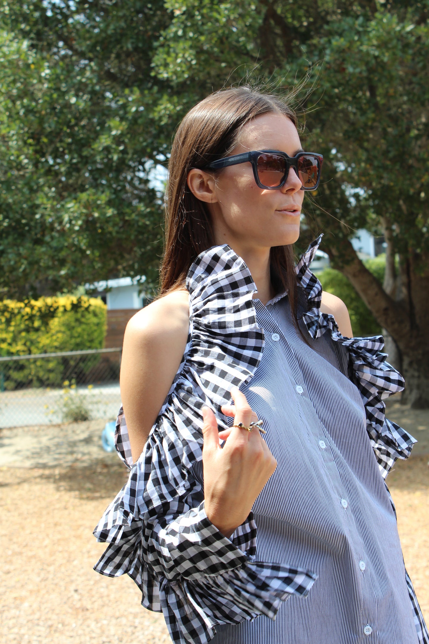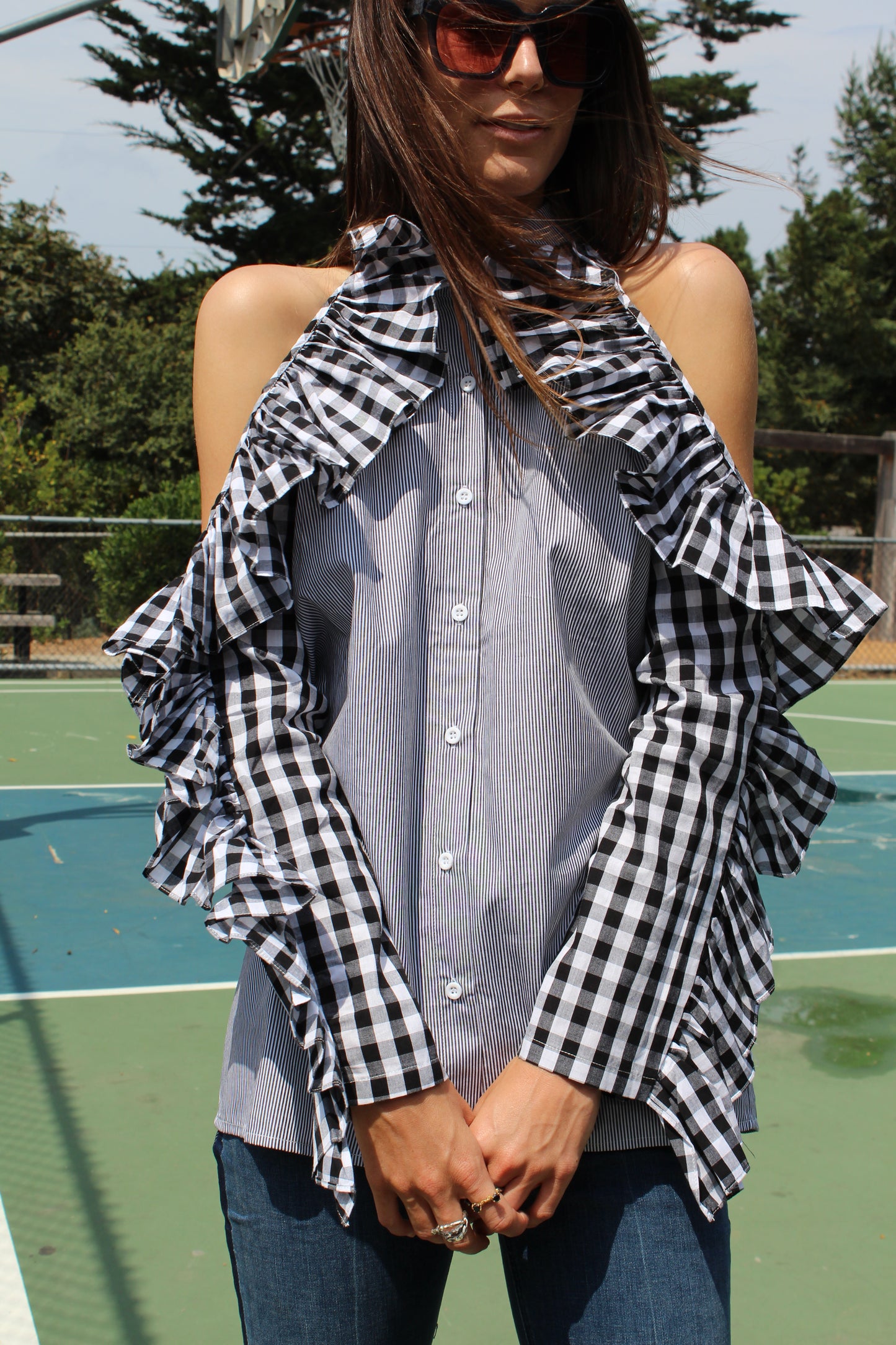 Classic button down, peaking shoulders and gingham patterned ruffle detail on the sleeves. 100% cotton. Runs true to size. Abigail is wearing a size small.