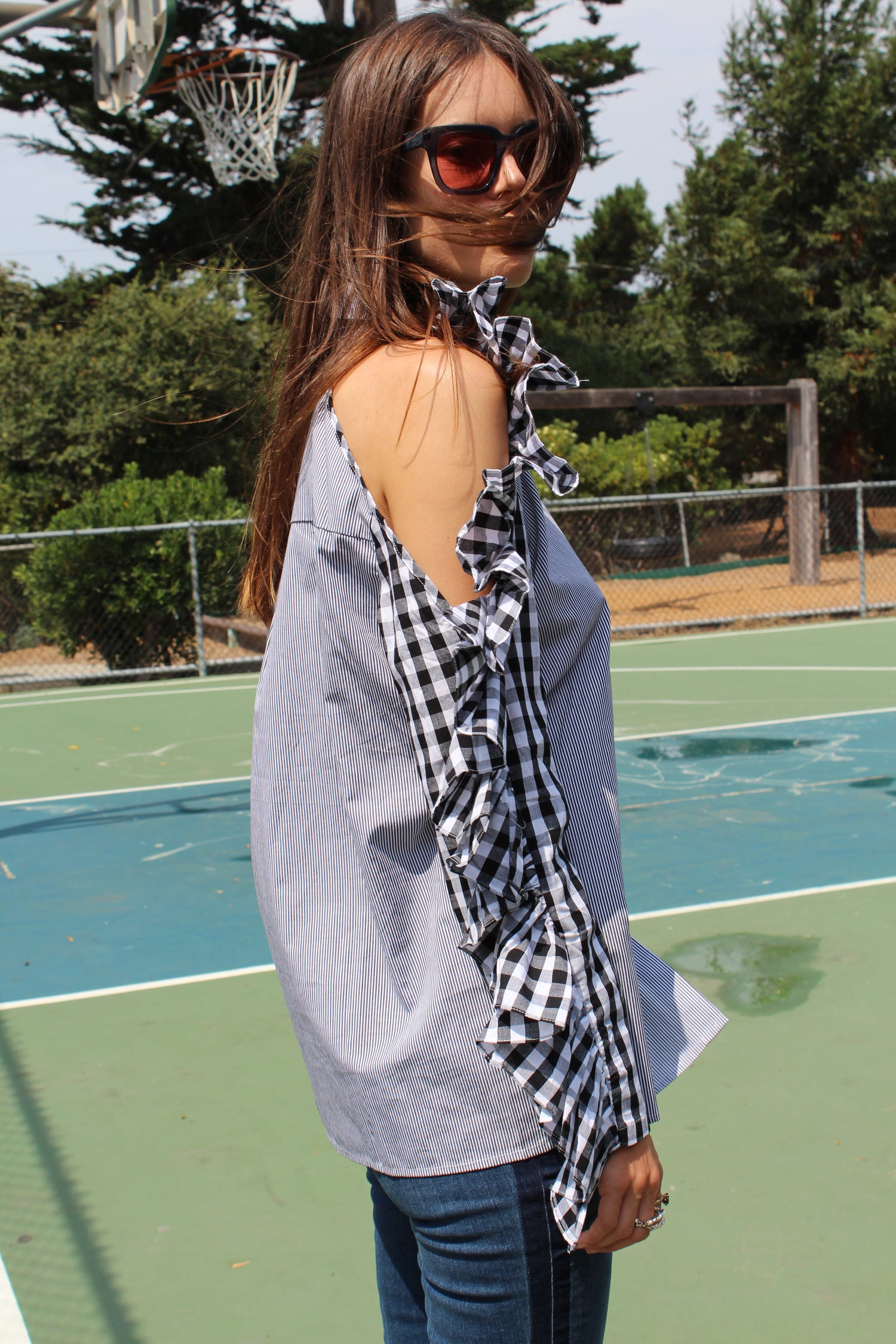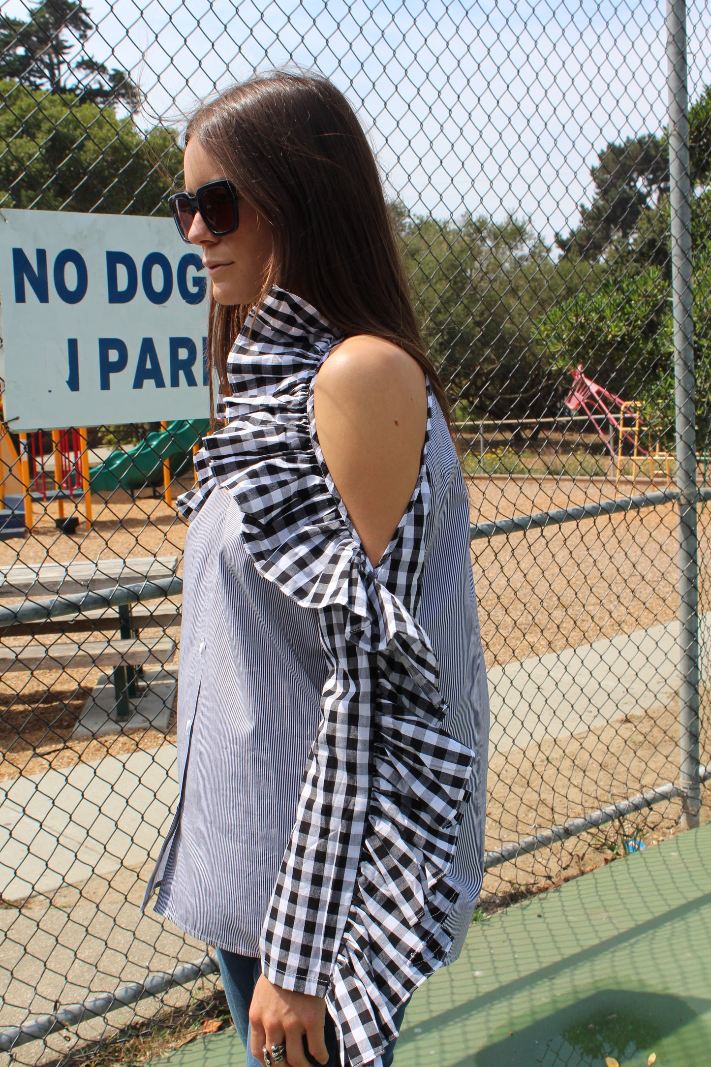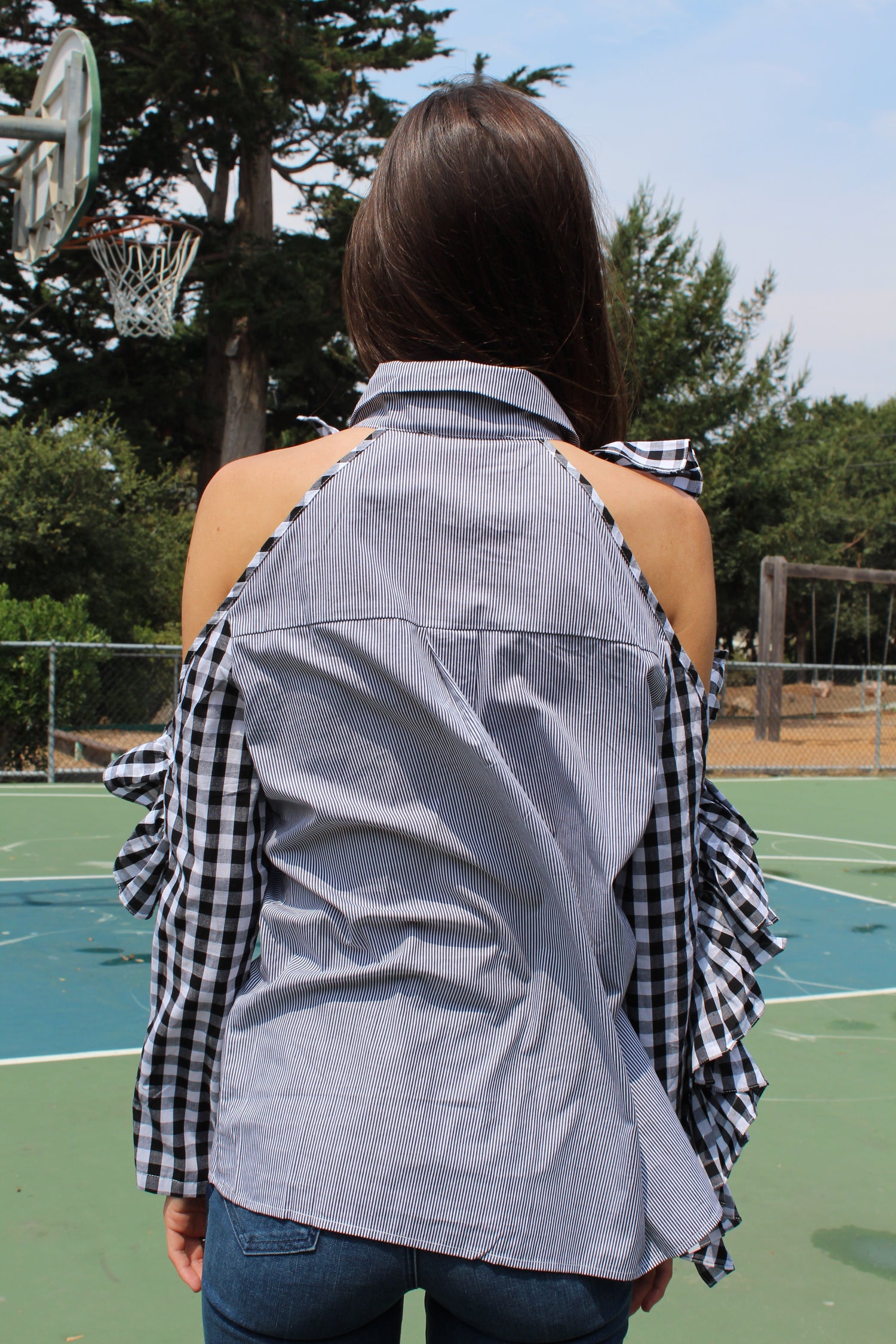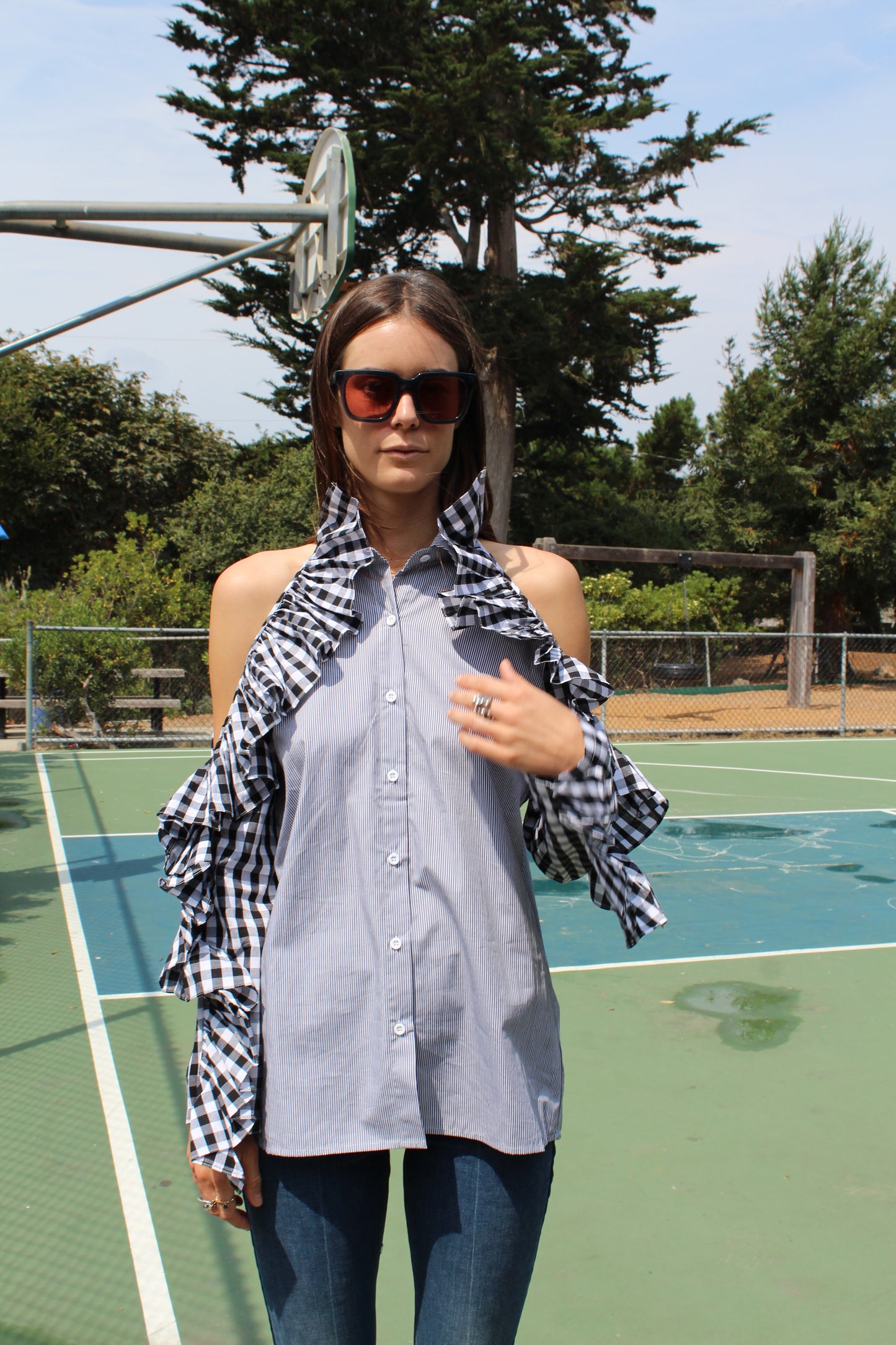Classic button down, peaking shoulders and gingham patterned ruffle detail on the sleeves. 100% cotton. Runs true to size. Abigail is wearing a size small.