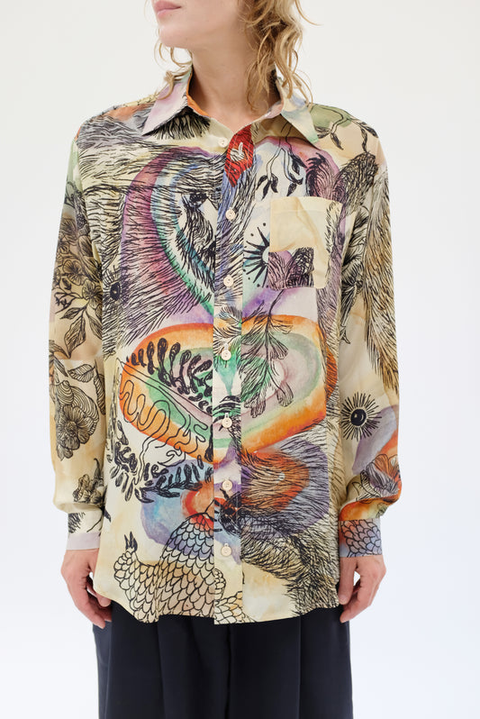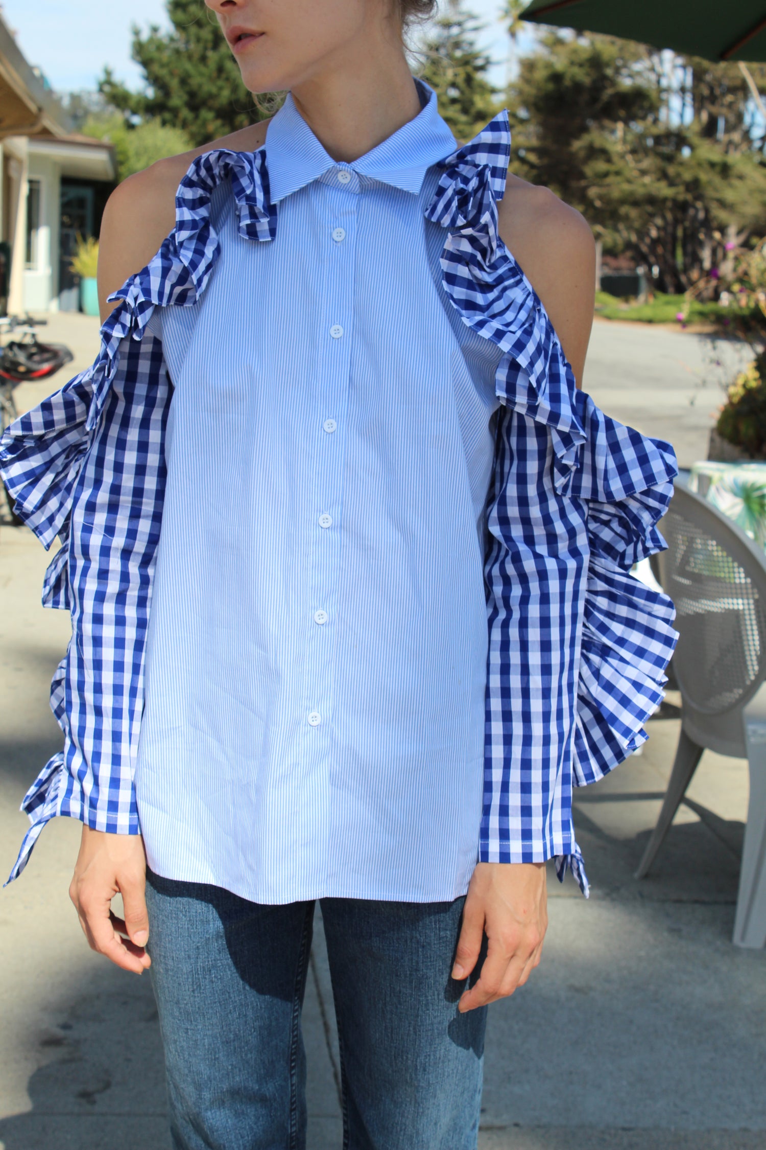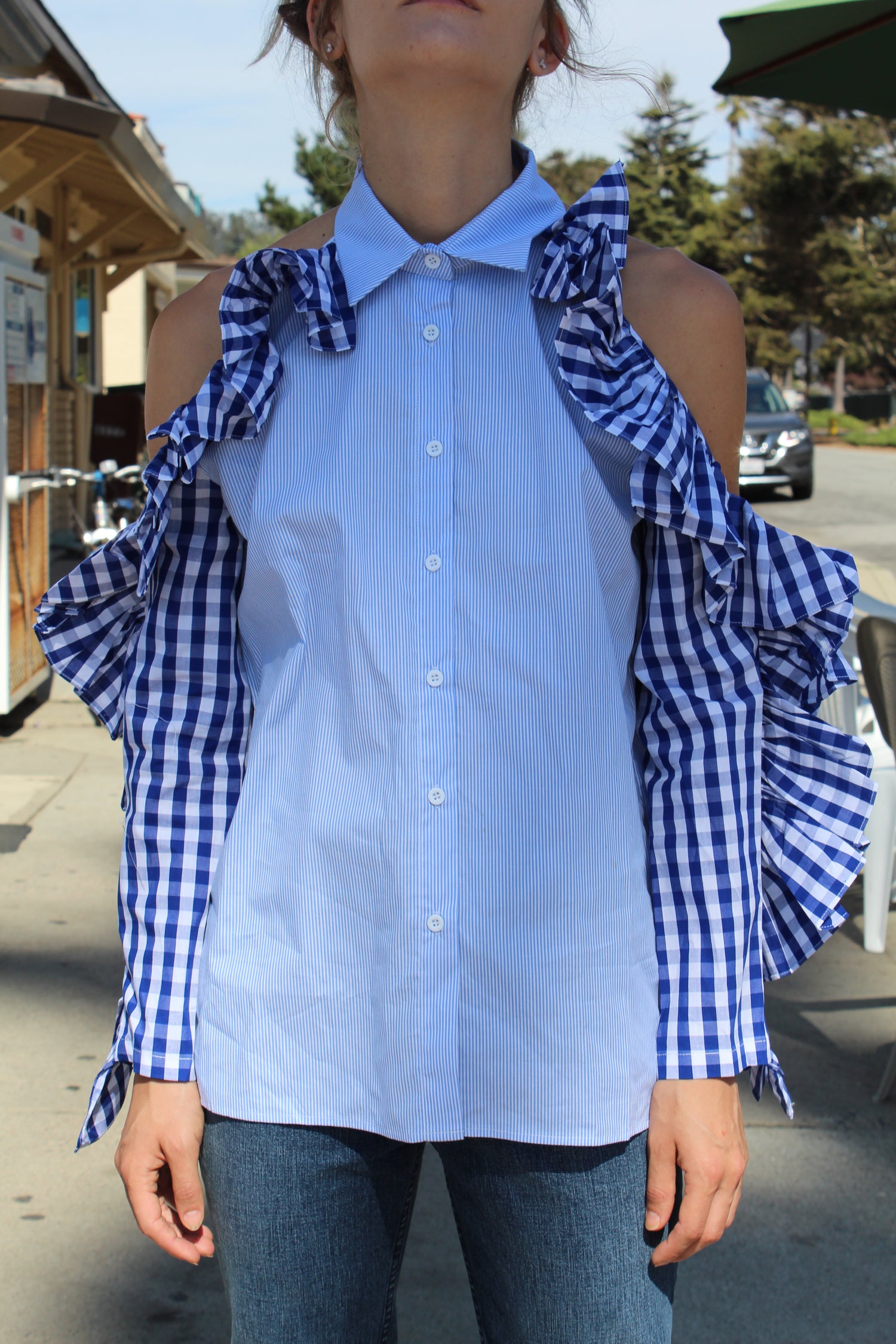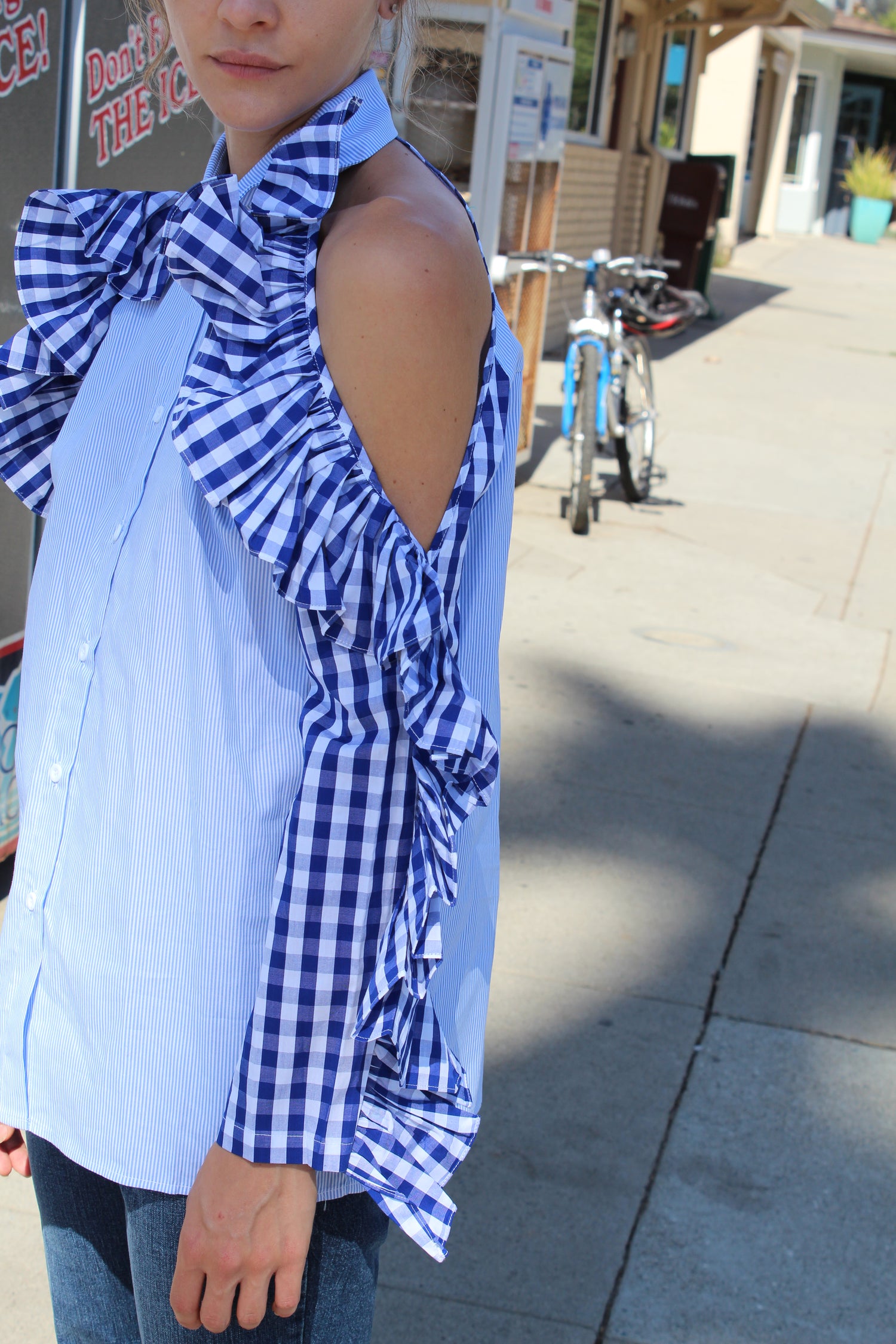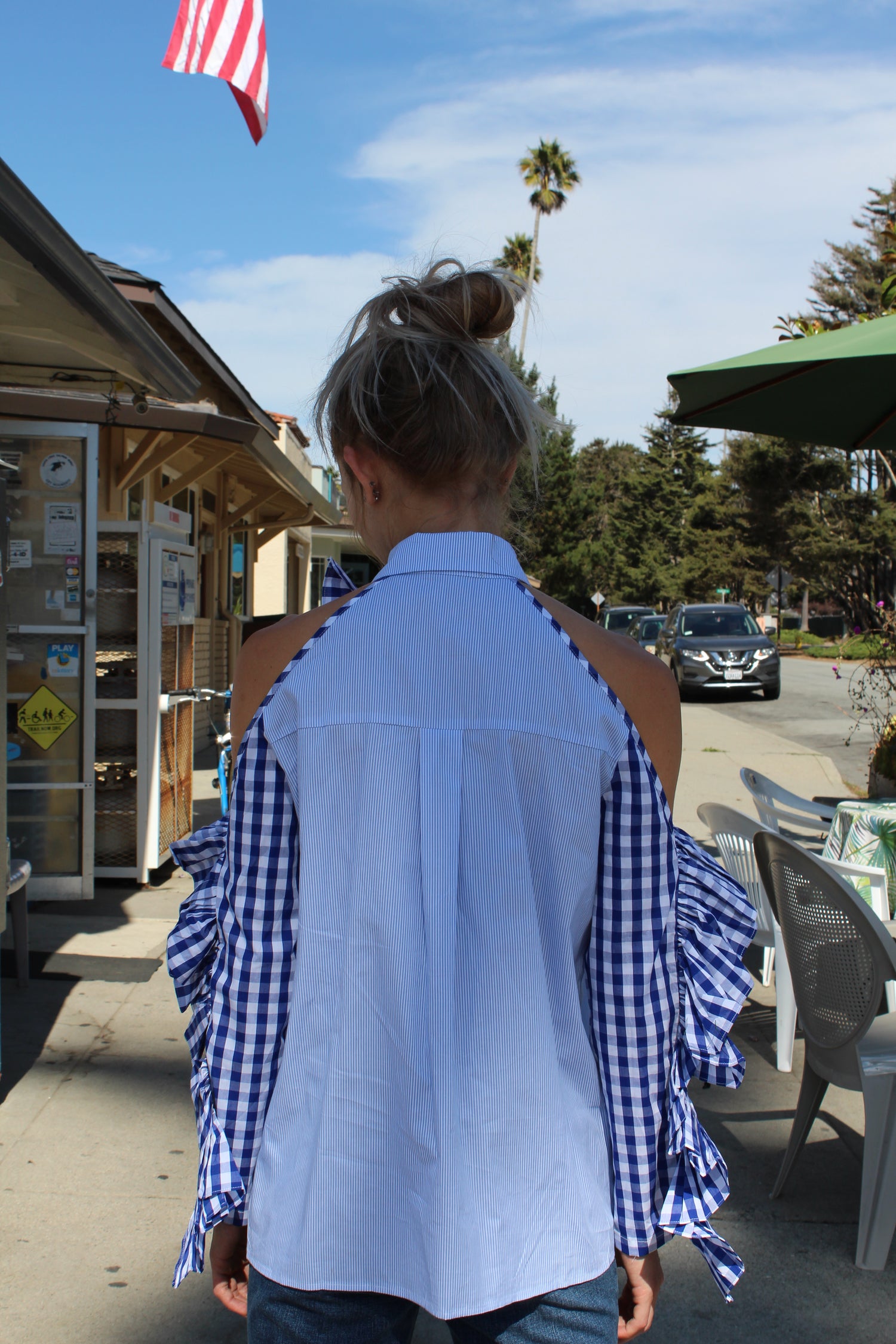 Classic button down, peaking shoulders and gingham patterned ruffle detail on the sleeves. 100% cotton. Runs true to size. Alexis is wearing a size small. Small, total length 27"