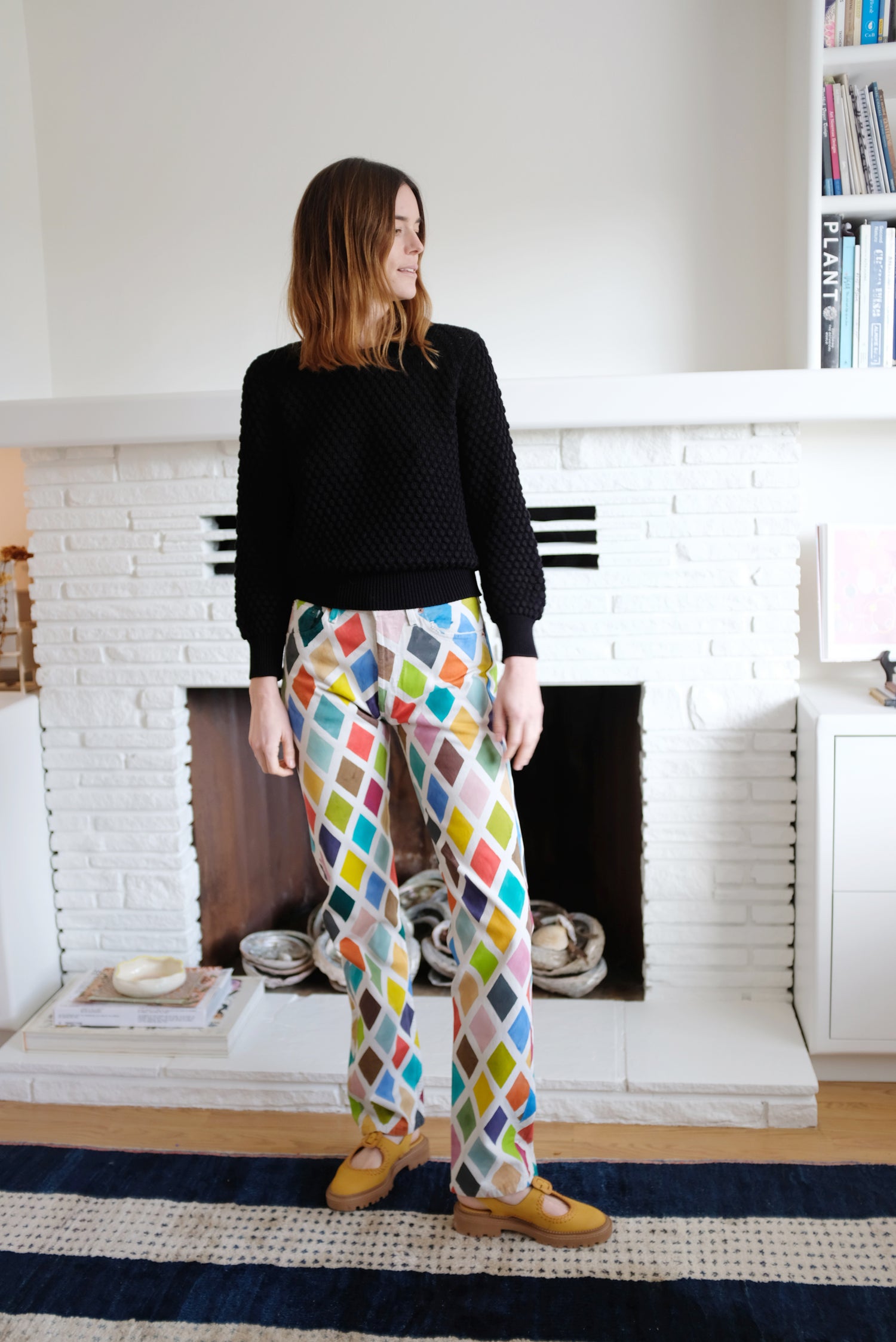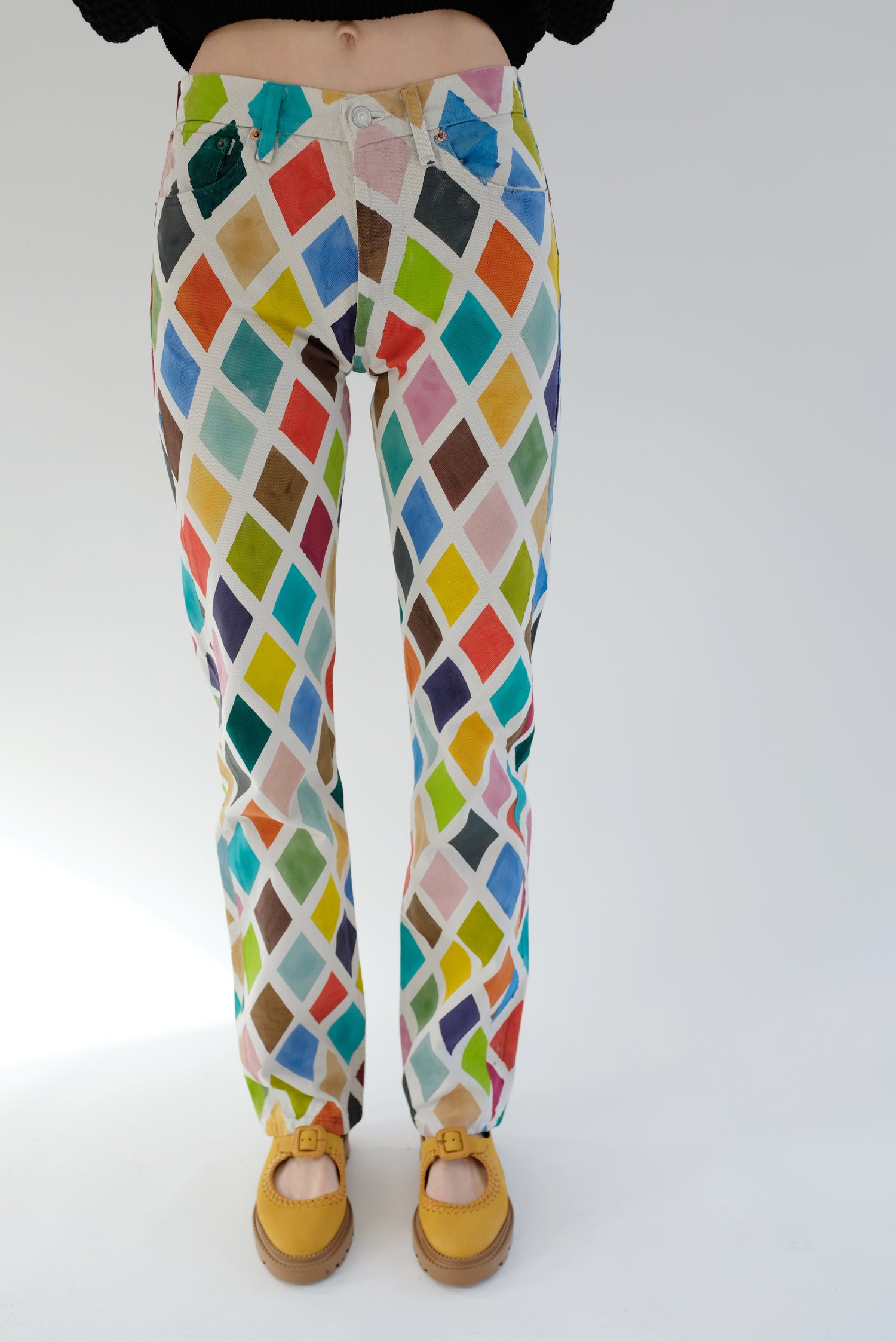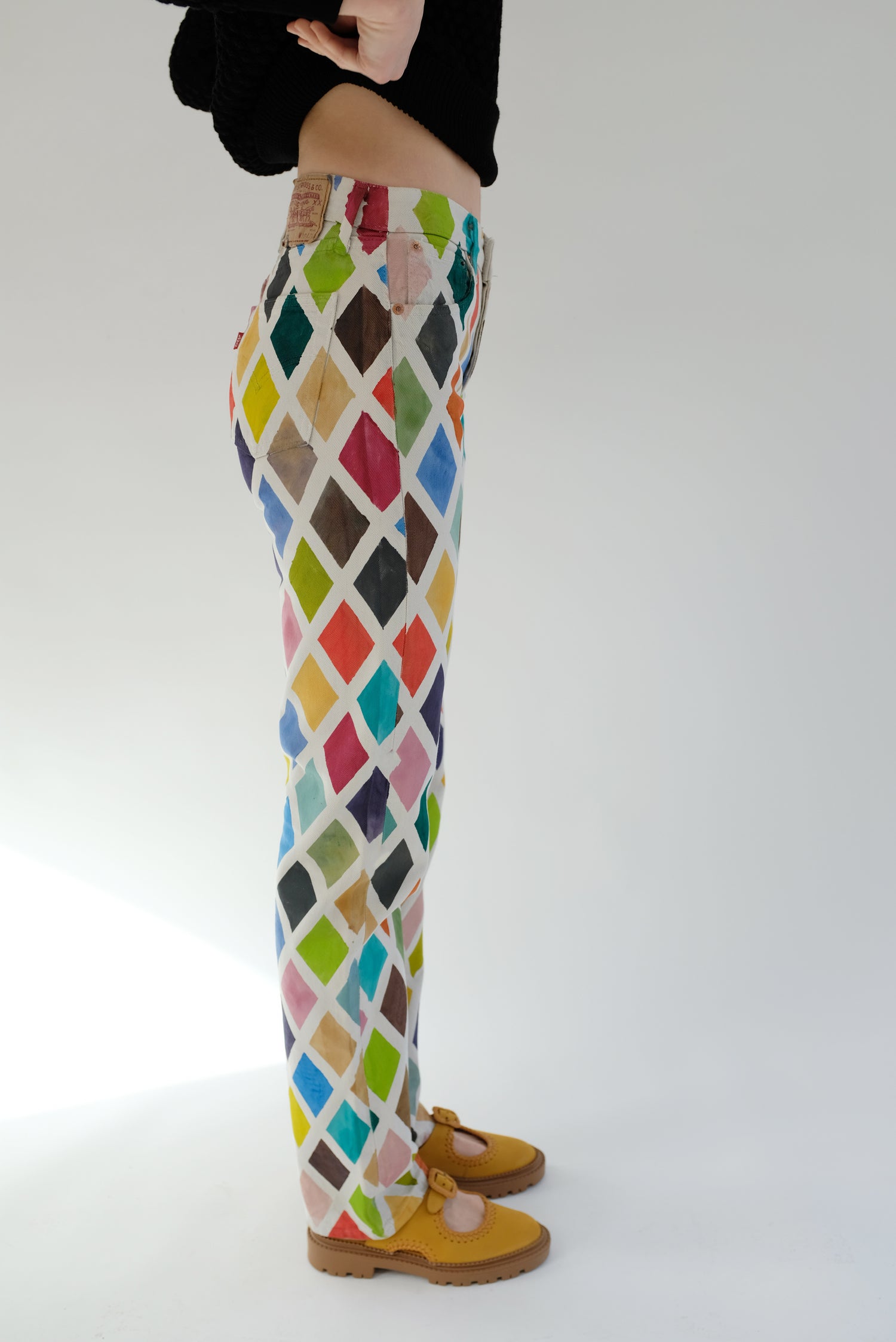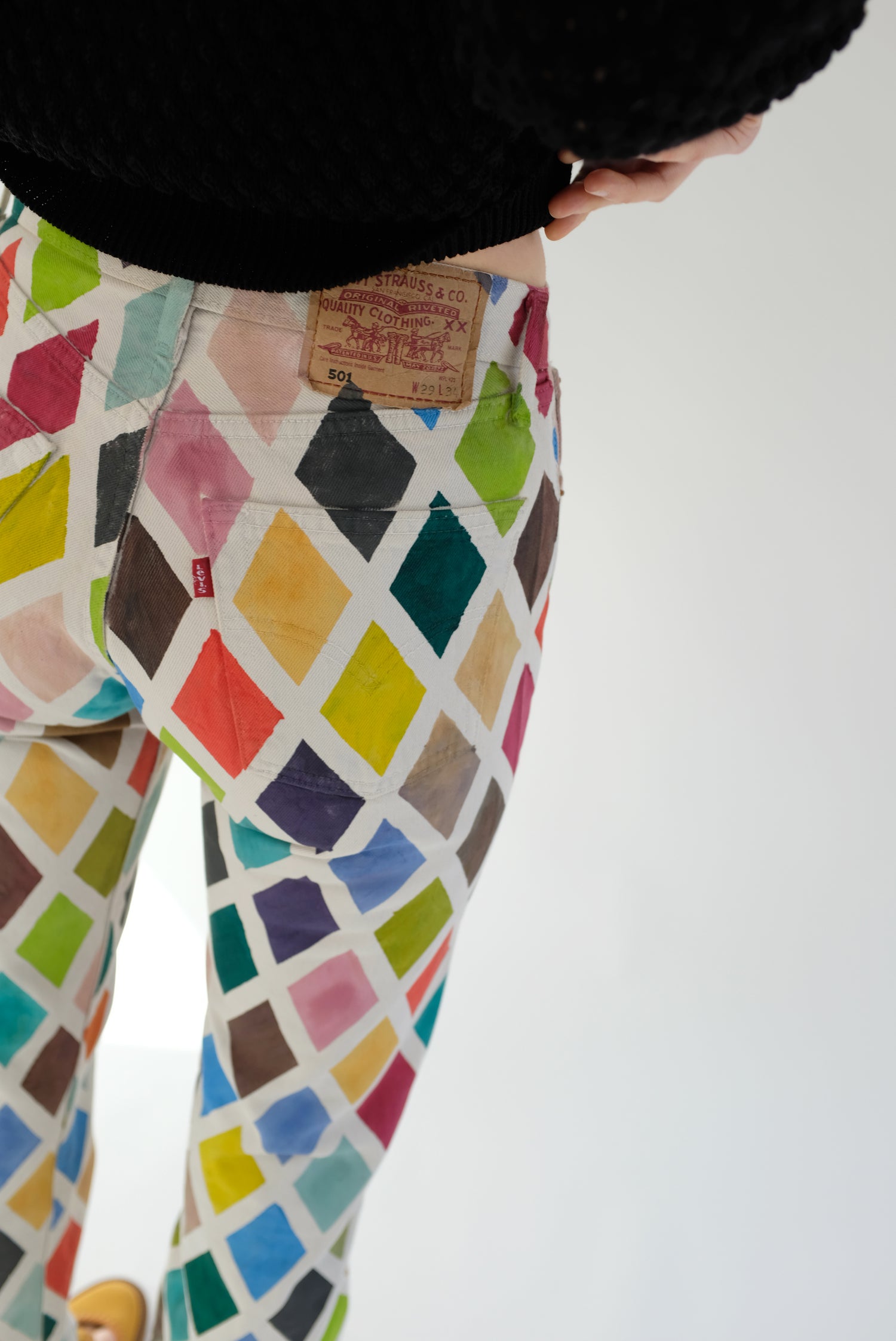 Vintage 501 Levi's, hand painted diamond pattern in Rome, Italy. Denim, button fly, 5-pocket styling, signature straight fit. 100% Cotton.