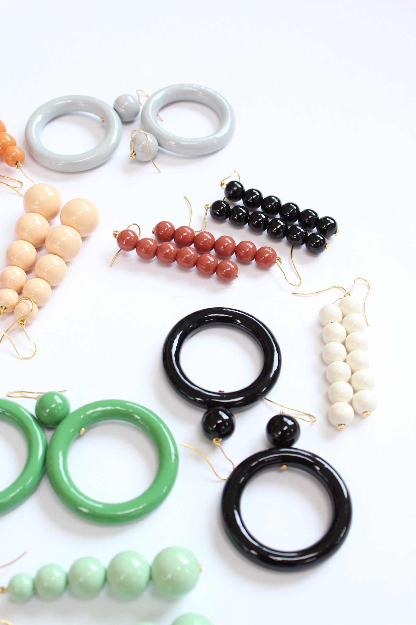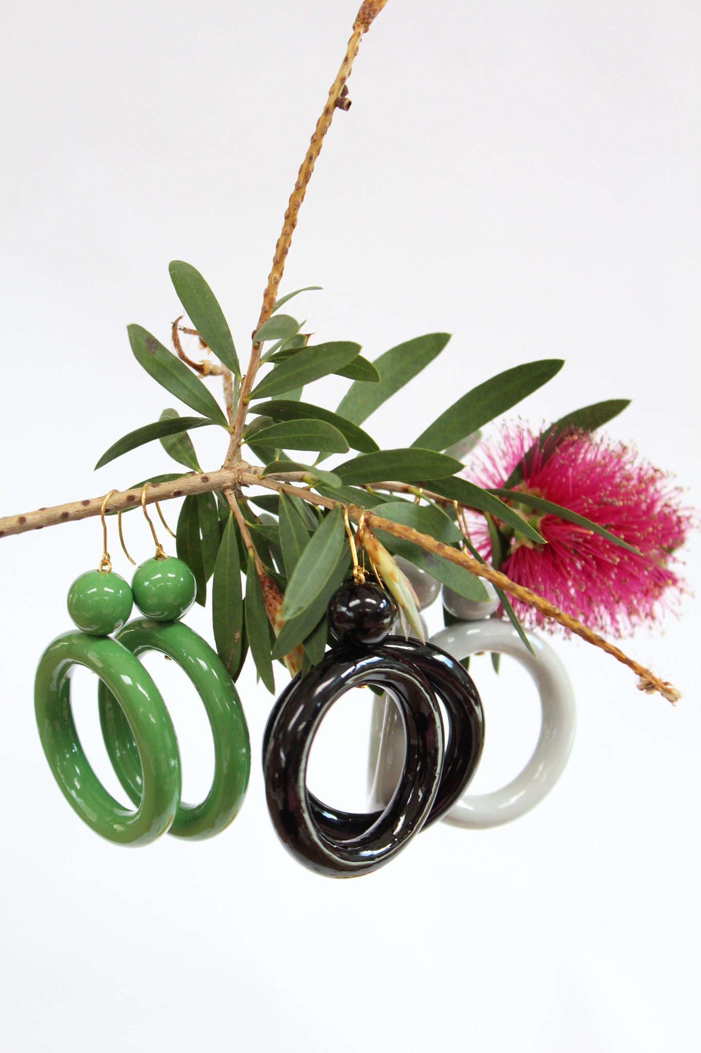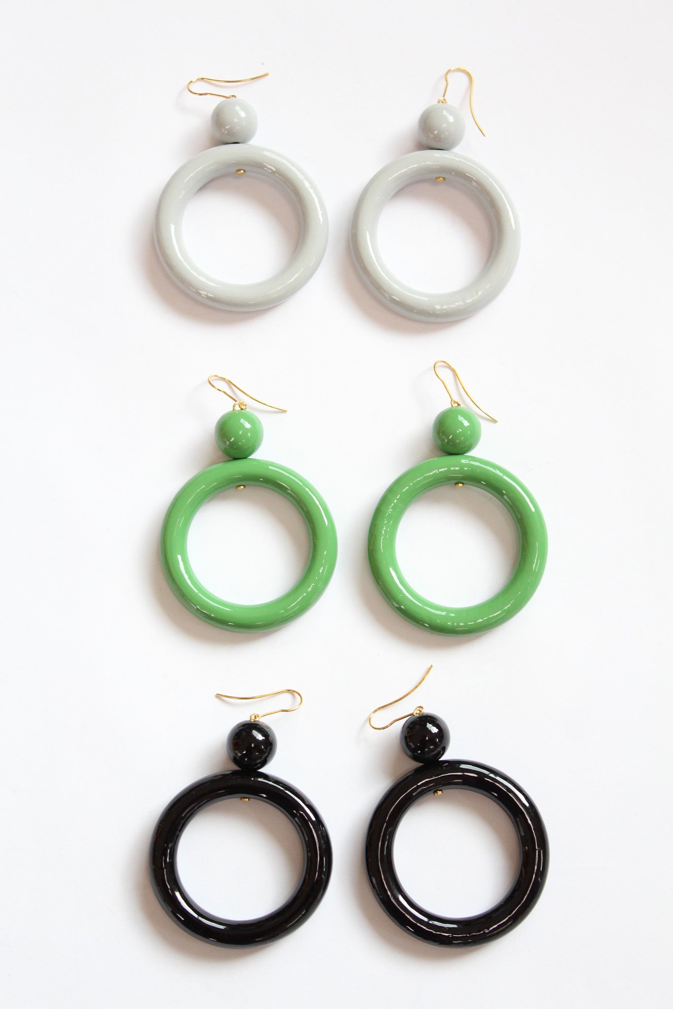 Light as air, hand lacquered in Spain, wooden hoops, inspired by the typical flamenco earring of south Spain. Golden brass hook, nickel free. Aprox 2” x 2”