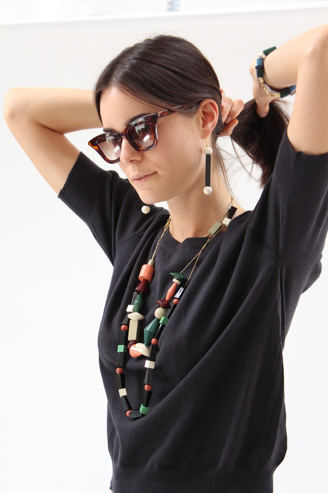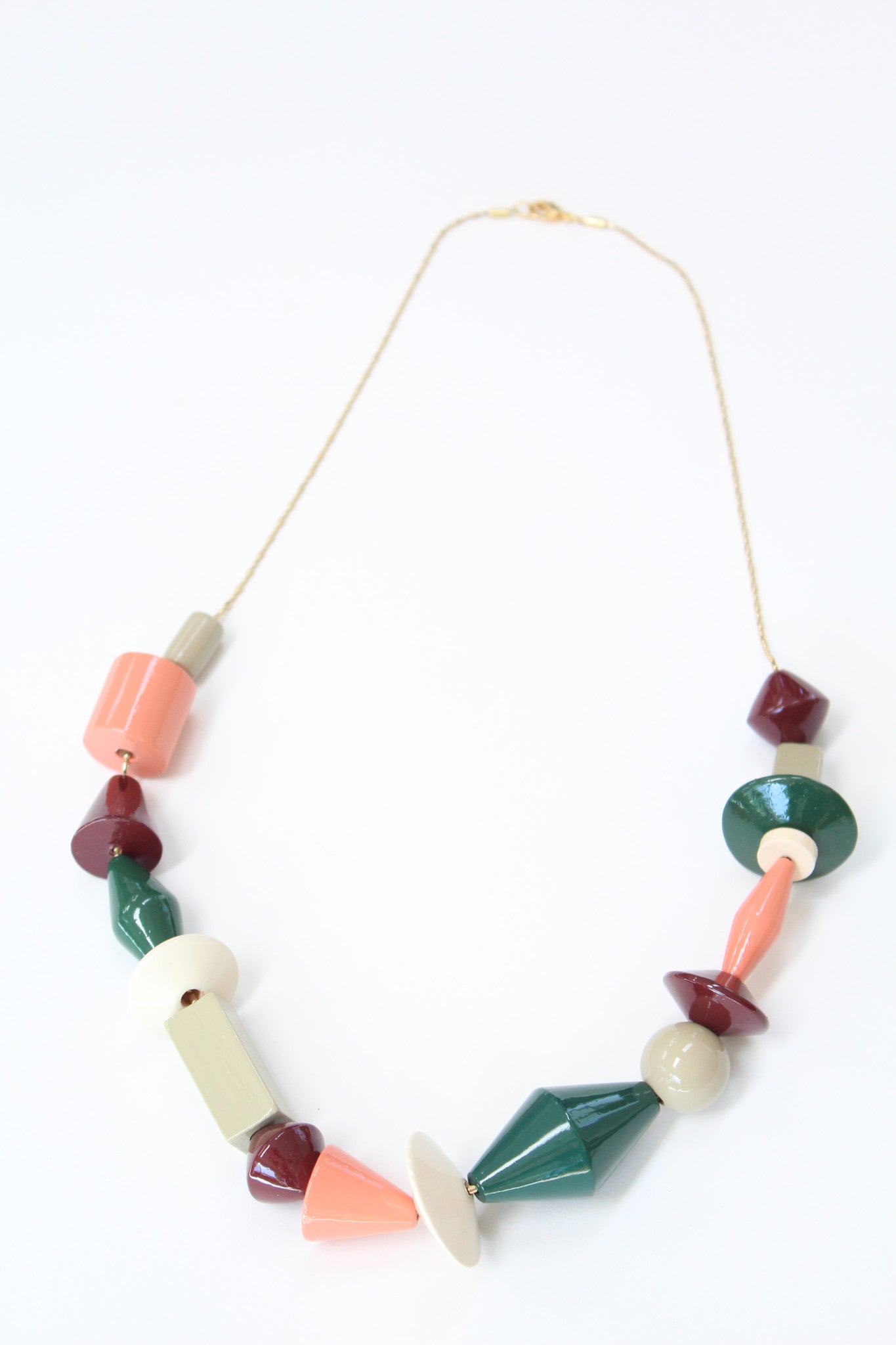 Statement necklace, geometric wooden beads, lacquered by hand in Barcelona, Spain. Strung on gold brass chain. Light and fun to wear. 26"