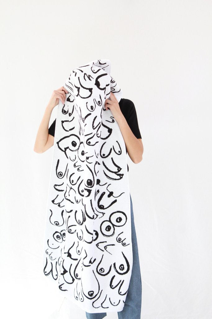 We've been printing the "Boobs" since 2012 when Cassie Mcgettigan, inspired by all the mermaids around her, designed it for Gravel & Gold. At that time the most obvious place to print the "Boobs" seemed to be a sheer, oversized shirt that is was possible to breastfeed in. From there we came to put them on other thoughtful items like pillowcases (for sweet dreams) and big tote bags for hauling. As time went on, the requests came in for other items to be adorned by boobs. A fluffy towel seemed like a natural item to add to the assortment. Dry off your boobs with boobs! You've got nothing to hide!