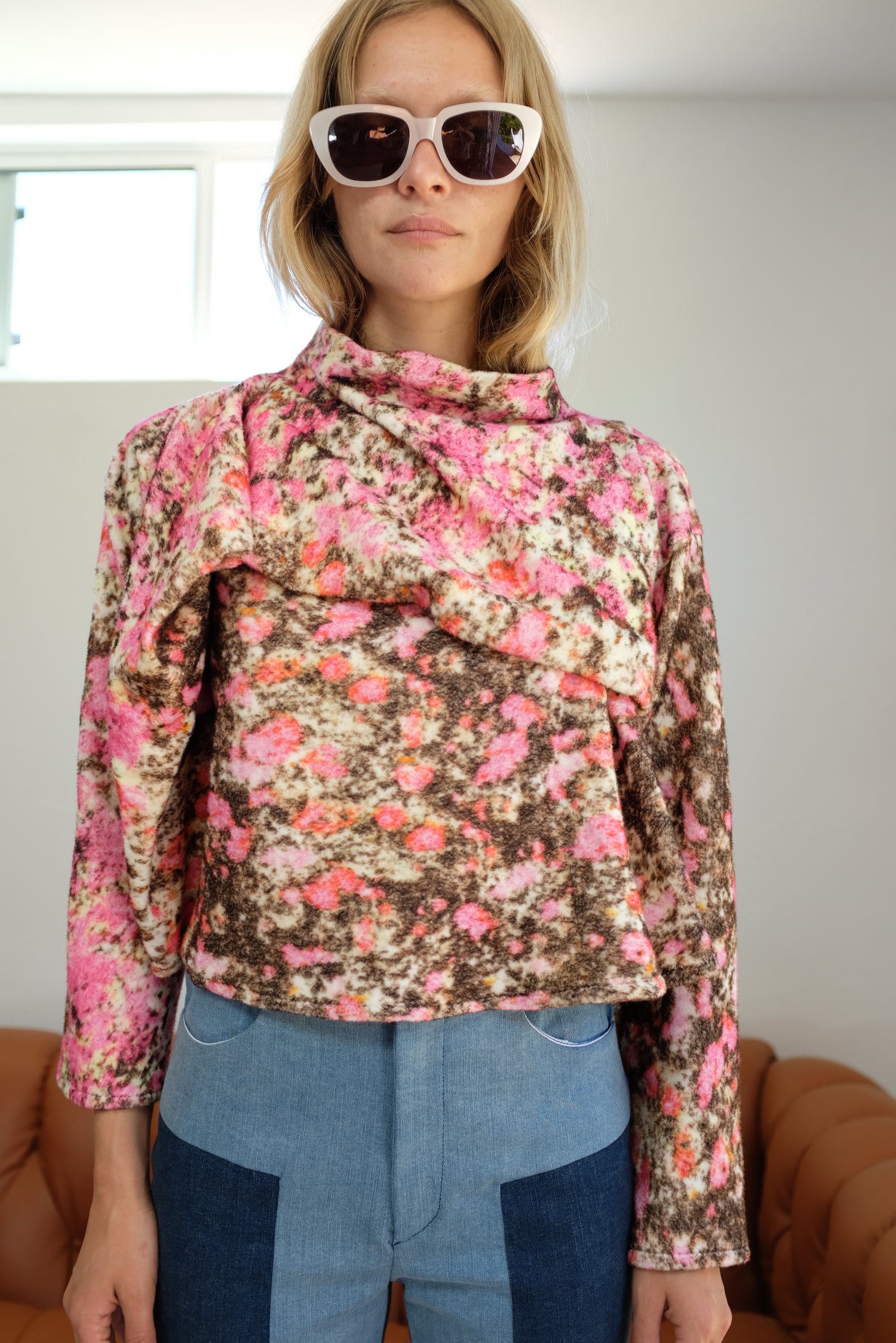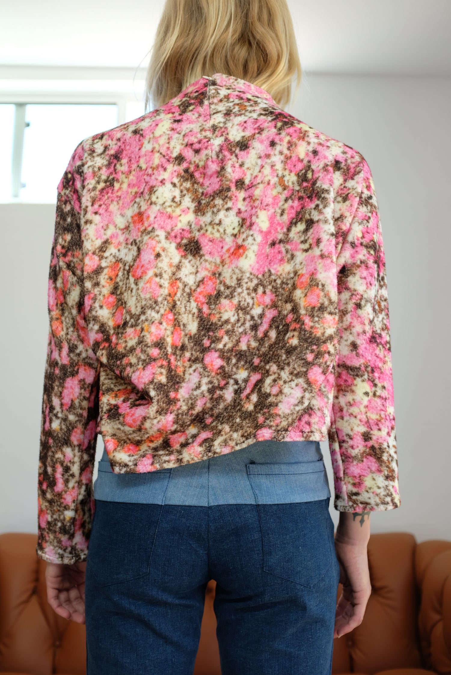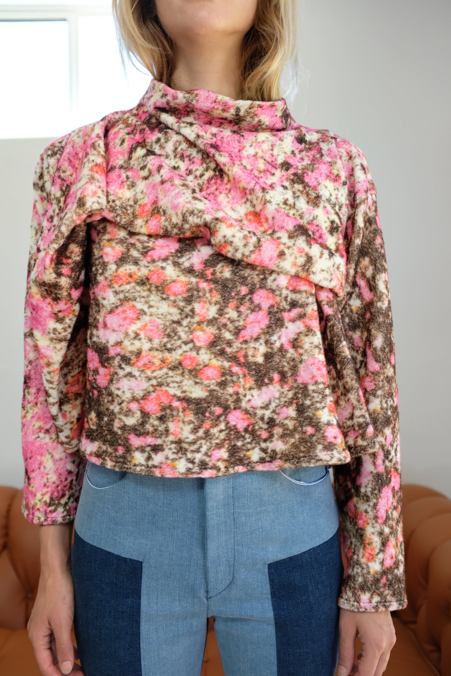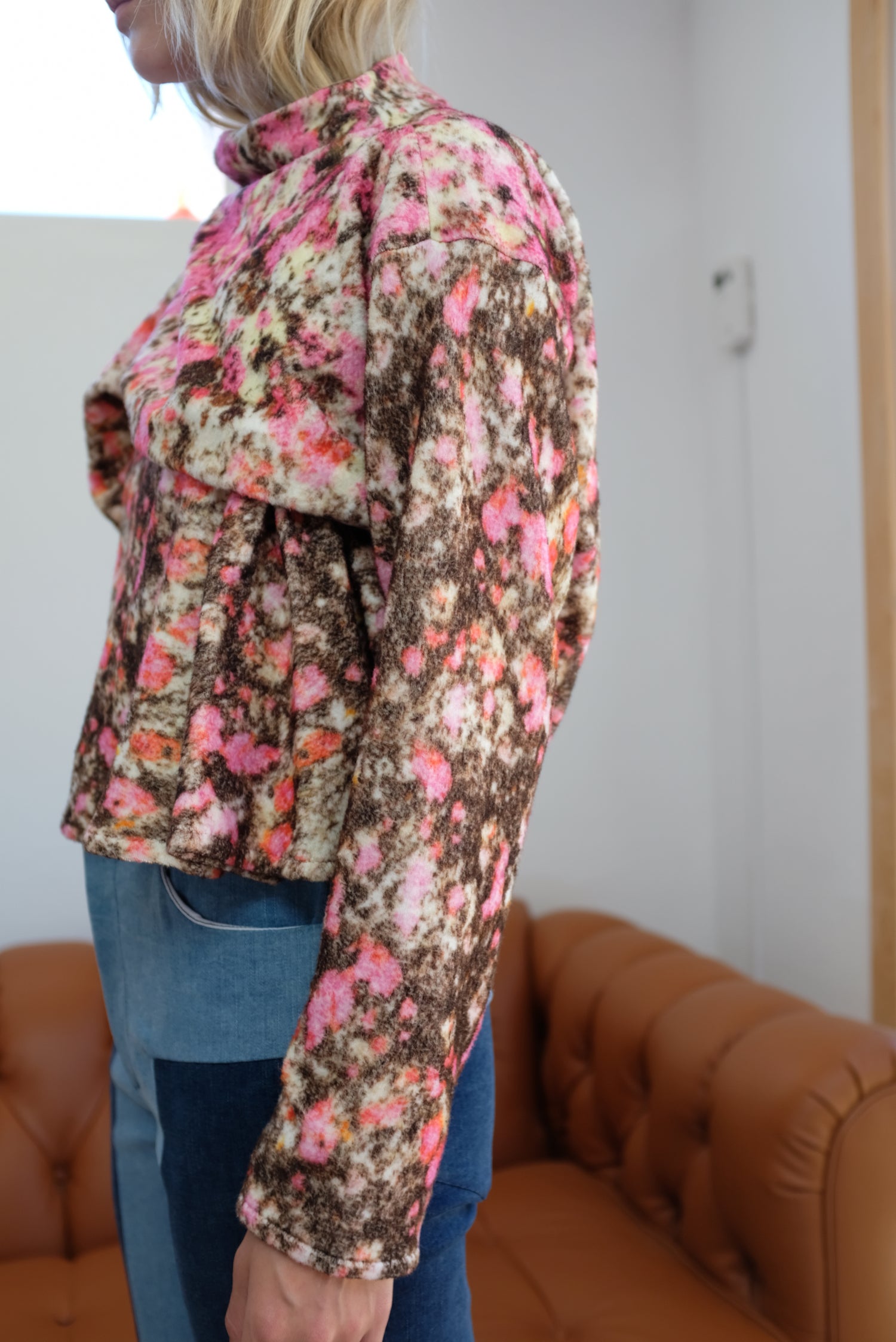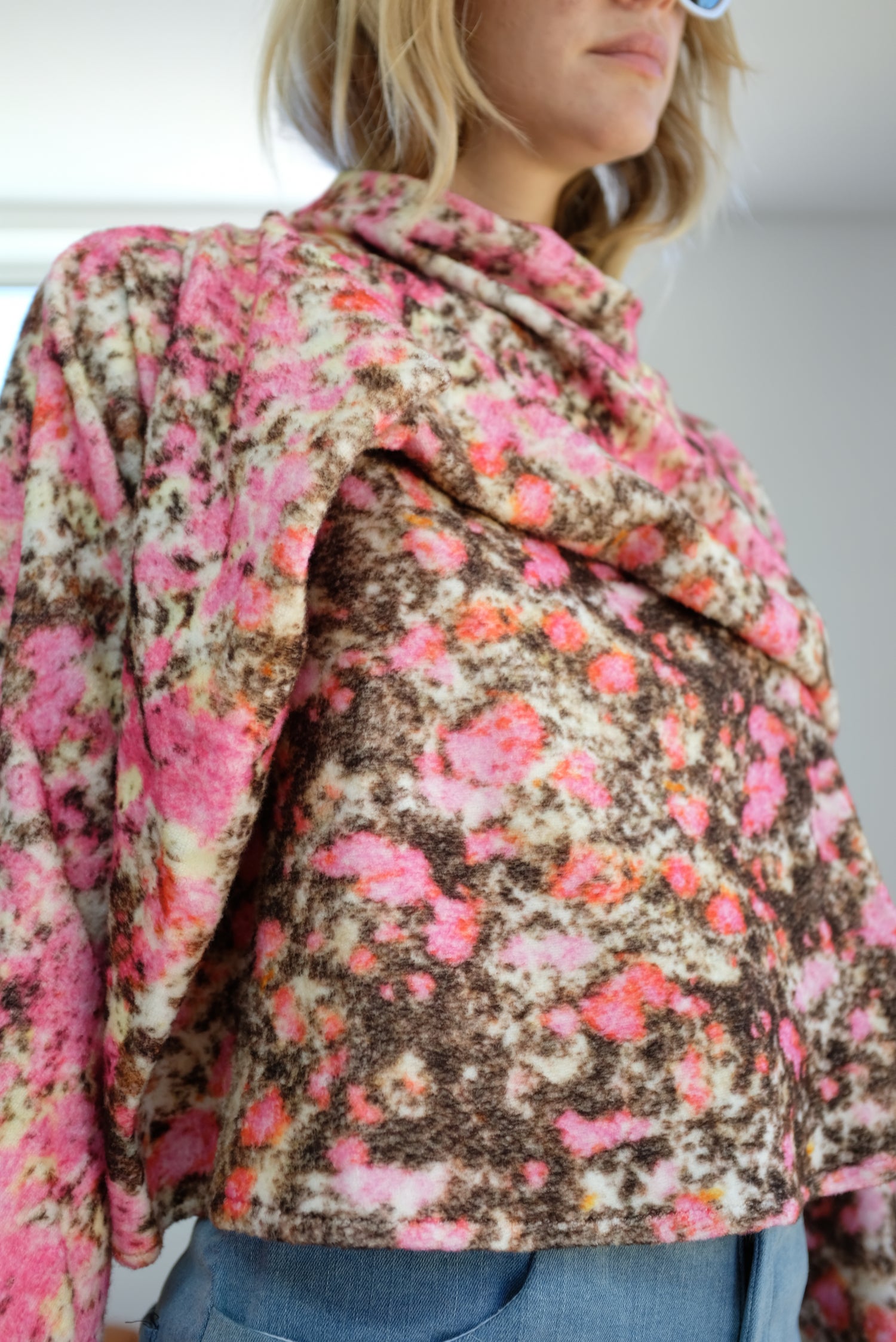Luxuriously soft and warm cotton shirt, gorgeous pink print, one size fits most. Gathered neck line, long sleeve, loose fitting, enclosed seams, hidden back zipper. 100% Organic cotton.