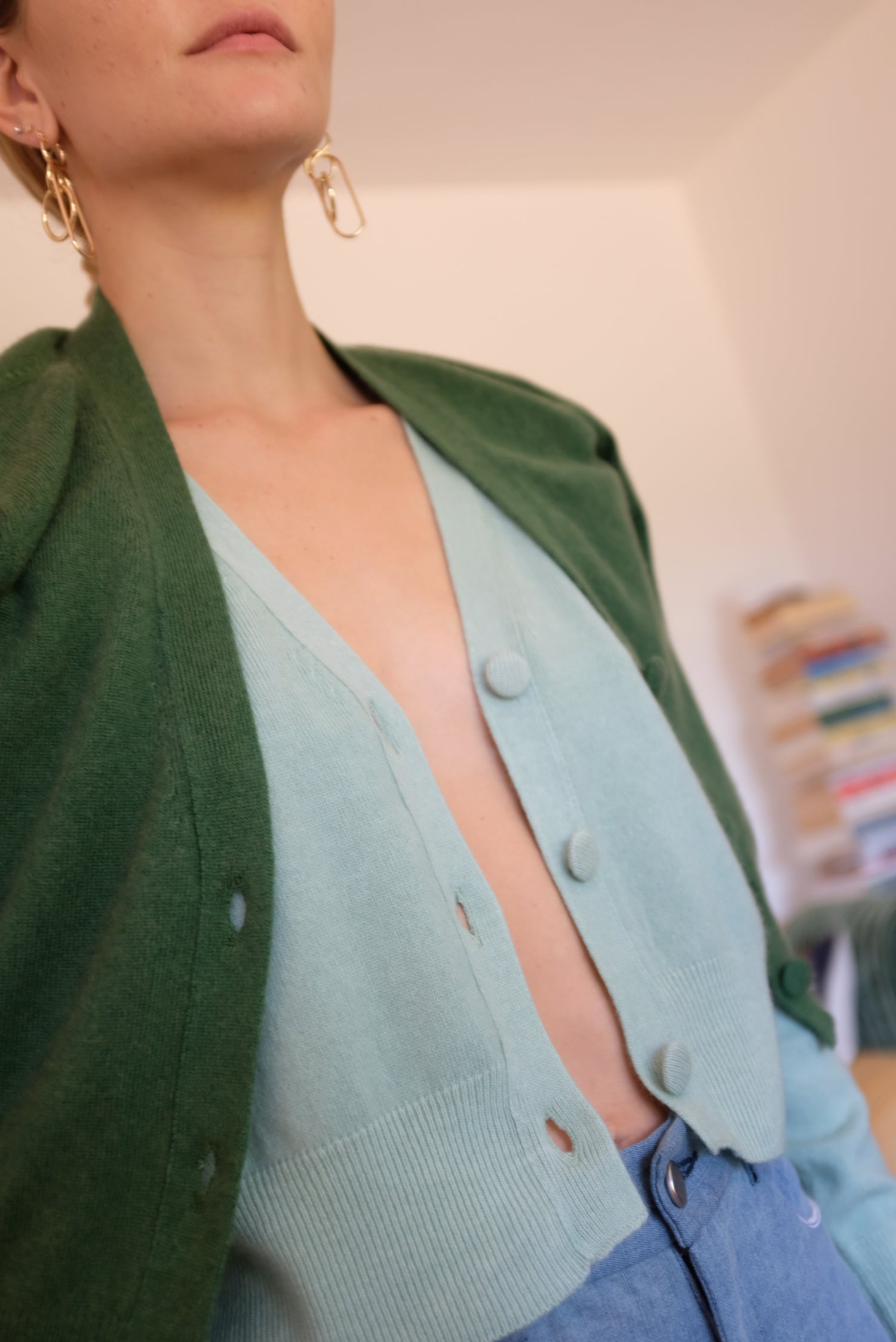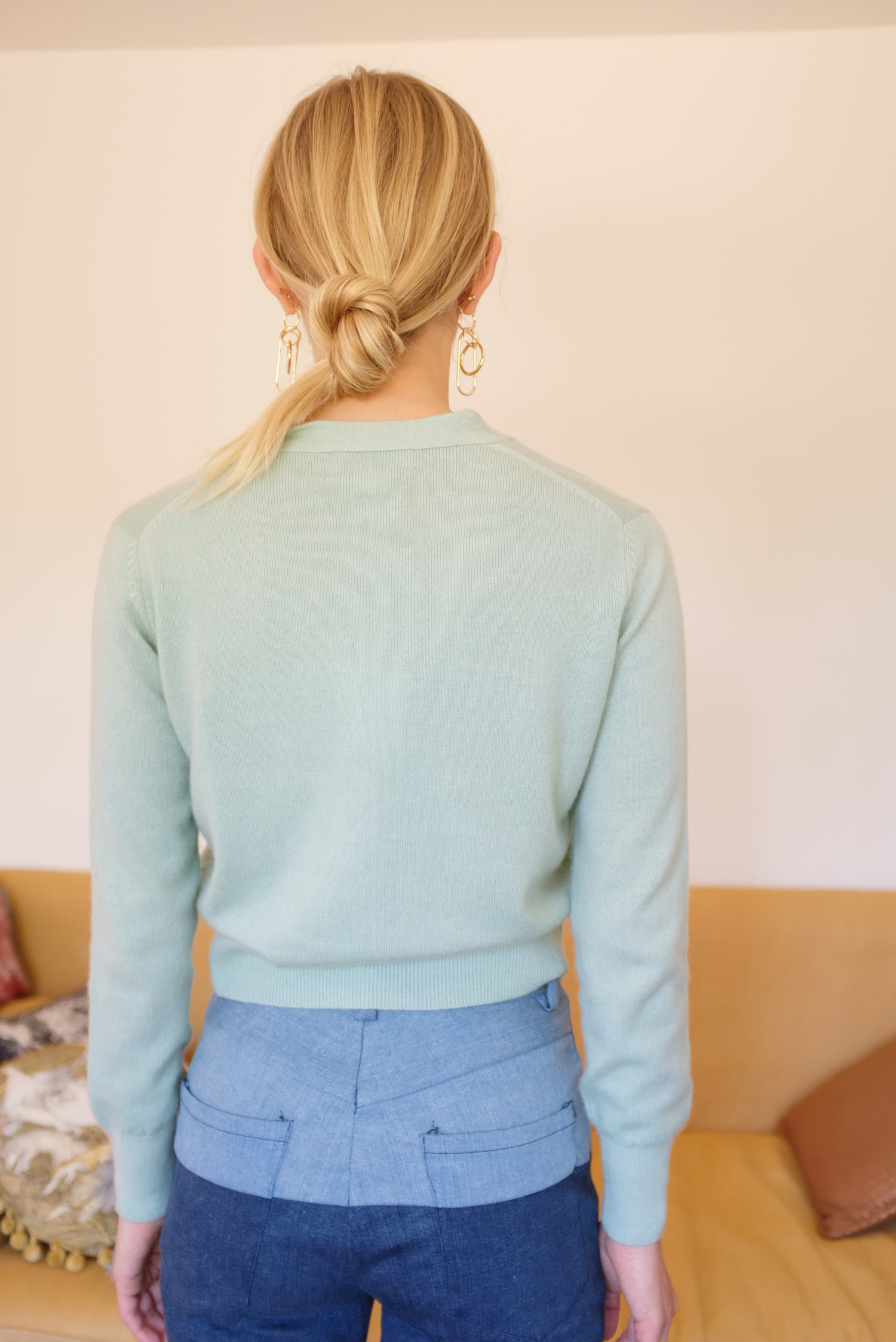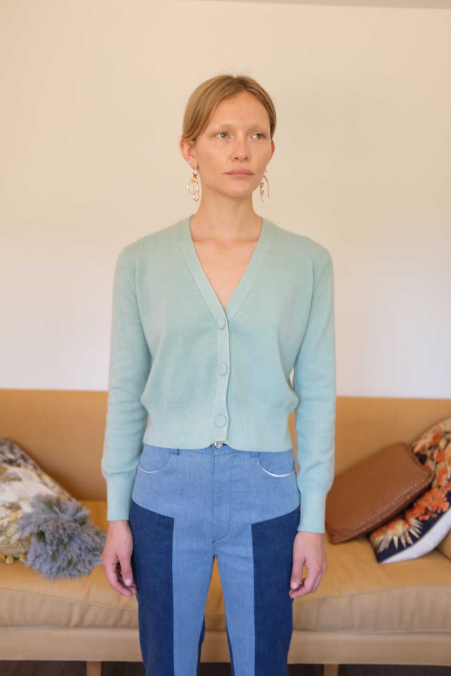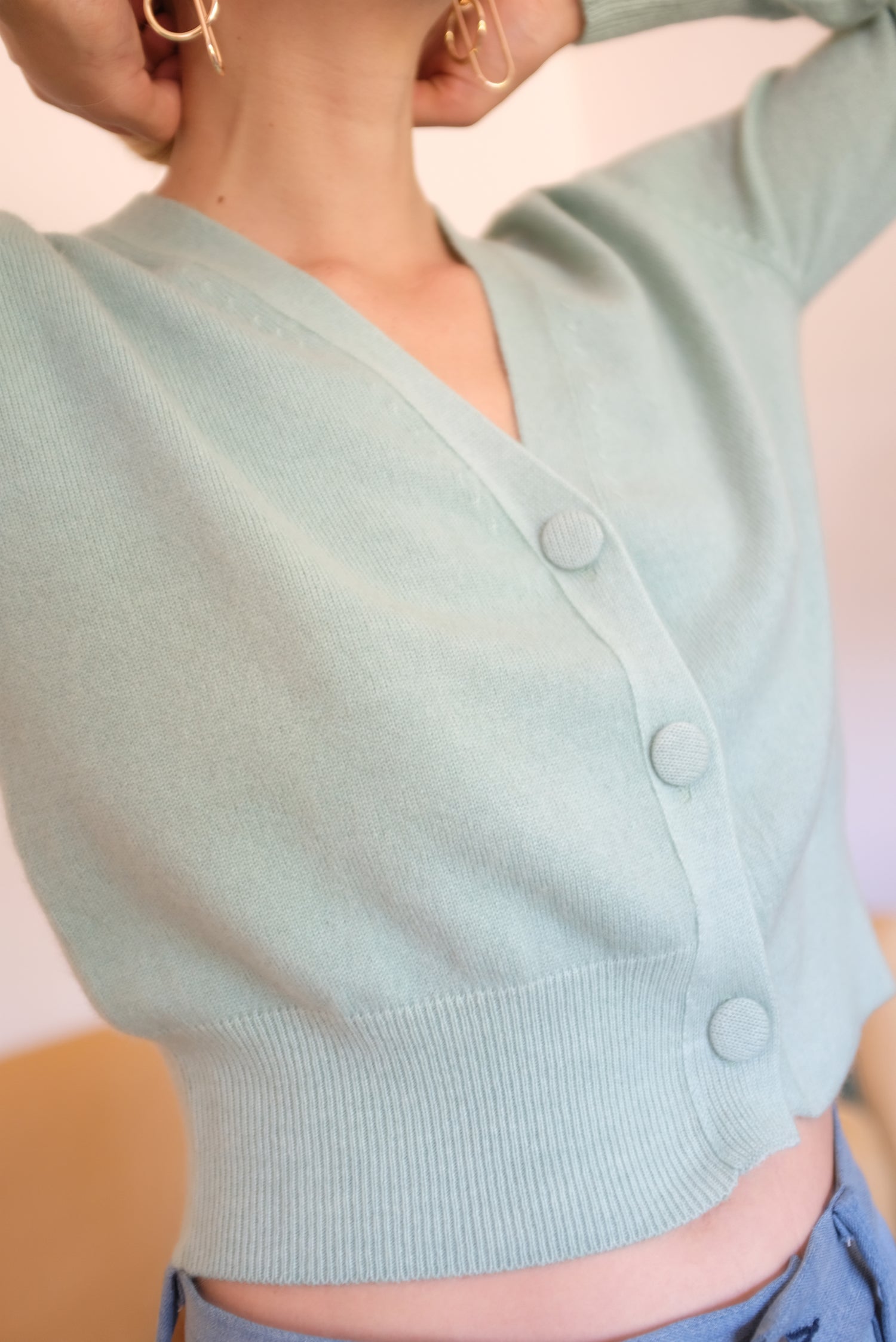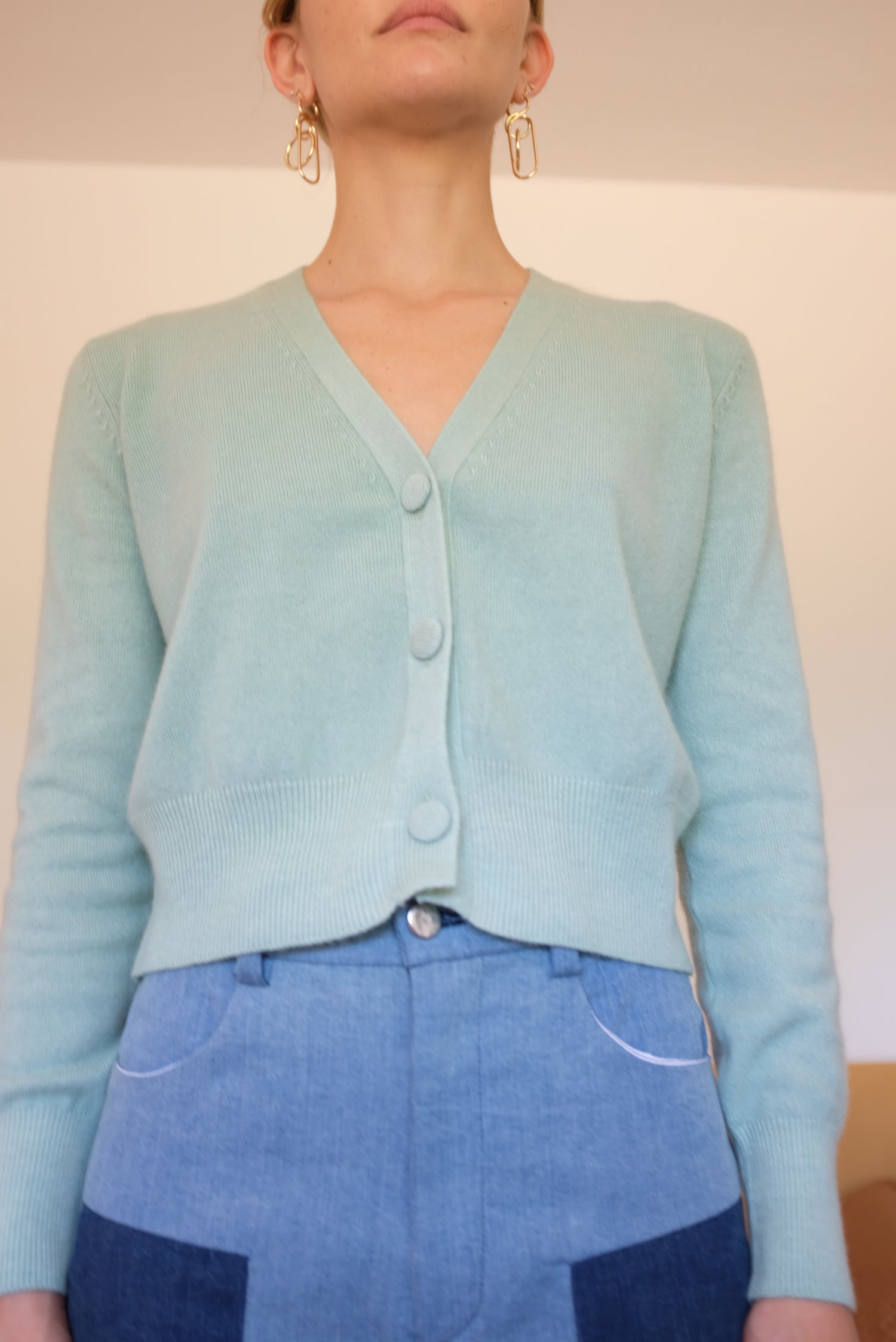 Best selling cardigan. 100% cashmere. Classic v-neck cardigan, slightly cropped, cashmere covered buttons down front. Medium weight, not sheer, wear as a laying piece or on it's own, solo. Size up for a less cropped look, and down for a more cropped look. Exclusive to Beklina.