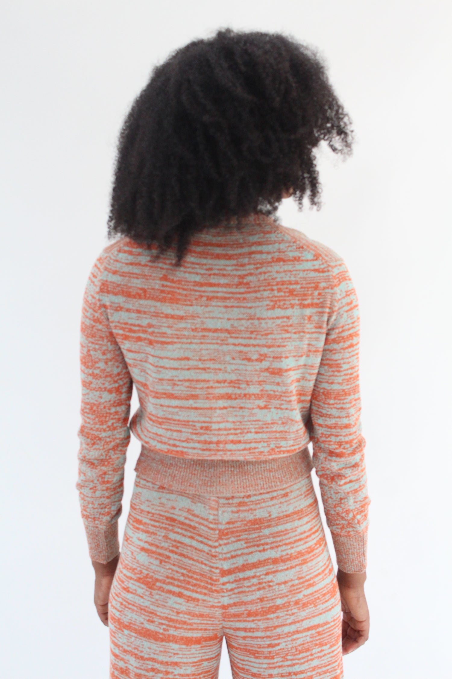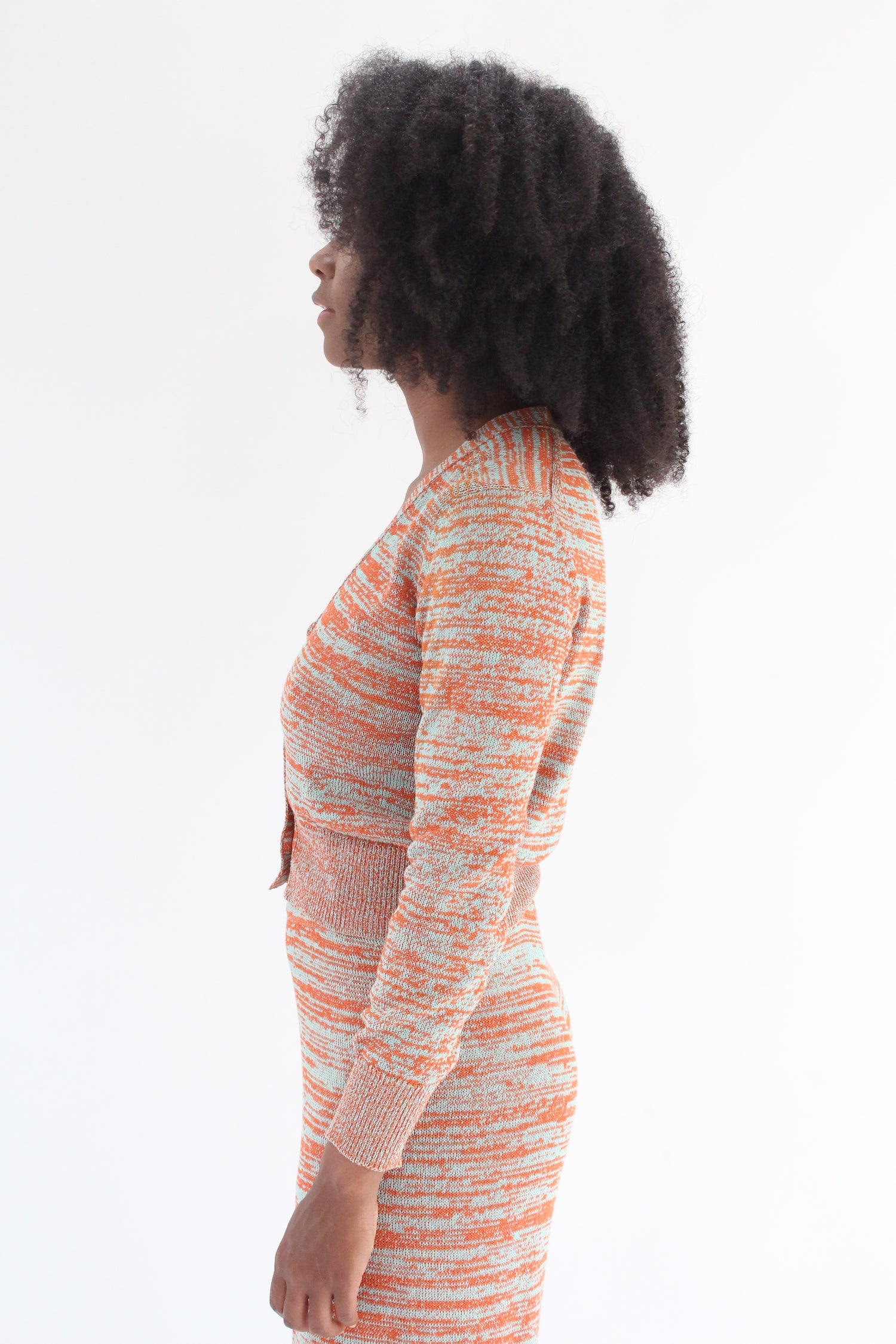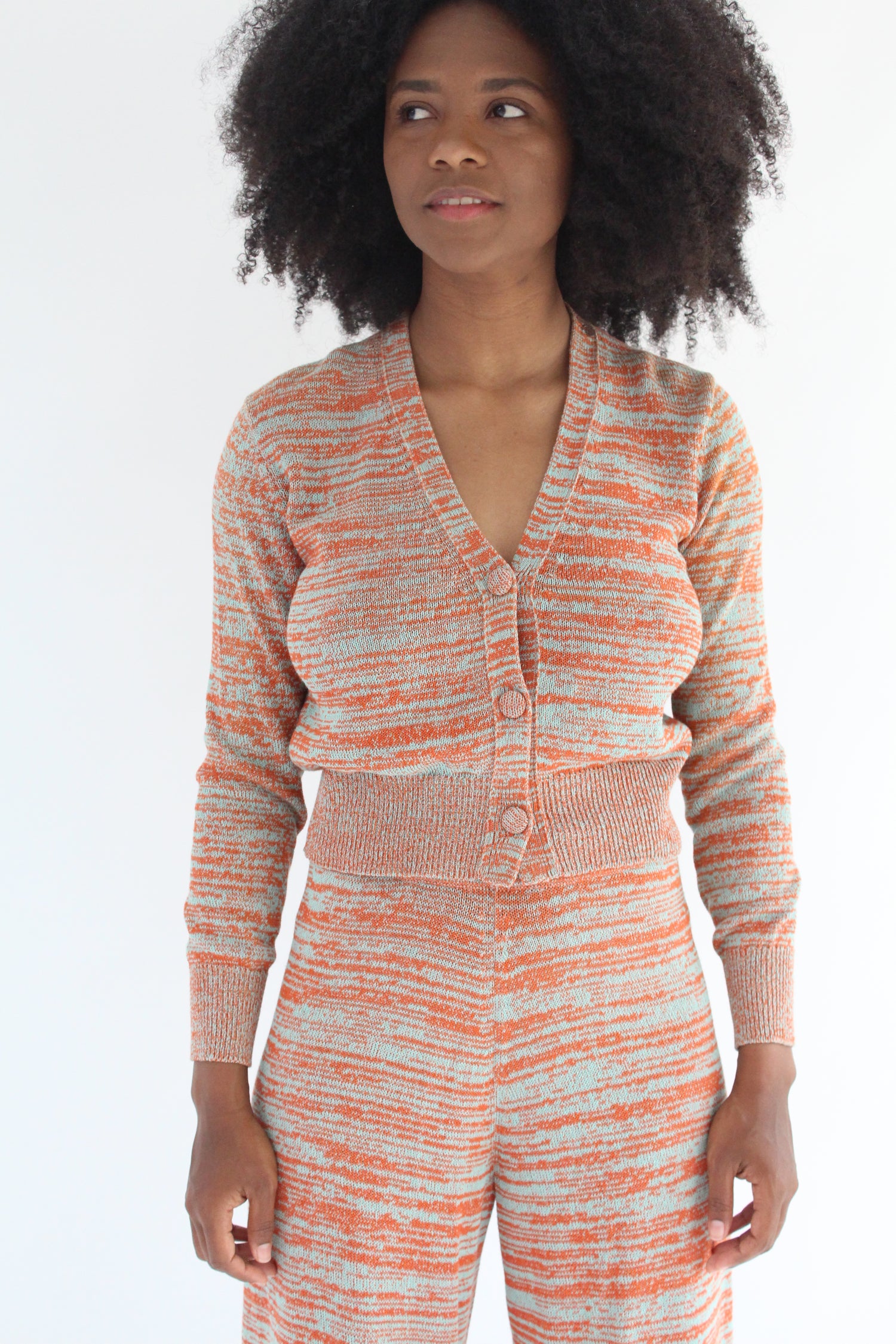 Space dye knit, long sleeved, classic v-neck cardigan, fabric covered buttons down front. Medium weight, not sheer, soft cotton, wear as a layering piece or on it's own, solo. 100% Cotton.