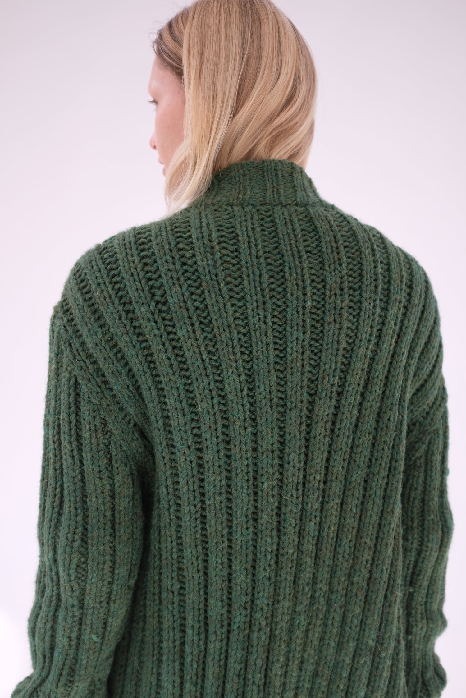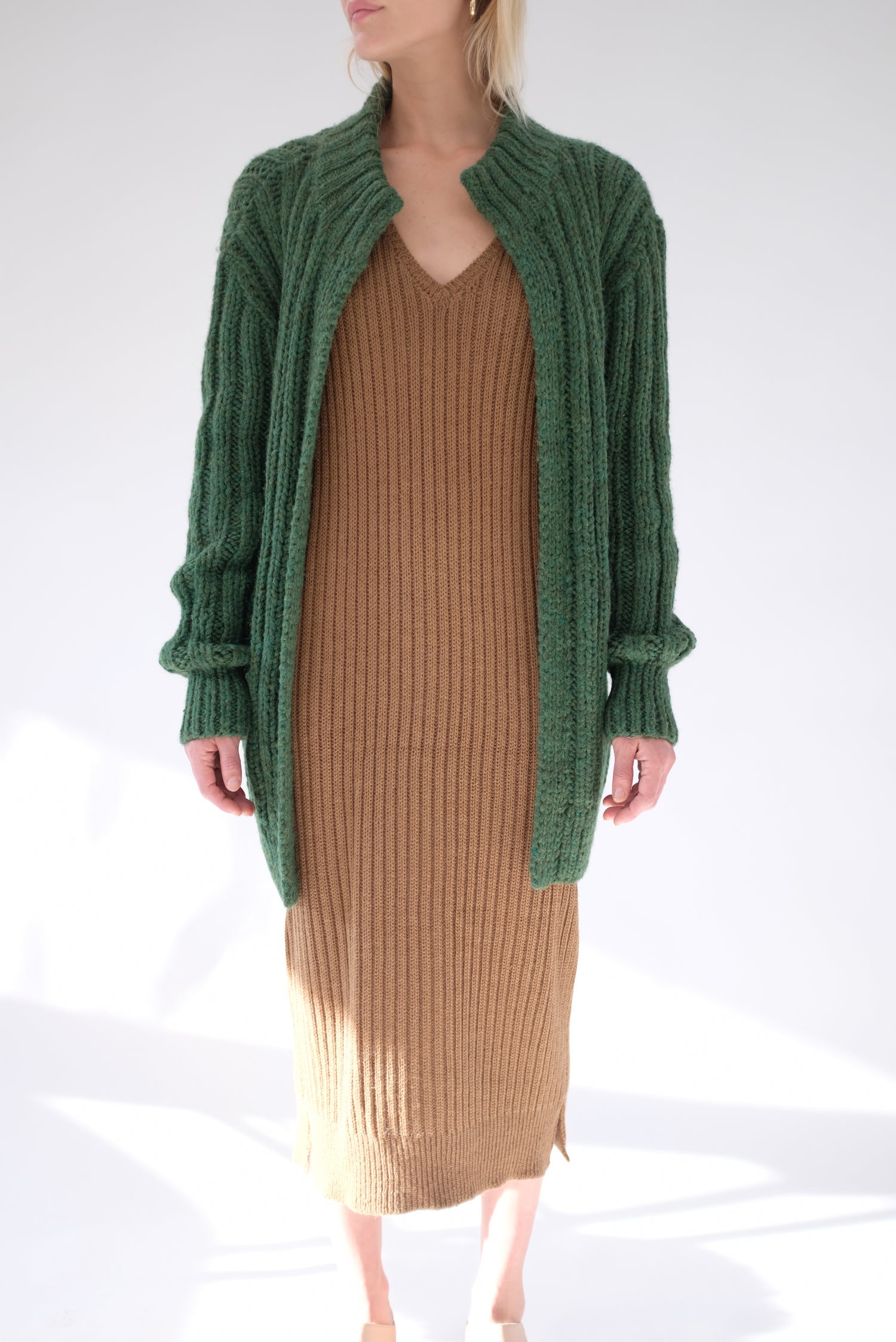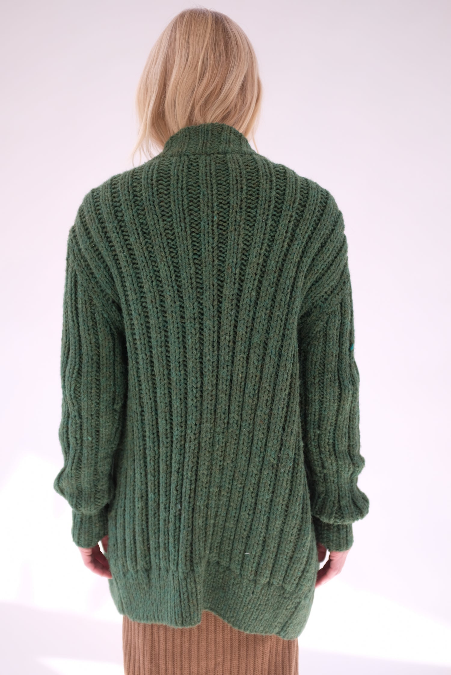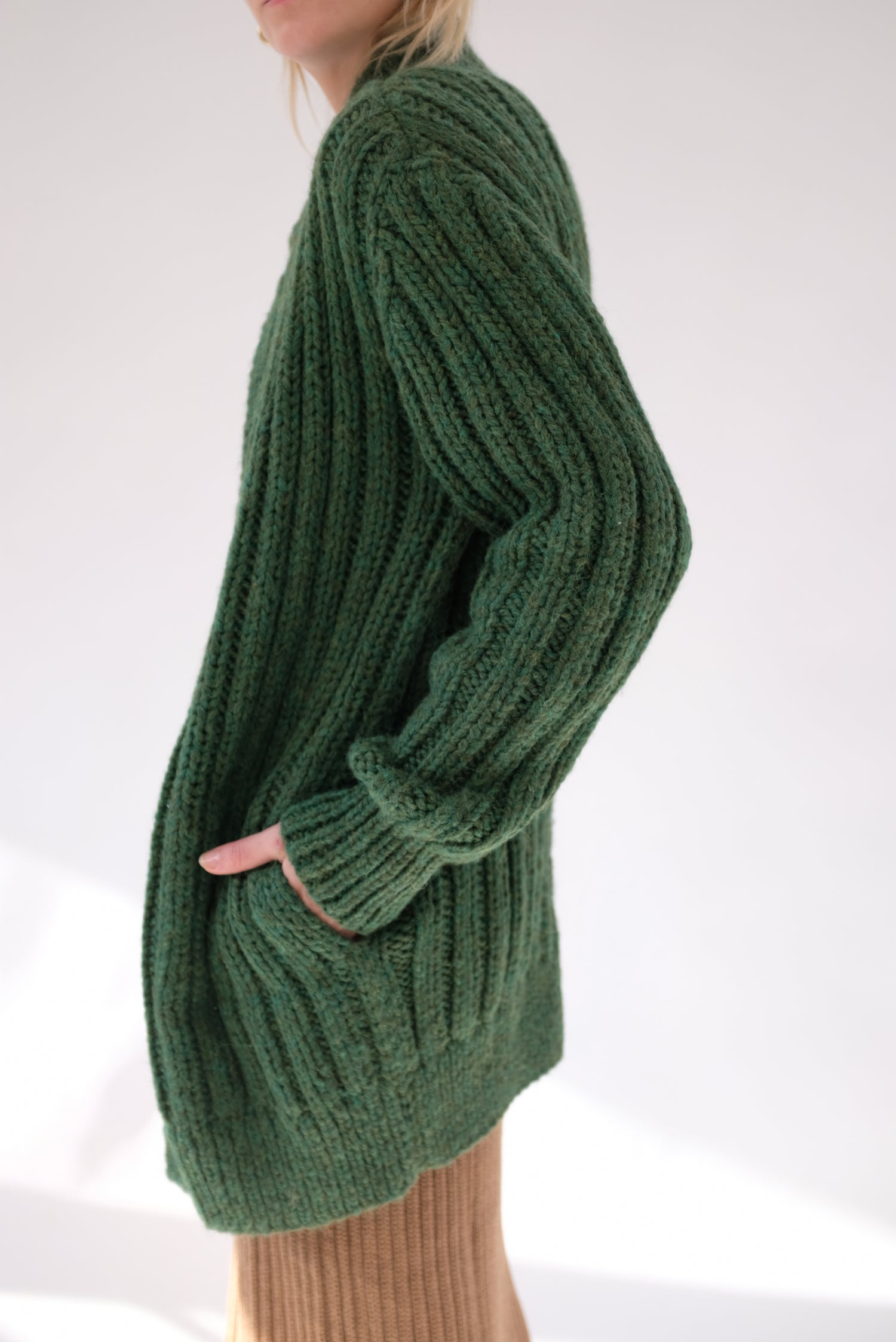 100% Baby alpaca ribbed cardigan sweater. Stand collar with hidden side pockets. Ribbing at cuffs and hem. Relaxed, roomy fit. Oversized cut allows sweater to fit range of sizes. Very warm, and soft.