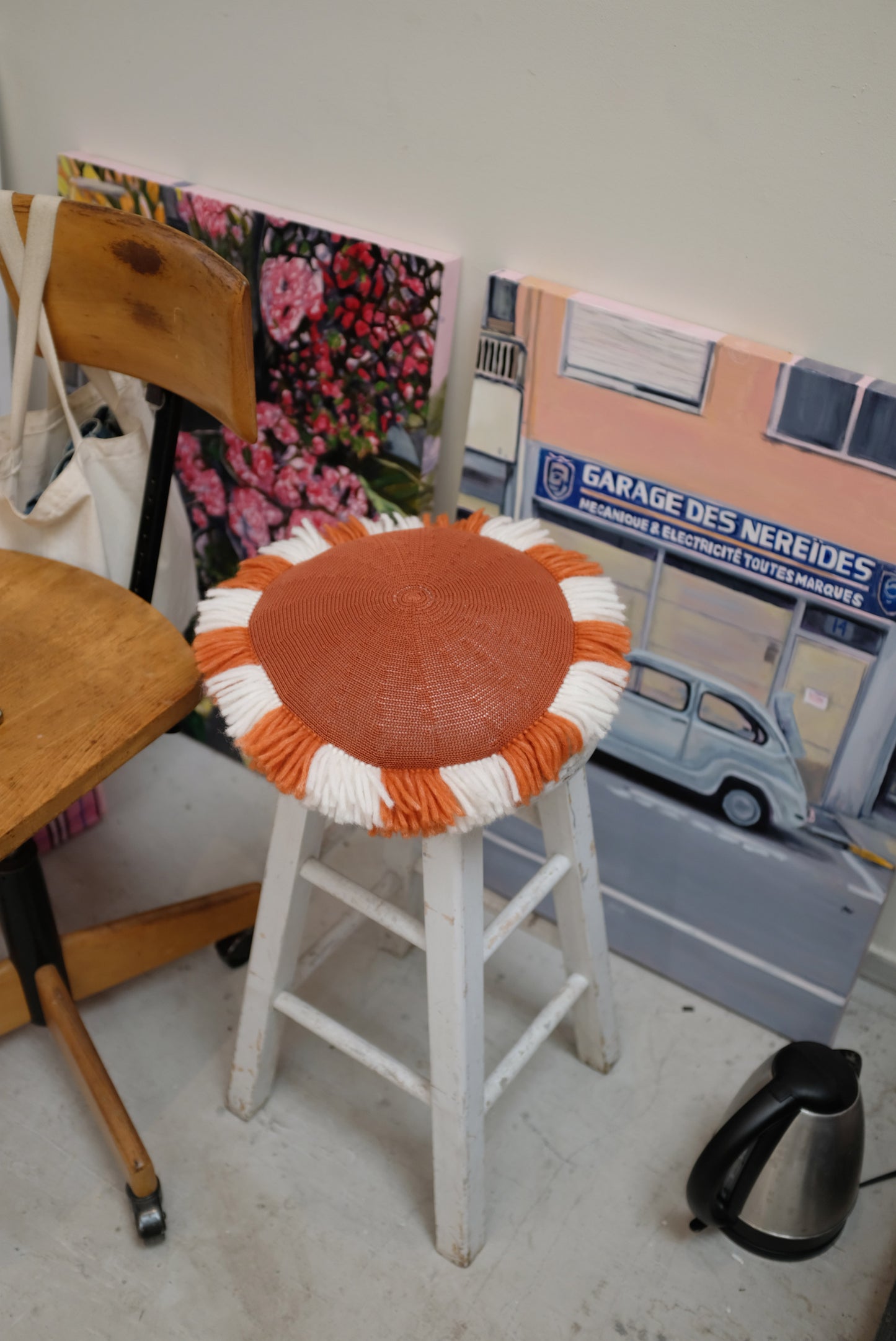 Hand crocheted pillow, circular body with checkered fringe, made from surplus pima cotton and alpaca yarns. Hidden snap closer on backside. Insert is included.