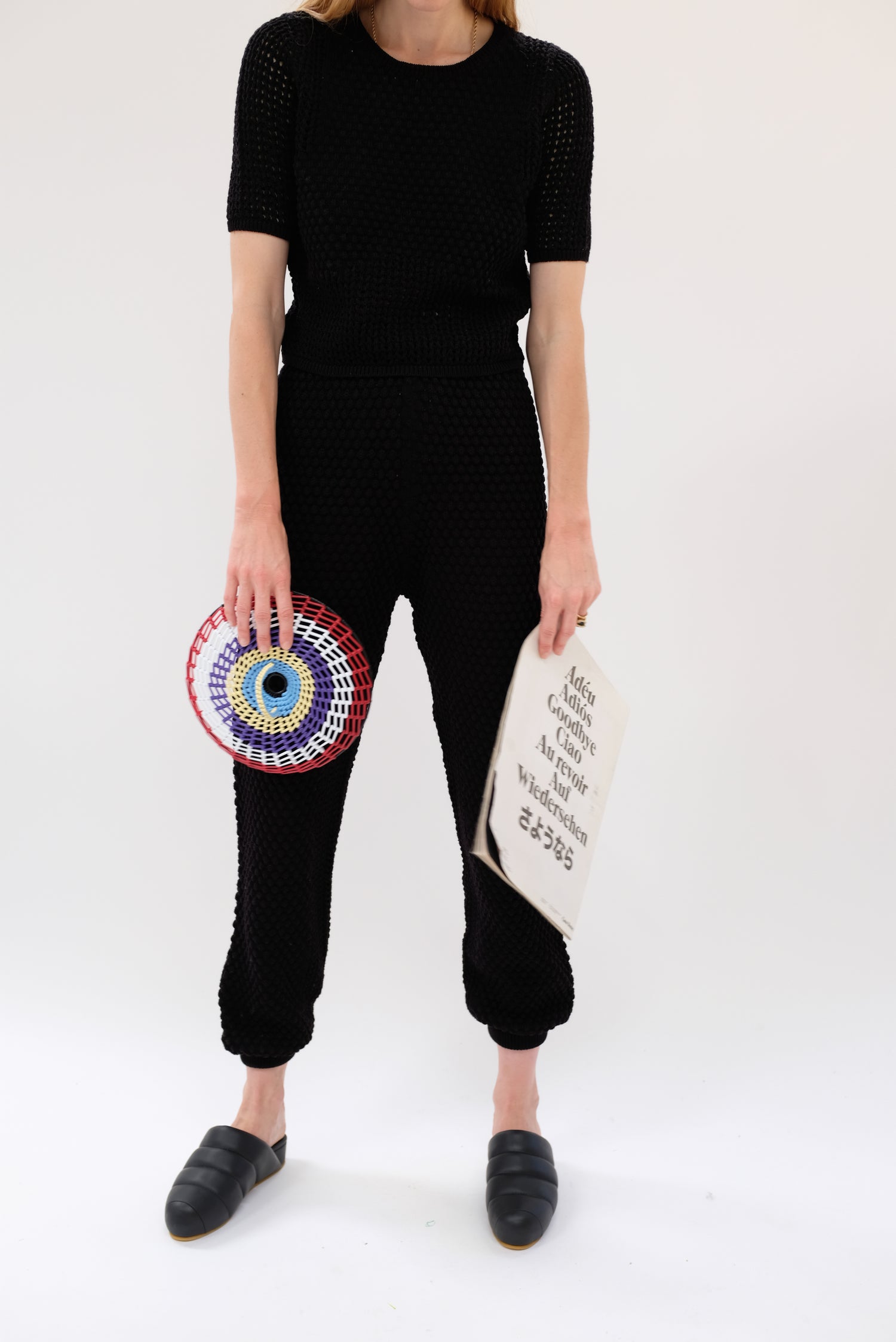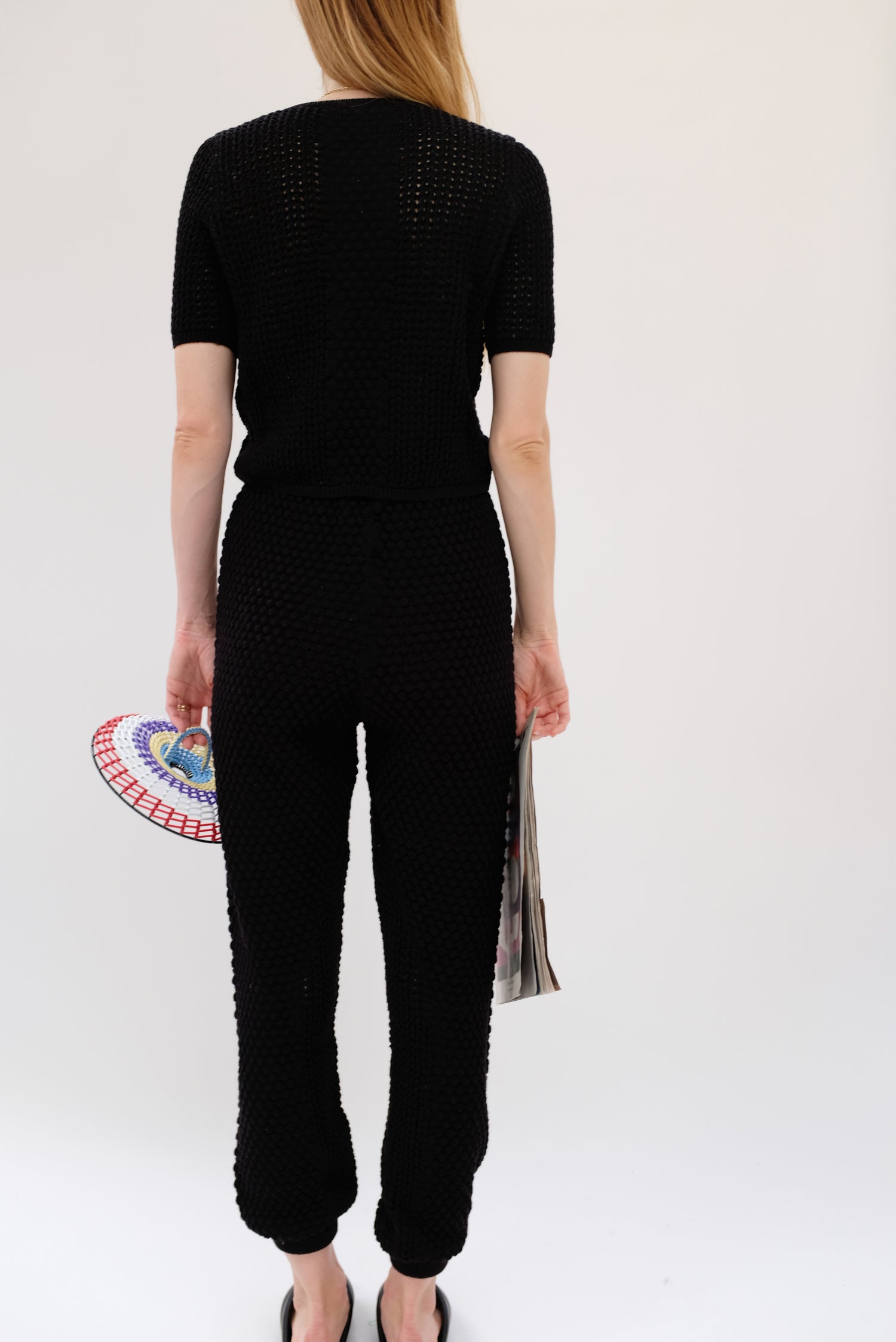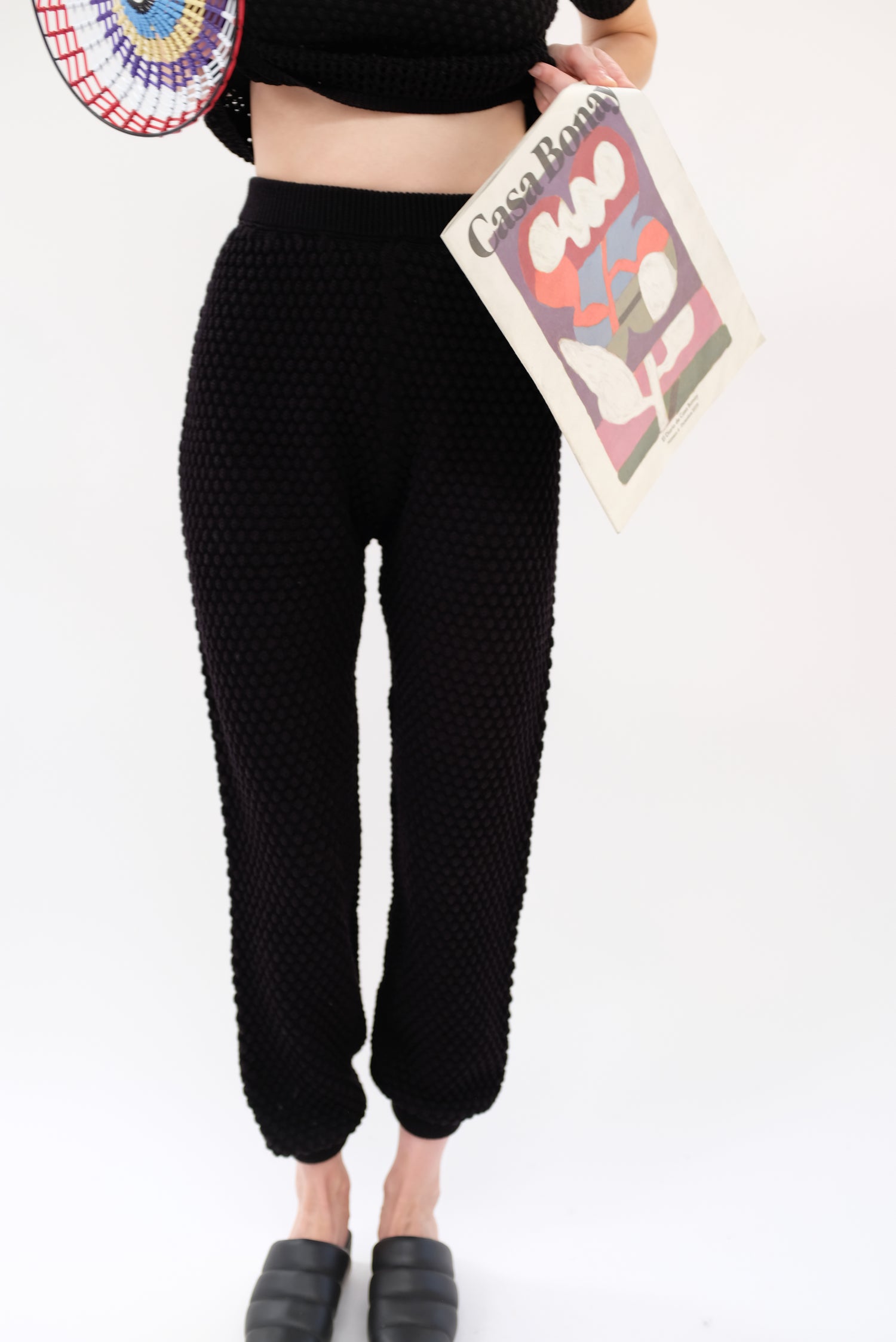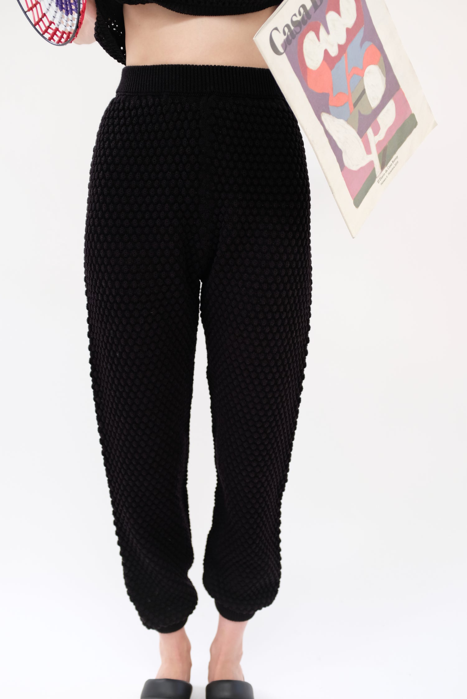 Gorgeous hand knit pant, with a unique pattern and texture, medium weight. Washable, soft luxurious cotton yarn. 100% Pima cotton. Gentle elastic at waist and ankle. Exclusive to Beklina. Runs true to size.