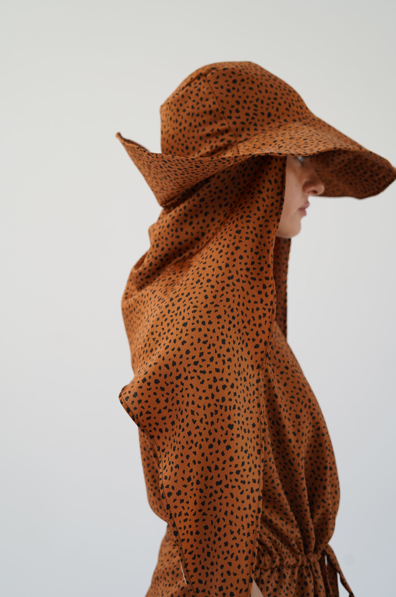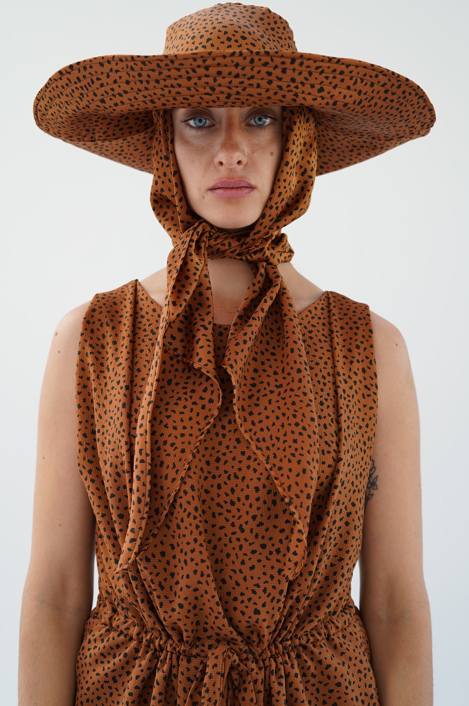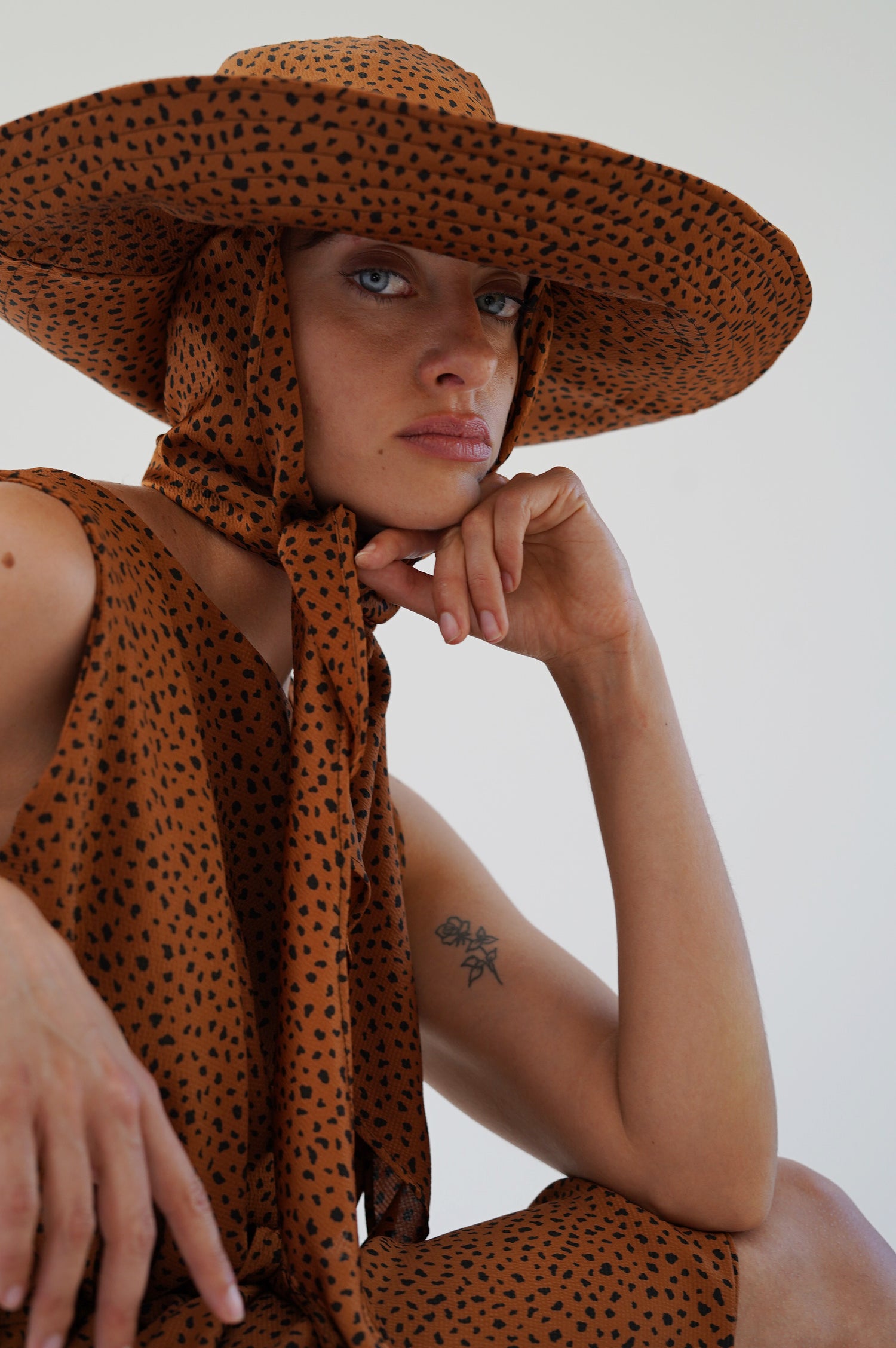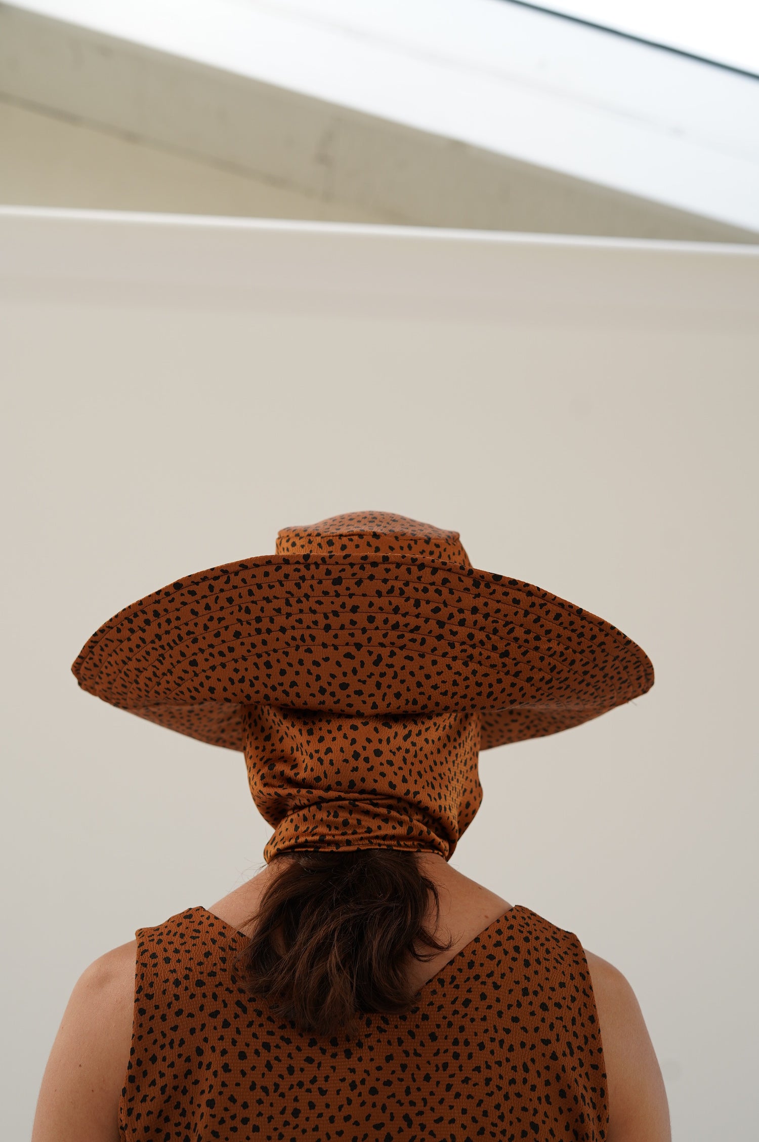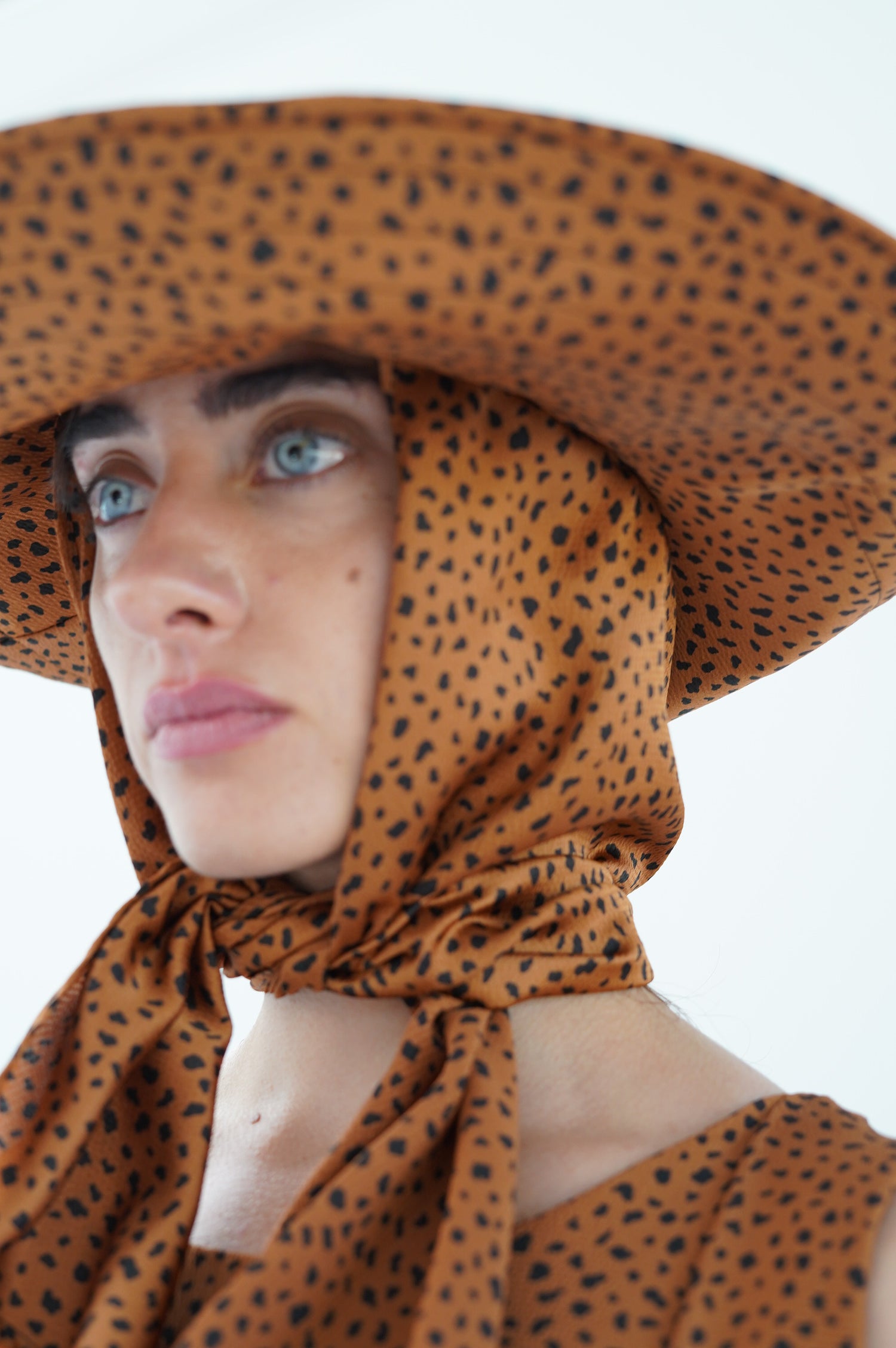 Our best hat; we love this style so much! Sunhat that provides great shade for face, one size fits most, self scarf tie for windy weather, chill, or privacy, wear tied or untied. 100% Japanese textured woven faux silk blend, medium weight silky fabric.