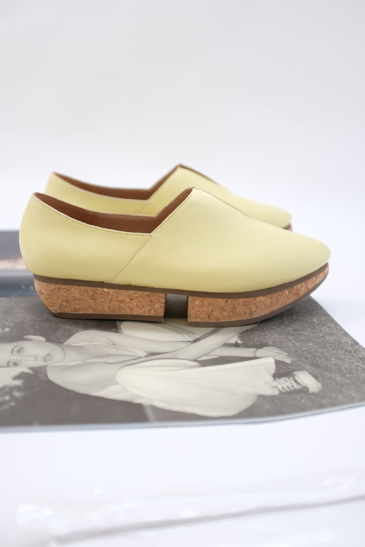 Leather slip on shoe, split cork 1 1/4" platform heel, all leather upper, v-detail, walking shoe. A best selling shoe in the shop. These are hard to keep in stock due to their cult following :)