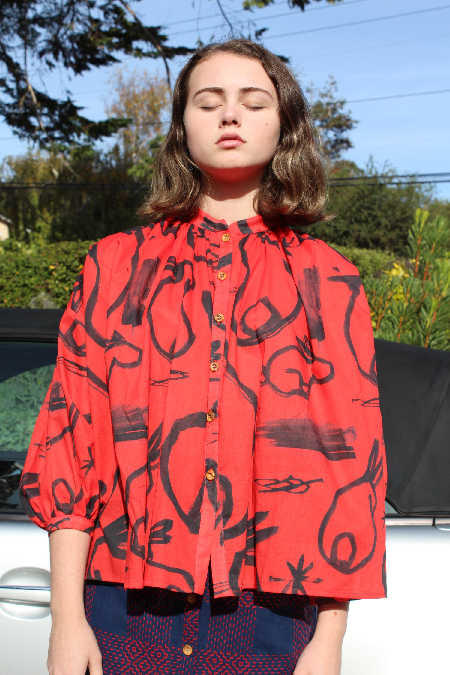 Oversized, billowy painter blouse, rushing at collar, shoulders and back yoke, stand collar, medium balloon sleeves with buttoned cuffs, wooden button fastenings. Carmella is wearing size small. She is 5’7”. 55% linen 45% cotton blend, digitally printed.