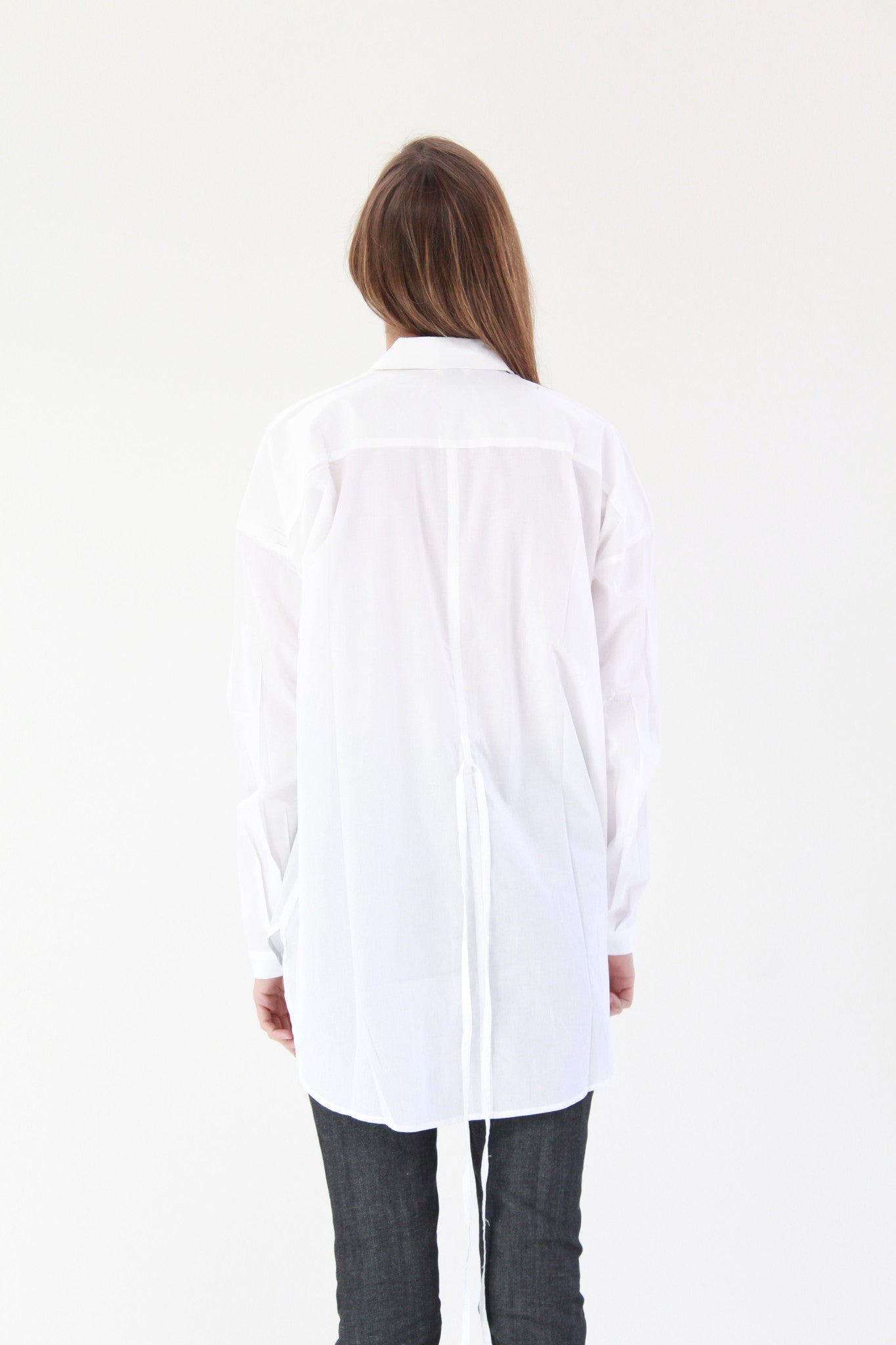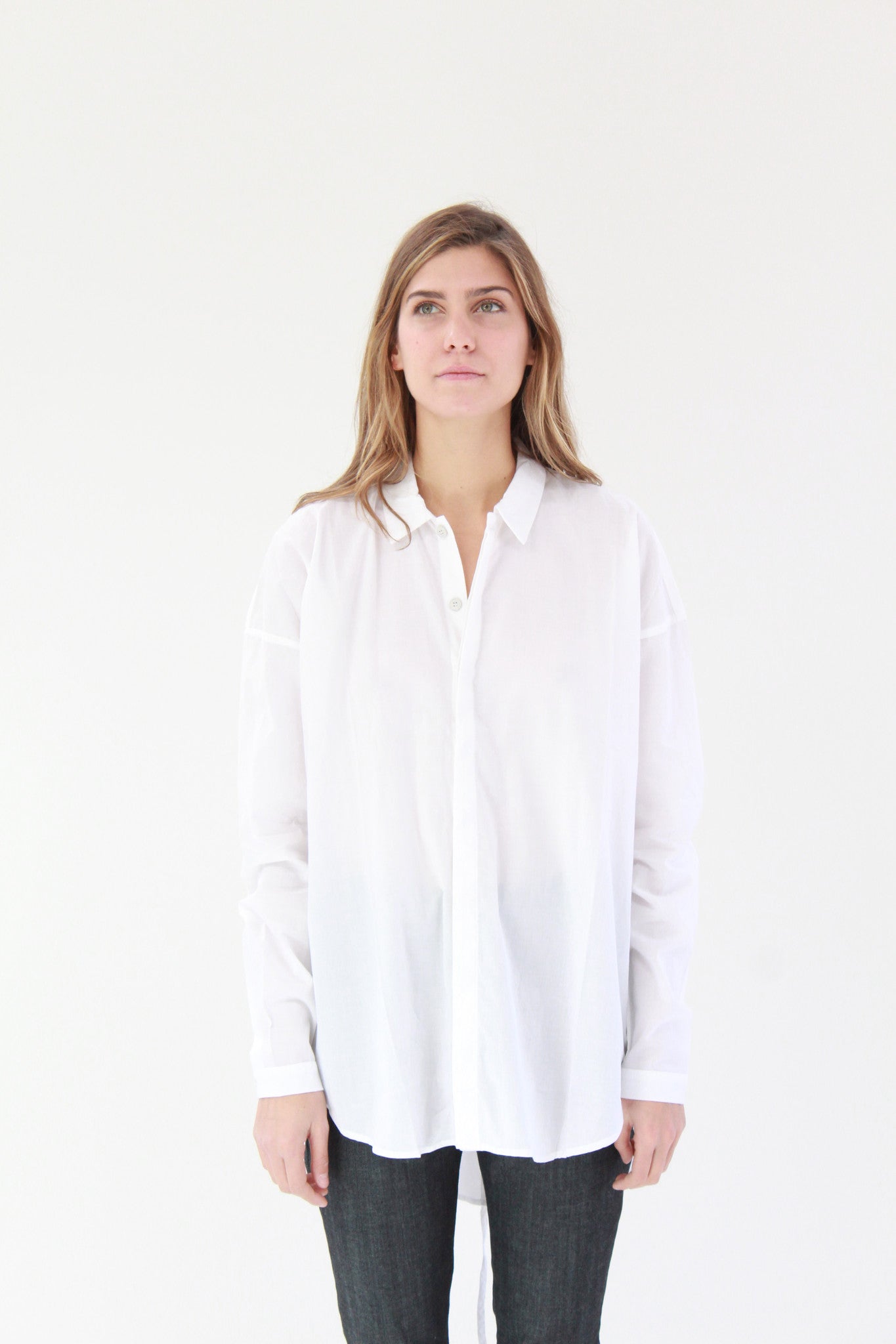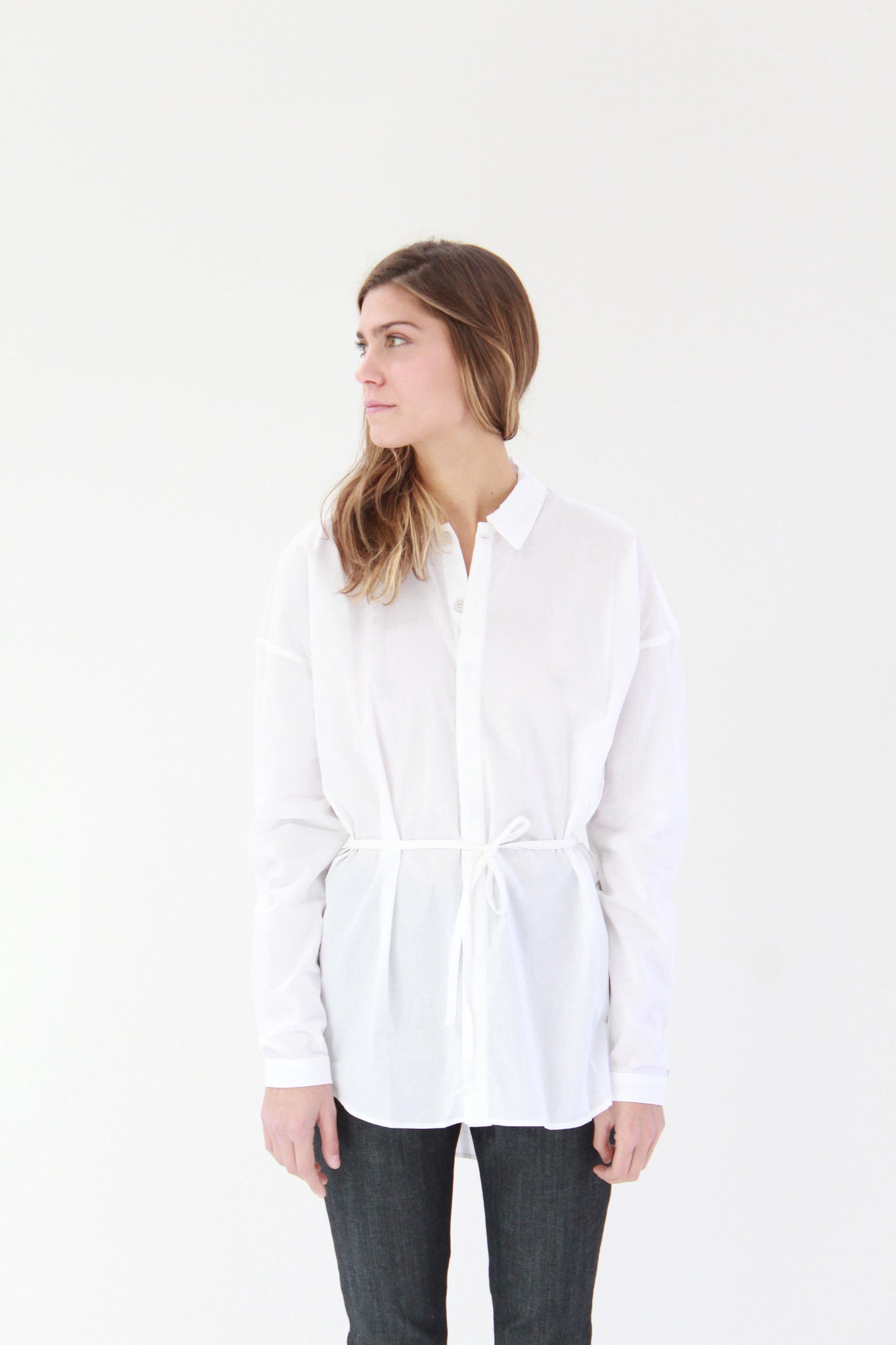 Loose fit, long sleeve shirt with collar & concealed button front placket. Curved back hem is longer than front. Comes with self fabric belt. Premium 100% certified fair trade organic cotton voile. Italian made recycled hemp buttons.