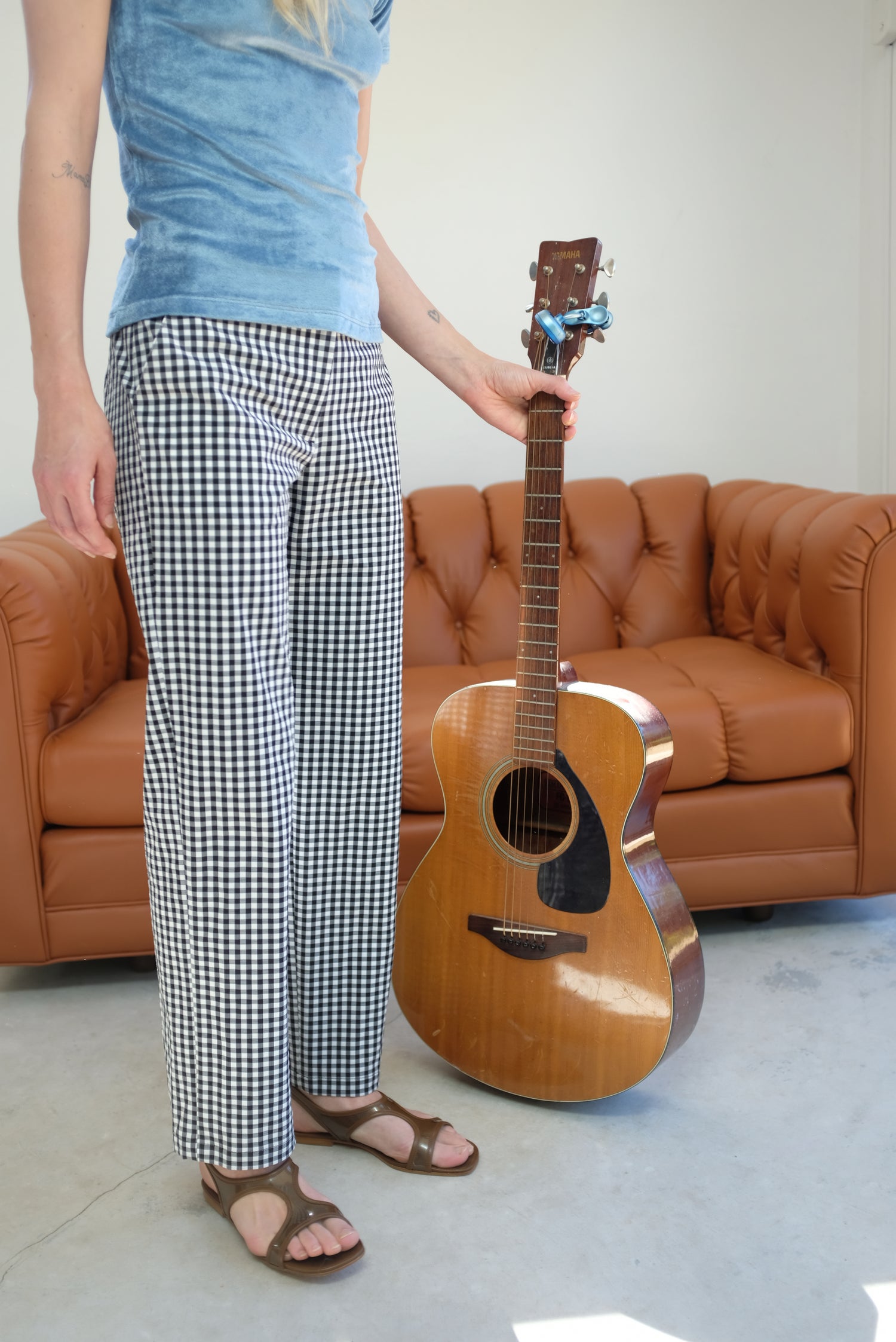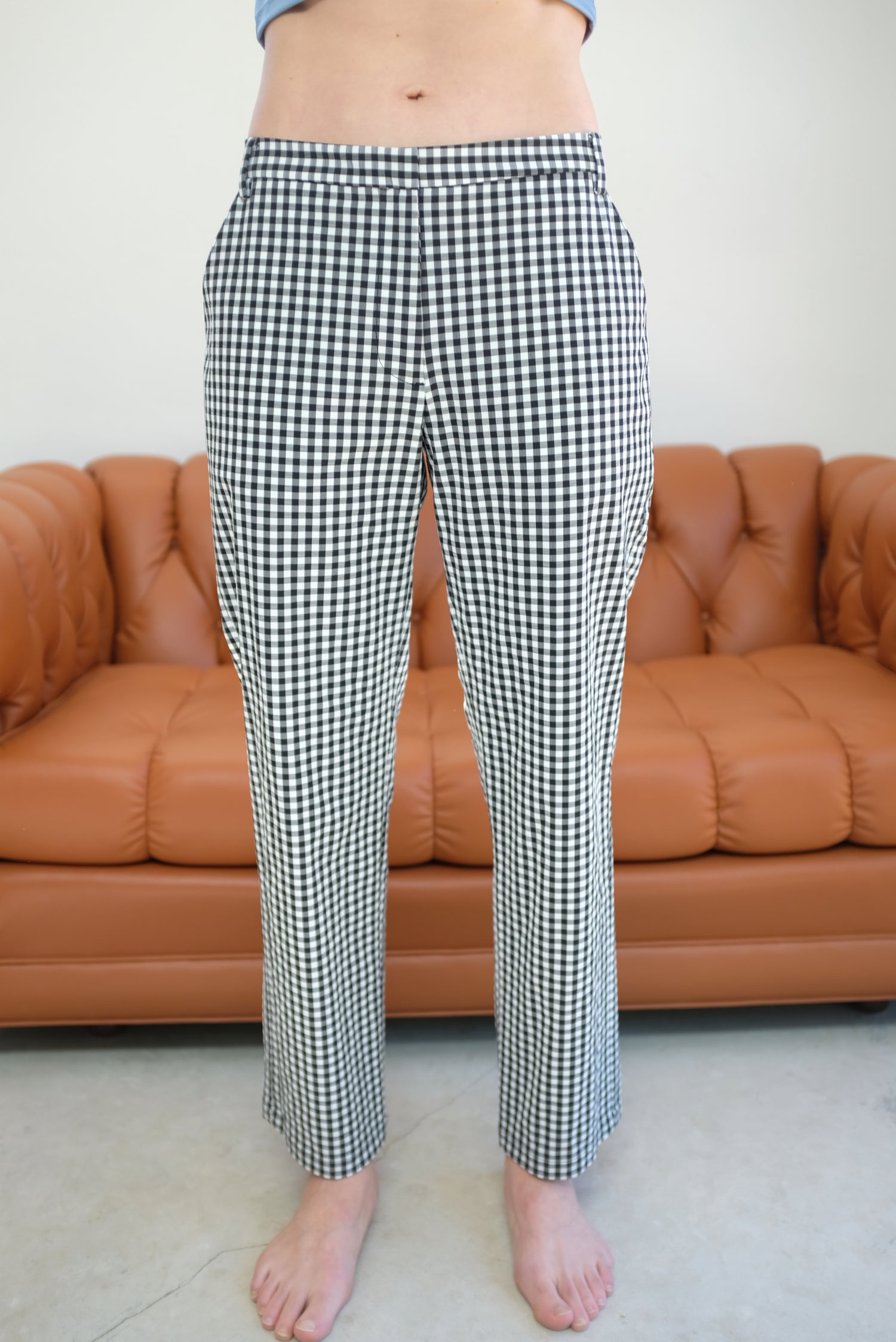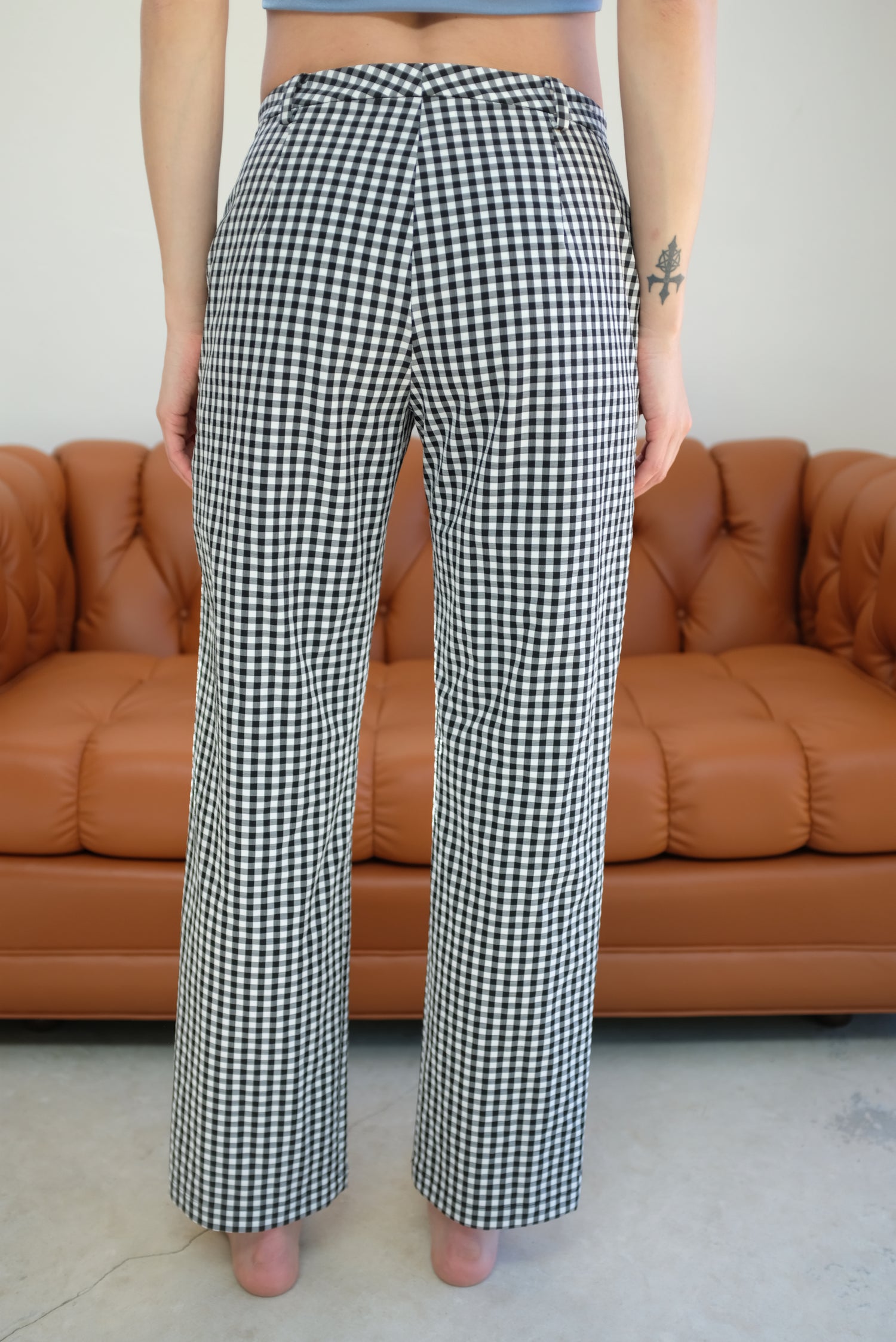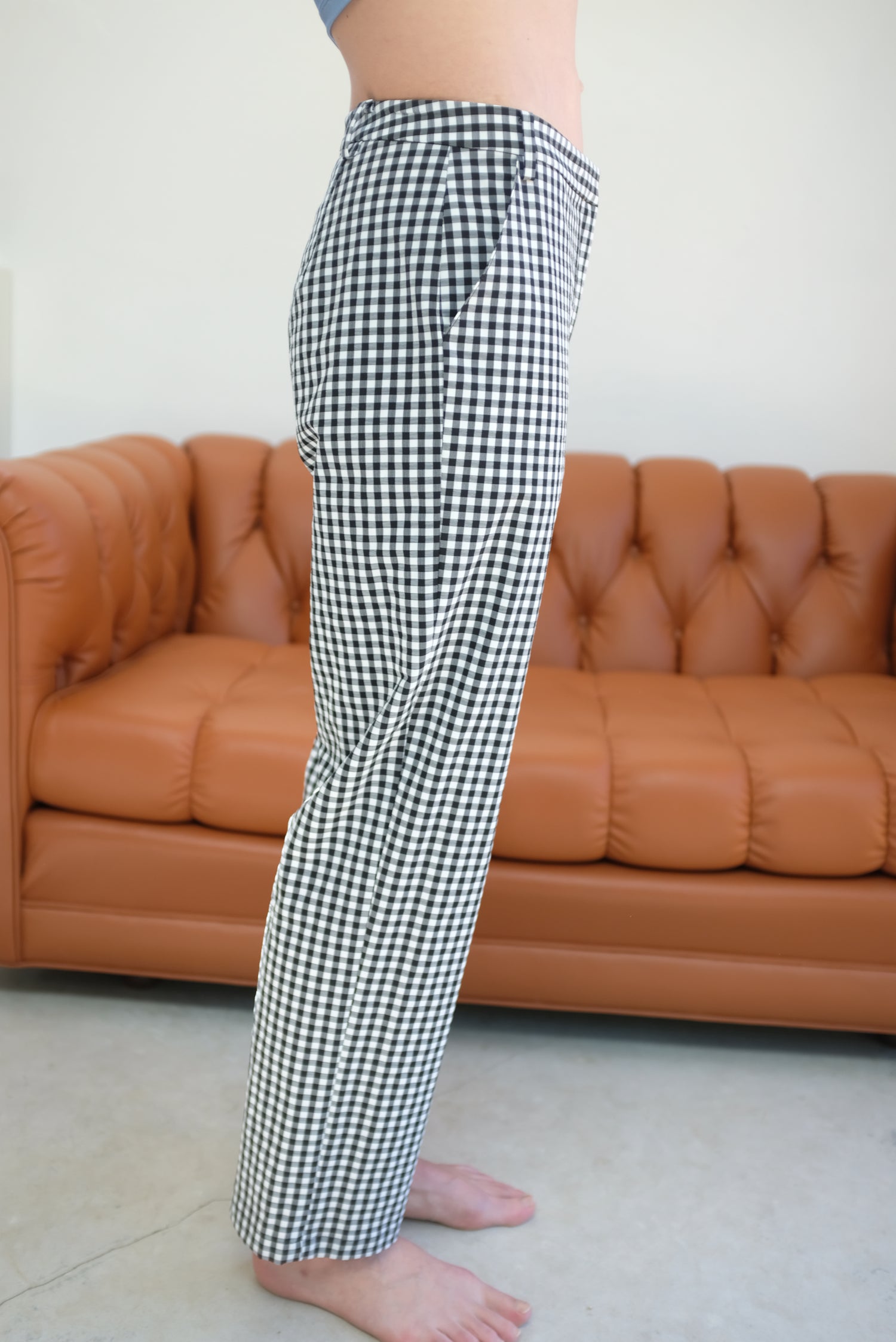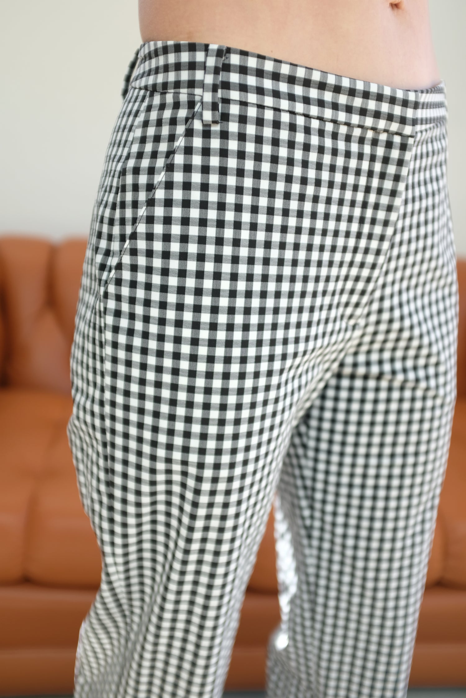 Midrise straight leg trouser with slight stretch in black and white gingham. Side pockets, fitted waist with front zipper and hook closure. 45% Nylon, 43% Polyester, 12% Elastane.