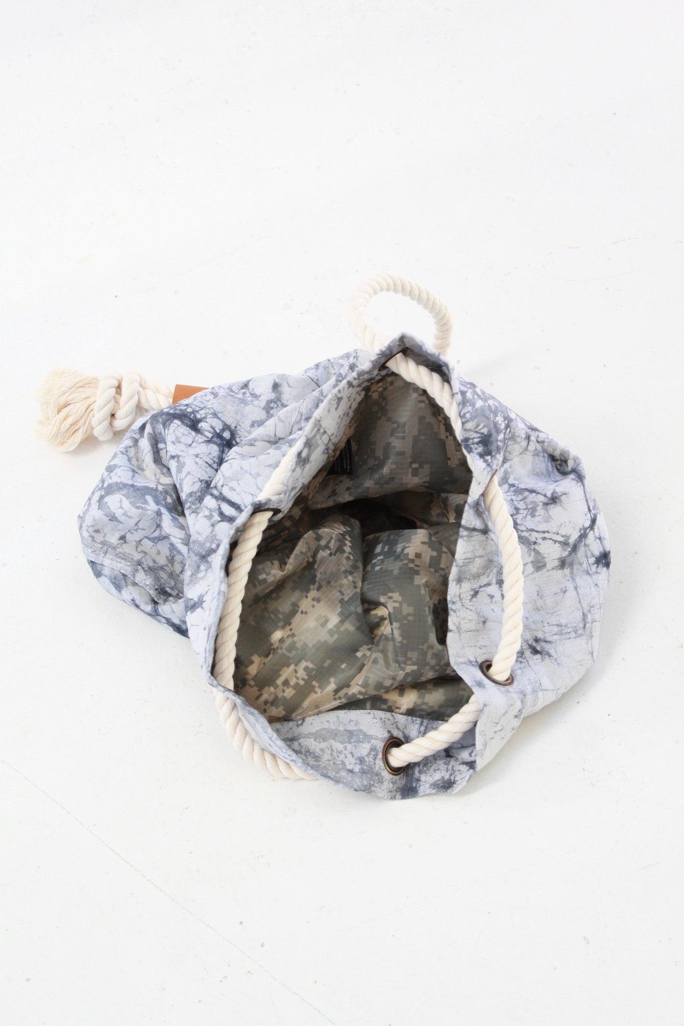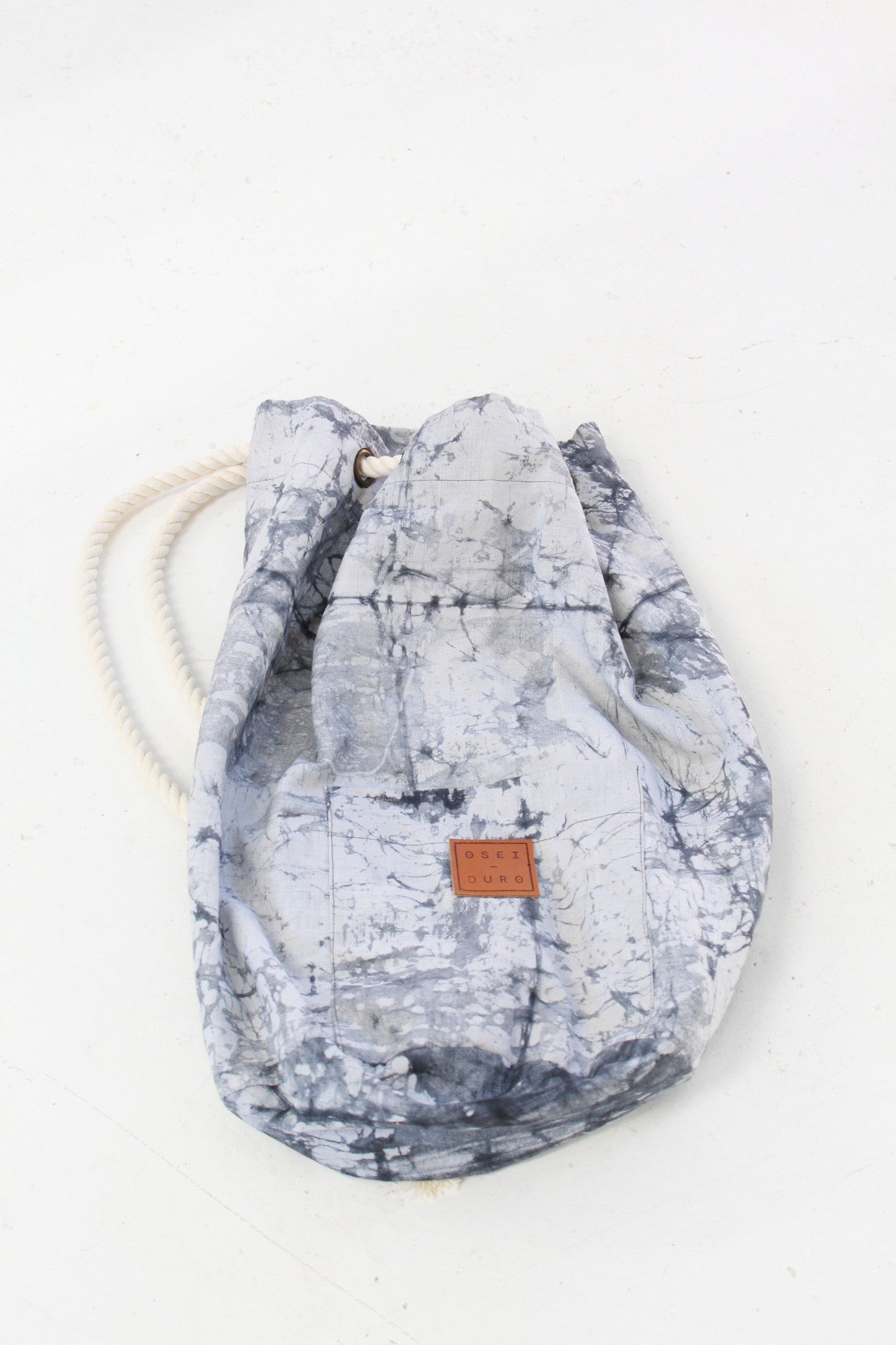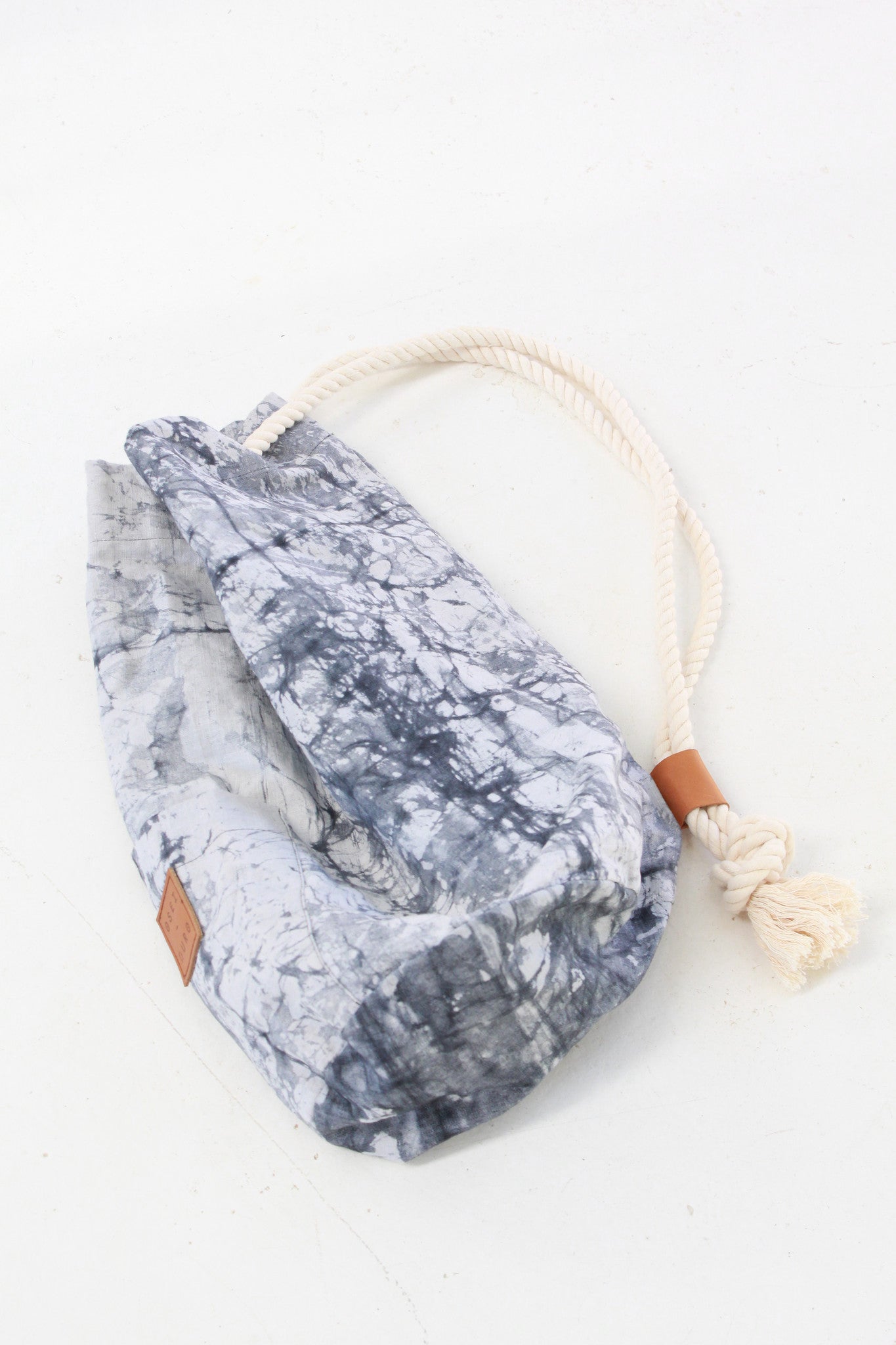 100% linen hand dyed exterior, outside pocket, lined, thick cotton cording, cinch closure. Aprox 19" x 17" -generously sized and holds a laptop, or works as a weekend or everyday bag.