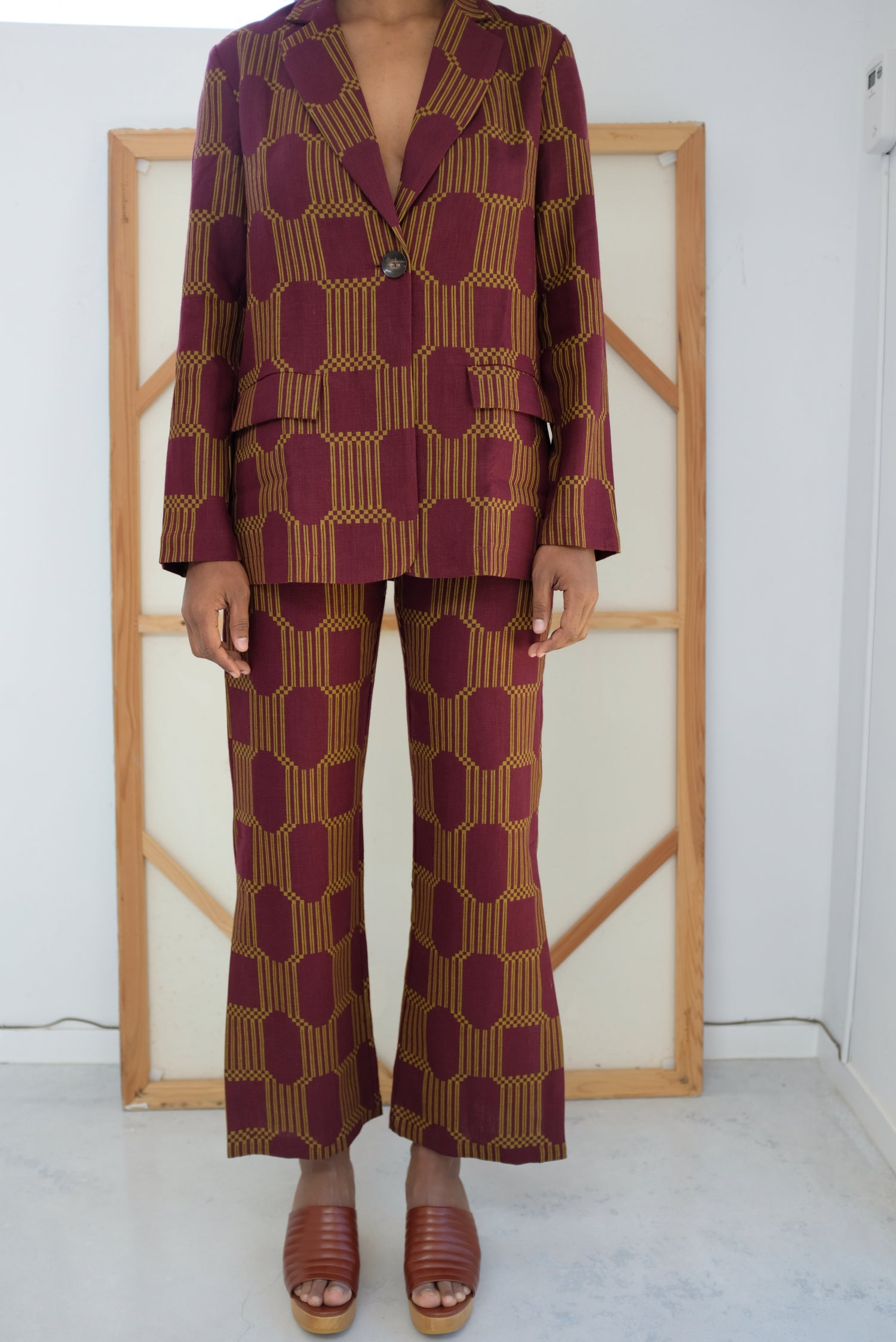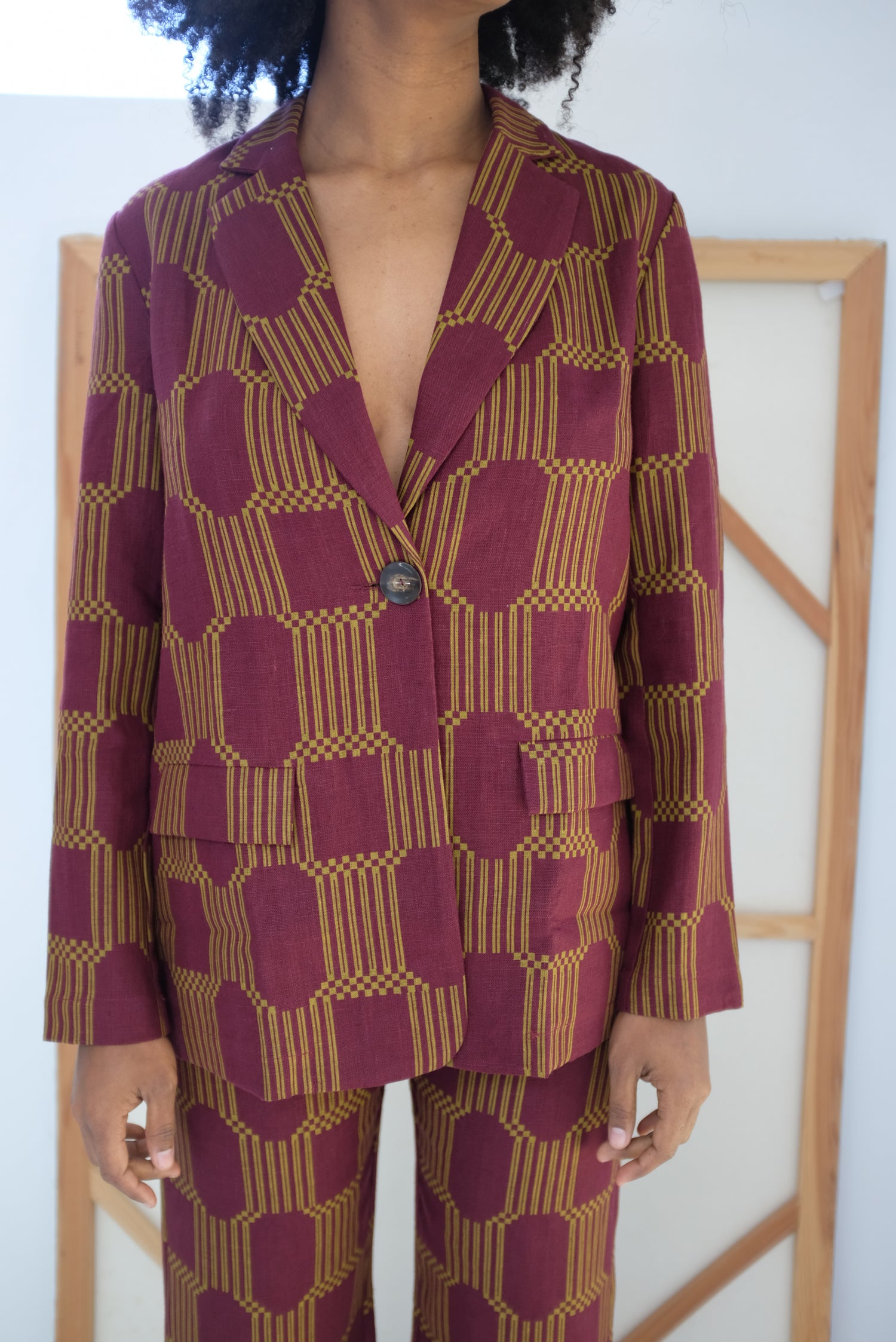 Geometric print linen blazer with two front pockets and a single button closure on the front. 100% linen.
