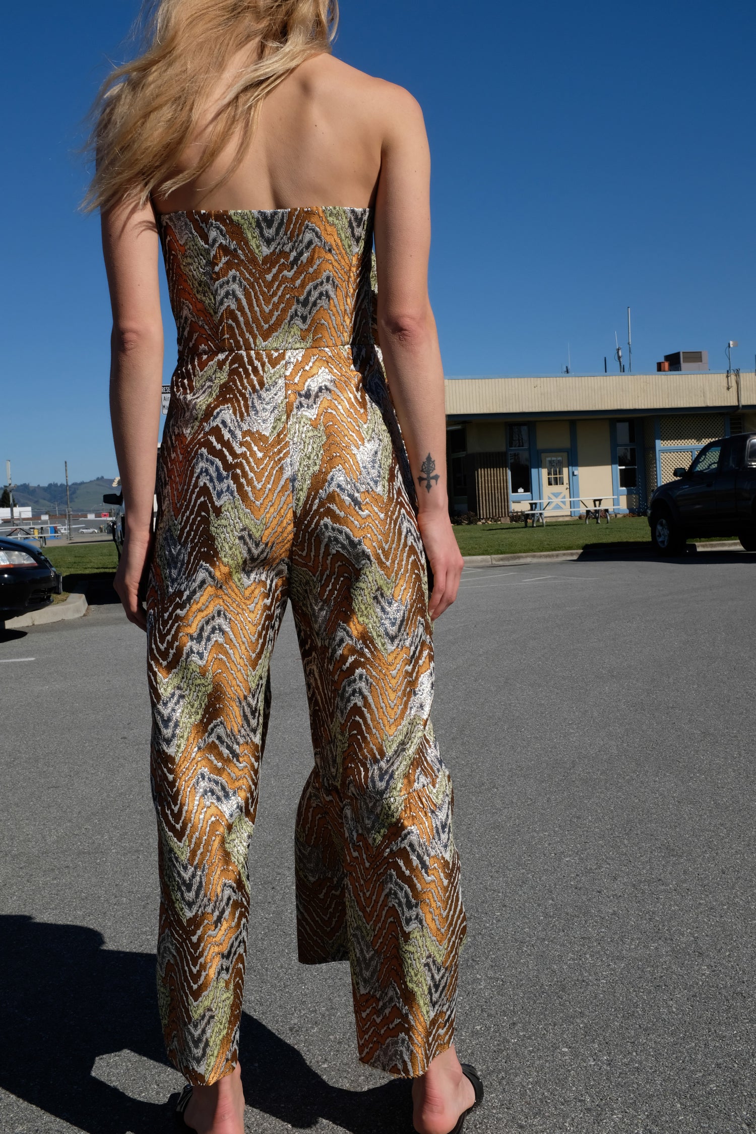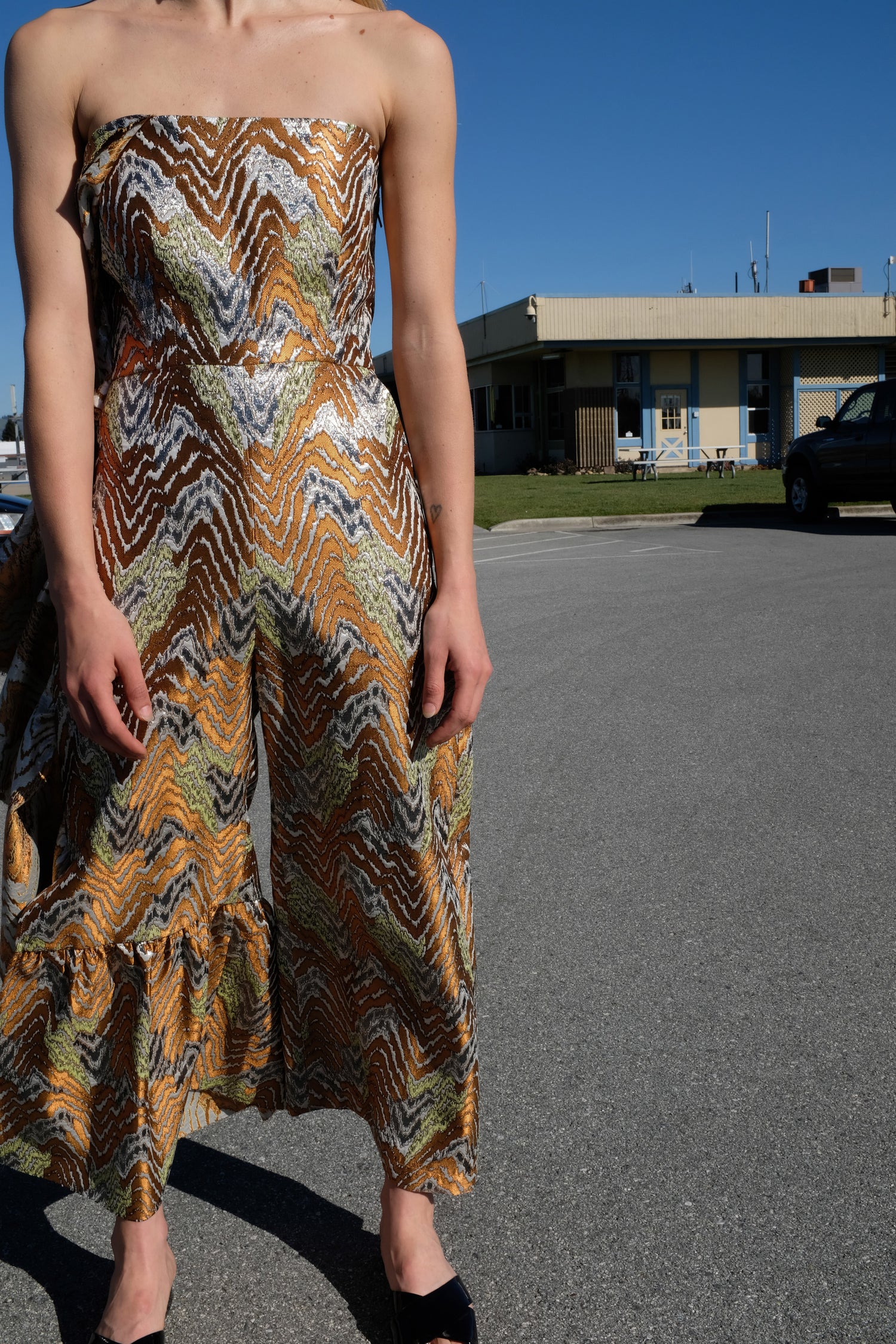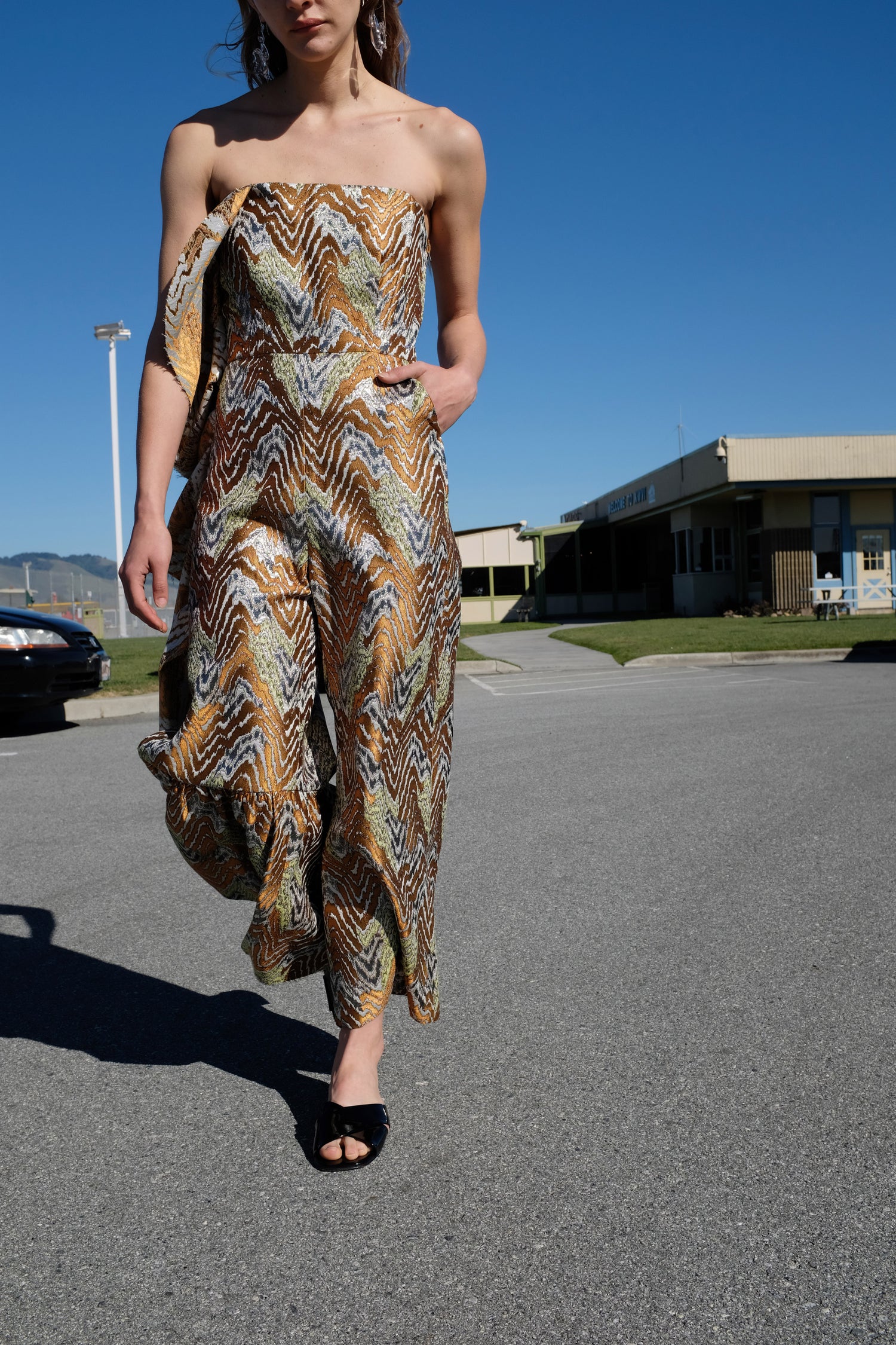 Strapless jumpsuit in multi gold metallic print with a fitted bodice, open draped ruffle on right leg. Zipper closure at side seam. Slant pocket at the hips. Wide culotte legs. 60% Polyester, 27% Acetate, 13% Cotton. Lining: 100% Polyester.