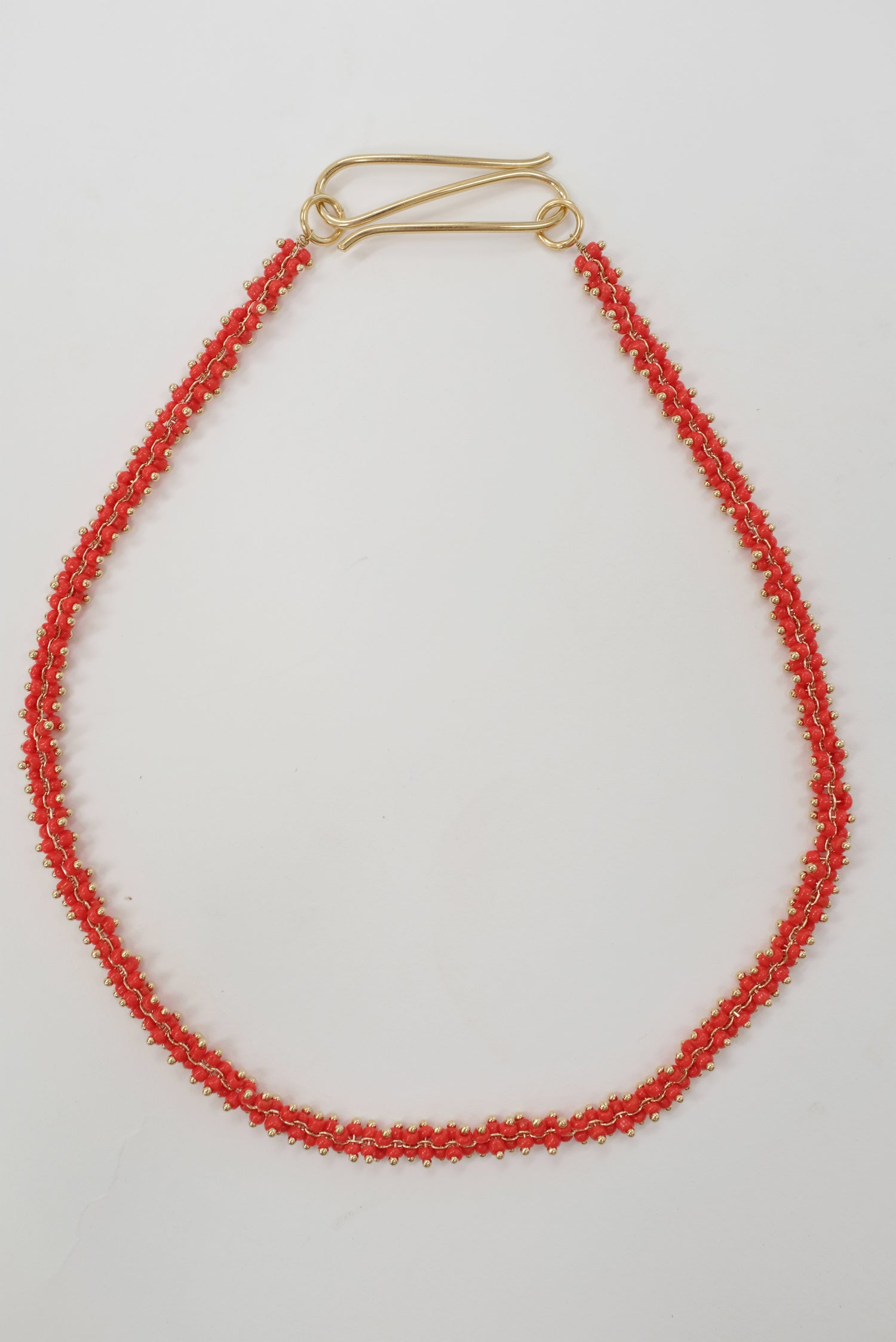 Gold plated brass and red glass beads chain necklace. Total length is 16".