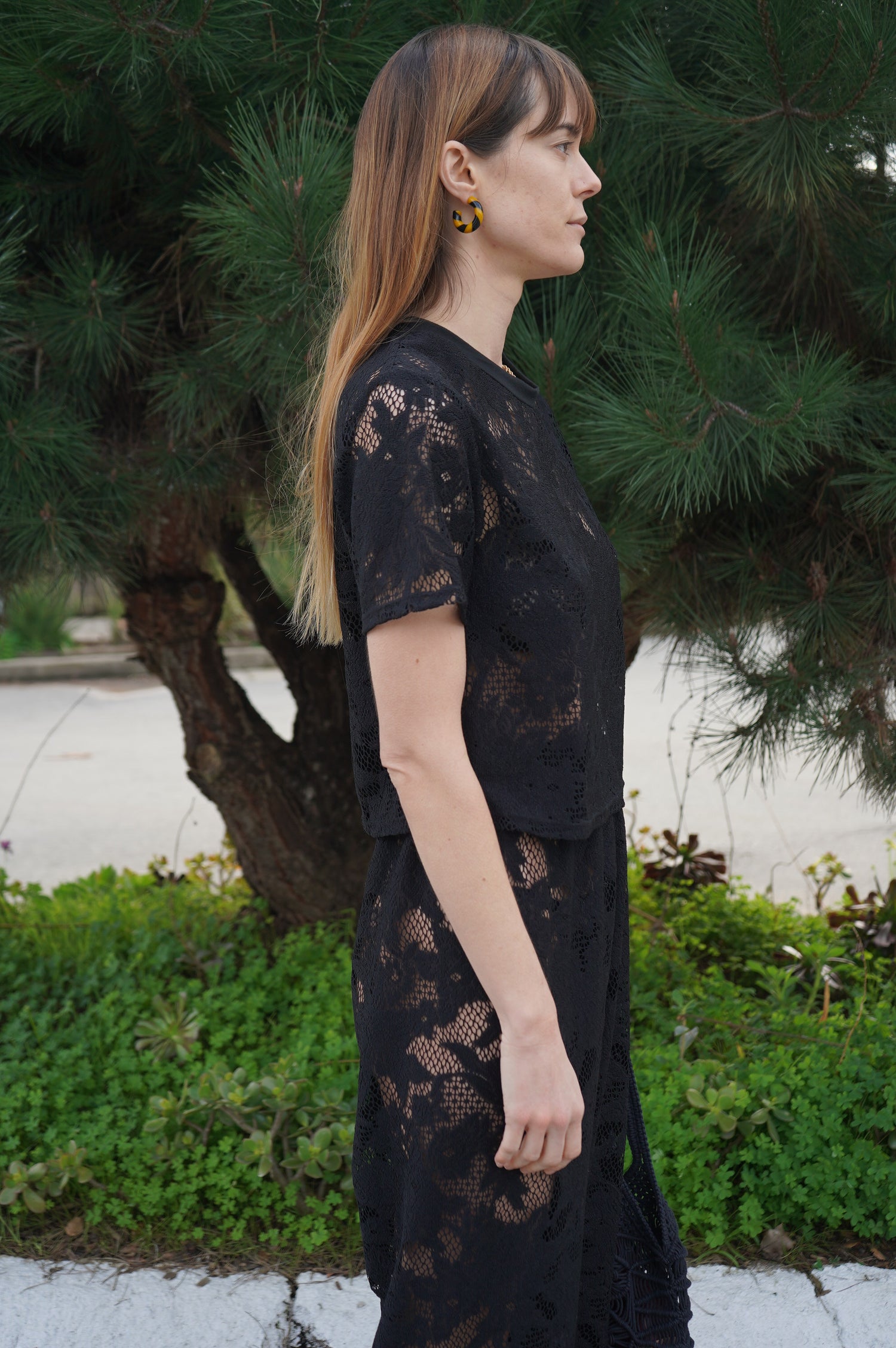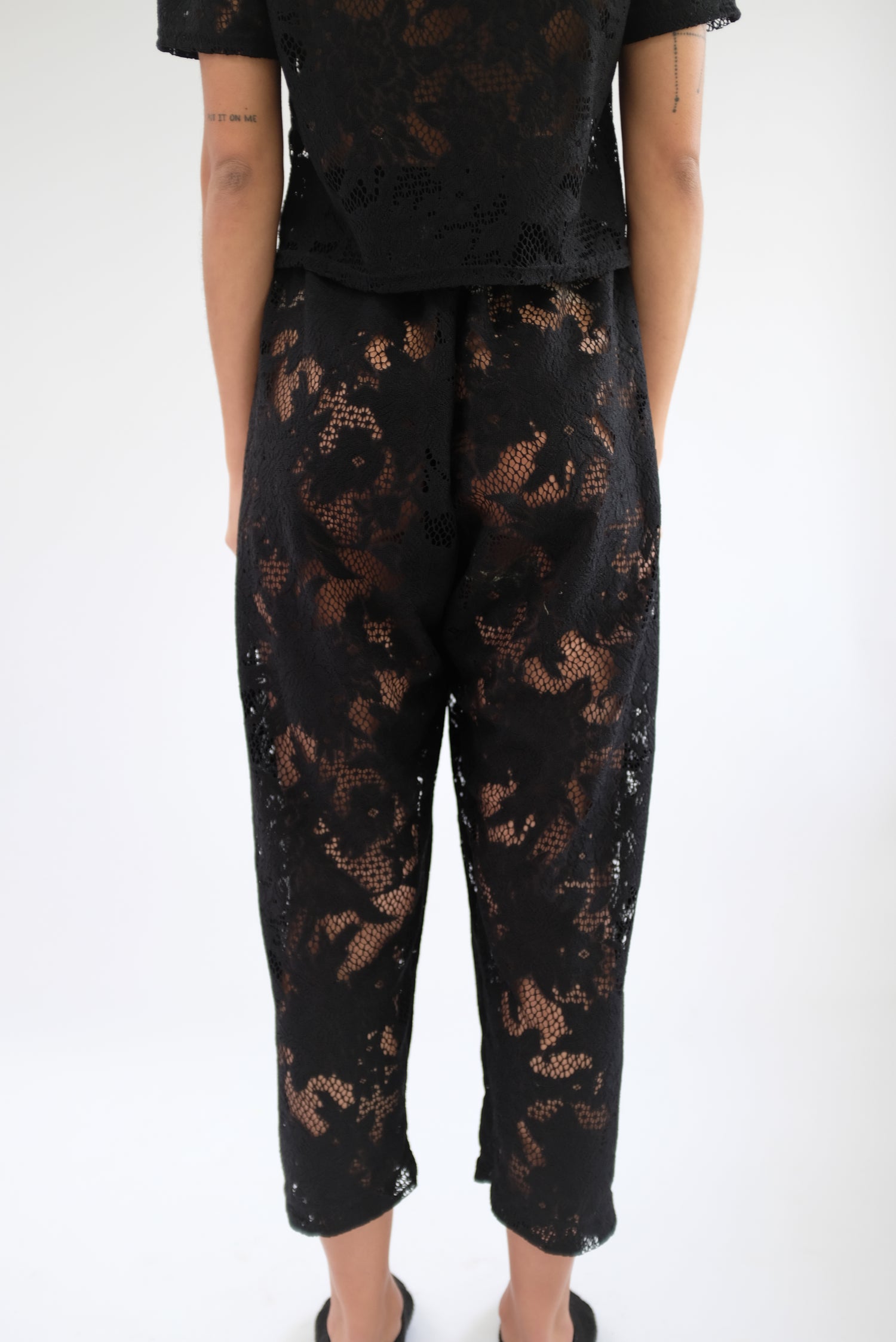 High waisted lace pants. Elastic waist, crazy comfortable. Loose drape fit. Model is wearing a small/medium. Total length 39", Inseam 27". 100% 100% Japanese poly lace. Running true to size.