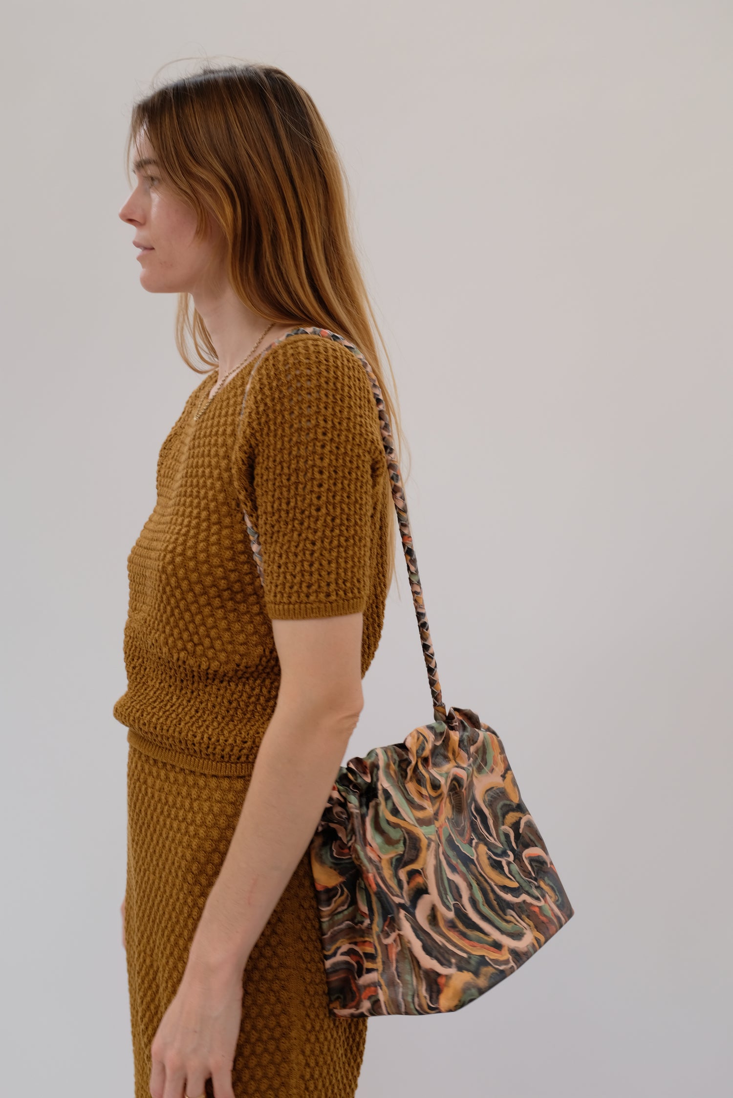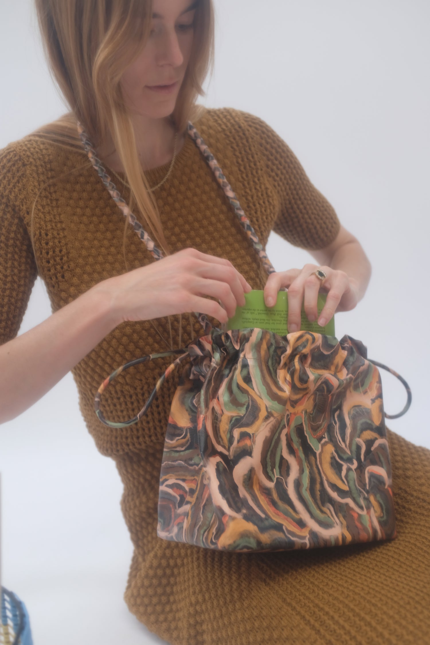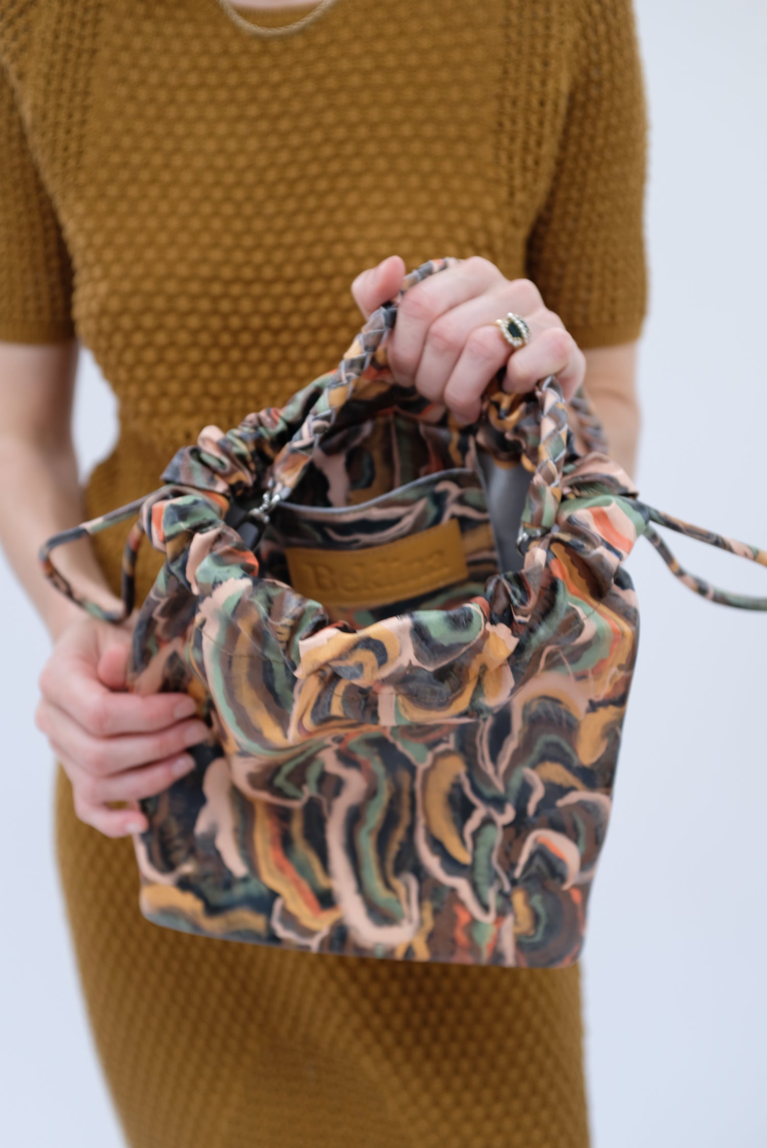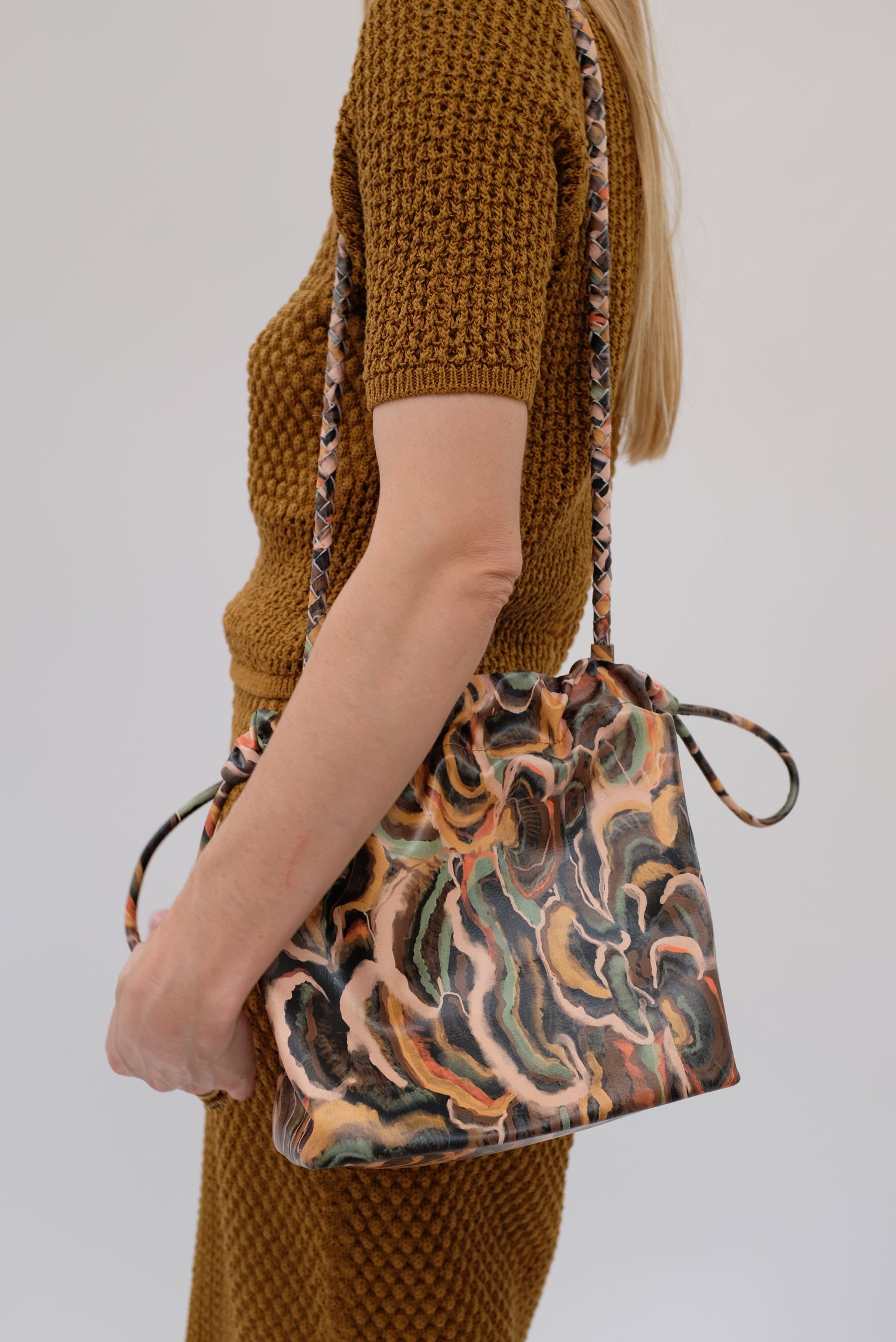 Cinch drawstring bag, includes inside pocket and holds just about everything. Detachable braided strap. 100% leather.