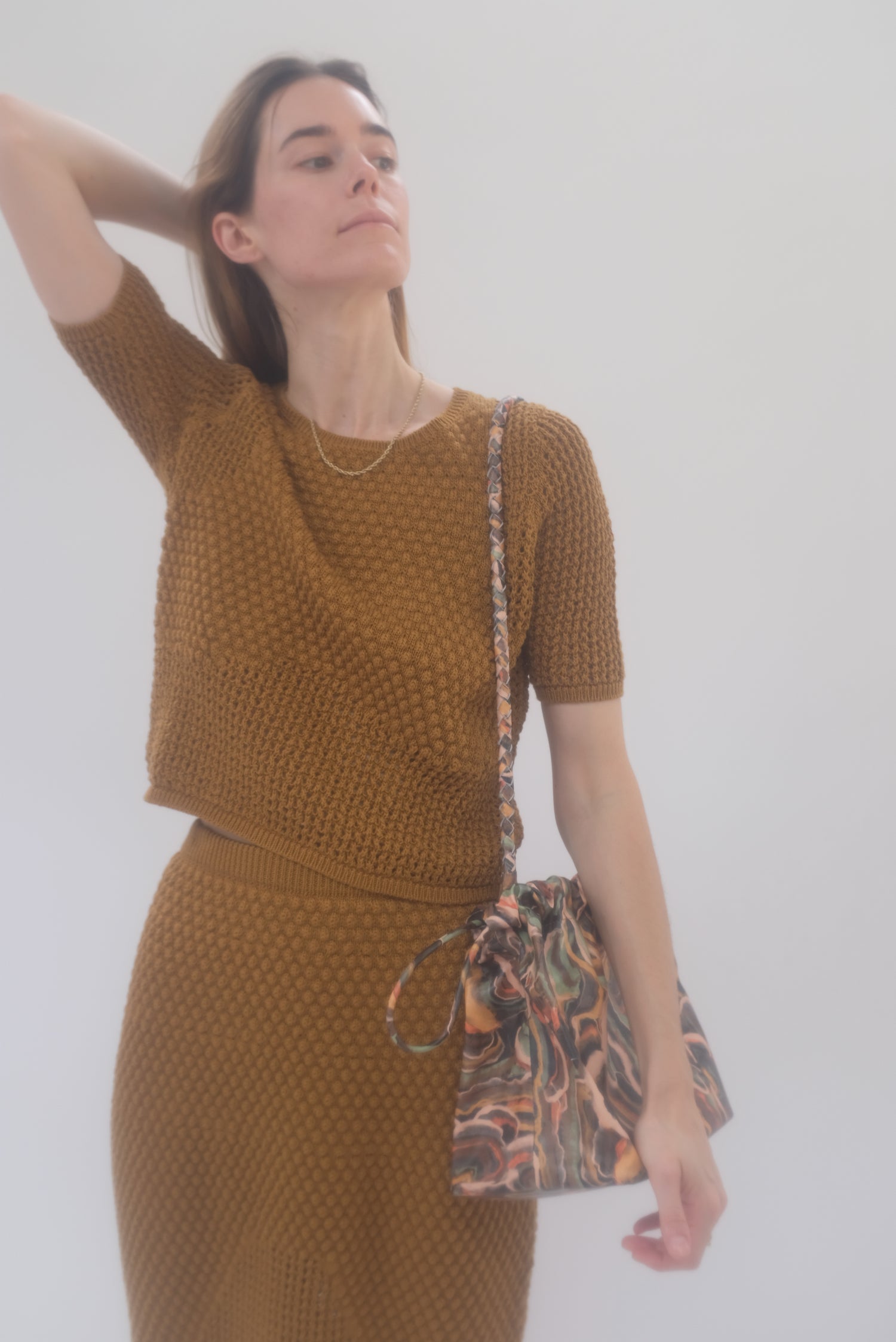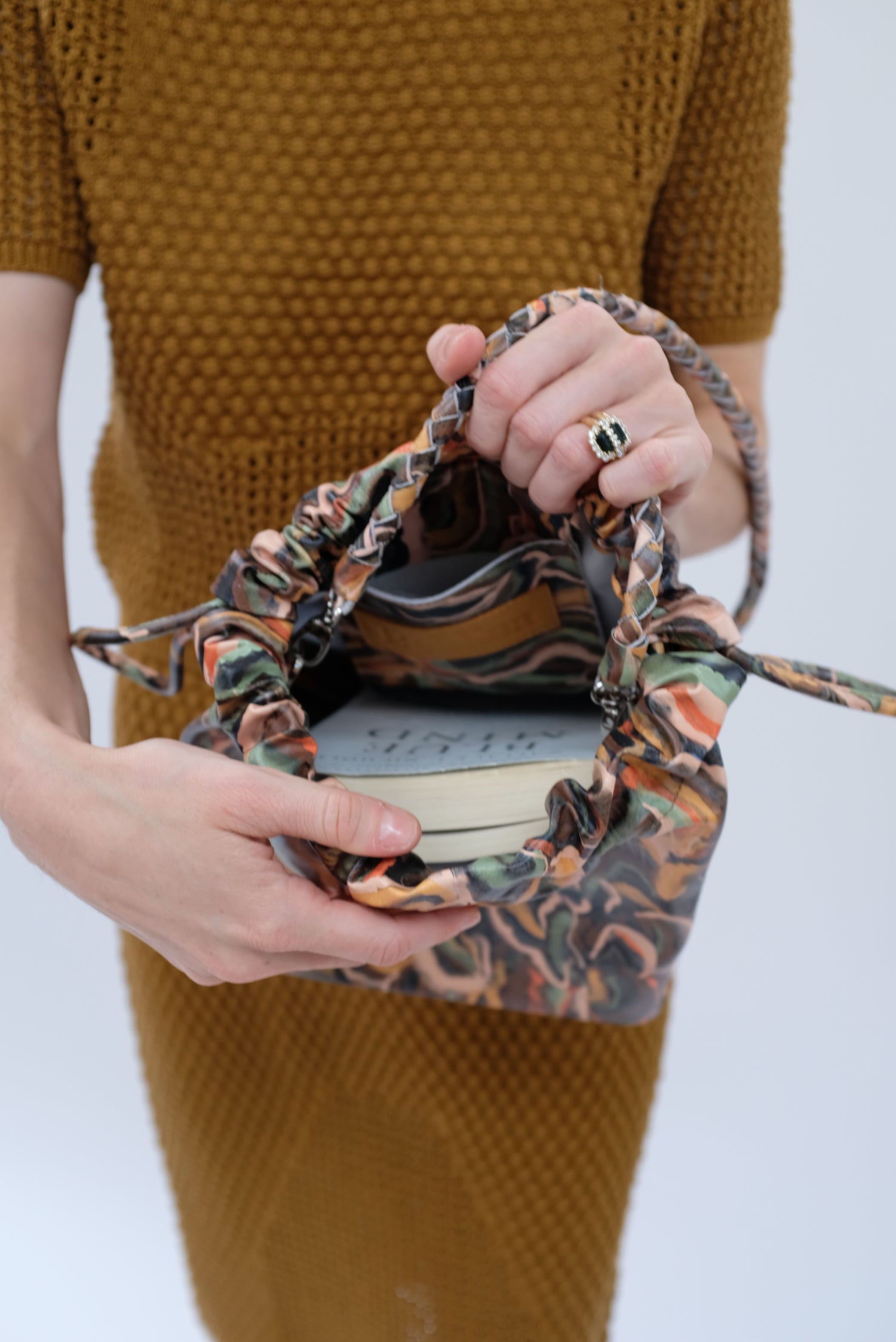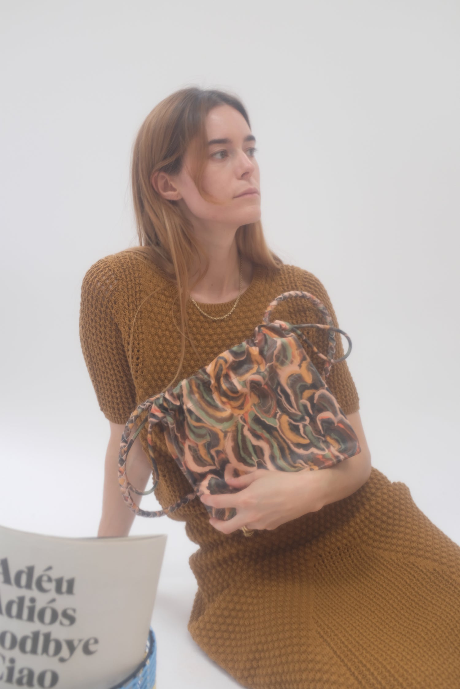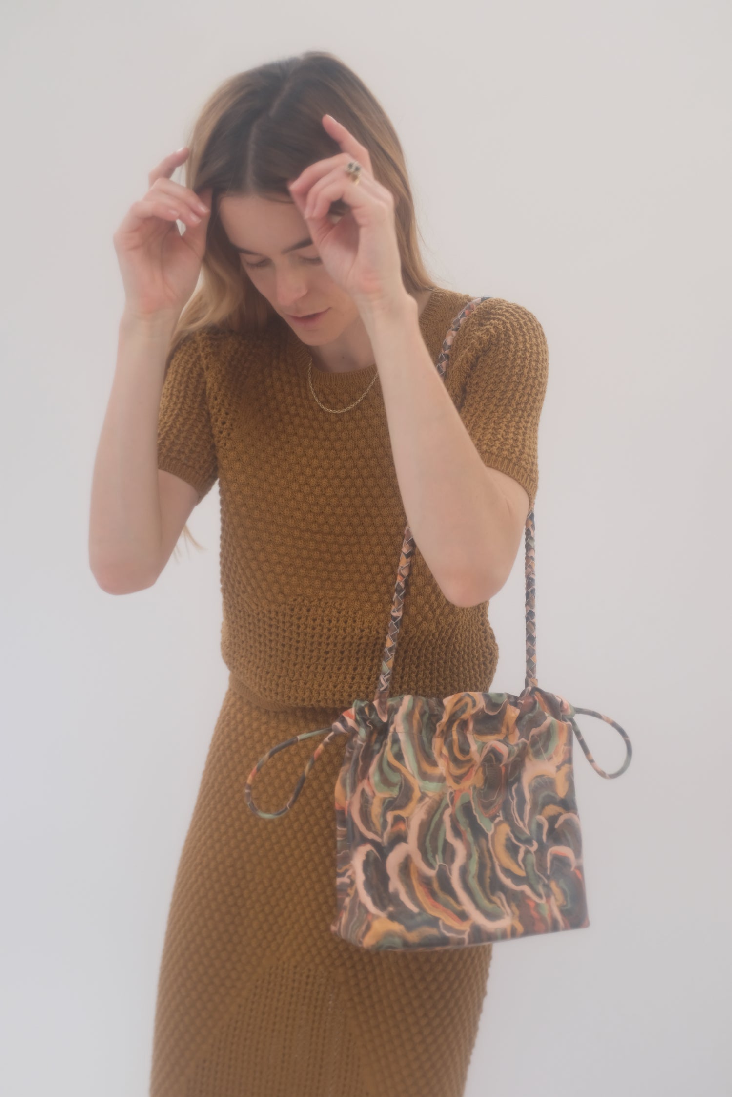 Cinch drawstring bag, includes inside pocket and holds just about everything. Detachable braided strap. 100% leather.