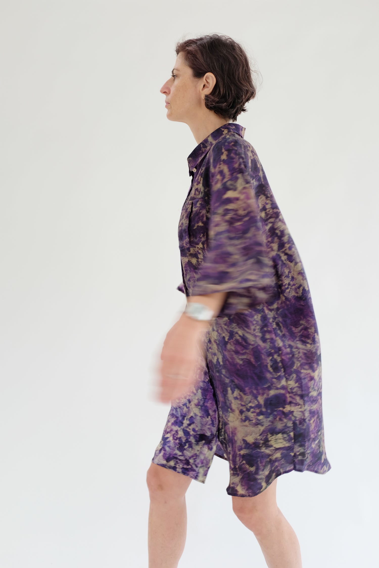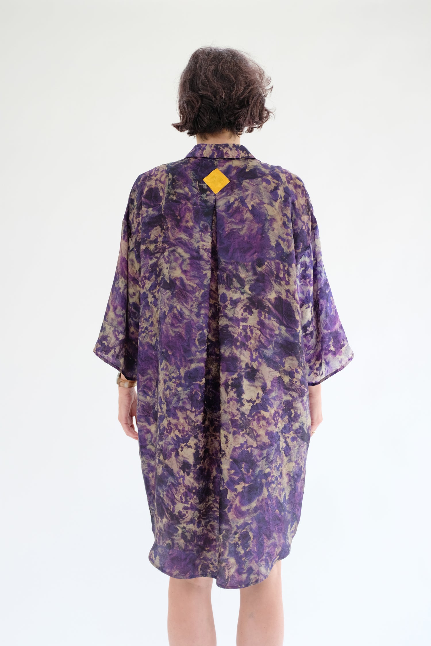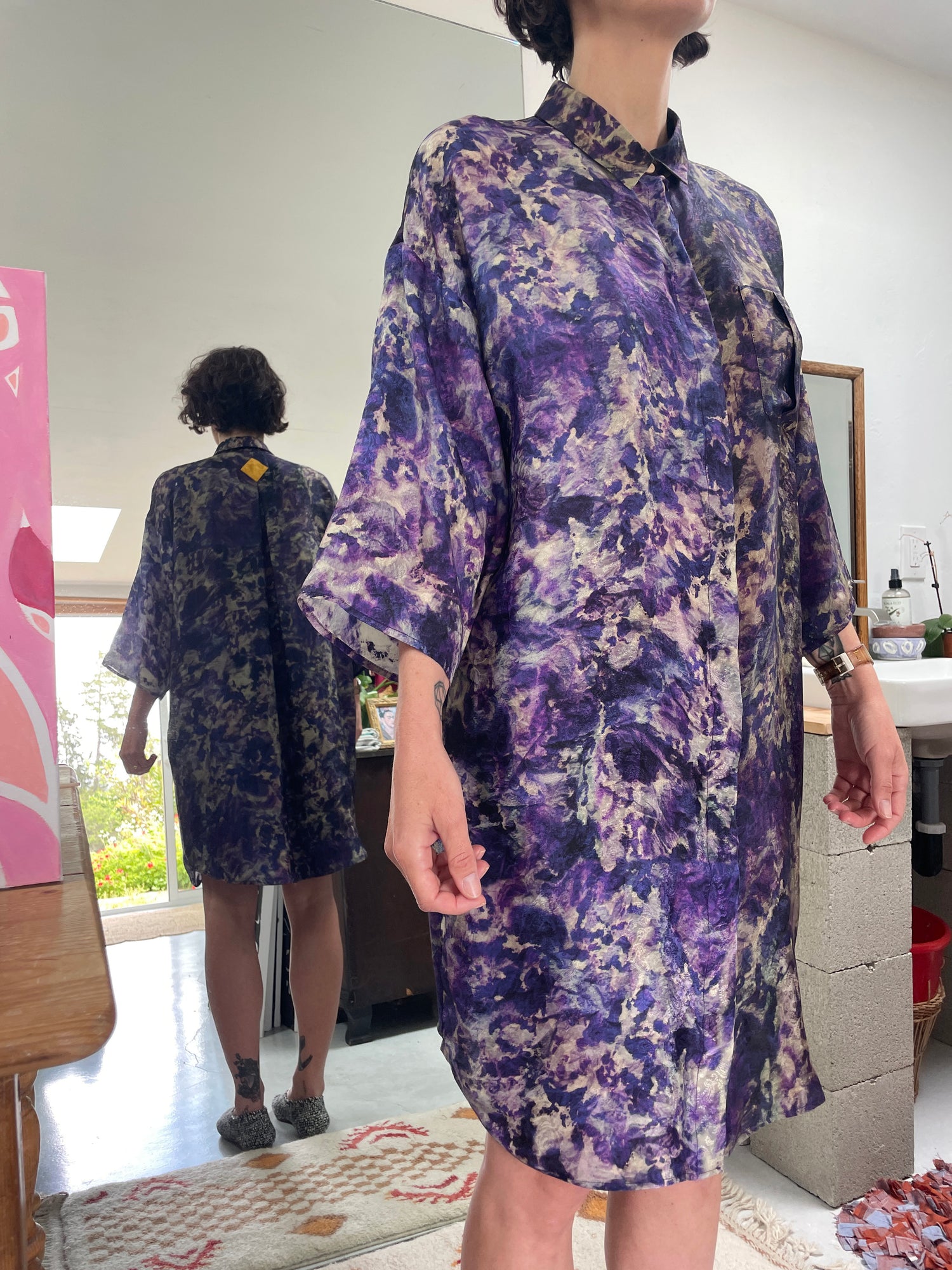 Marbled purple paisley jacquard silk dress with concealed buttons and a front pocket. Relaxed fit, standard collar, wide sleeves, and a curved hemline. One size fits most. 100% Organic peace silk.
