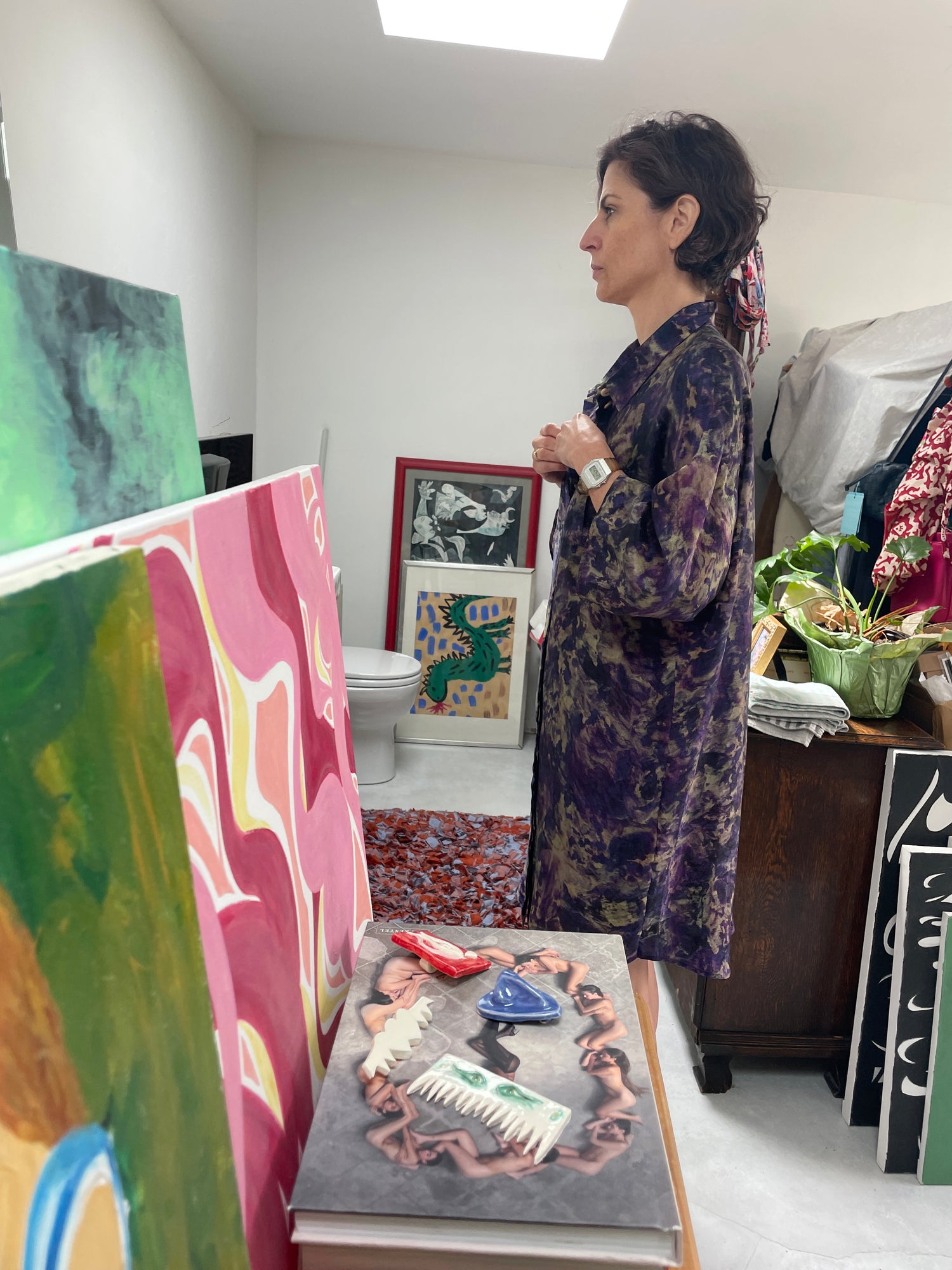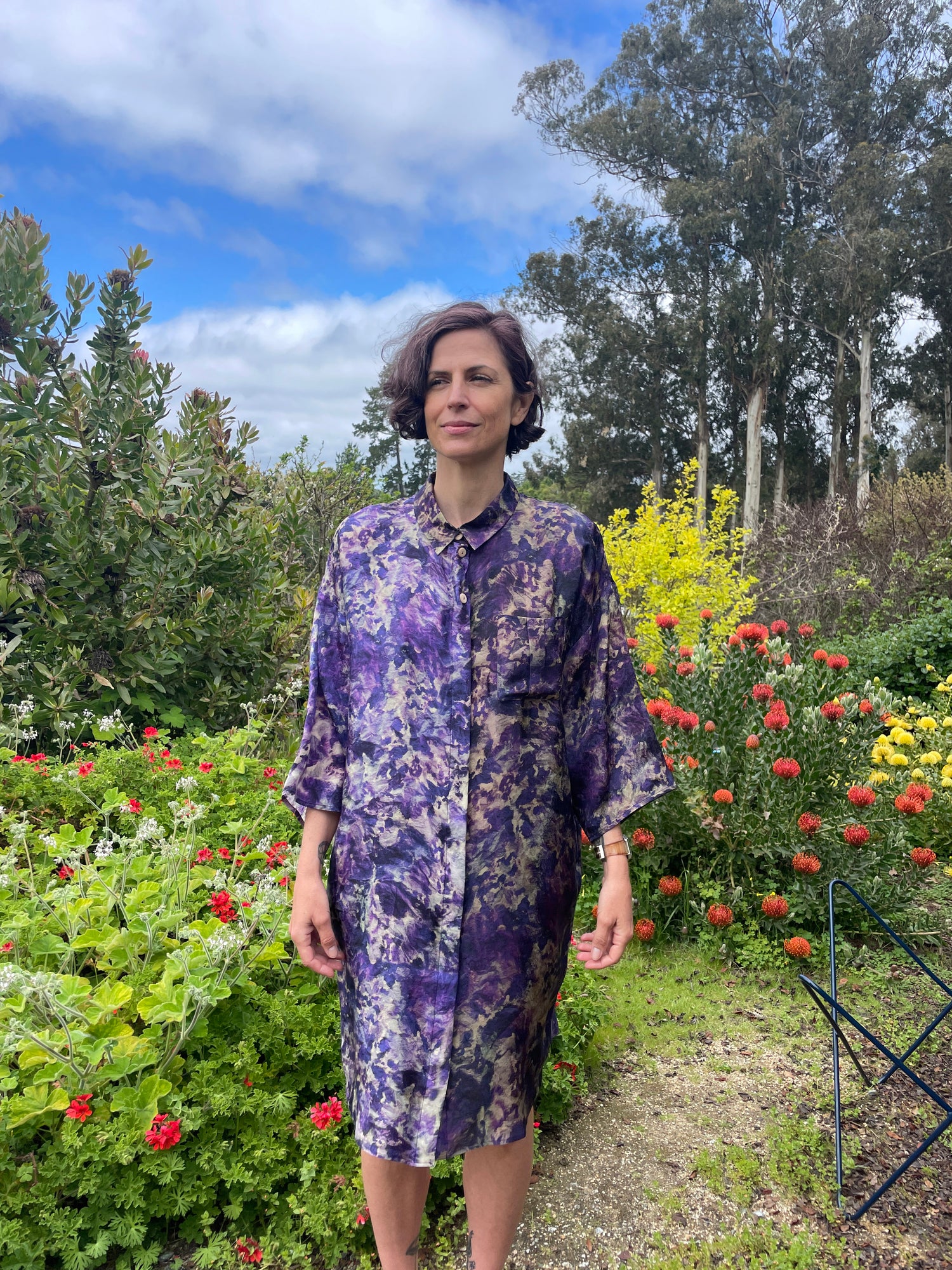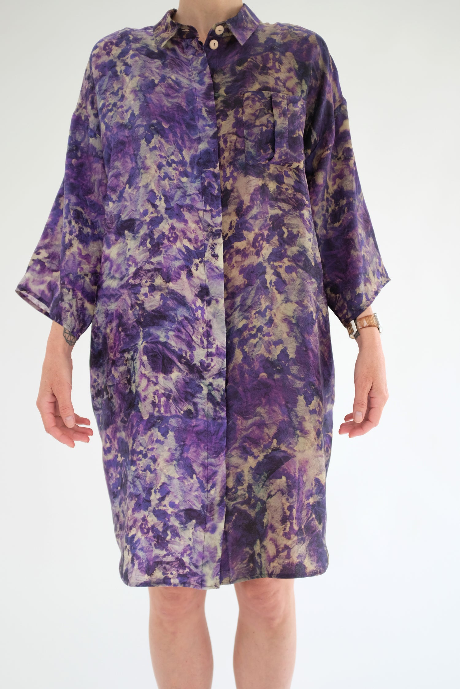 Marbled purple paisley jacquard silk dress with concealed buttons and a front pocket. Relaxed fit, standard collar, wide sleeves, and a curved hemline. One size fits most. 100% Organic peace silk.