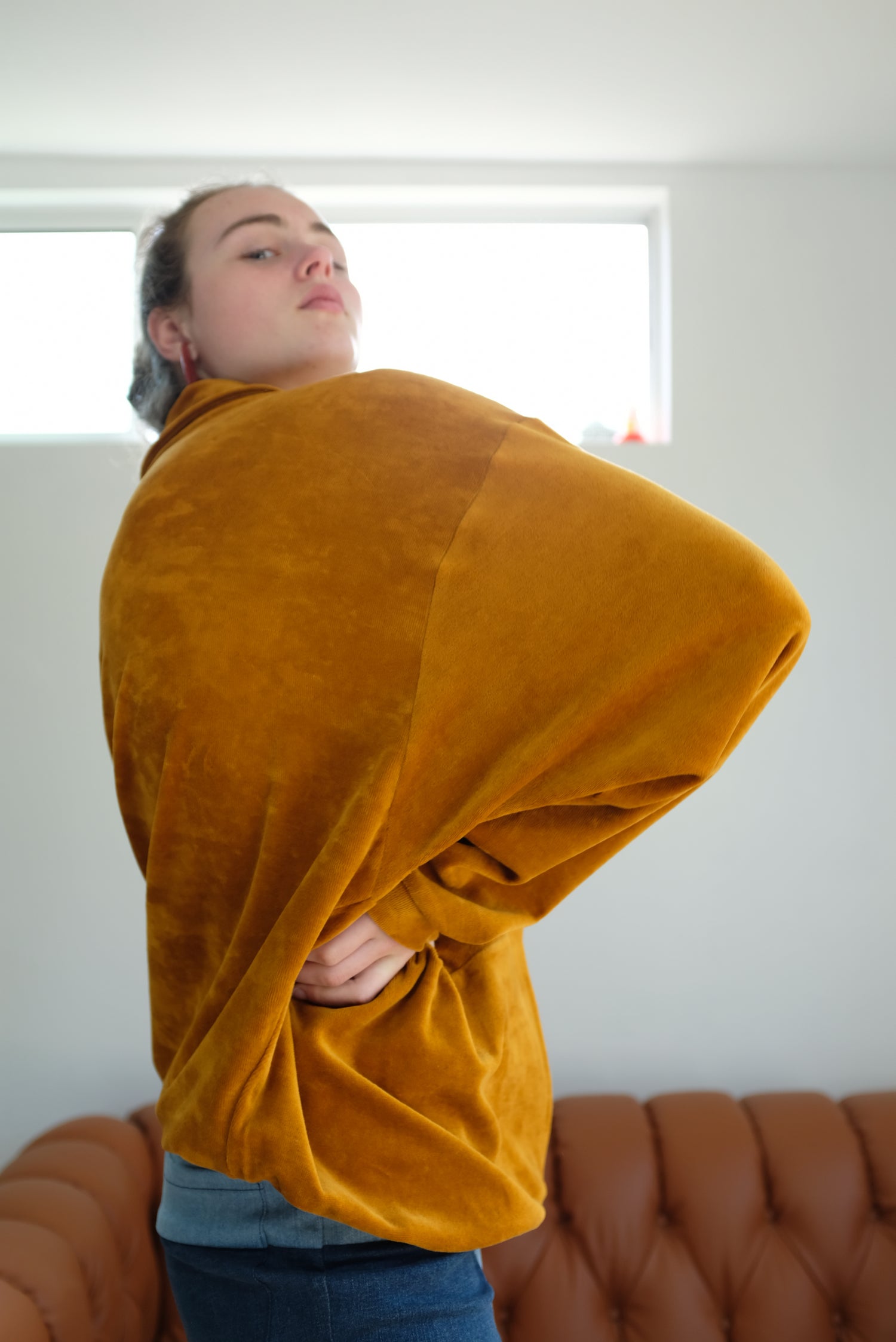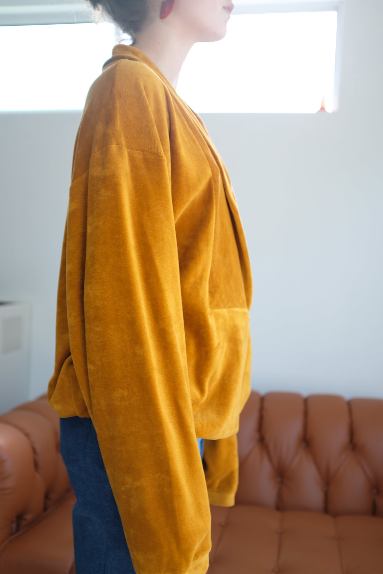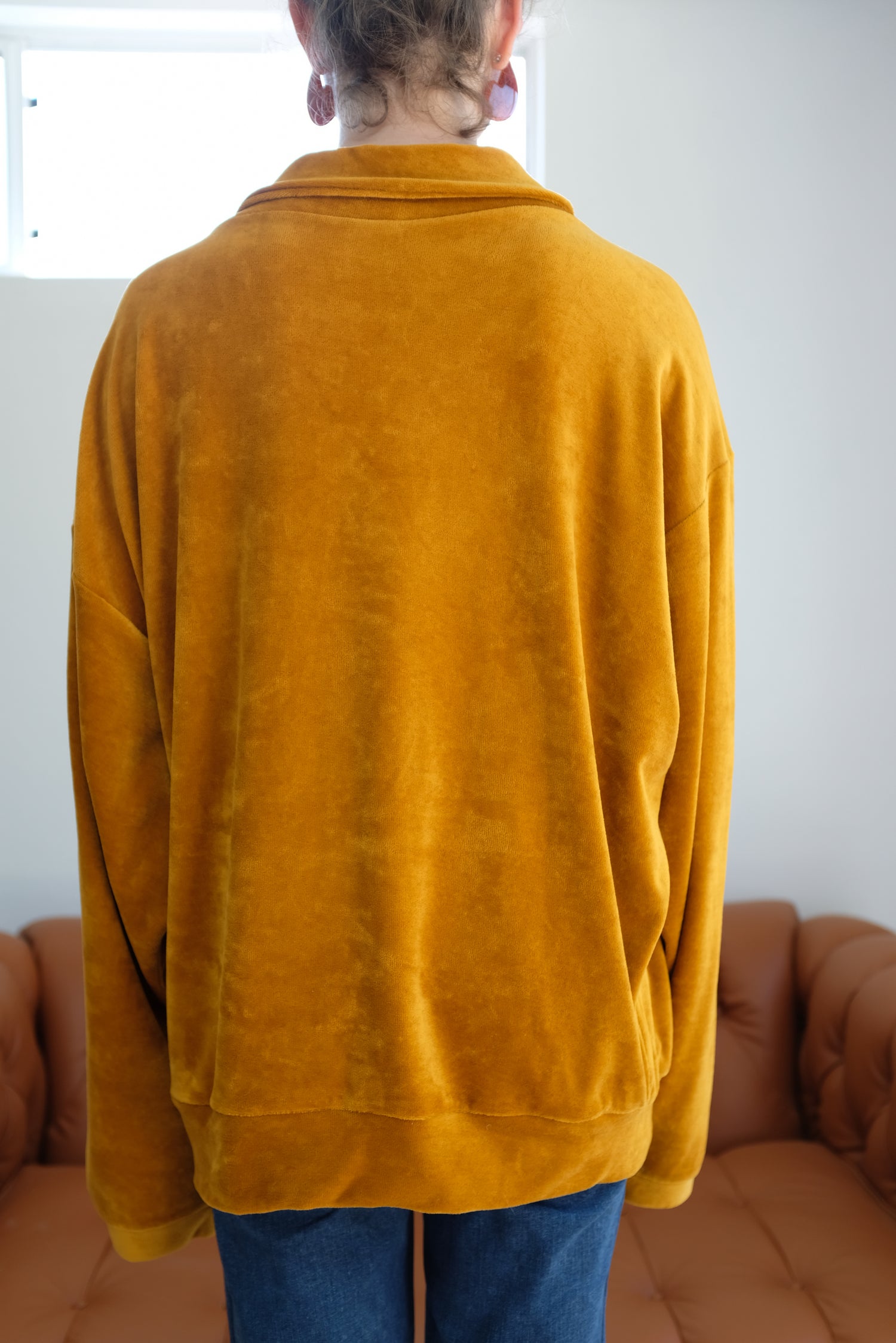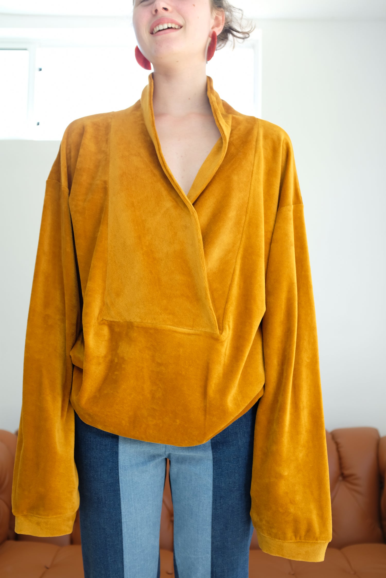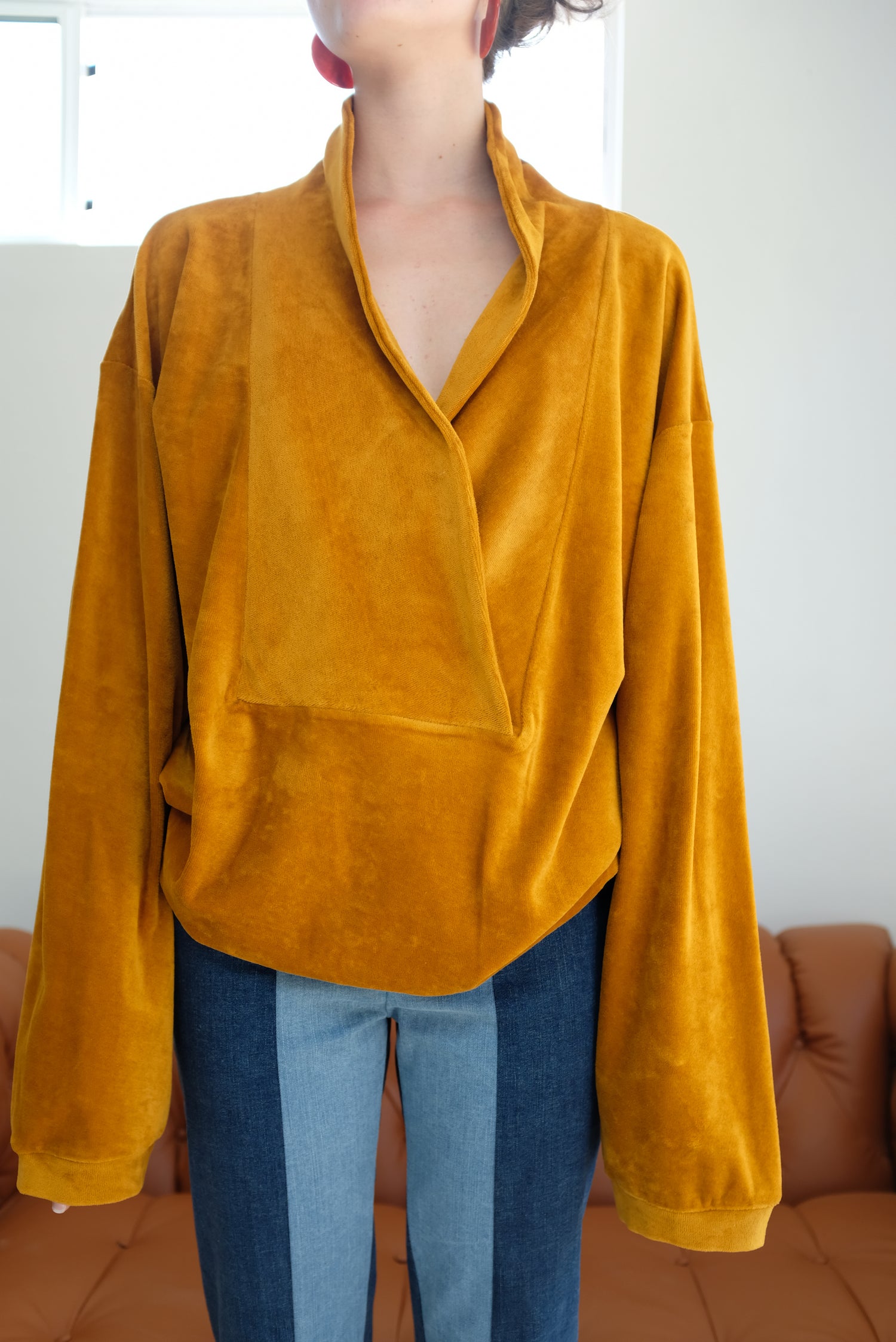 Wrap neck sweatshirt in velour. Boxy oversize shape. 100% Organic Cotton. Total length from shoulder to hem of size small is 29".