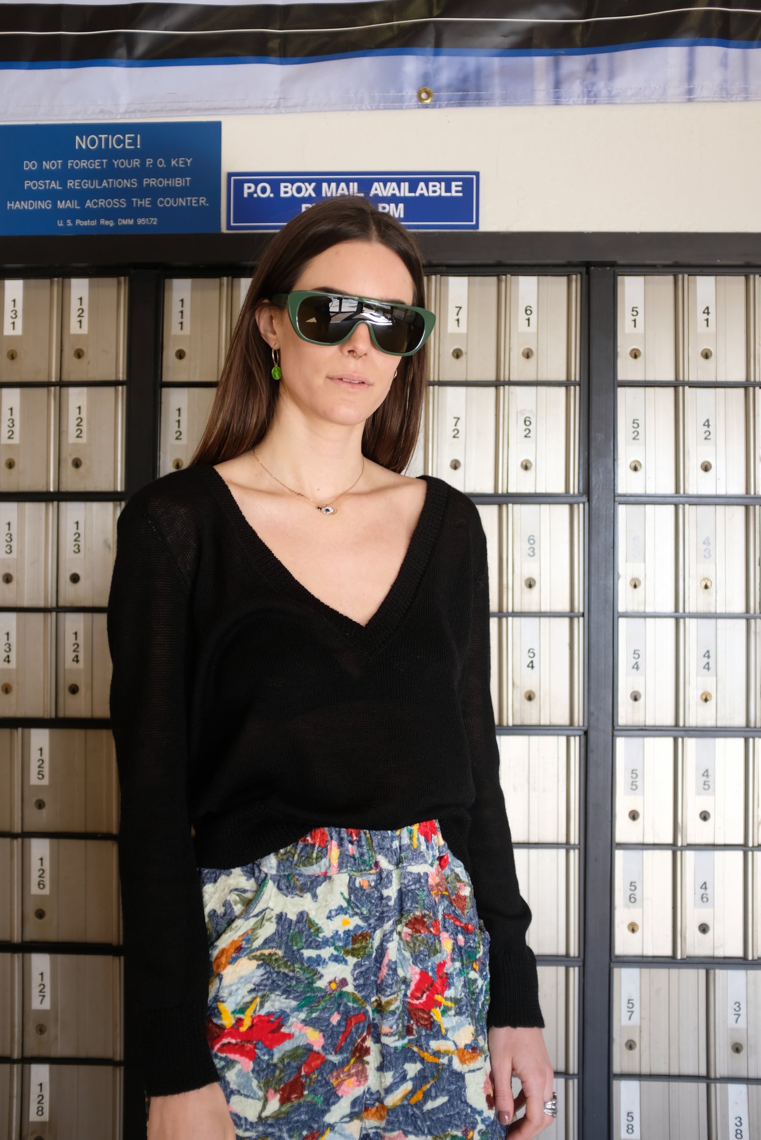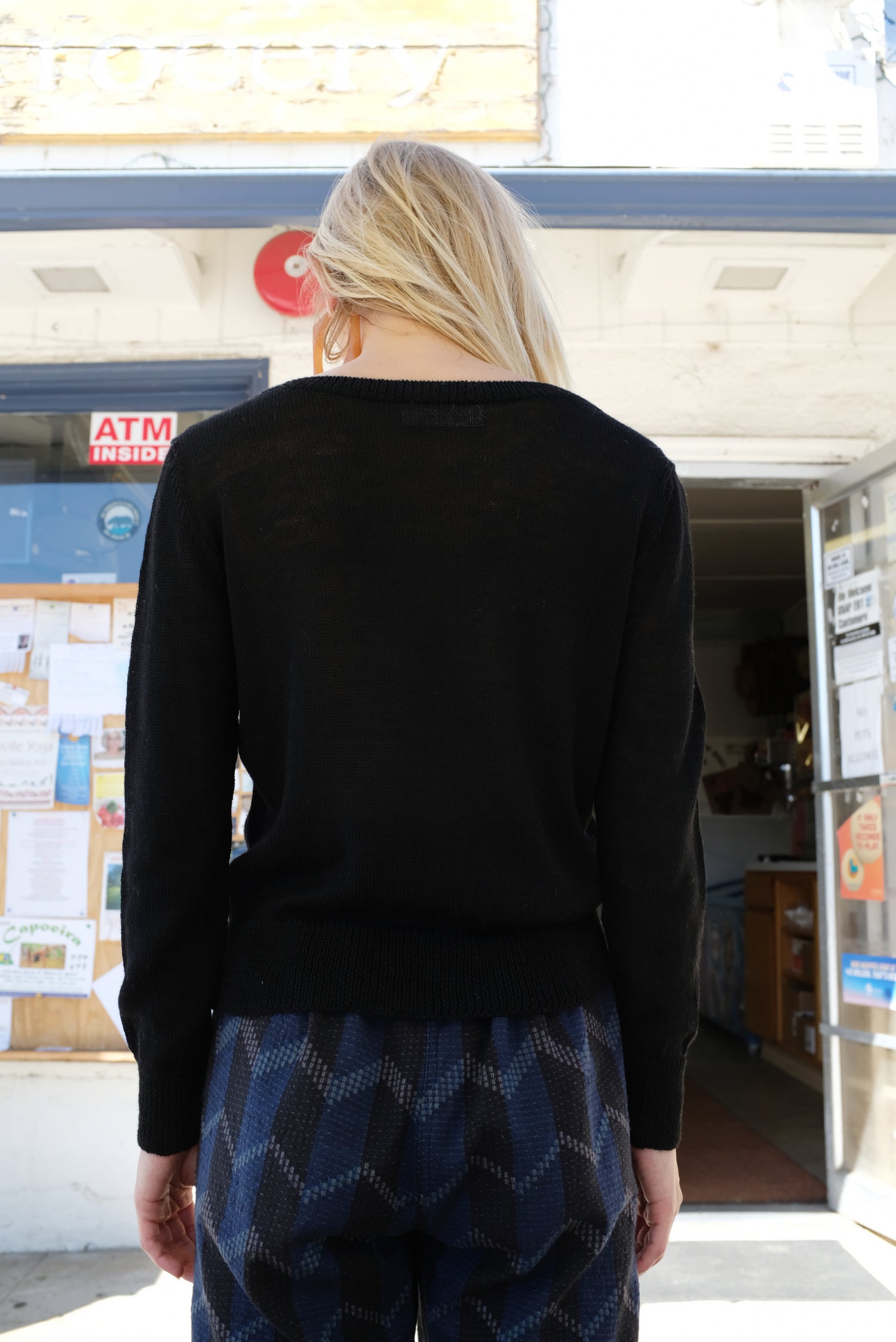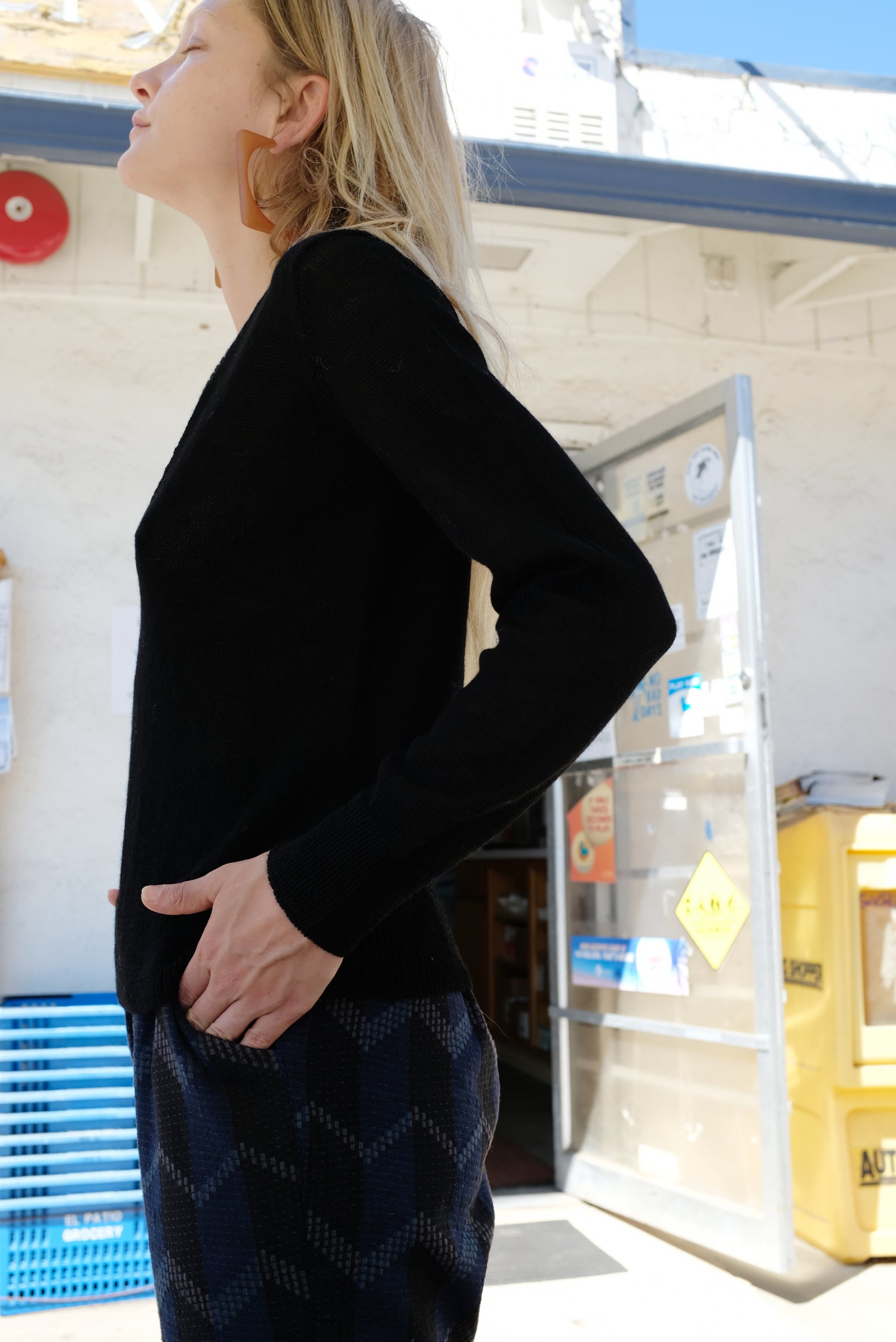 Ultra soft hand knit 100% baby alpaca. Ribbed cuff, hems and v-neck. We love these!
