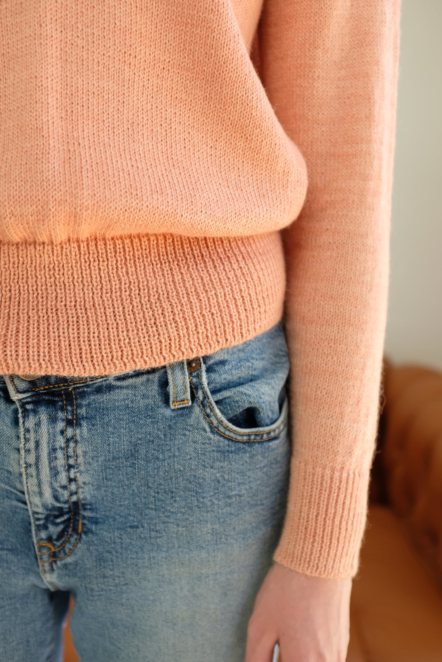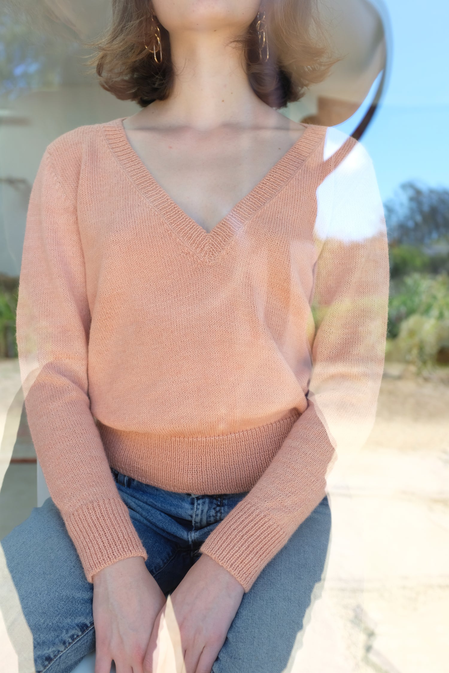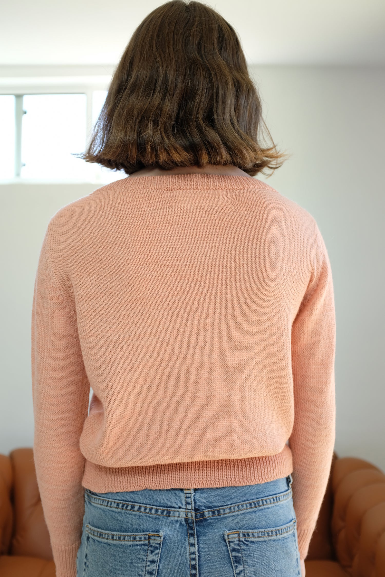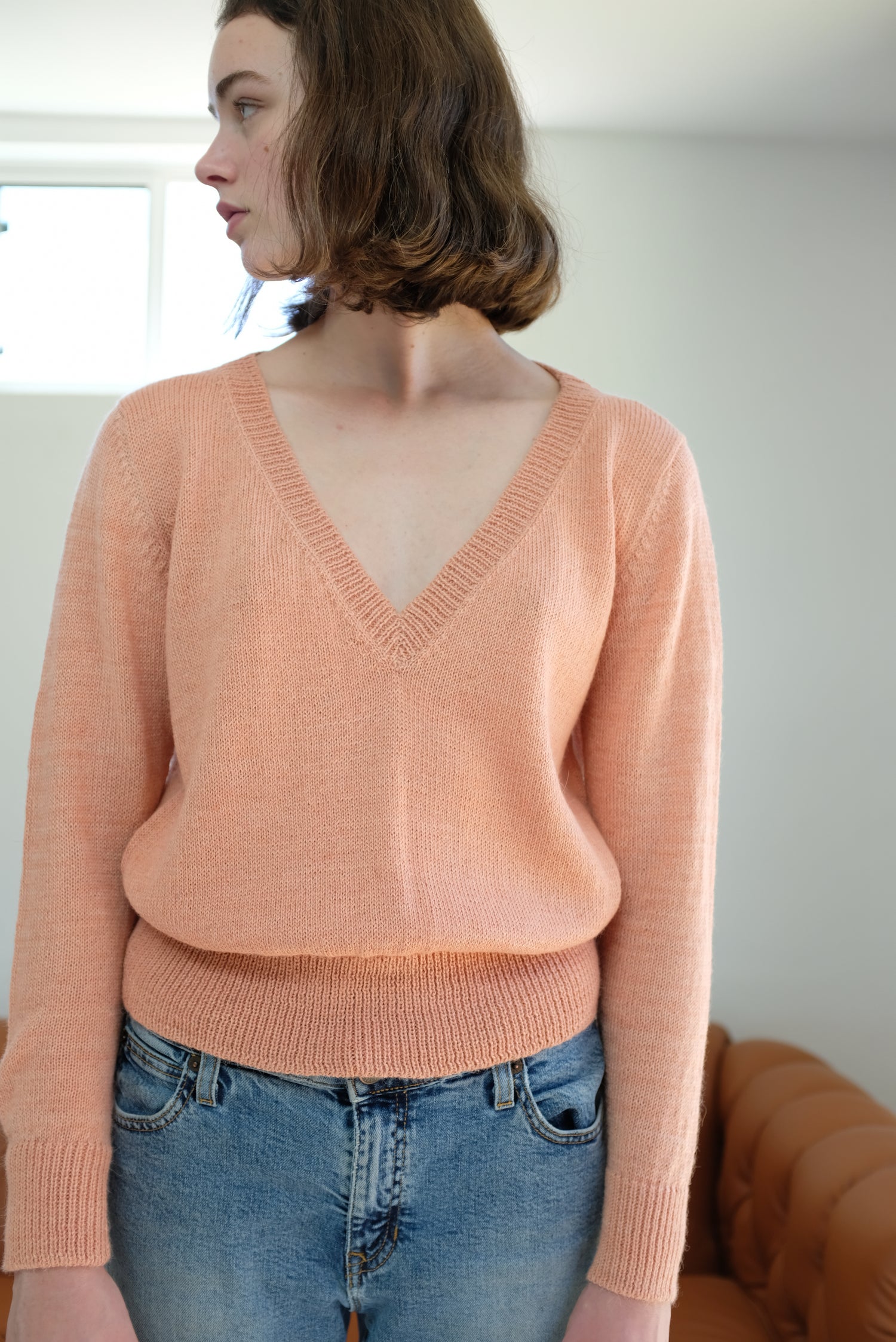 Ultra soft hand knit 100% baby alpaca. Ribbed cuff, hems and v-neck. We love these!