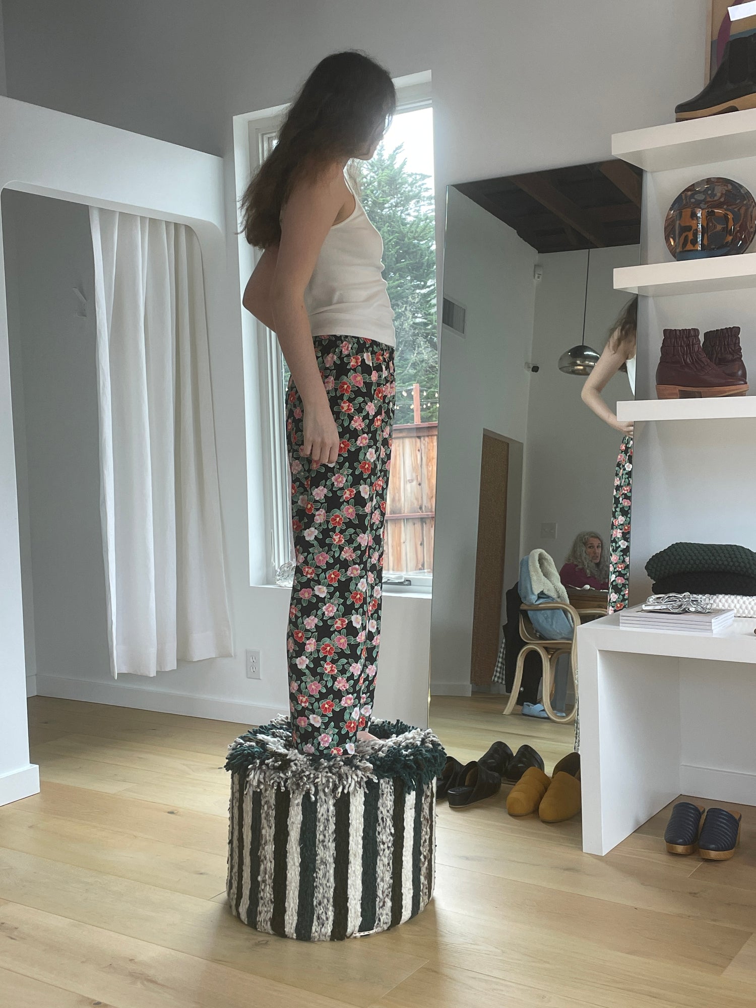 High waisted pant, elastic waist, crazy comfortable. Loose drape fit. Model is wearing a small/medium. Total length 39", Inseam 27". Running true to size. Japanese woven poly crepe fabric.