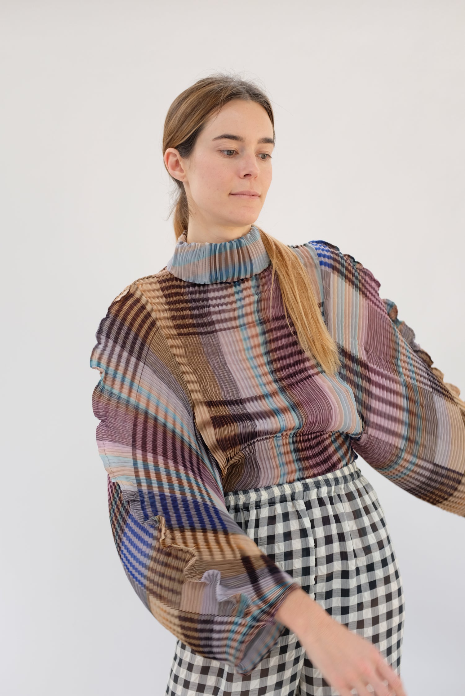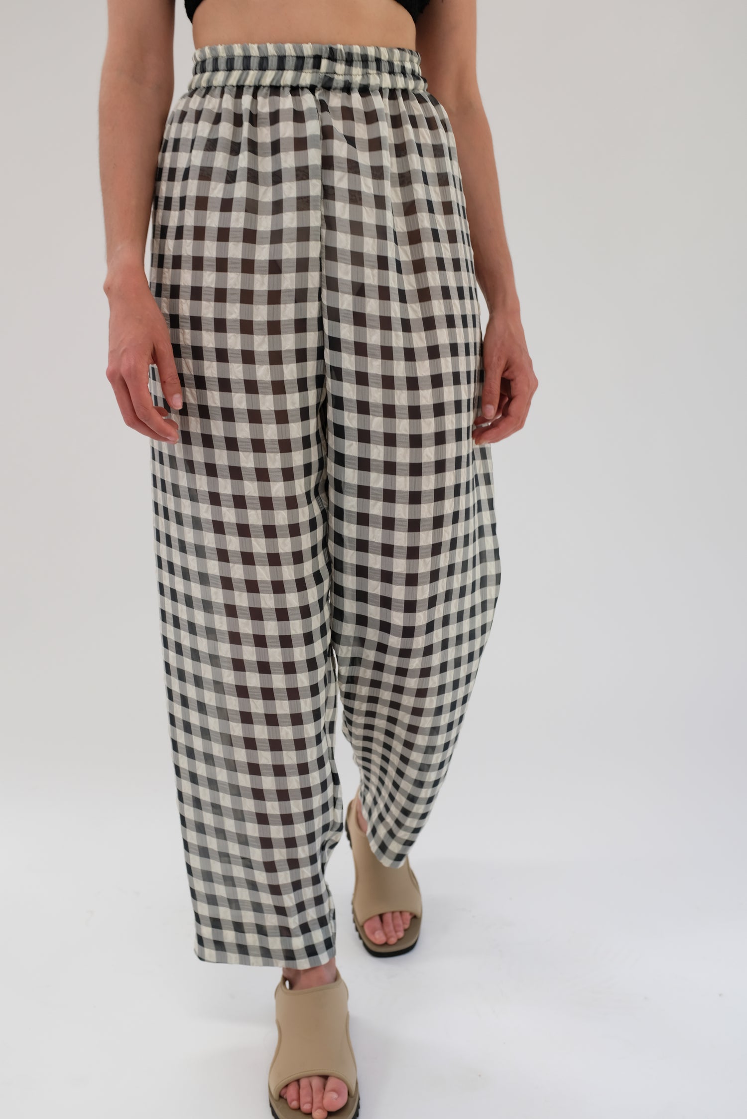 Lightweight semi-sheer high waisted pant, elastic waist, crazy comfortable. Loose drape fit. Model is wearing a small/medium. Total length 39", Inseam 27". Running true to size.