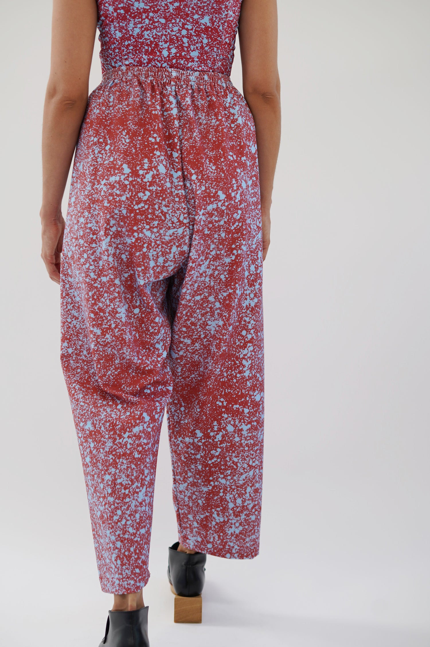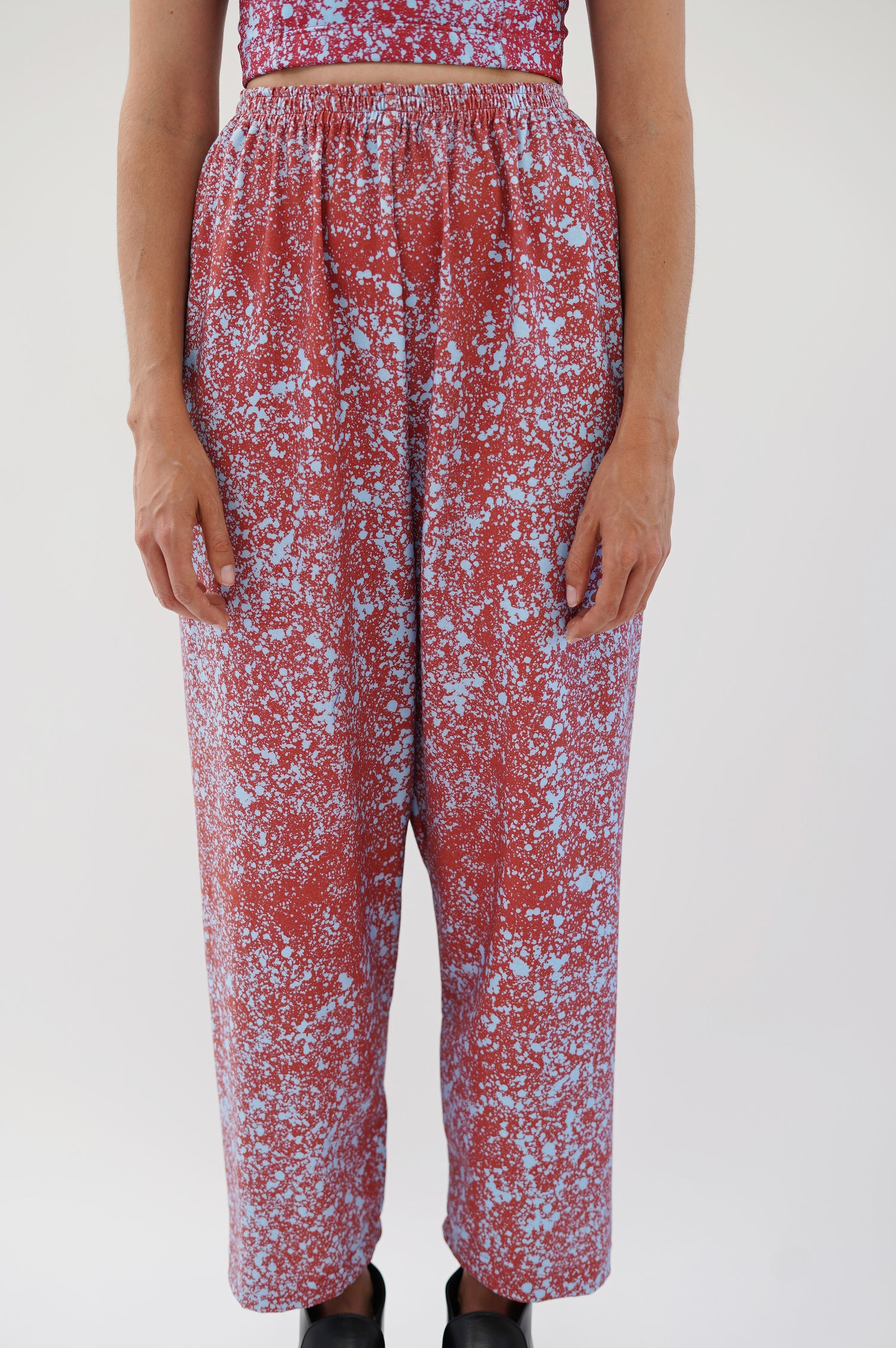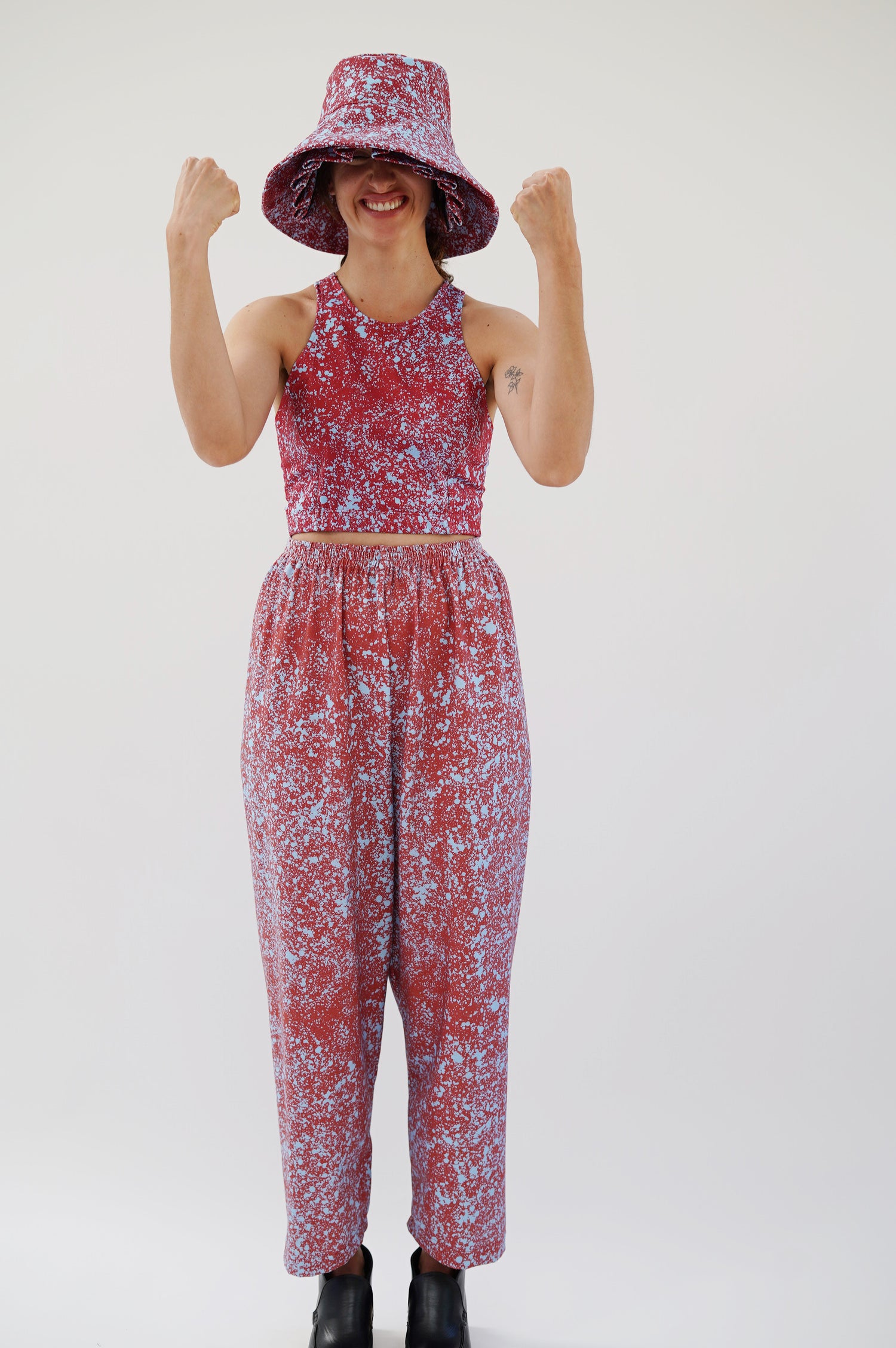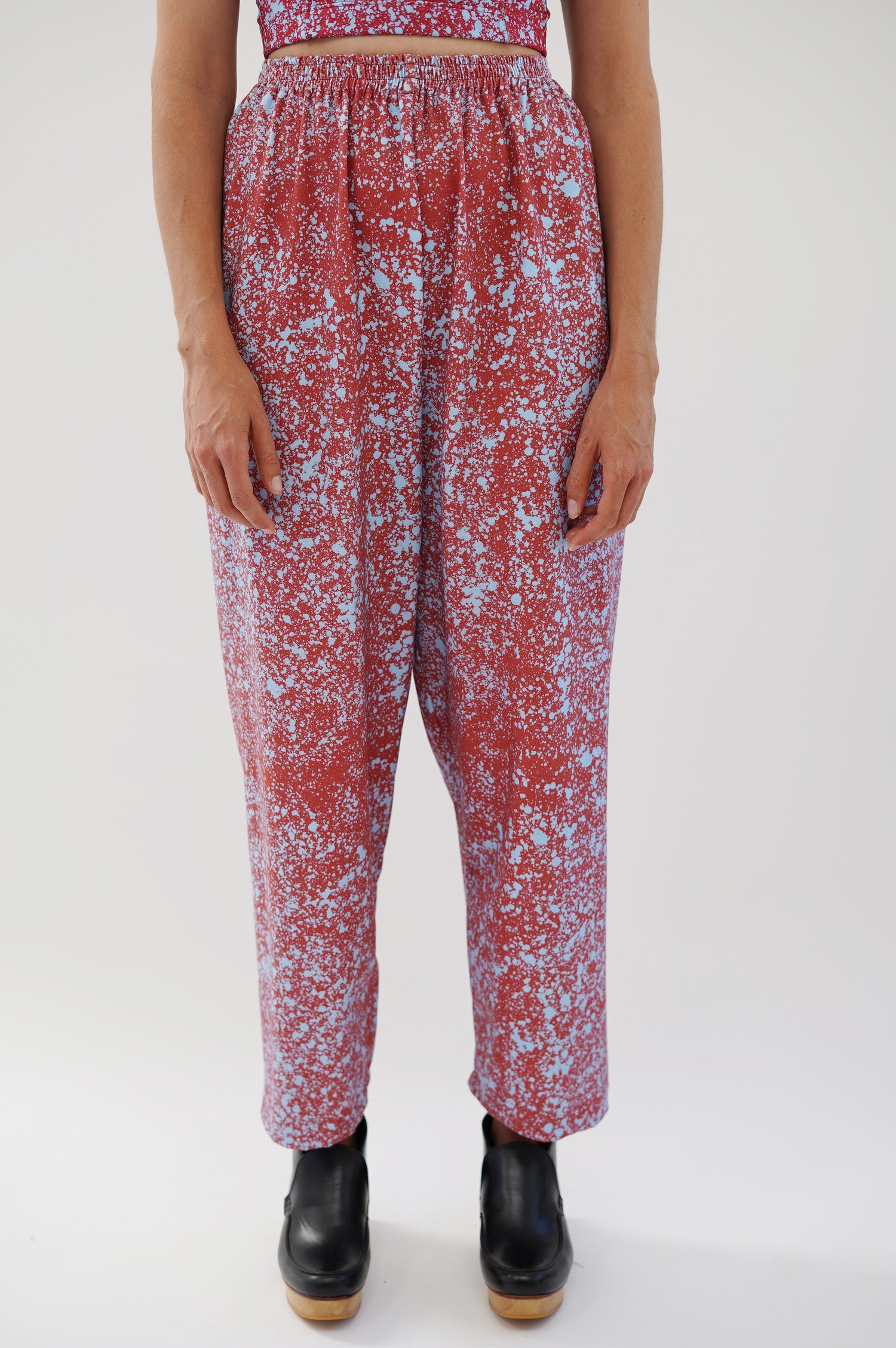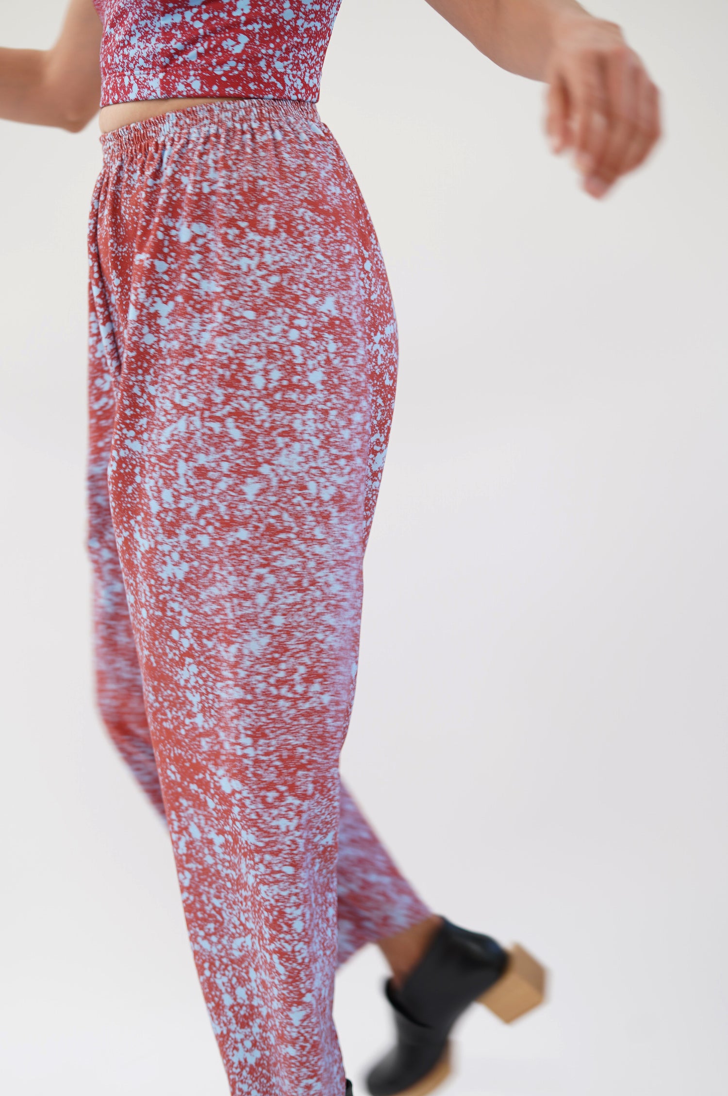 High waisted pant. Elastic waist, crazy comfortable. Loose drape fit. Model is wearing a small/medium. Total length 39", Inseam 27". 100% Japanese organic cotton jersey. Running true to size.