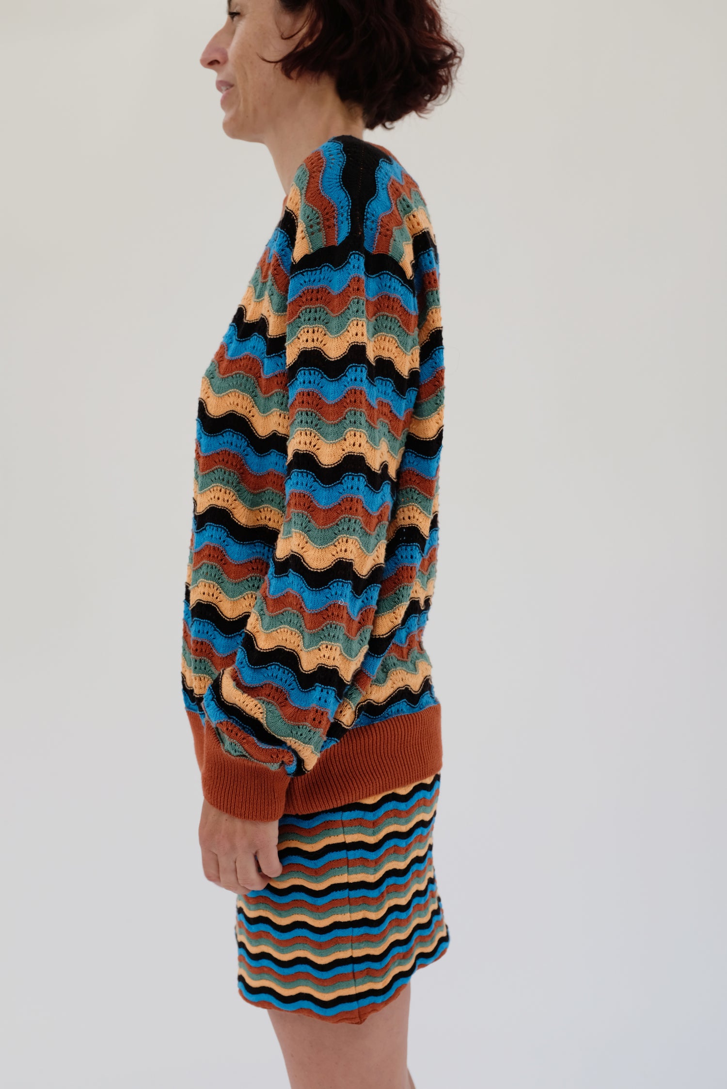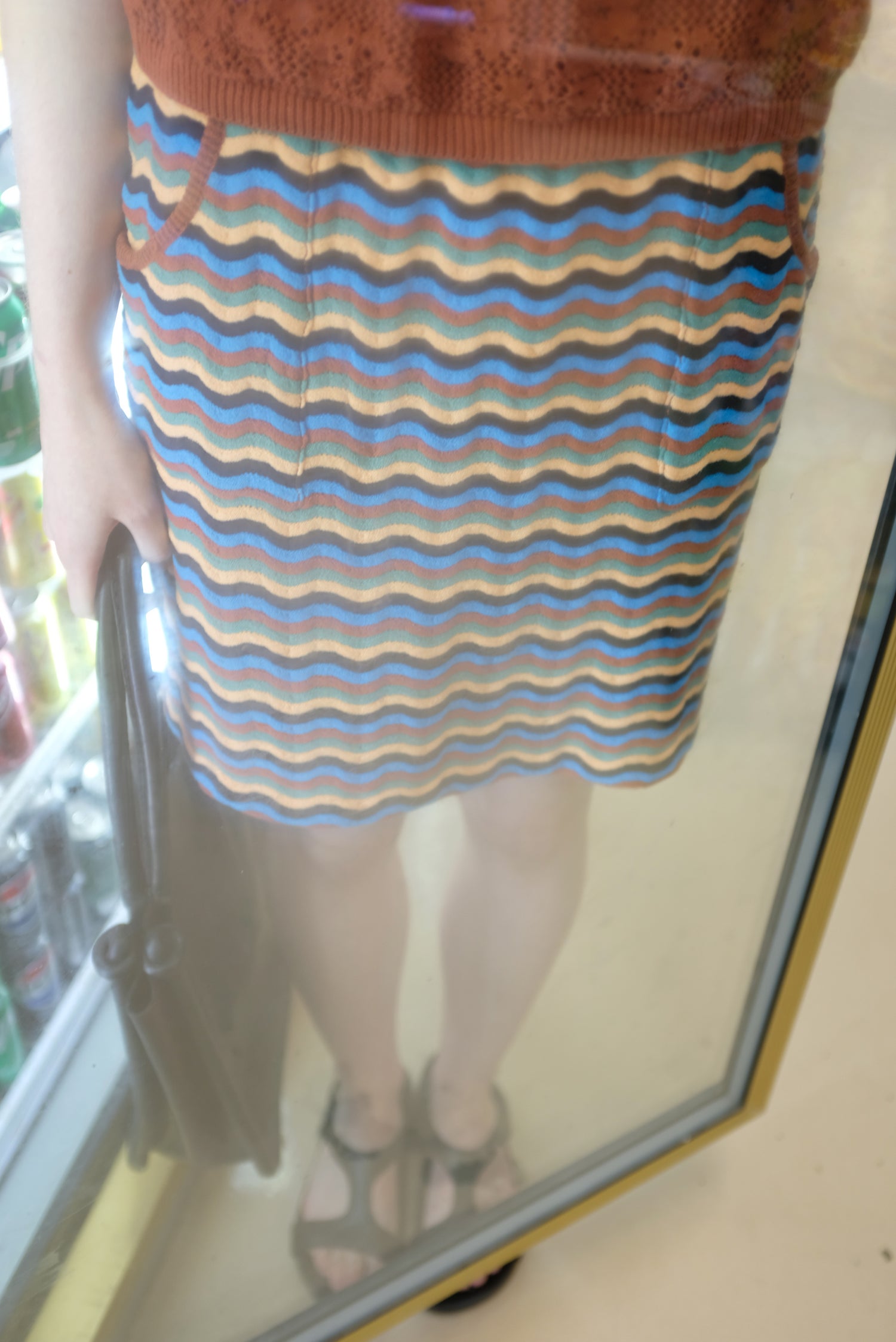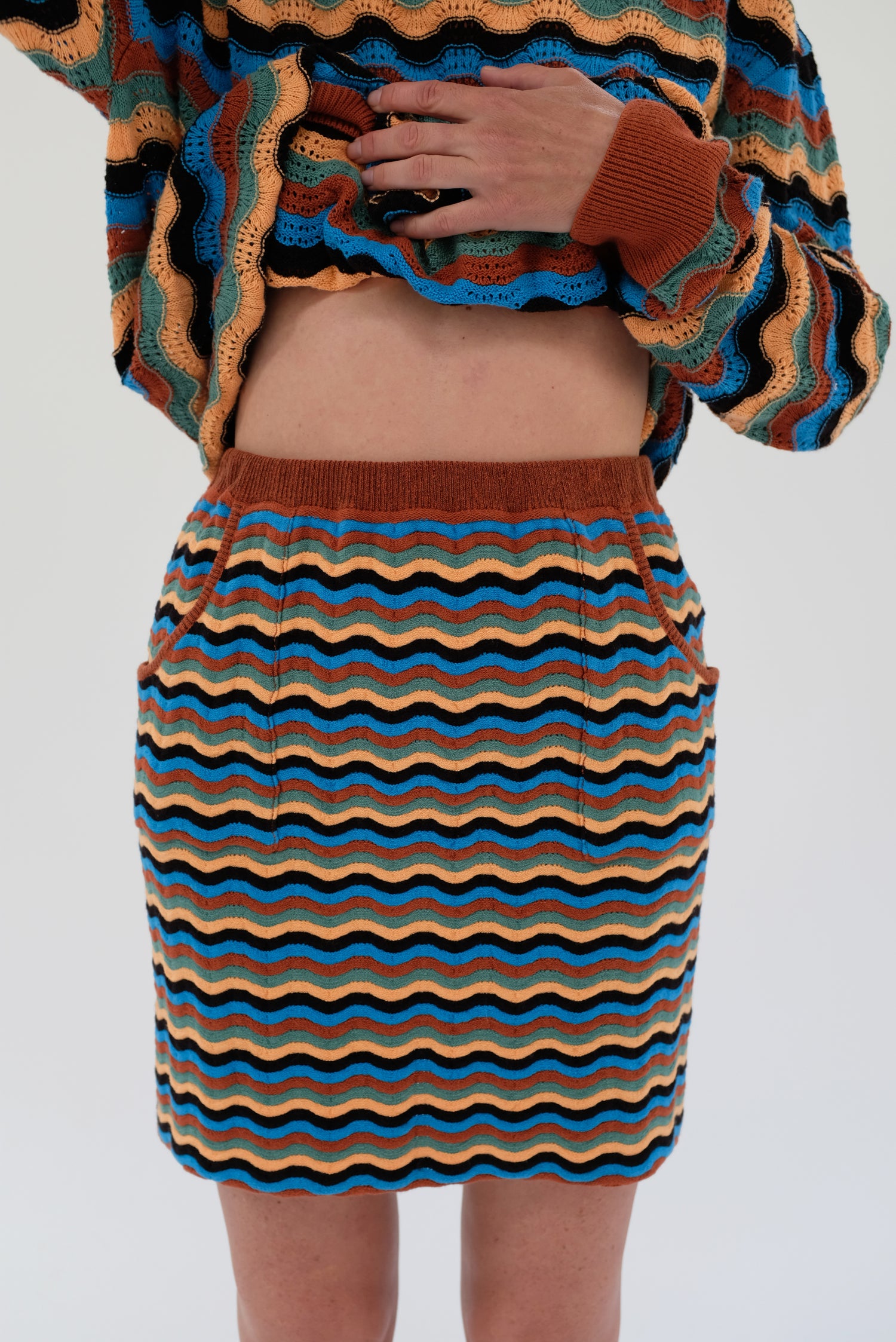 Stretchy knitted pull-on skirt, front pockets, comfy elastic waist, wear to the pool, beach or lunch. Washable 100% Peruvian cotton.