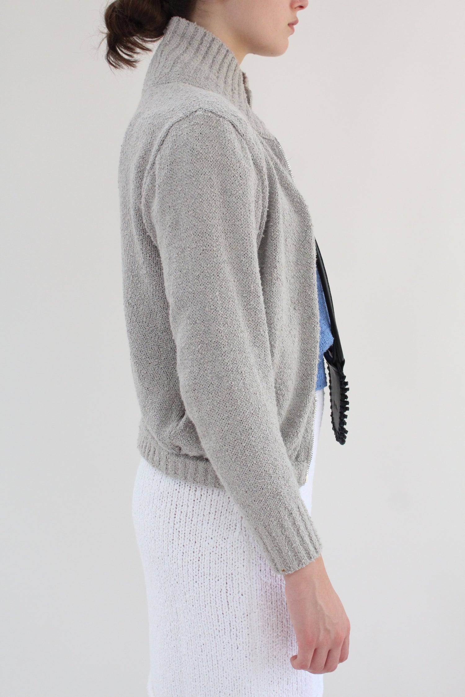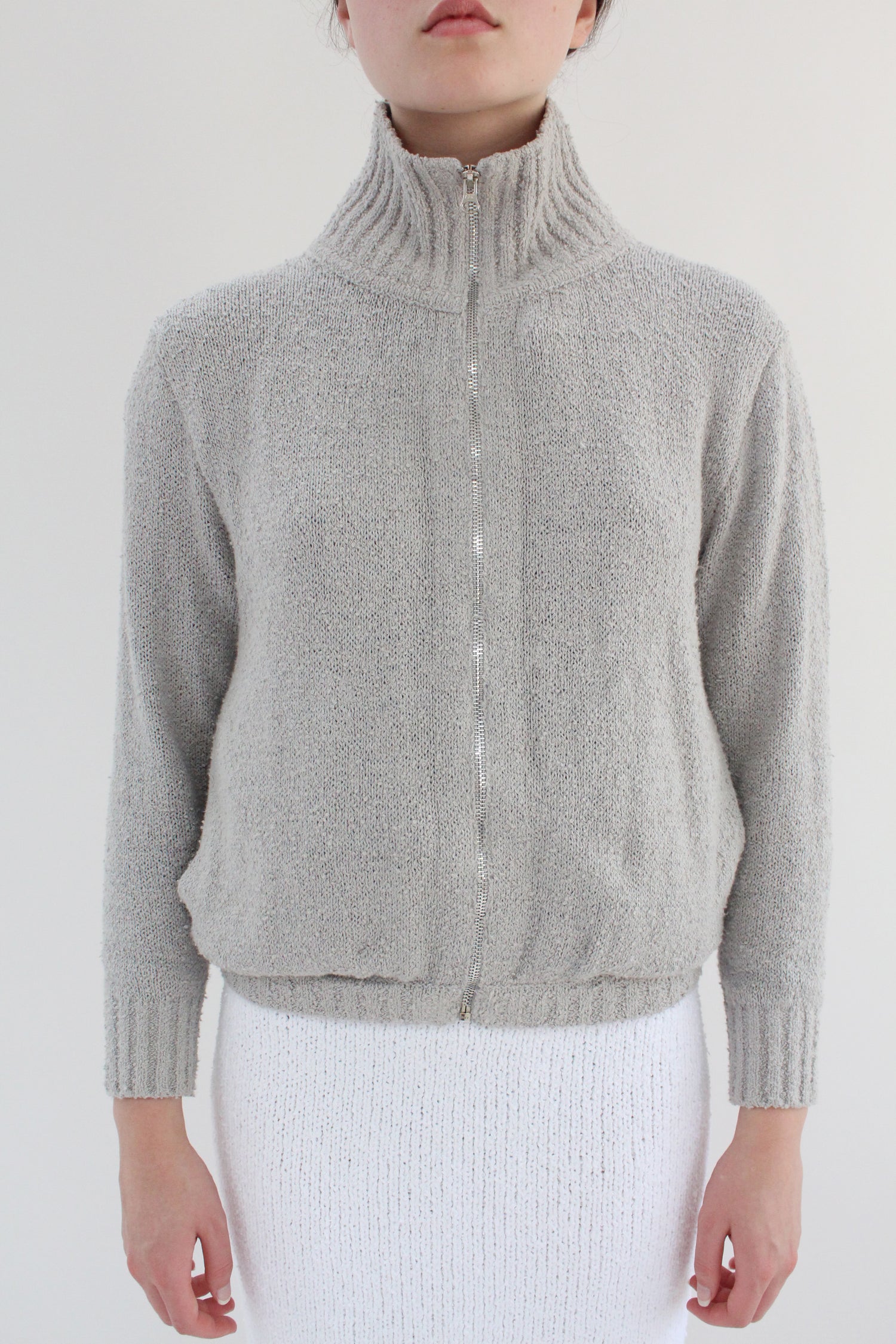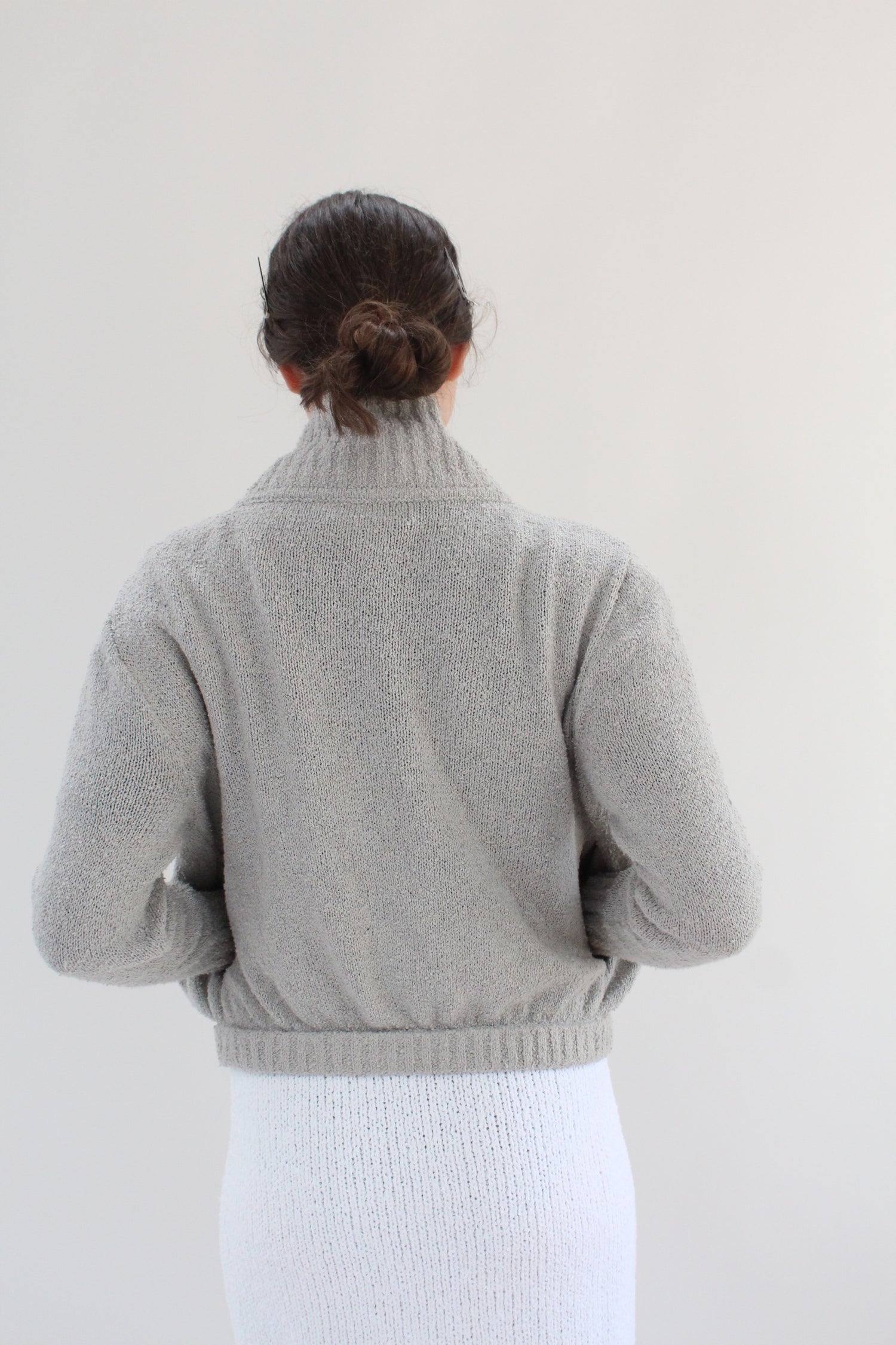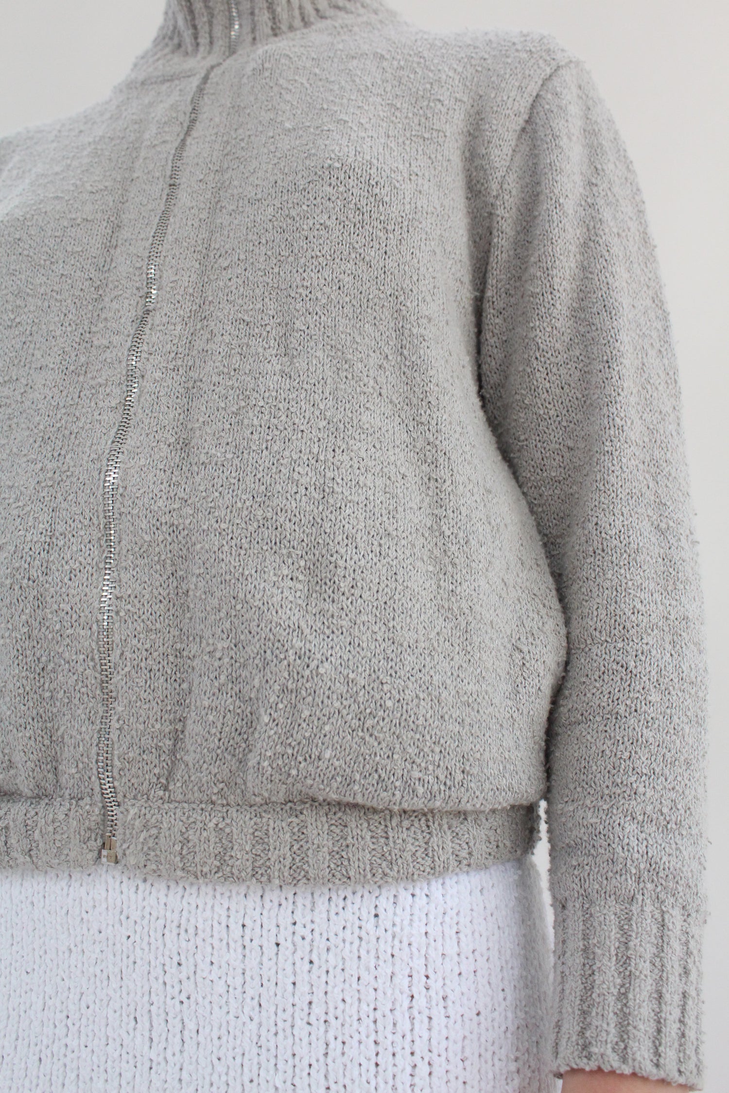 100% Bouclé cotton hand knit jacket. Luxurious cotton with an amazing texture and depth of color. Long sleeved, full zipper in front, 5" ribbed stand-up collar, 2.5” ribbed cuff at wrist, elastic waist, slim arms, side pockets.