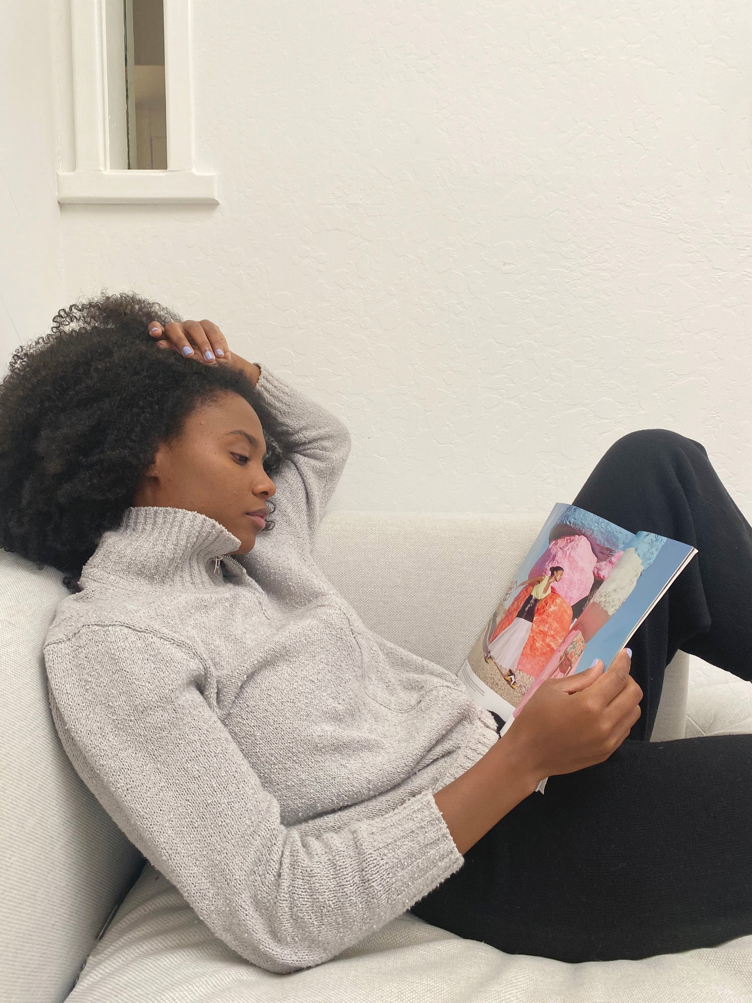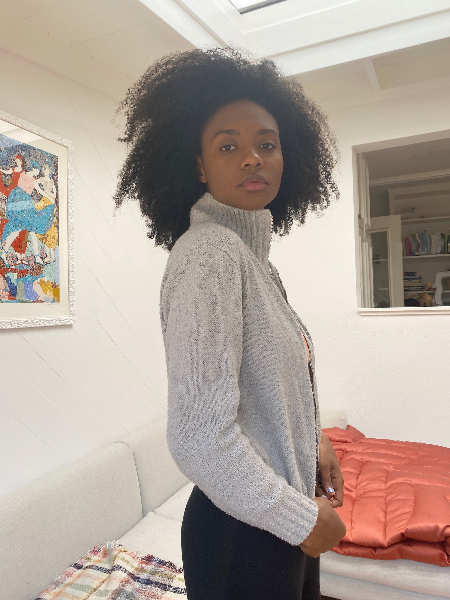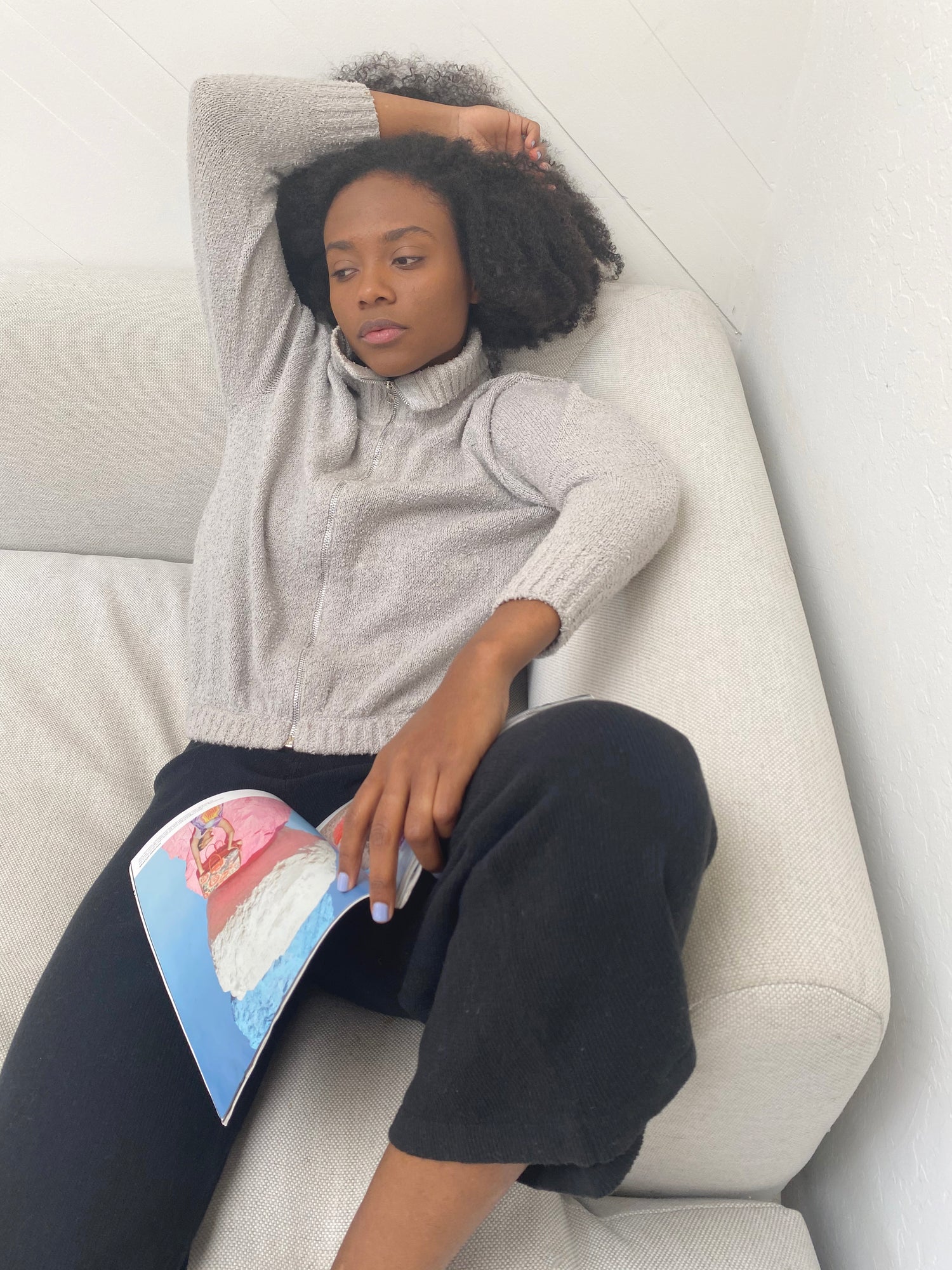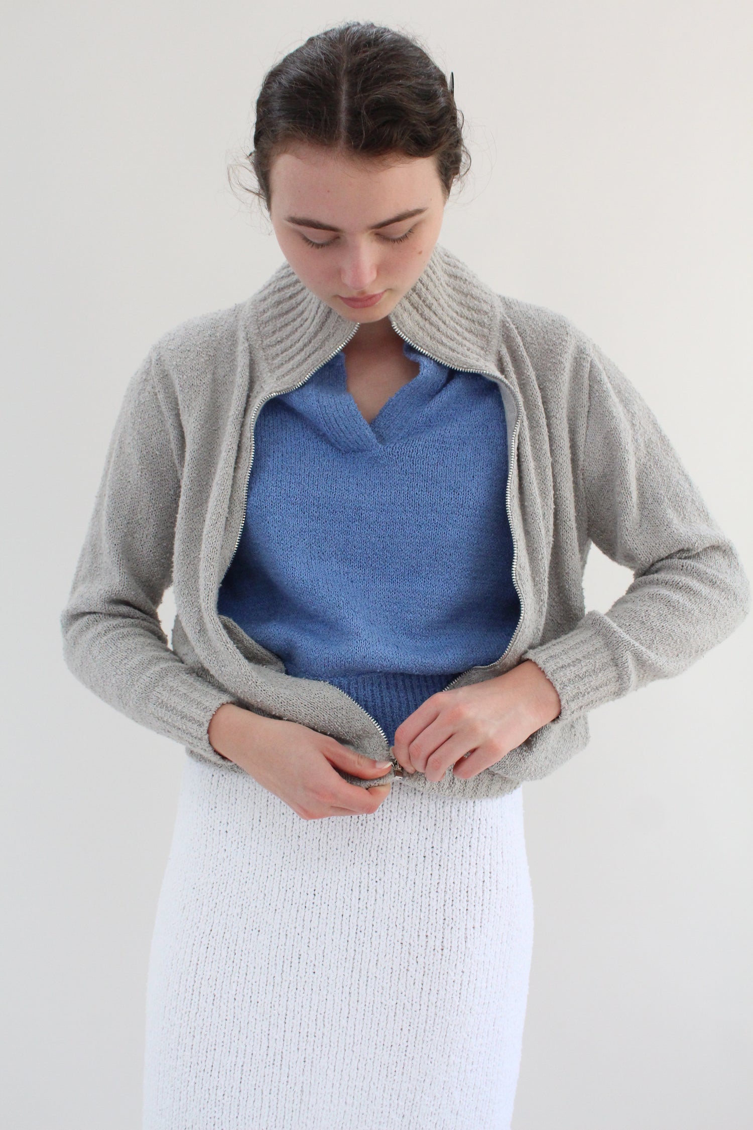 100% Bouclé cotton hand knit jacket. Luxurious cotton with an amazing texture and depth of color. Long sleeved, full zipper in front, 5" ribbed stand-up collar, 2.5” ribbed cuff at wrist, elastic waist, slim arms, side pockets.