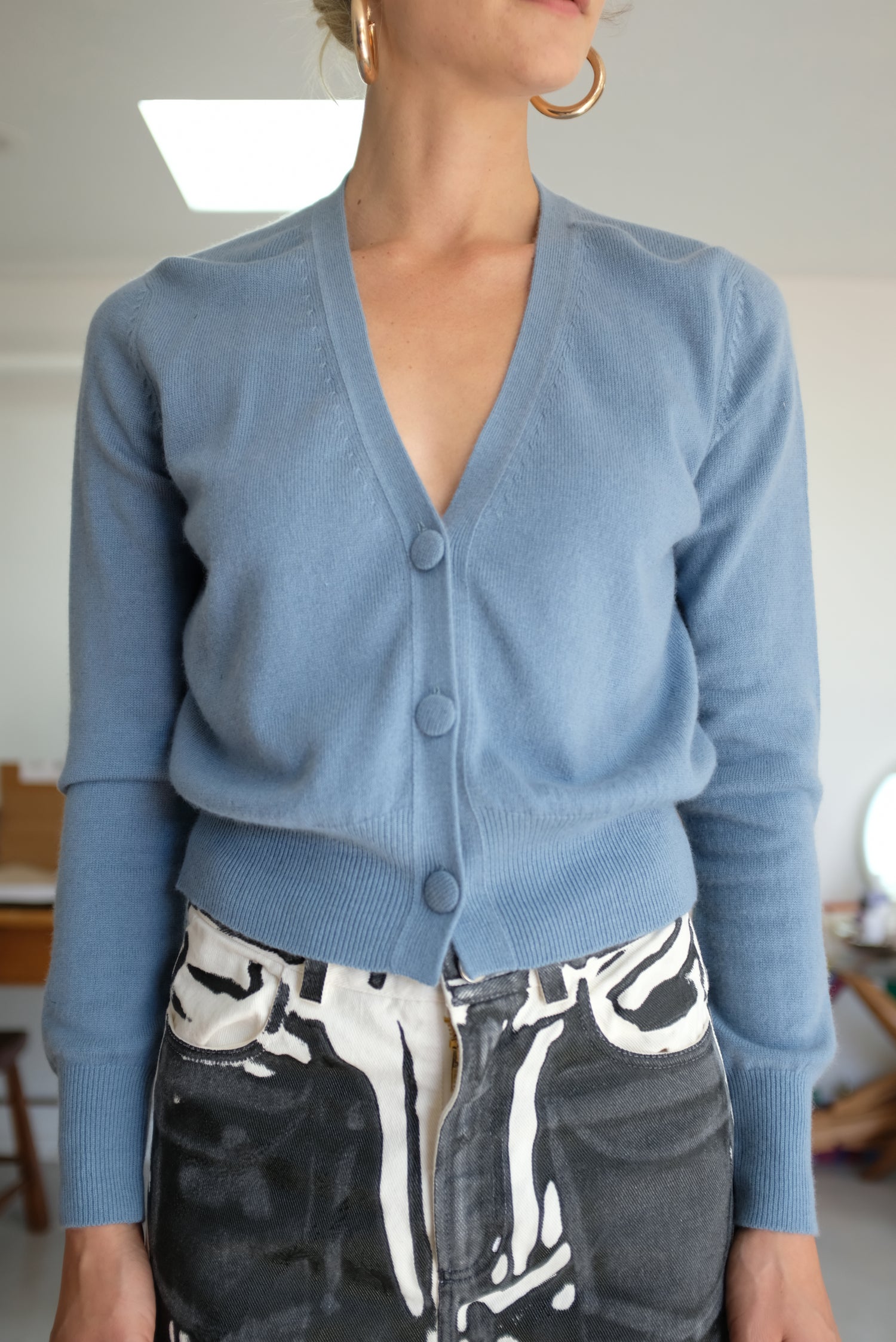 Best selling cardigan. 100% cashmere. Classic v-neck cardigan, slightly cropped, cashmere covered buttons down front. Medium weight, not sheer, wear as a layering piece or on it's own, solo. Size up for a less cropped look, and down for a more cropped look. Alexis is wearing size small/medium. Exclusive to Beklina.