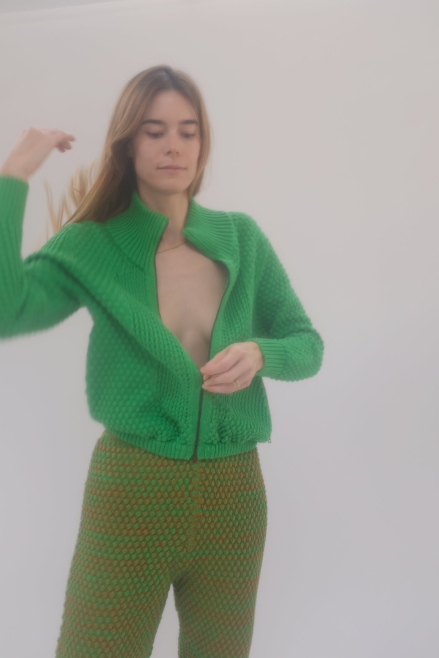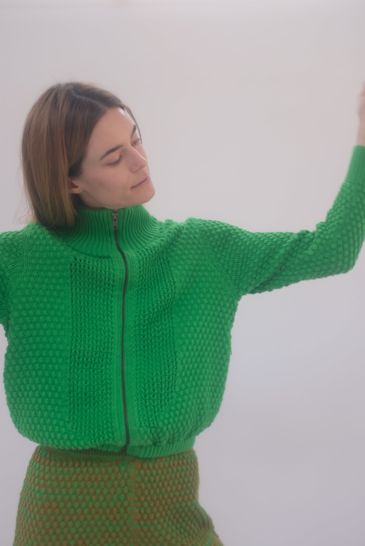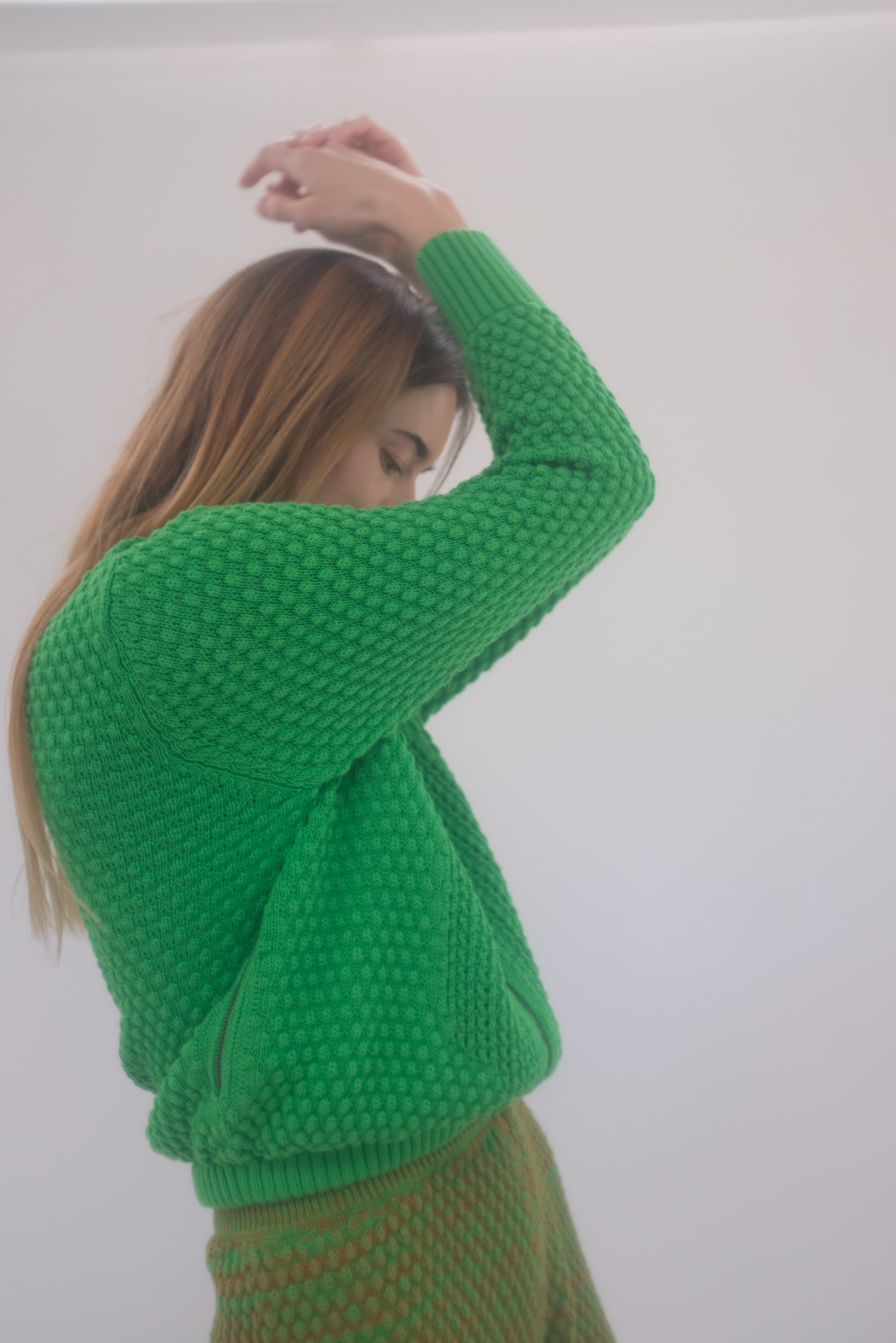 Gorgeous hand knit jacket, with a unique pattern and texture, medium weight. Long sleeved, full zipper in front, 4"ribbed stand-up collar, 3” ribbing at cuff, soft elastic at waist, slim arms, side pockets with zippered closure. Washable, luxurious cotton yarn. 100% Pima cotton. Exclusive to Beklina.