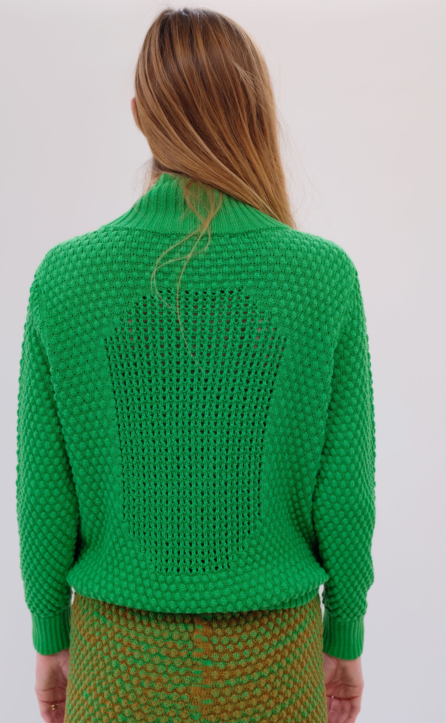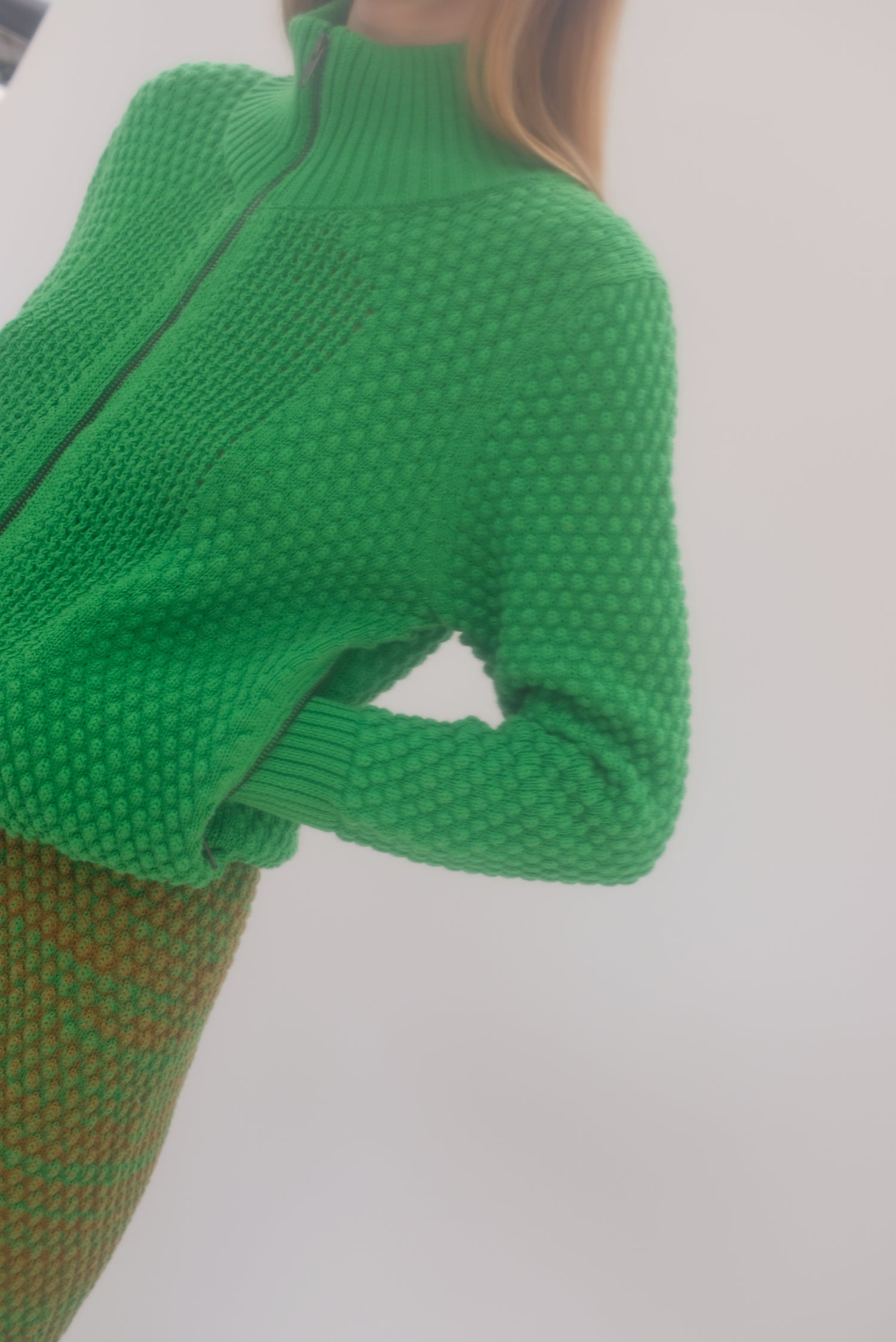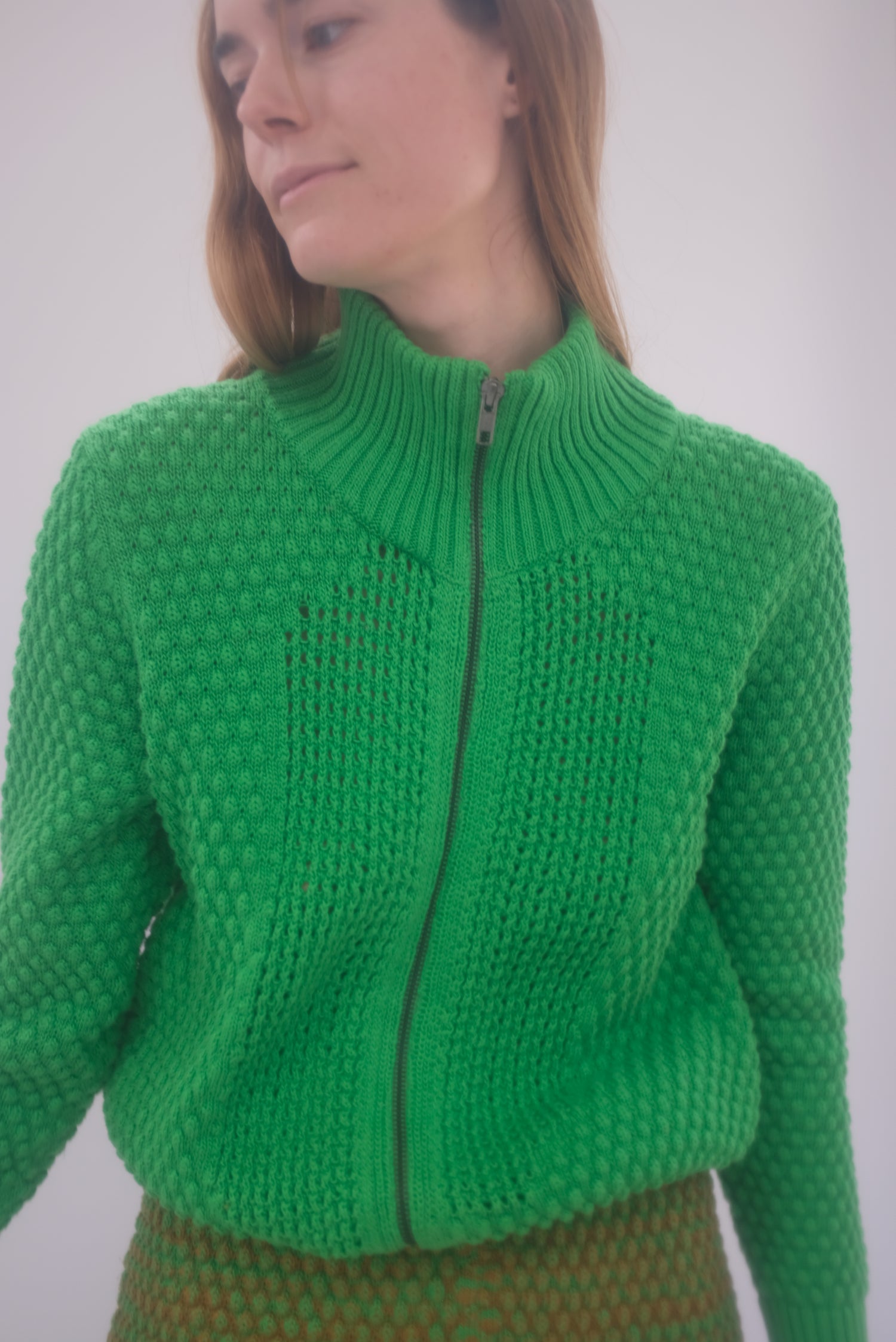 Gorgeous hand knit jacket, with a unique pattern and texture, medium weight. Long sleeved, full zipper in front, 4"ribbed stand-up collar, 3” ribbing at cuff, soft elastic at waist, slim arms, side pockets with zippered closure. Washable, luxurious cotton yarn. 100% Pima cotton. Exclusive to Beklina.