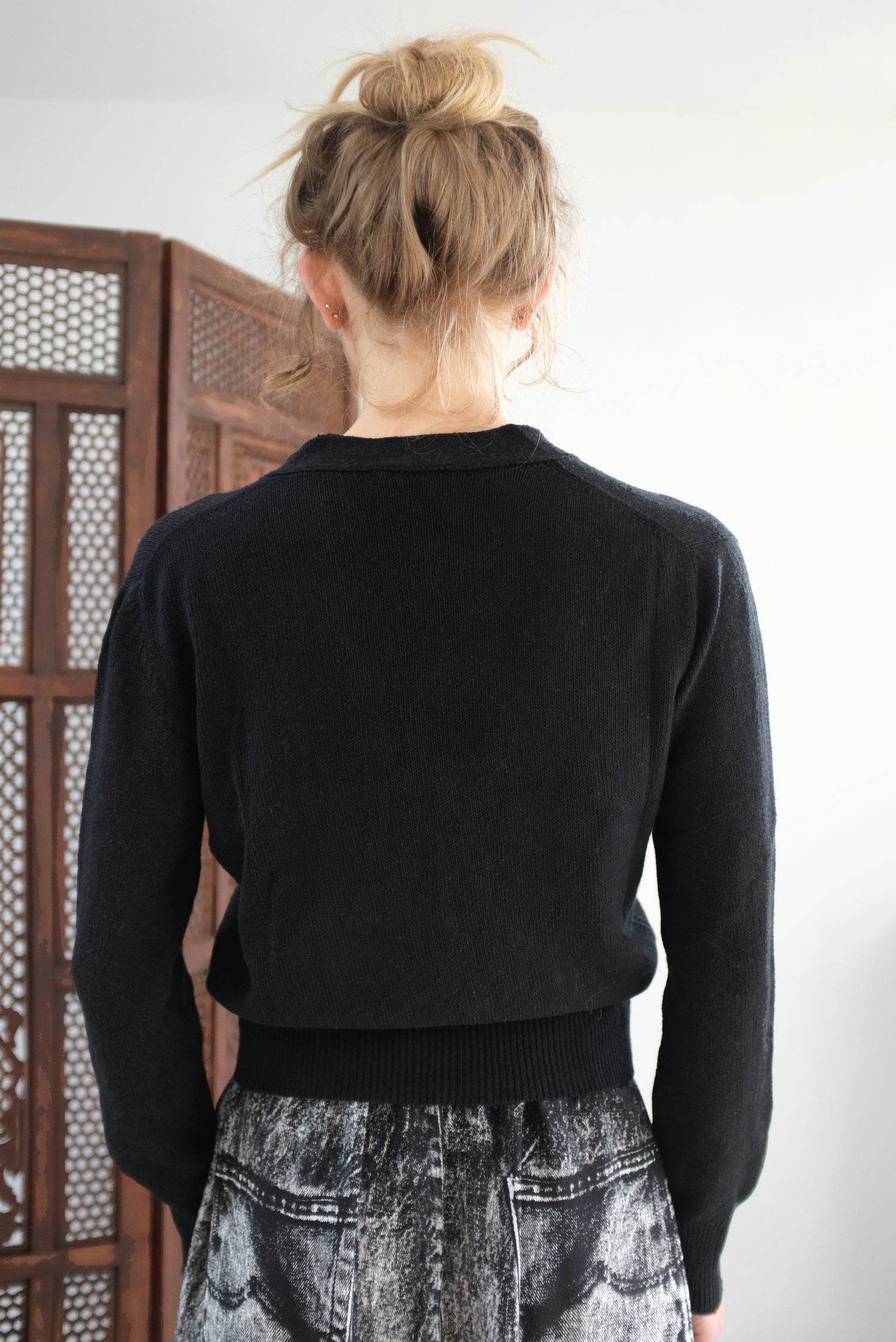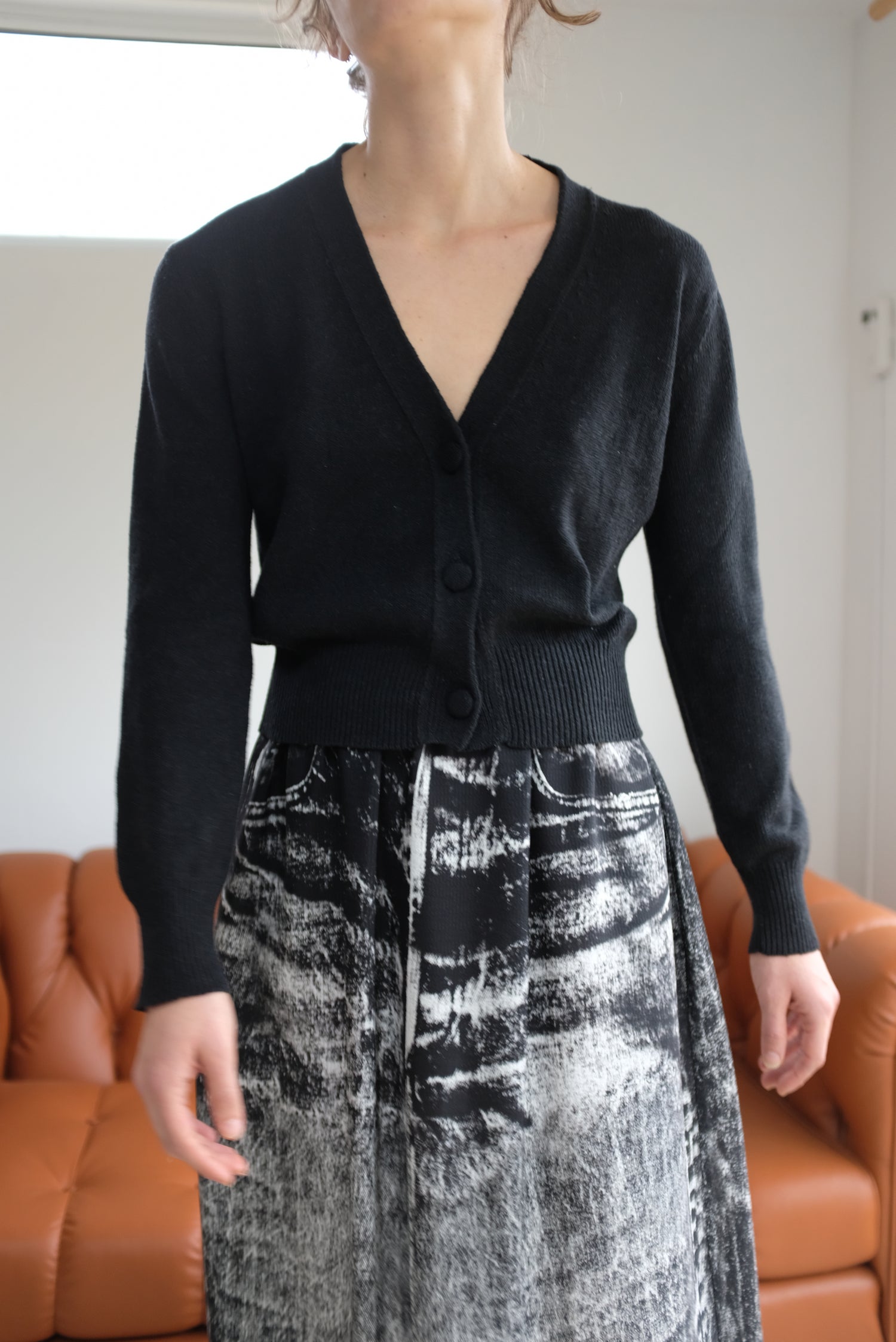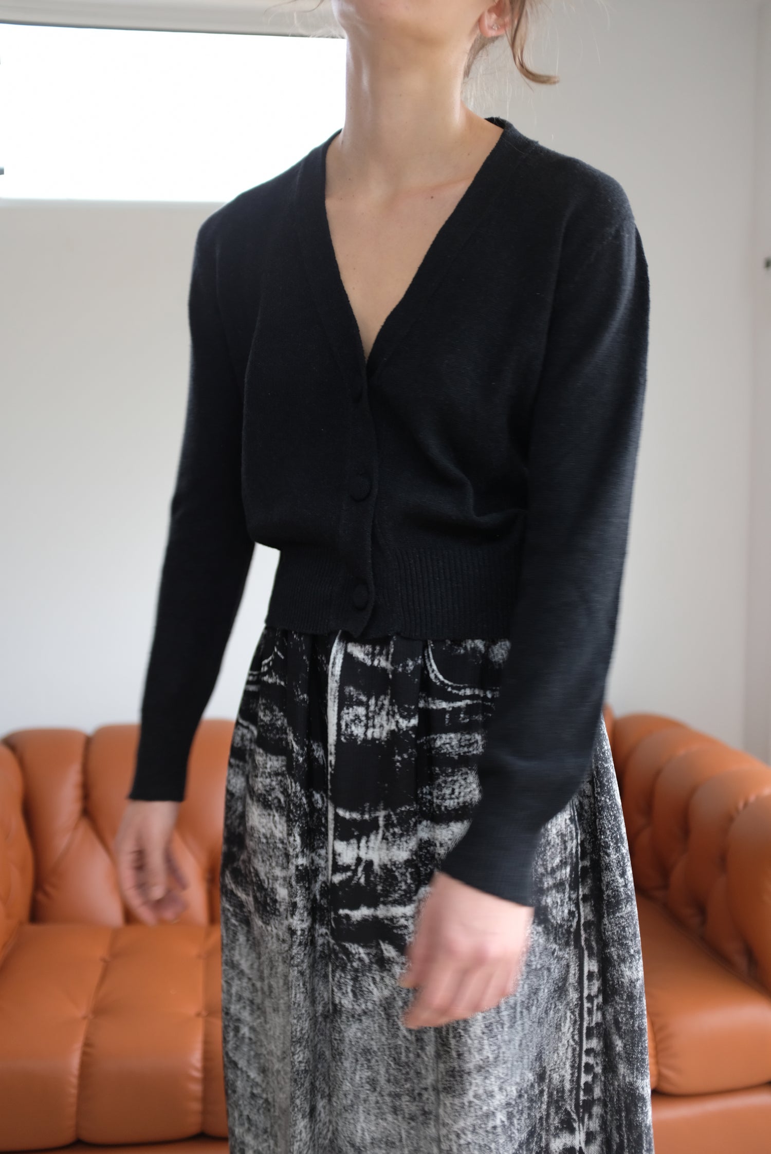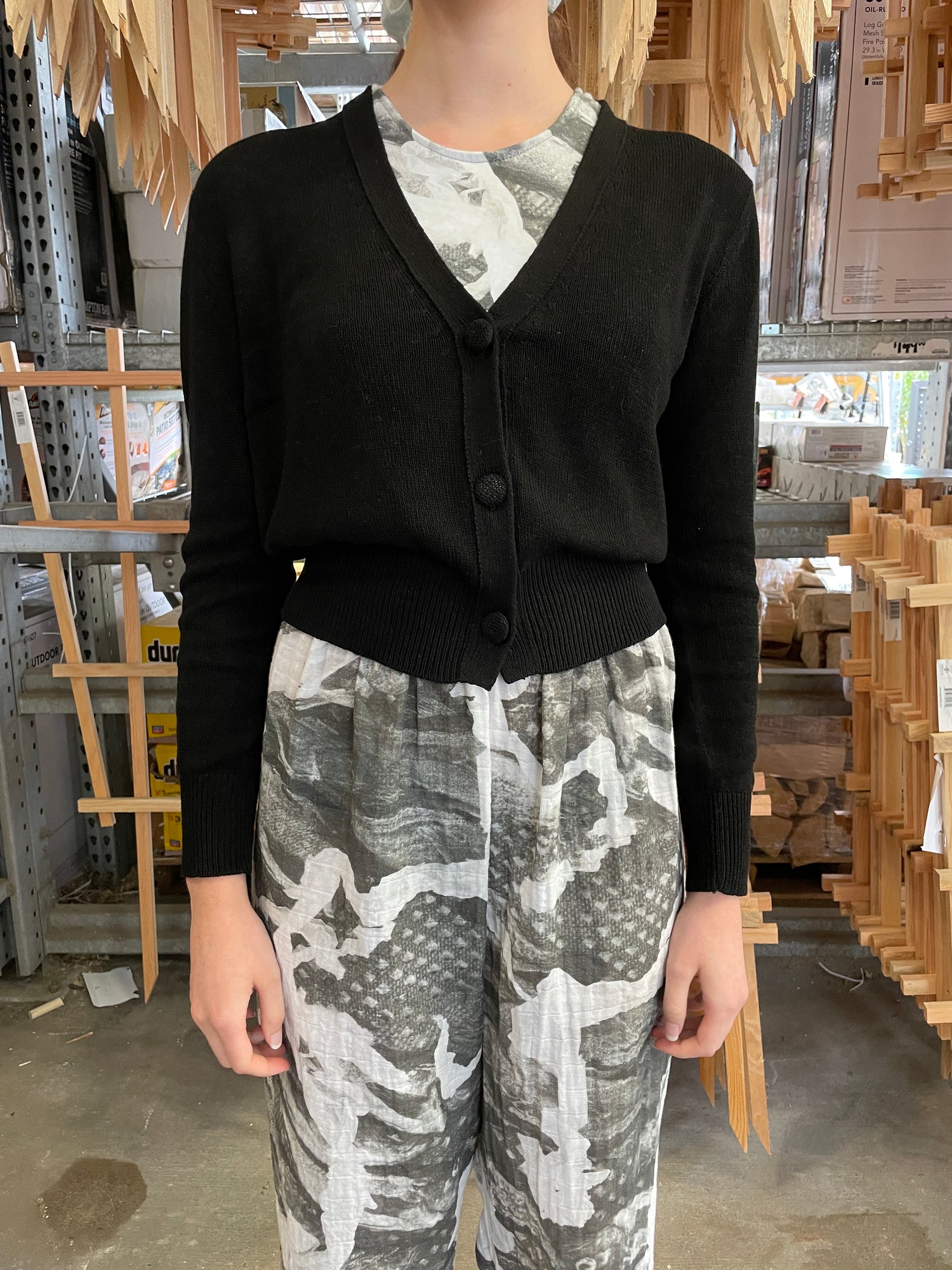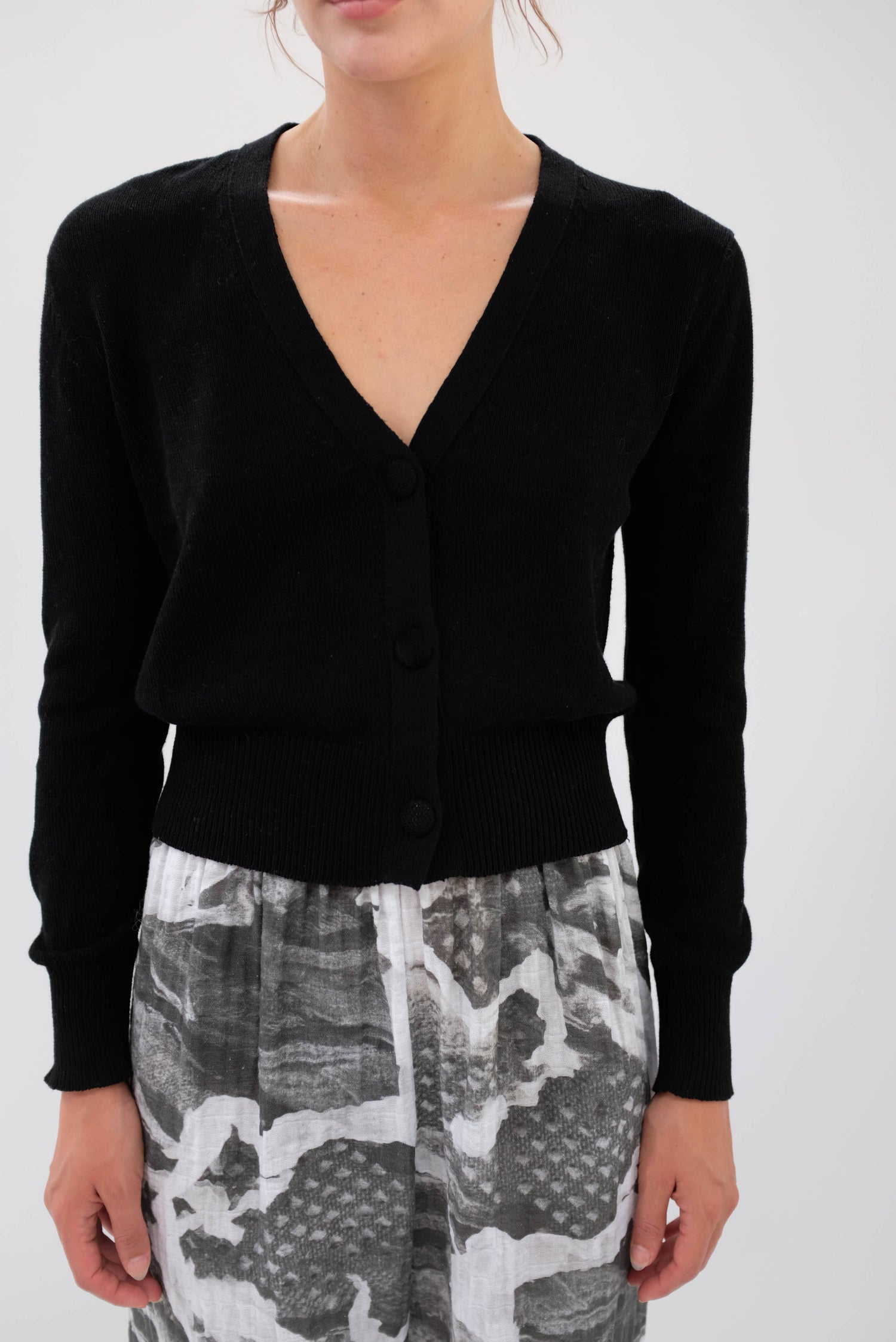 100% Organic cotton knit, long sleeved, classic v-neck cardigan, fabric covered buttons down front. Medium weight, not sheer, soft cotton, wear as a layering piece or on it's own, solo.