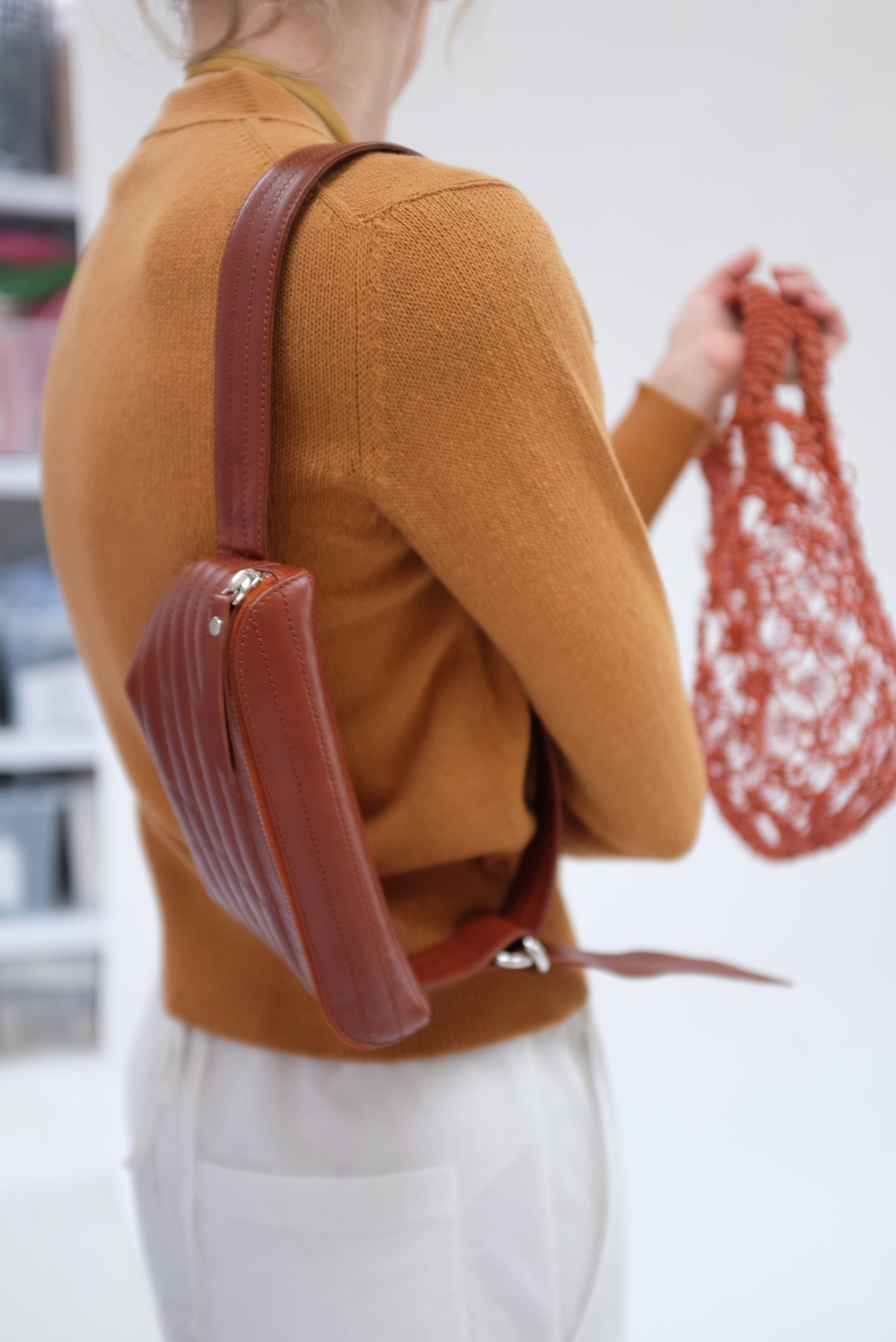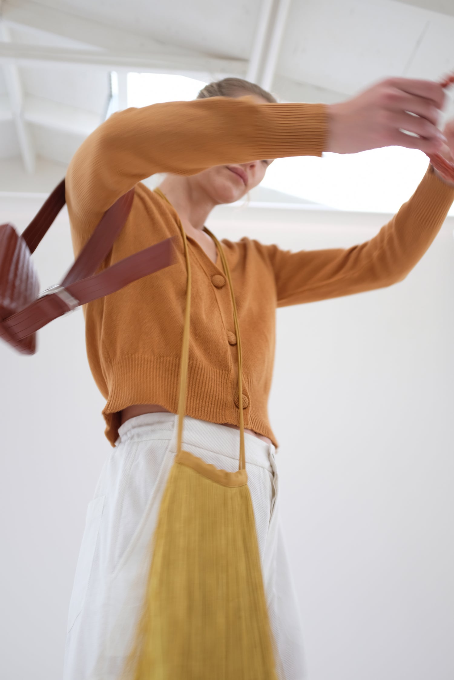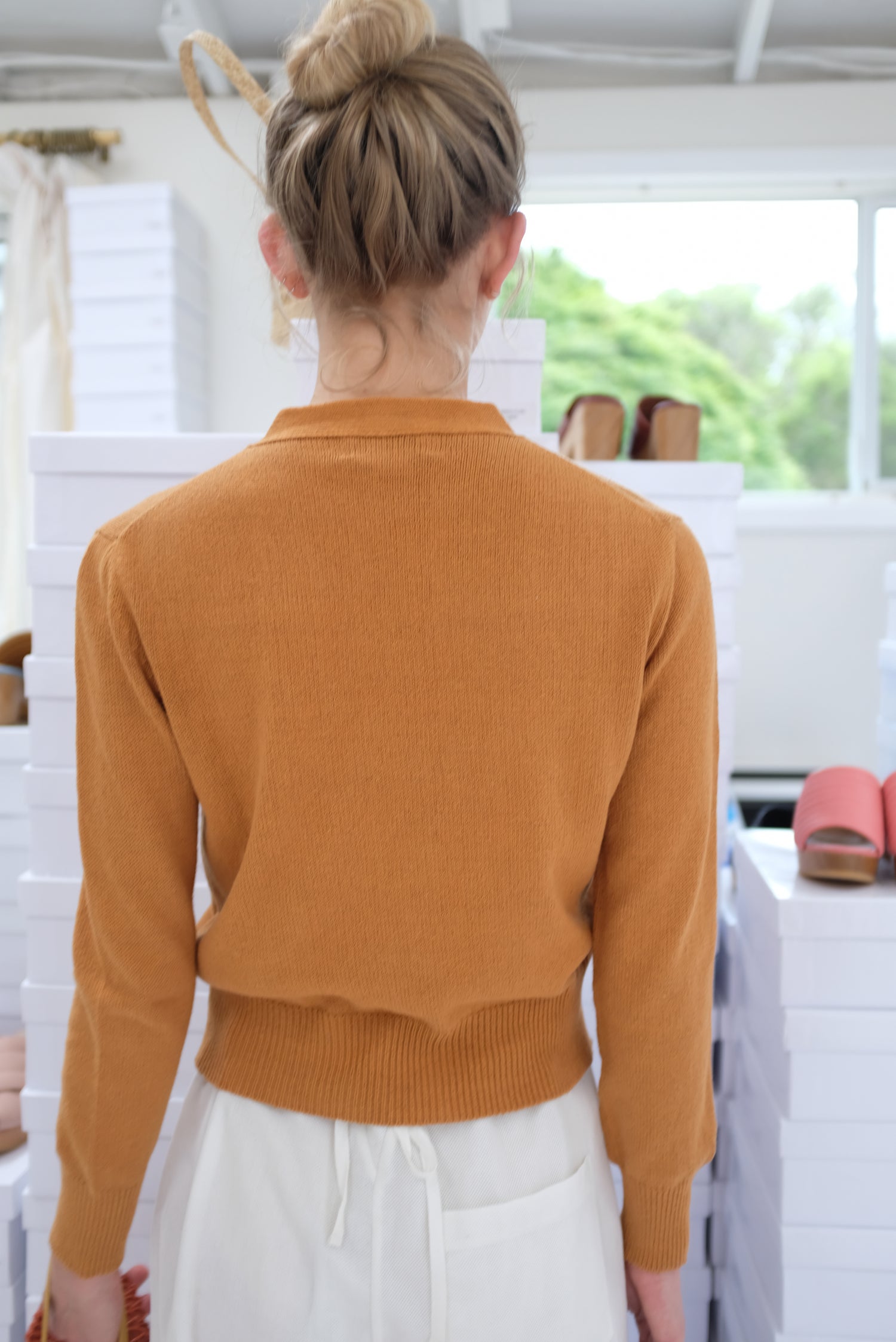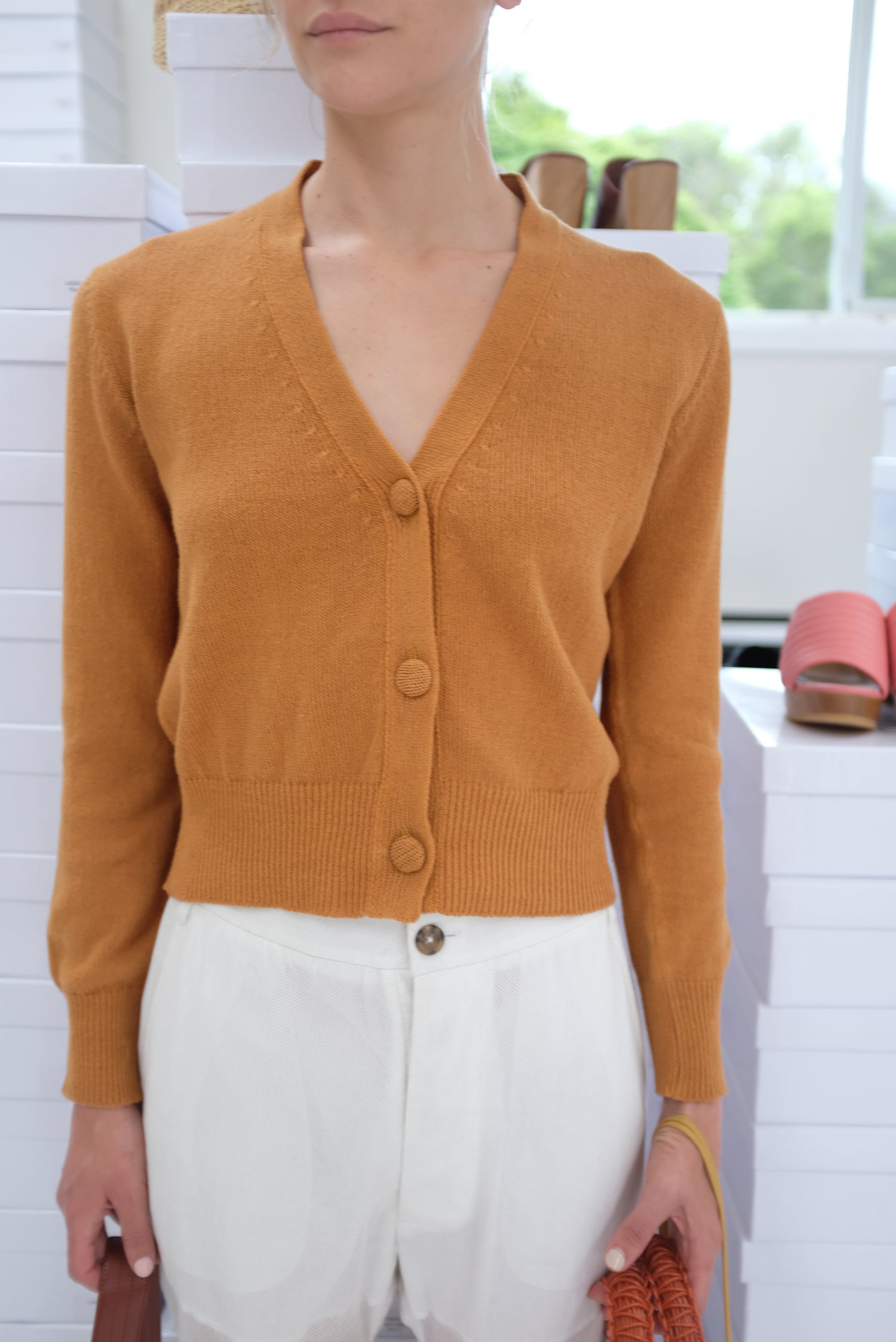 100% Organic cotton knit, long sleeved, classic v-neck cardigan, fabric covered buttons down front. Medium weight, not sheer, soft cotton, wear as a layering piece or on it's own, solo.