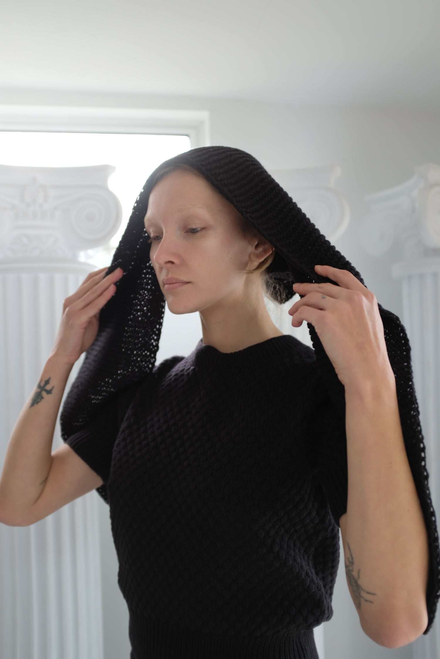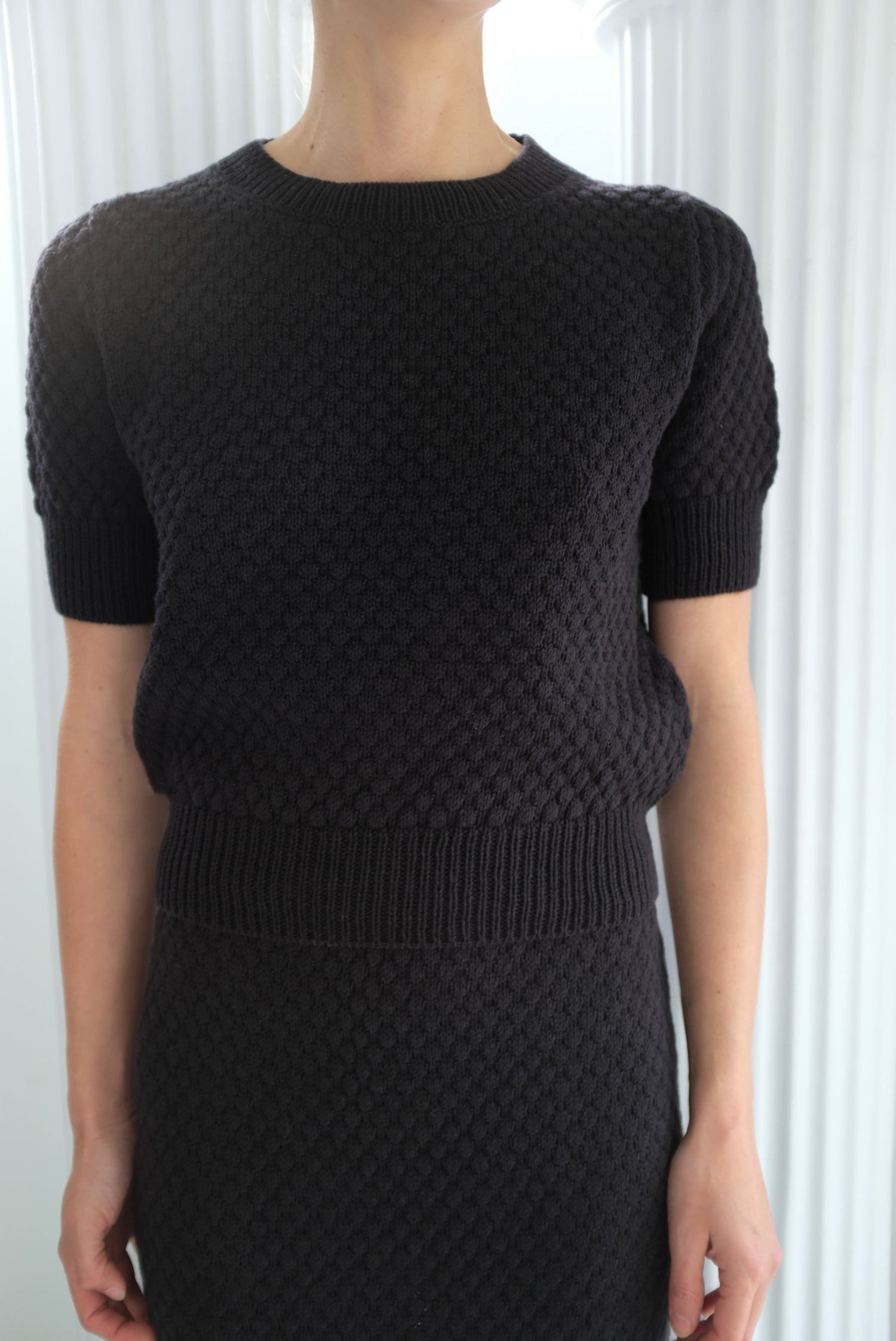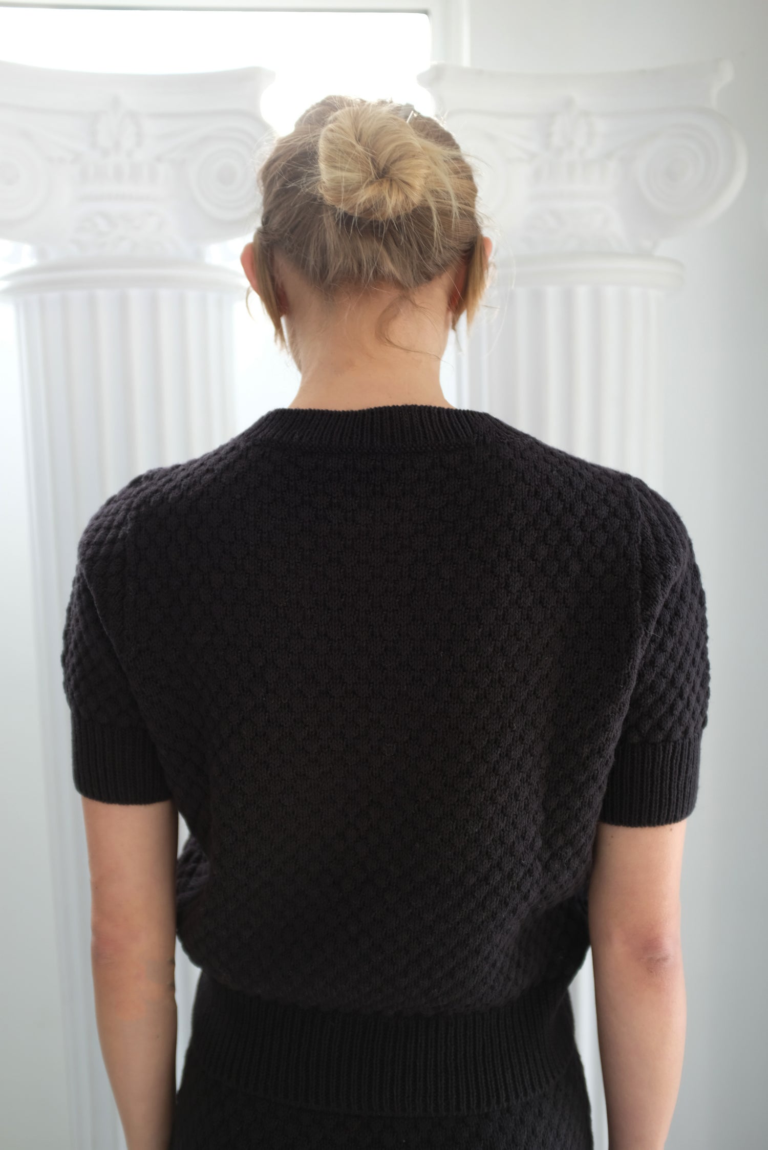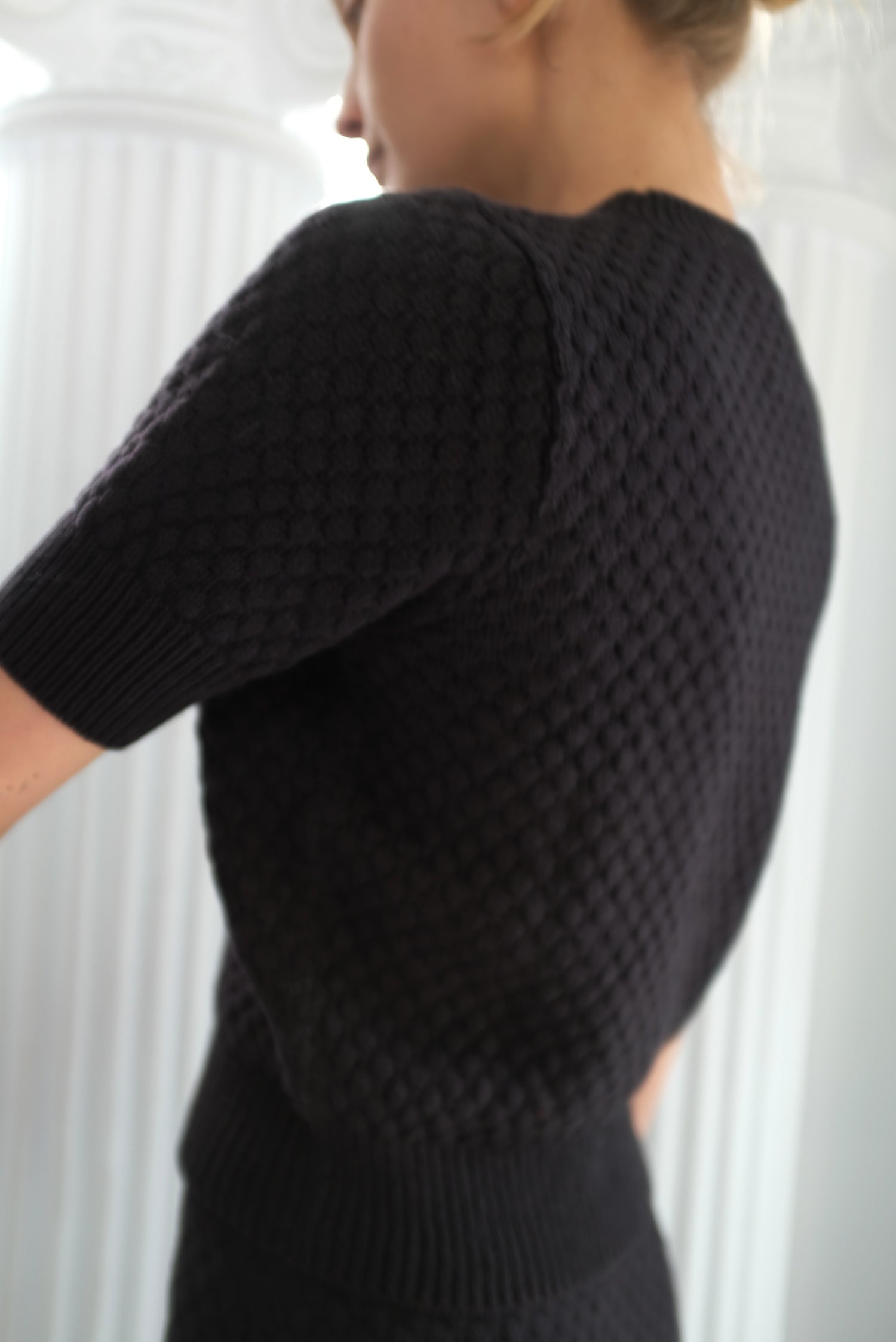 Textured seersucker knit stitch. Hand knit, ½ sleeve, classic feminine fit meant to hit at the waist with a gentle cinching and drape, ribbed hem and cuffs. Dress up or wear with your favorite jeans. 70% cotton and 30% virgin wool, a comfortable and insulating blend that can be worn year round.